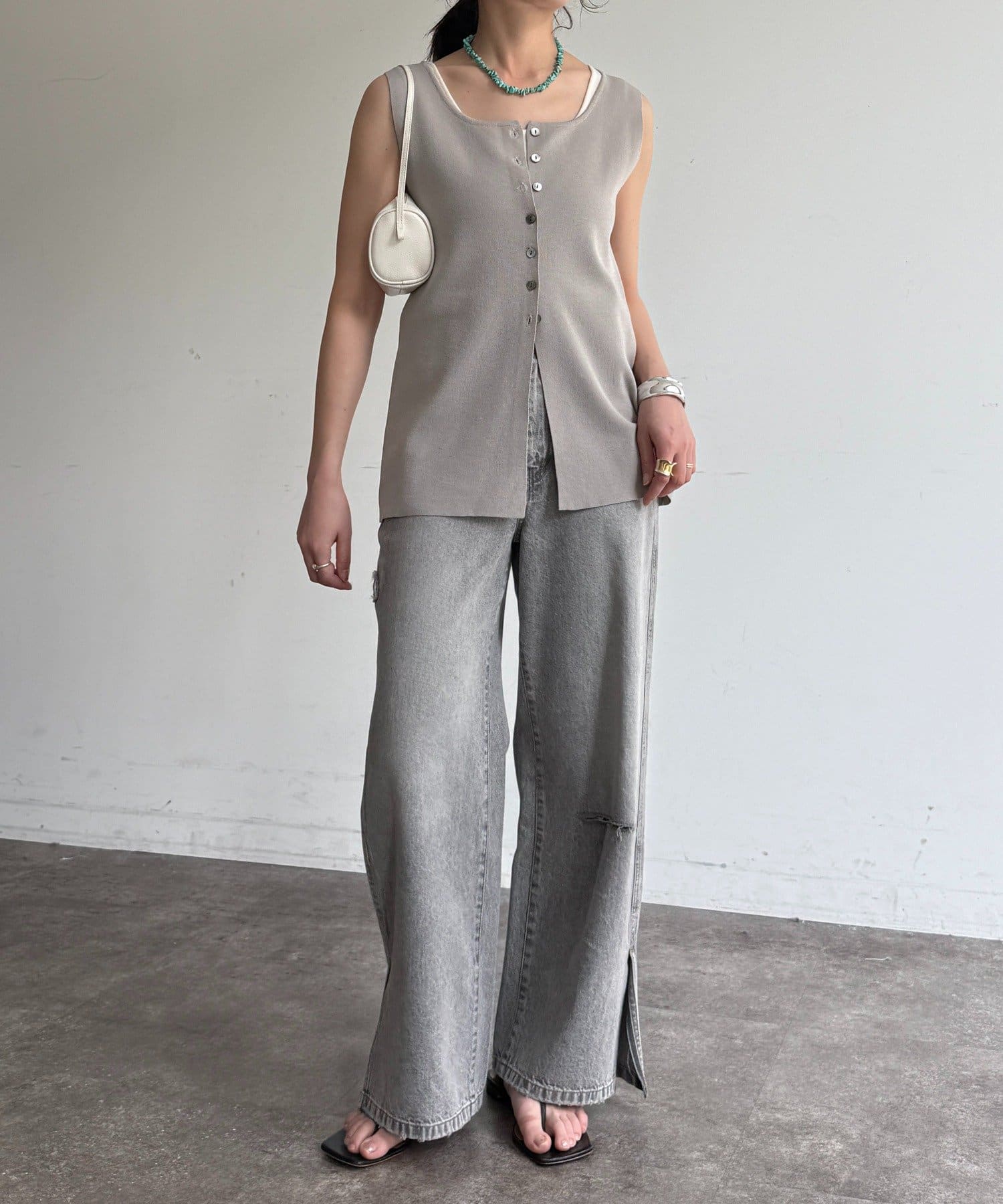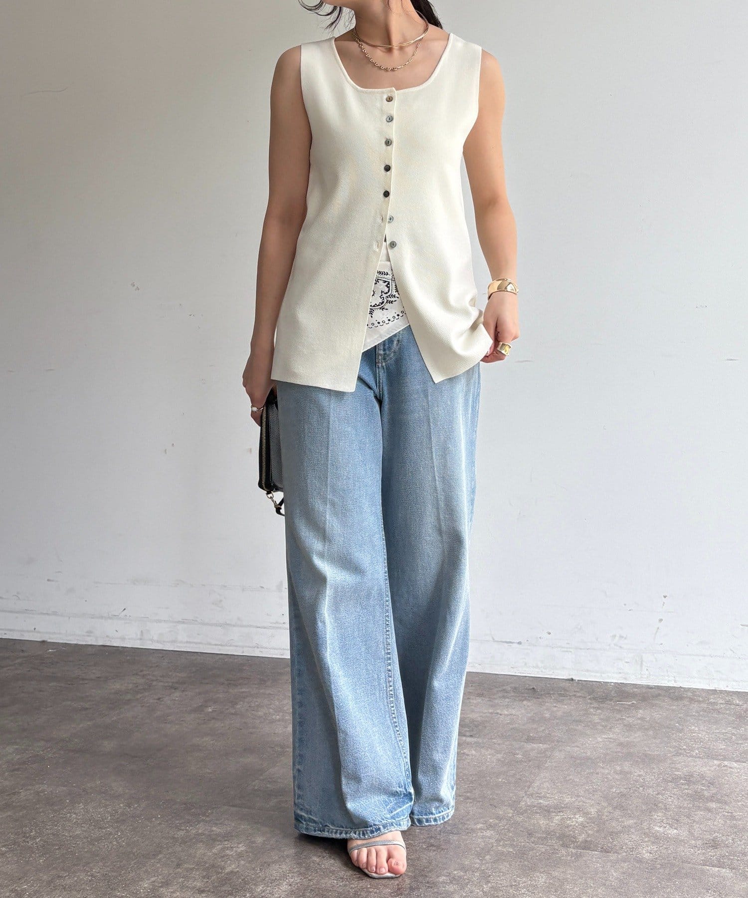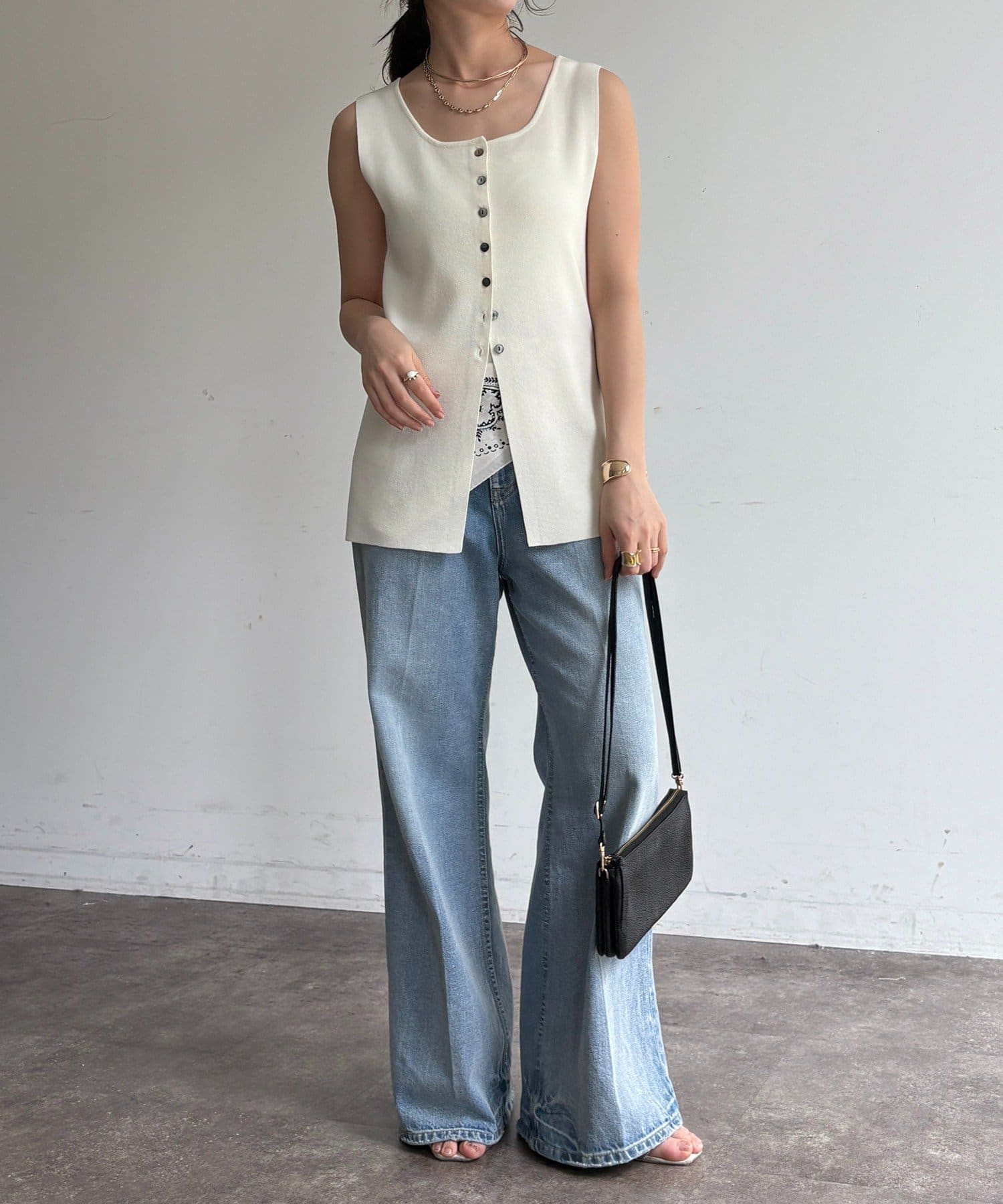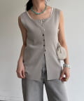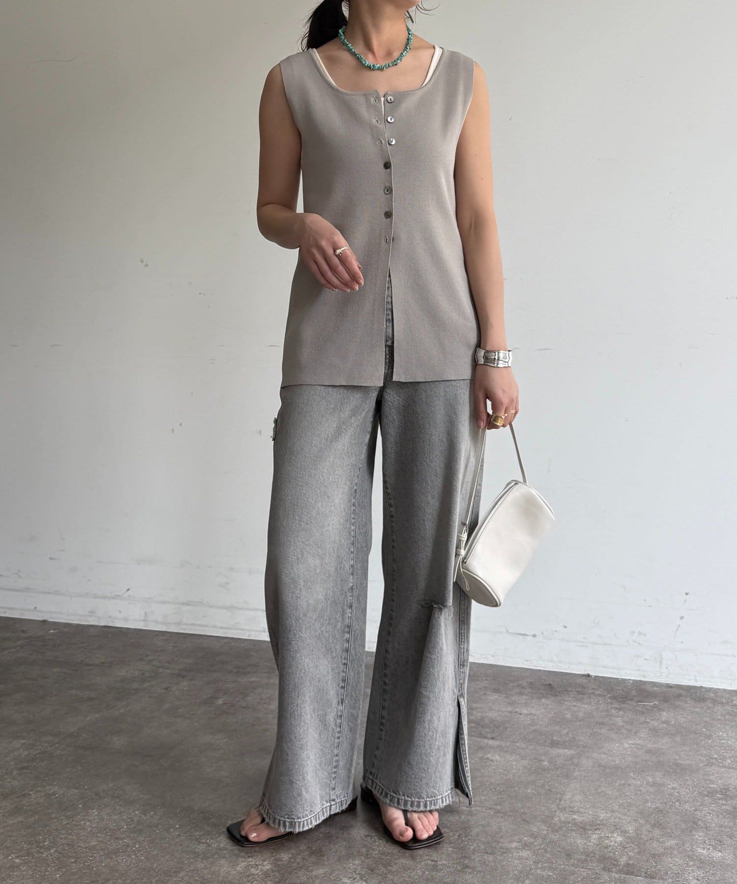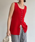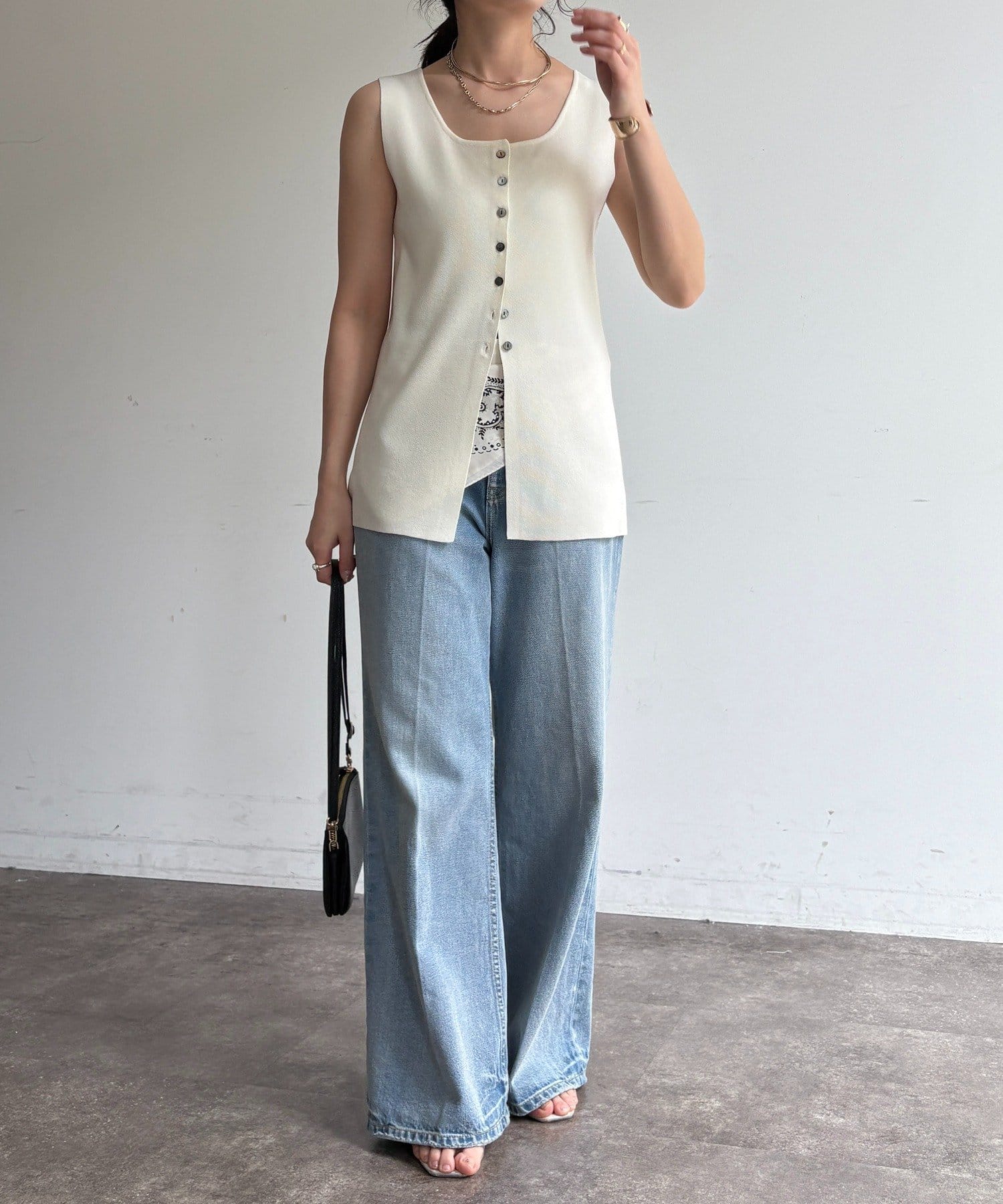 すっきりとしたシルエットと上品なディテールが魅力のフロントボタンスクエアニットタンク。
