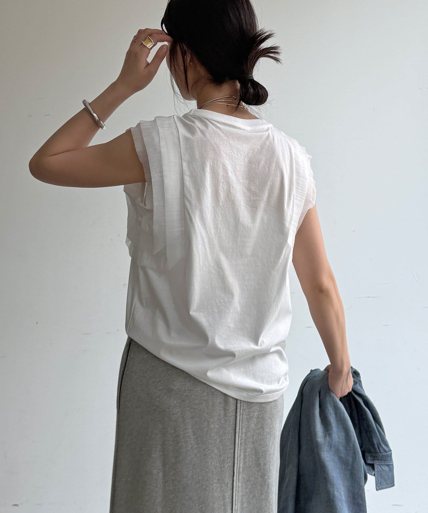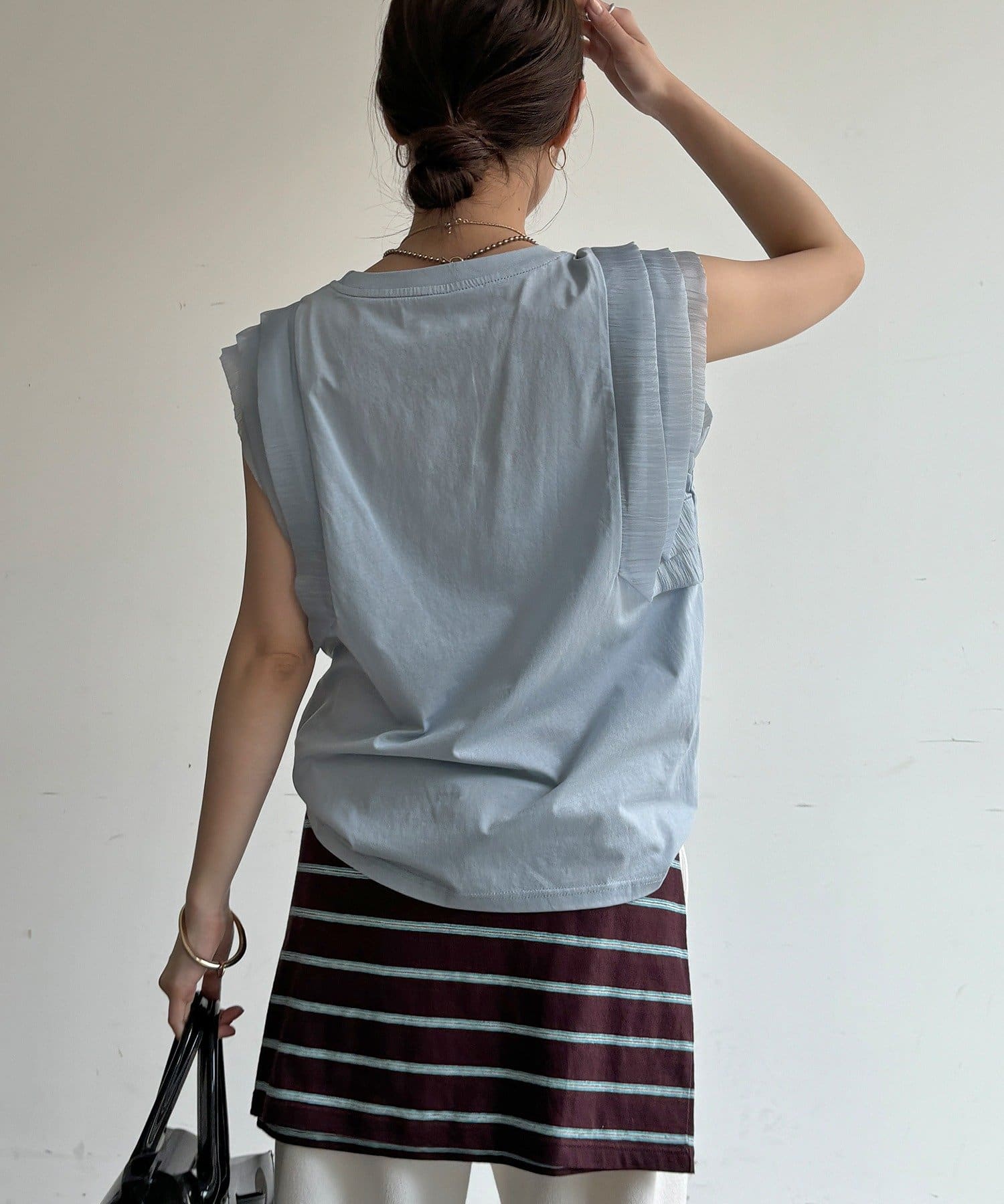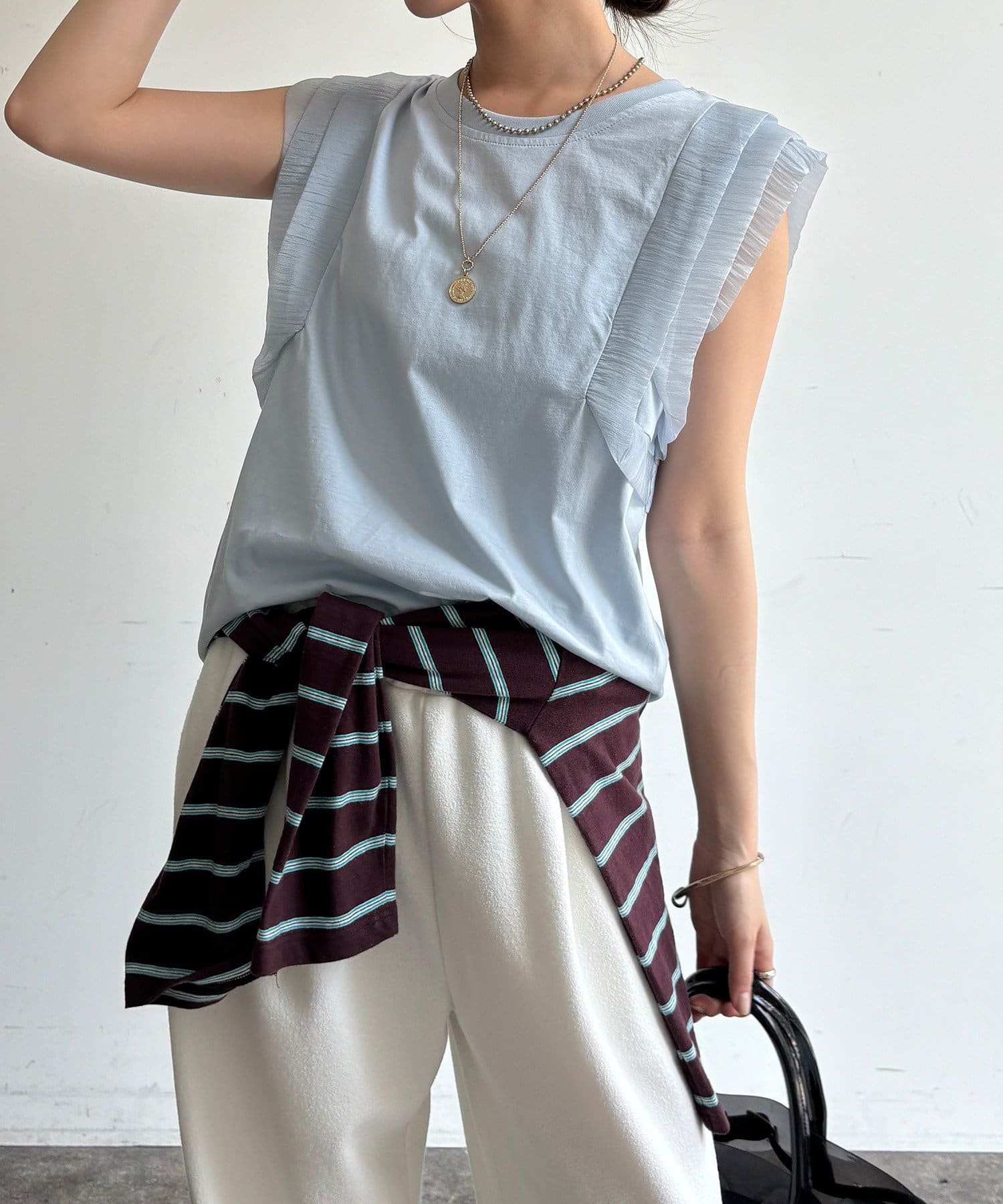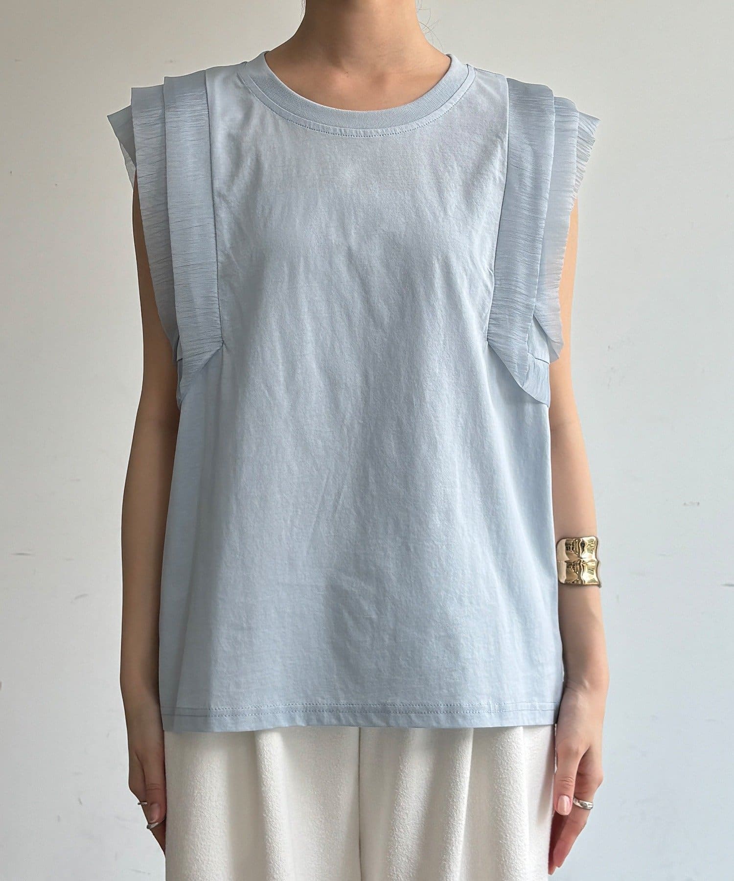 Tシャツよりも女性っぽく。肩のフリルがかわいいトップス