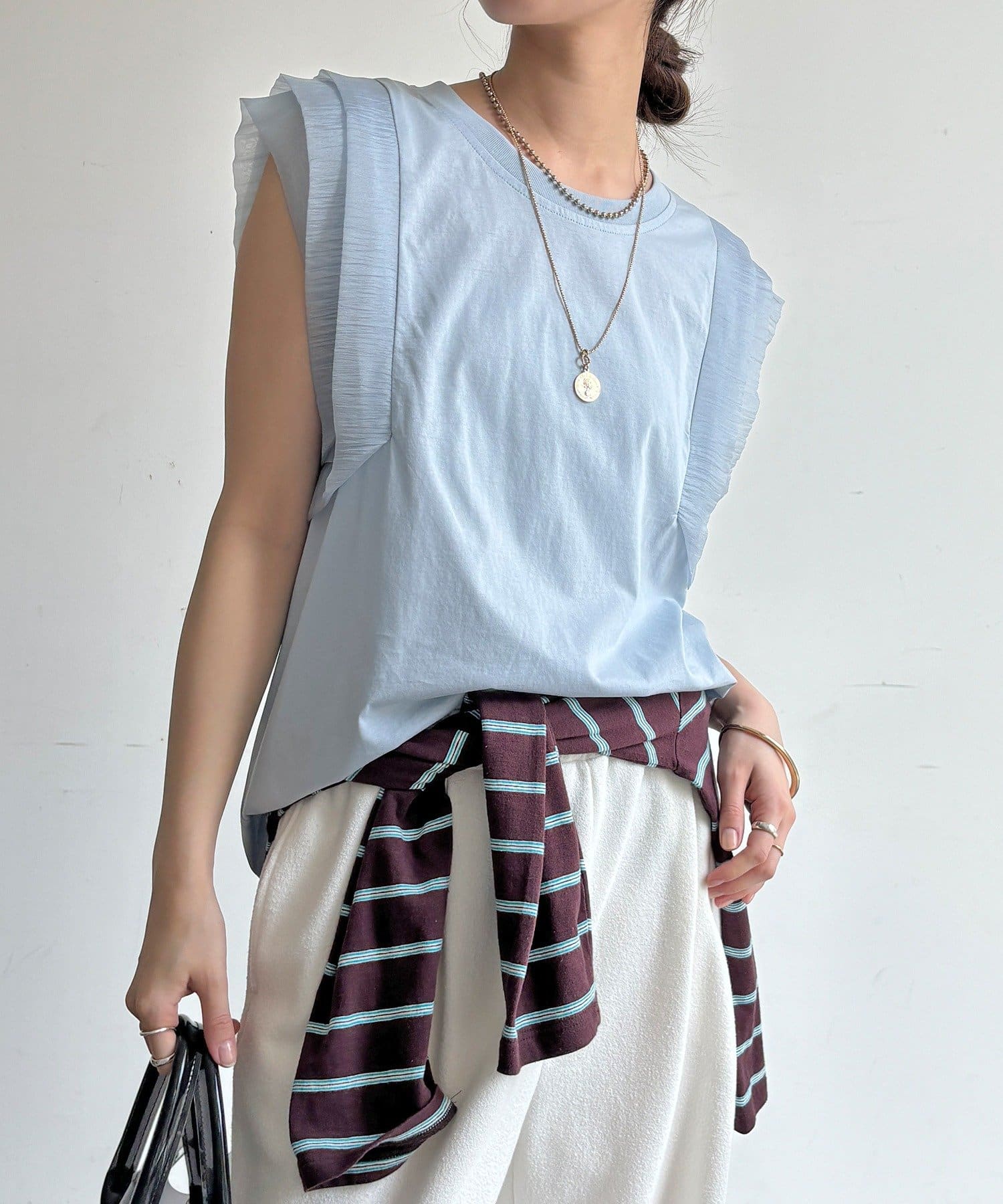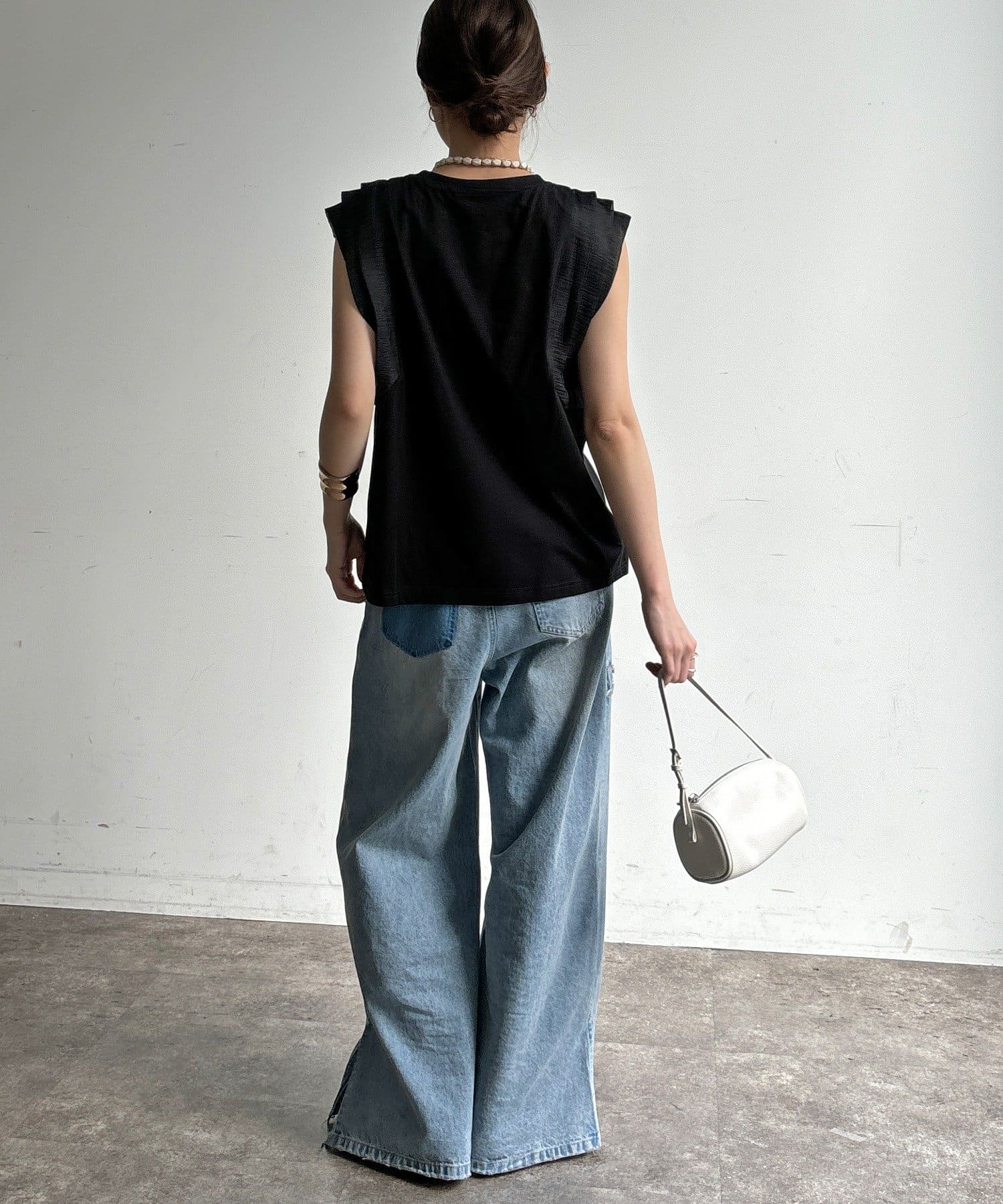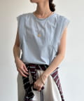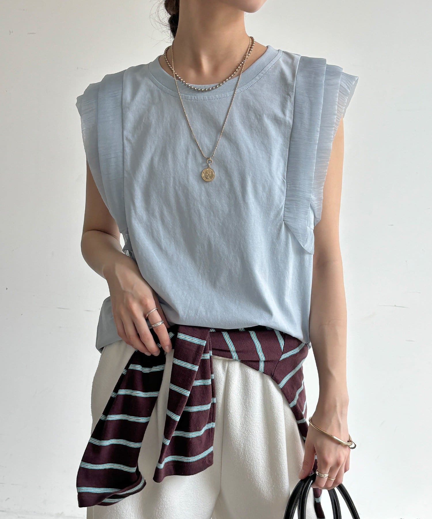 Tシャツよりも女性っぽく。肩のフリルがかわいいトップス