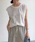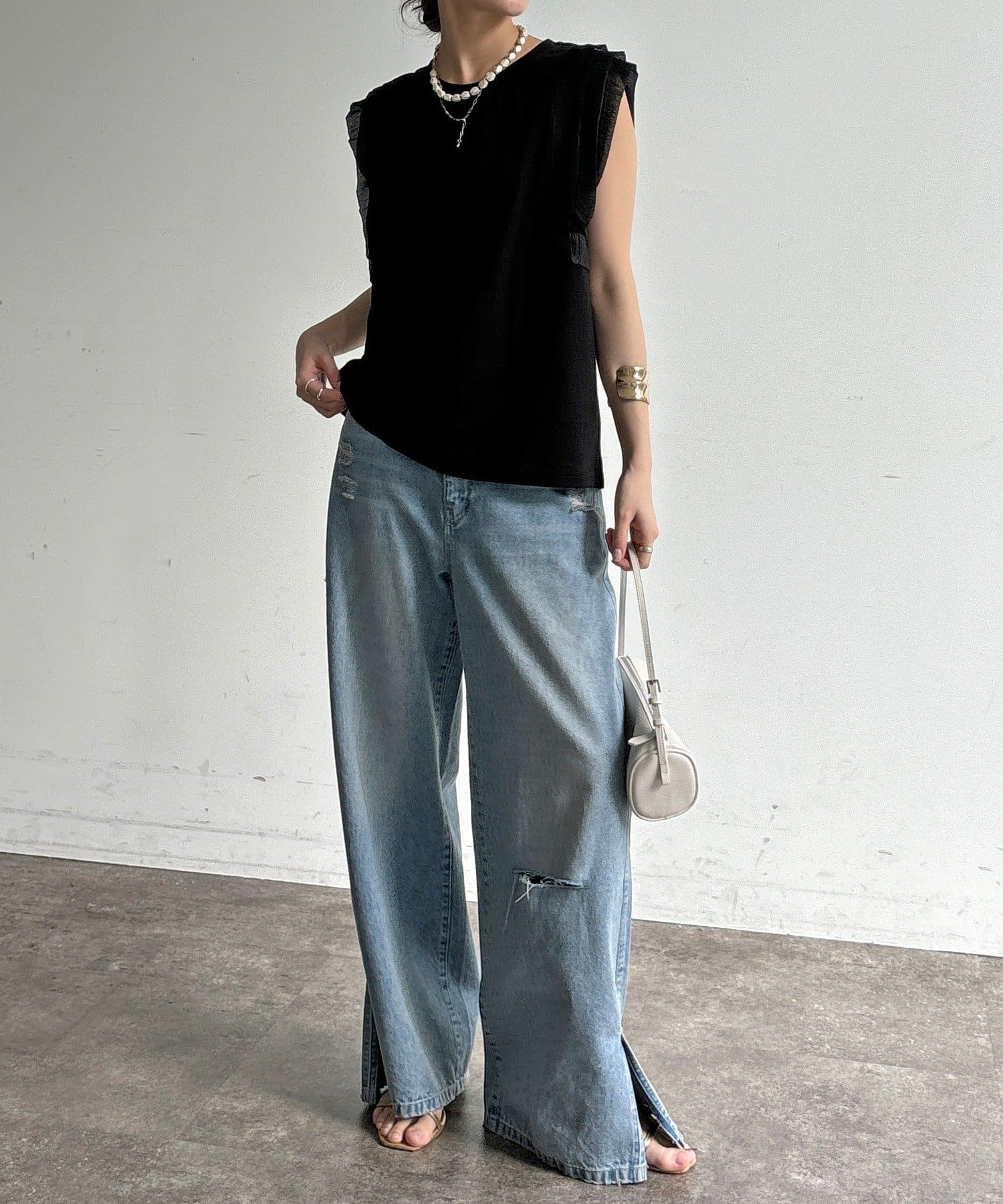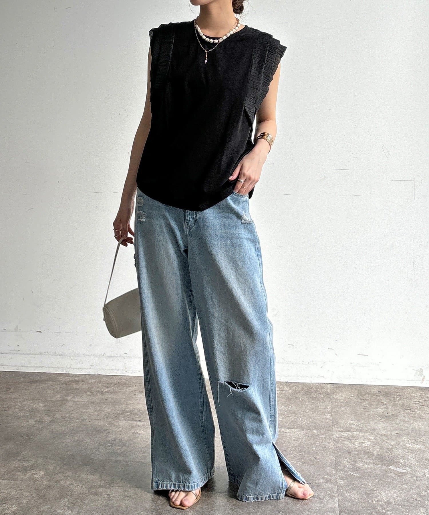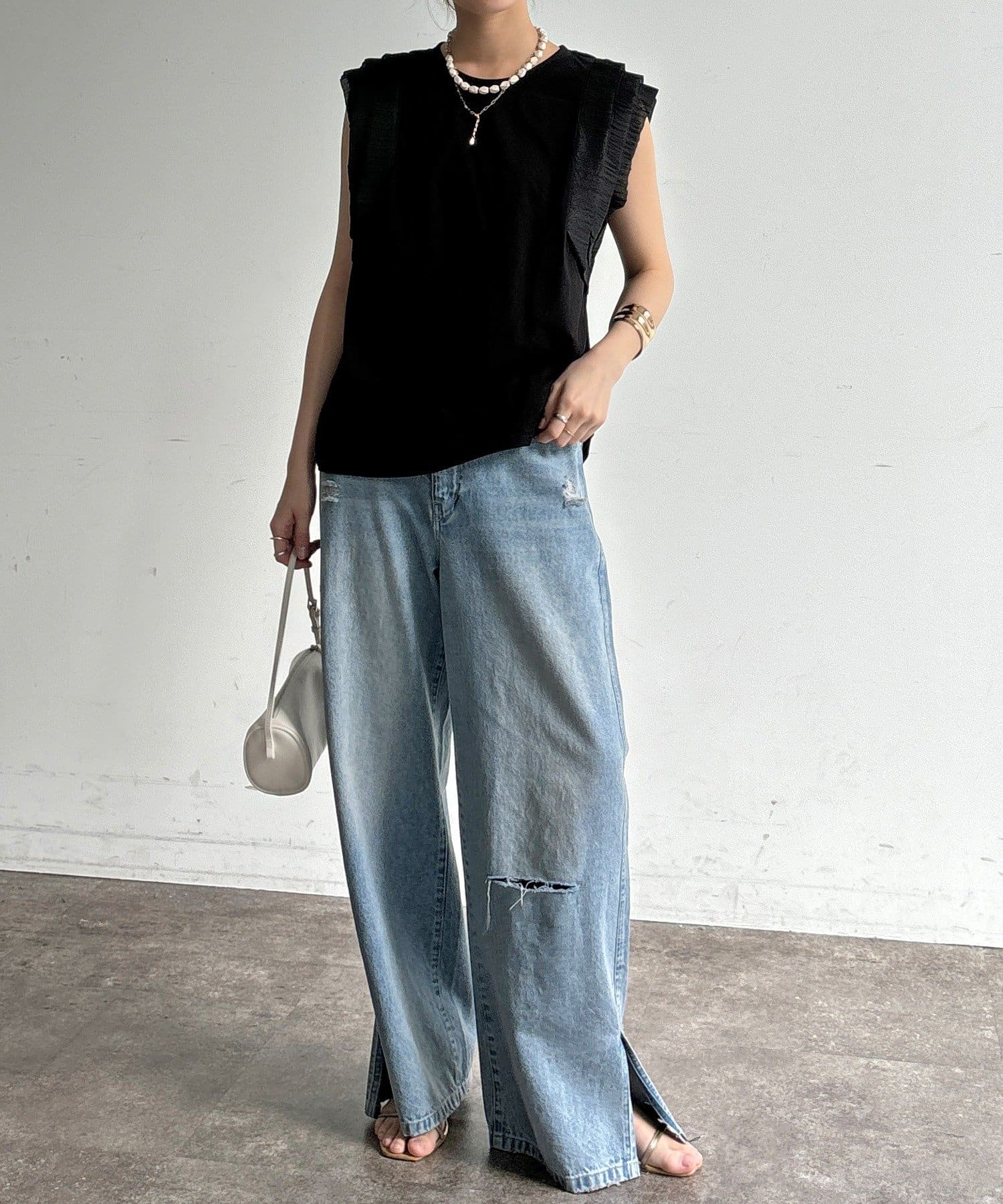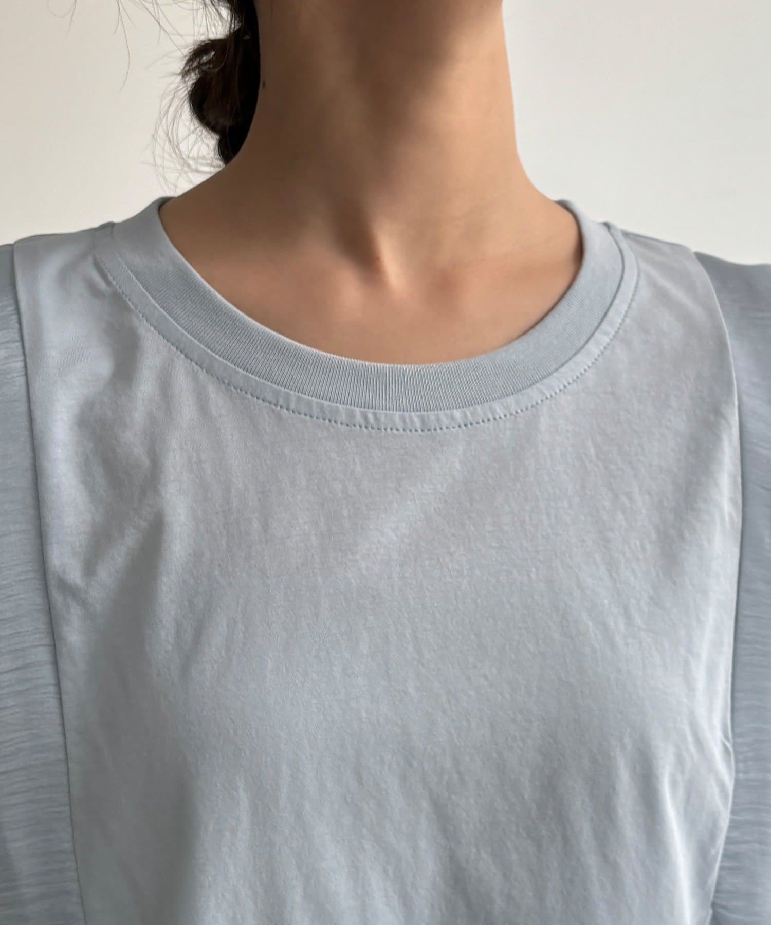 Tシャツよりも女性っぽく。肩のフリルがかわいいトップス