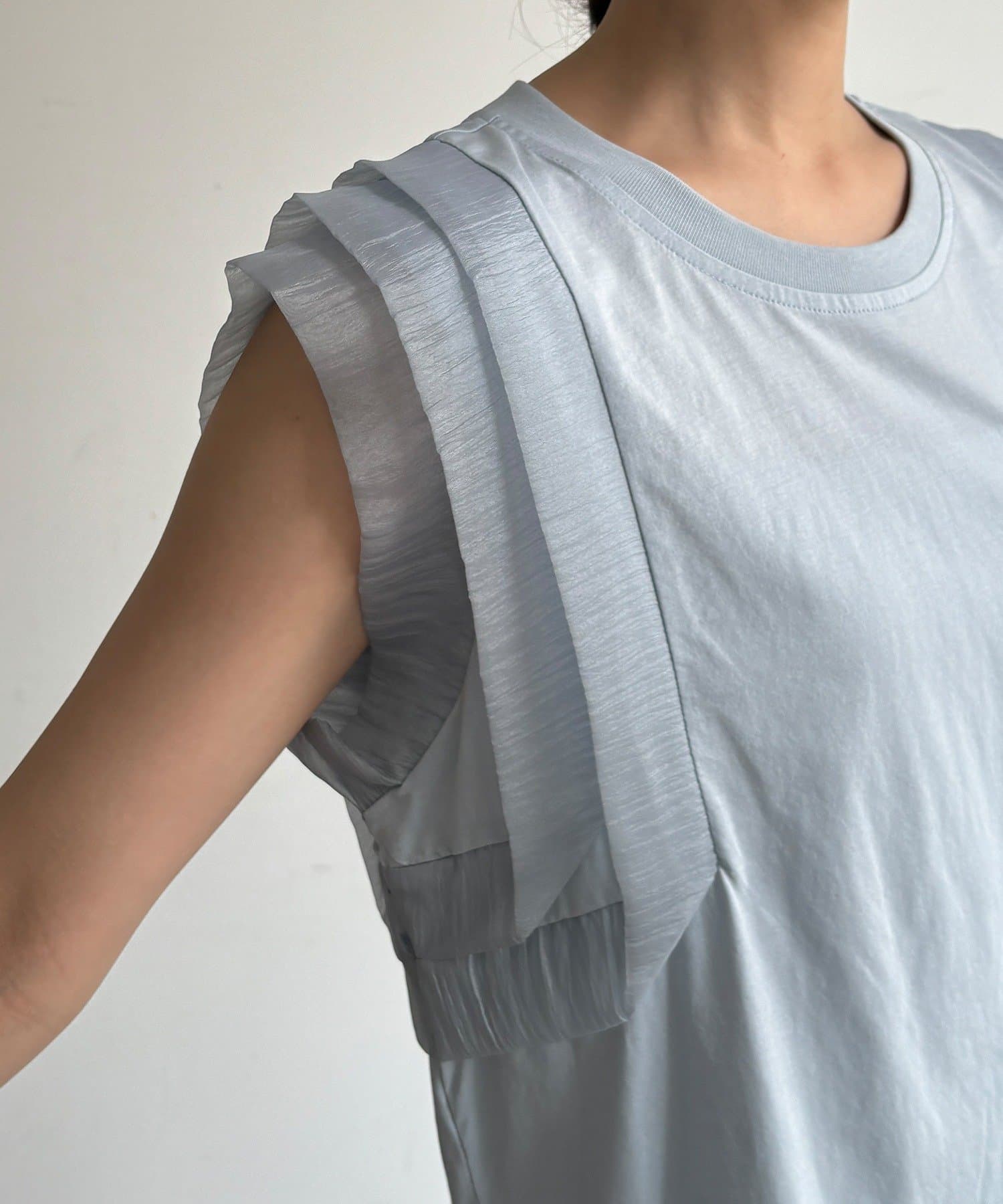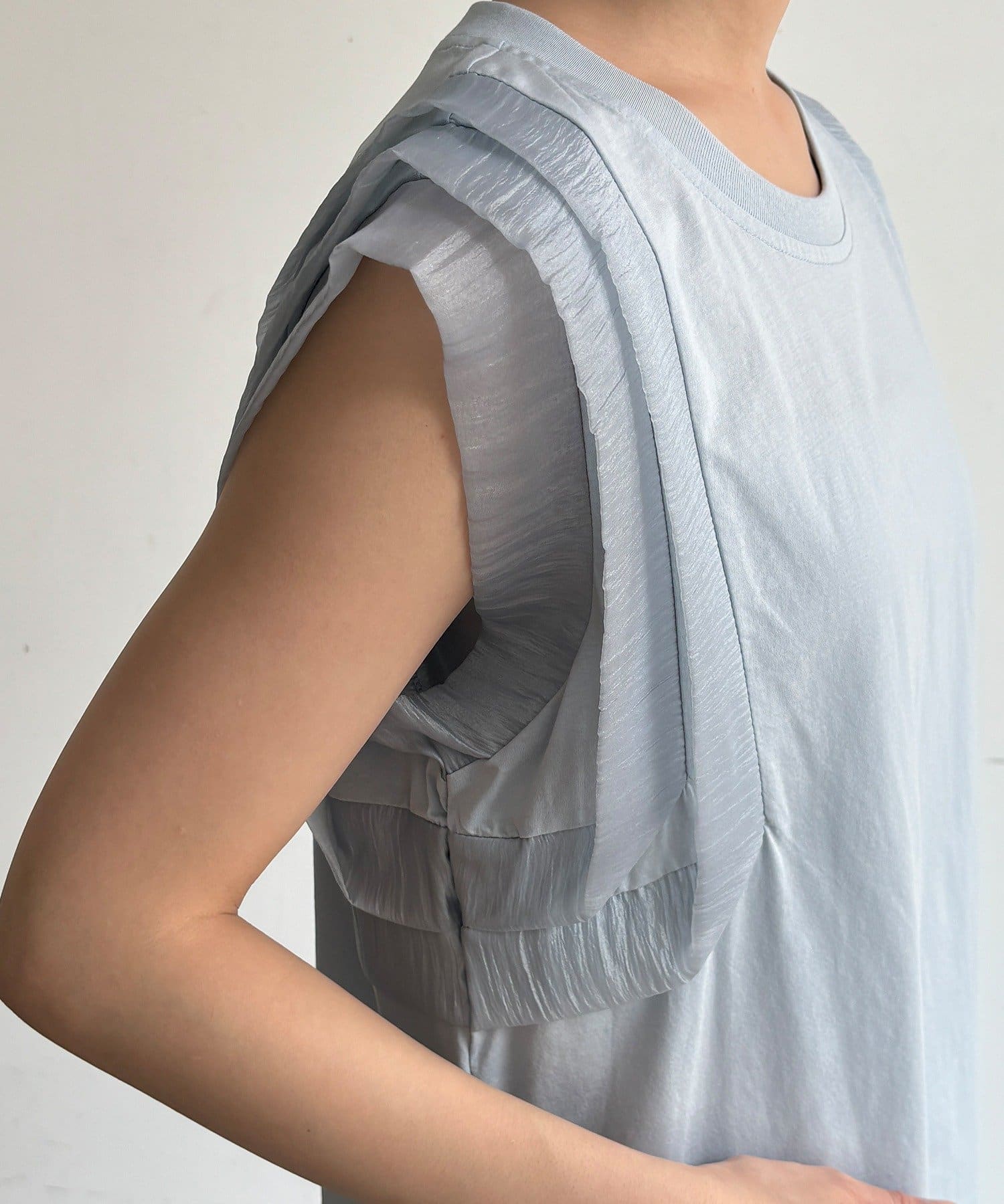 立体的なチュールっぽいフリルが肩に贅沢感を与え、顔周りを華やかに見せてくれます。