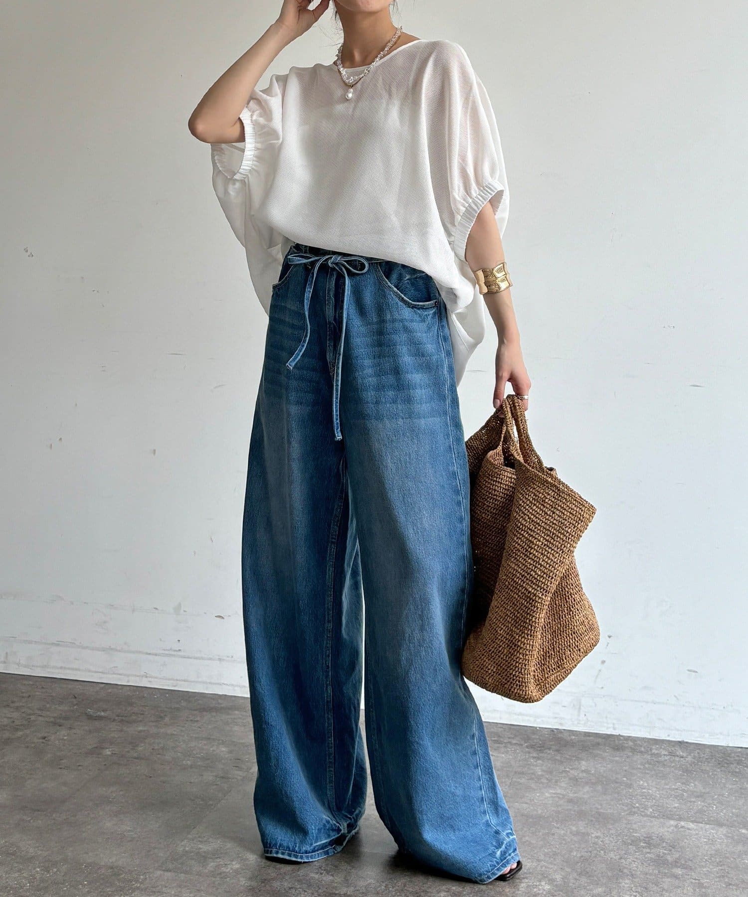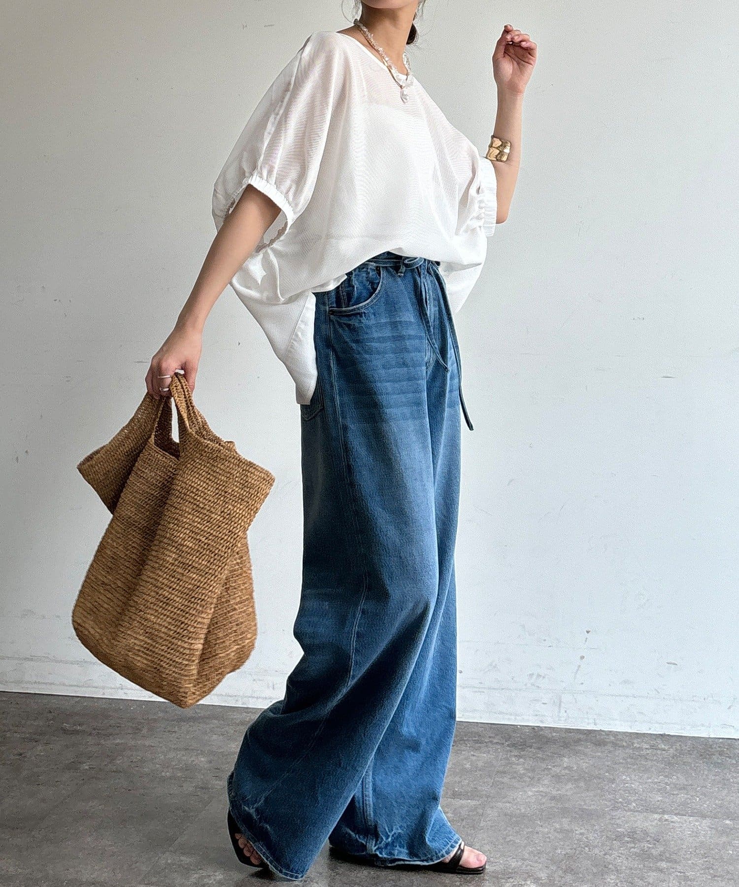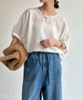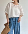 ふんわりとした袖が大人可愛い、清涼感たっぷりのトップス