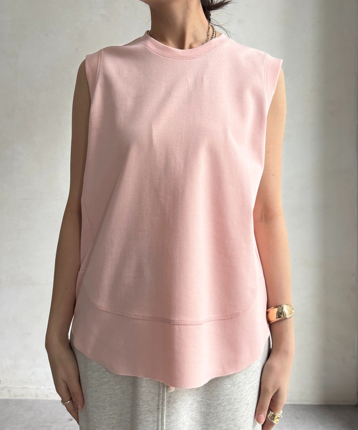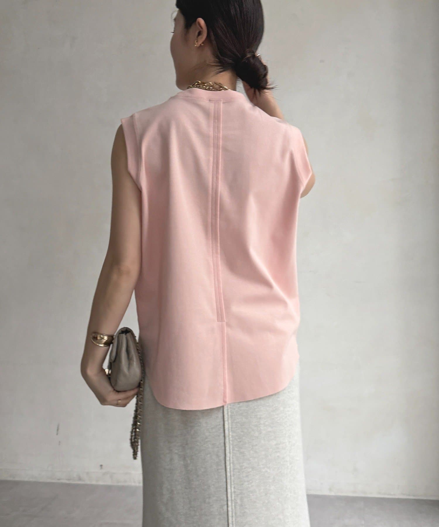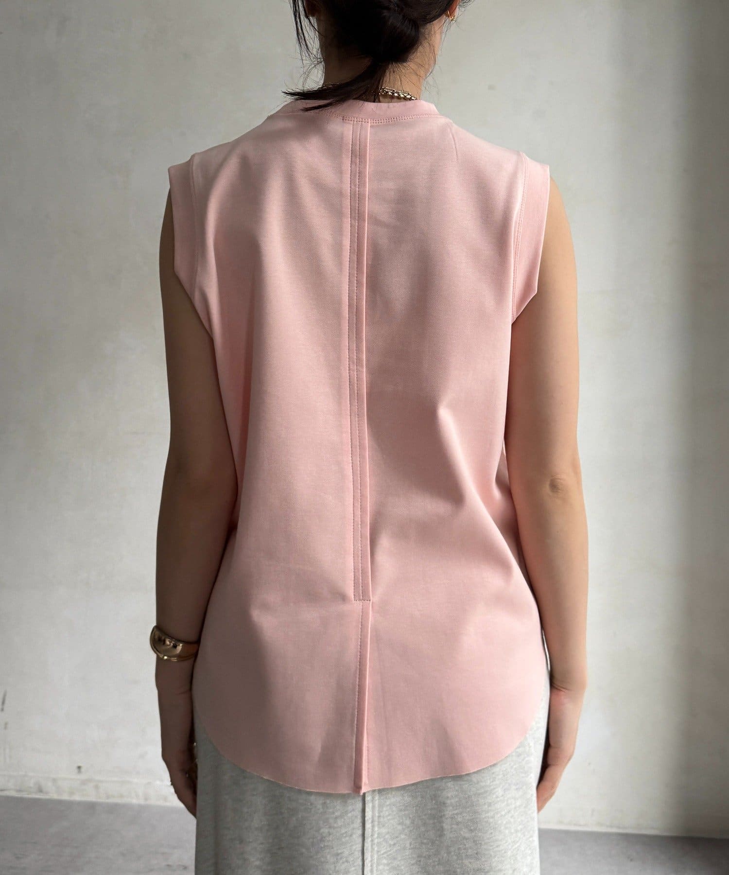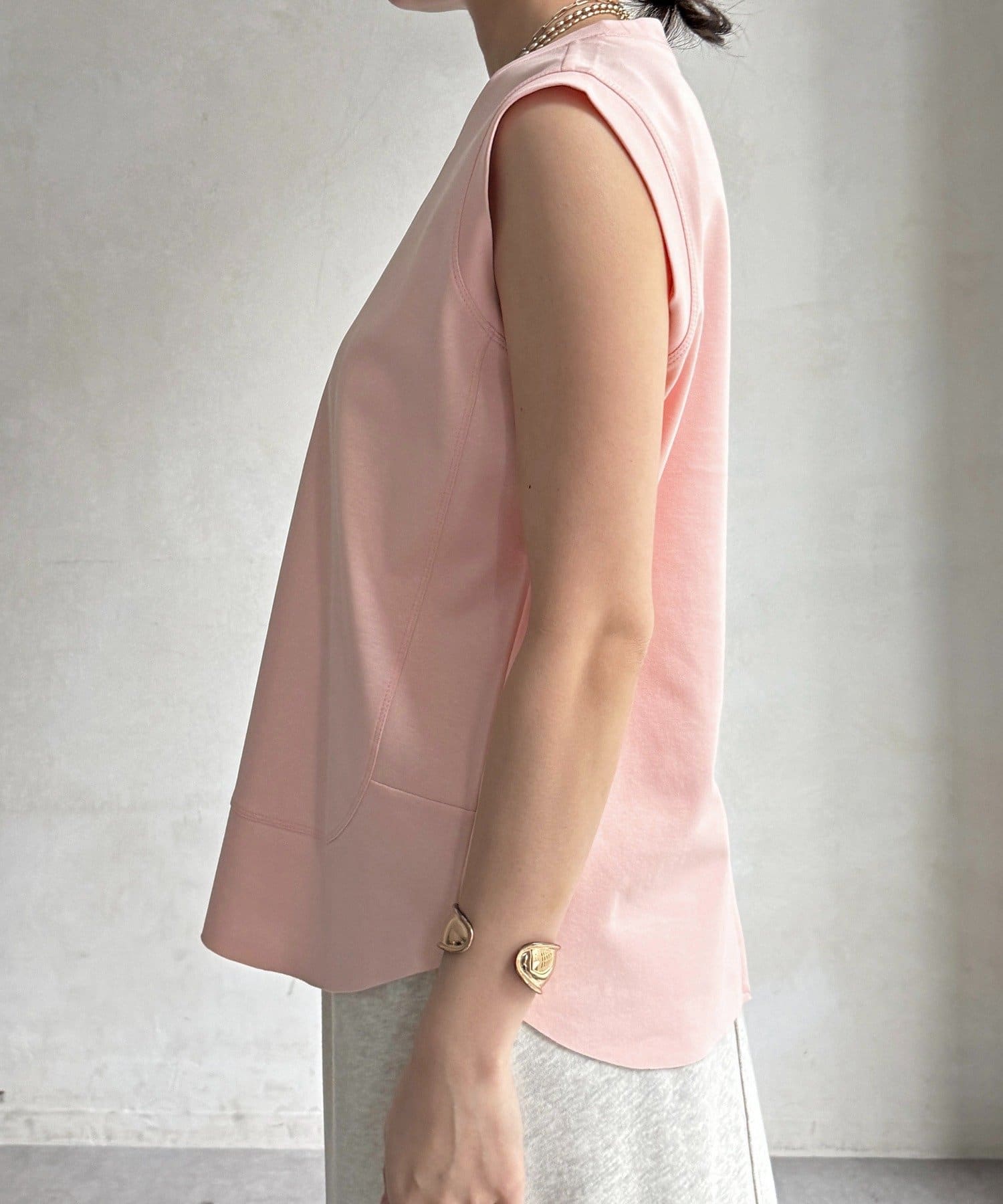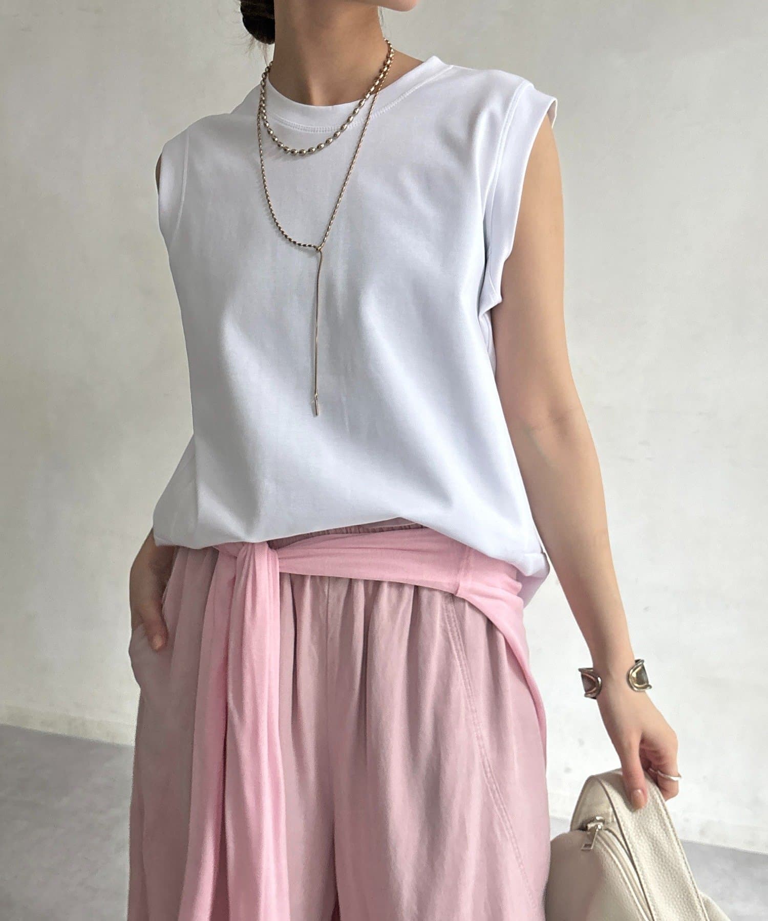肩まわりは程よくカバーされる設計で、ノースリーブながらも安心感のある着用感。