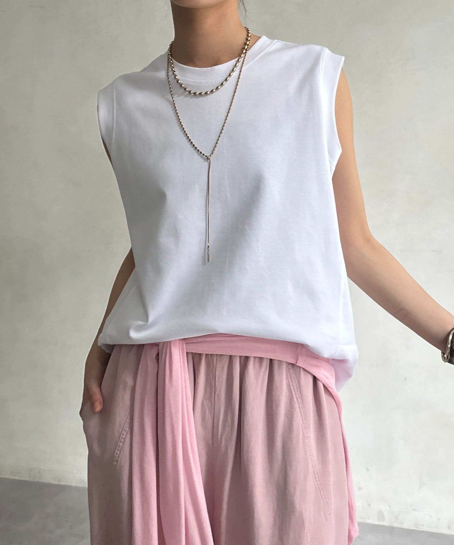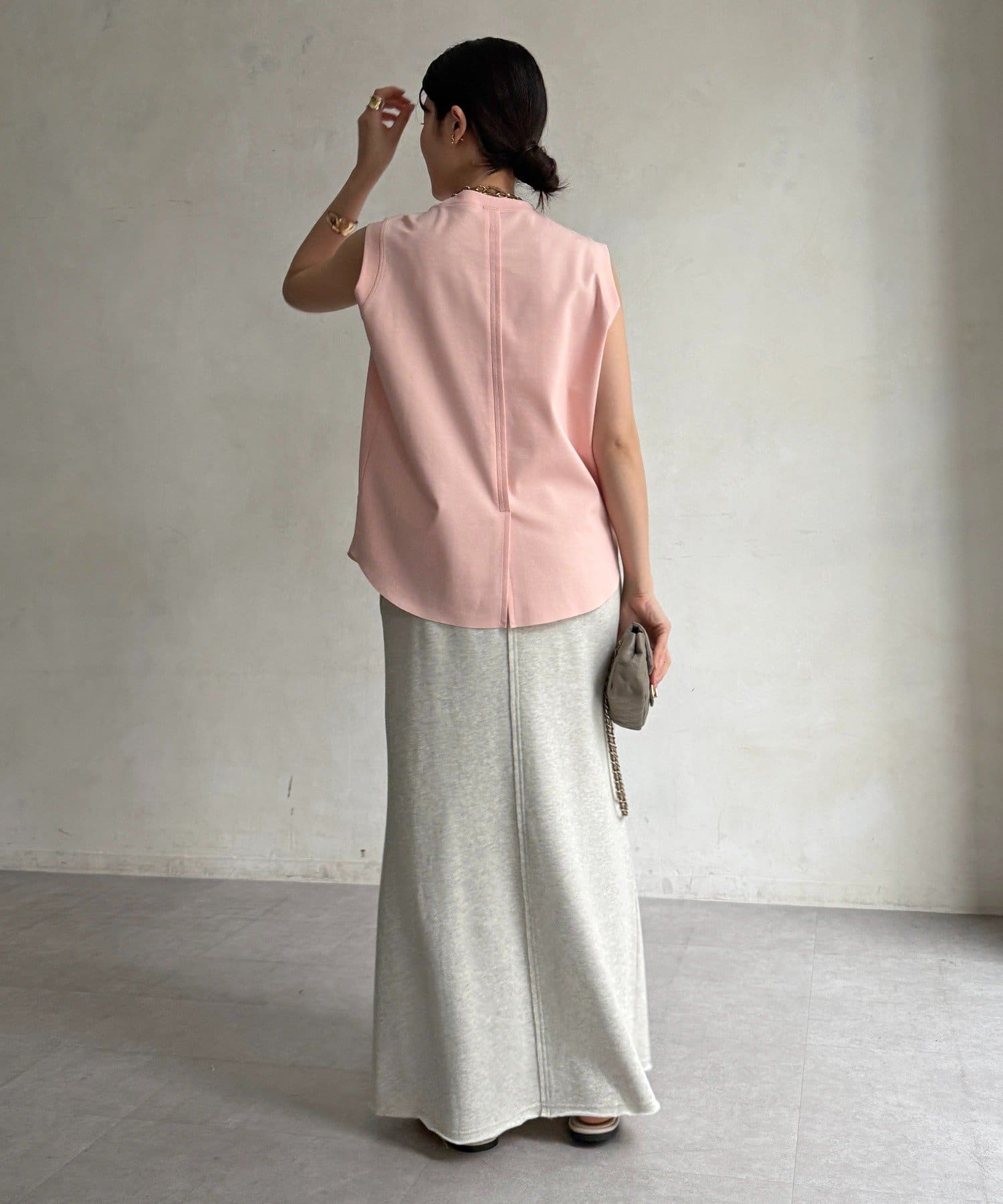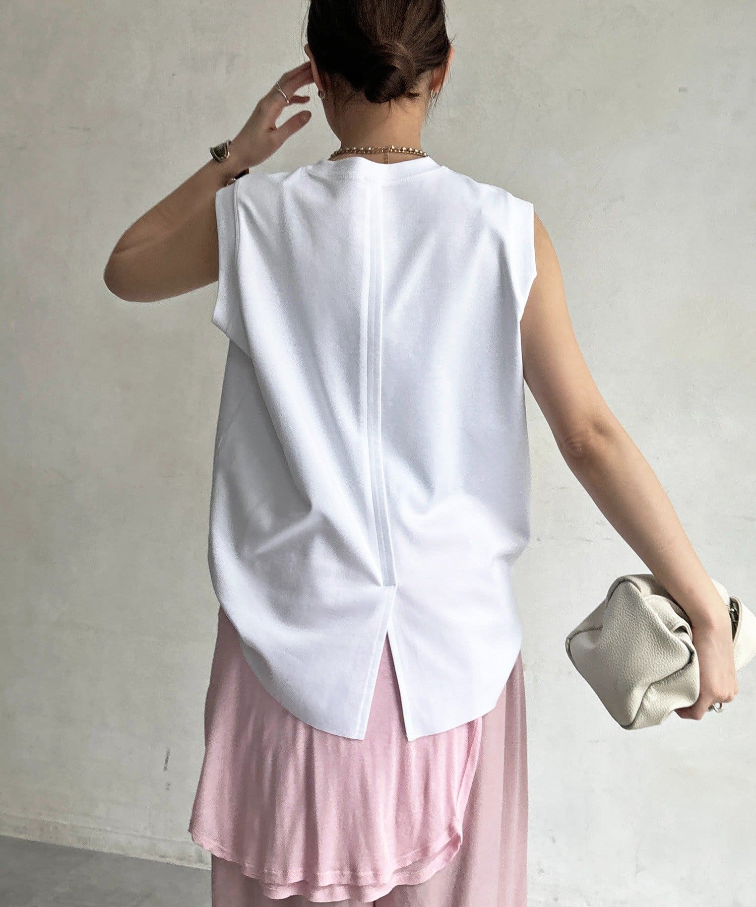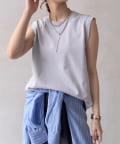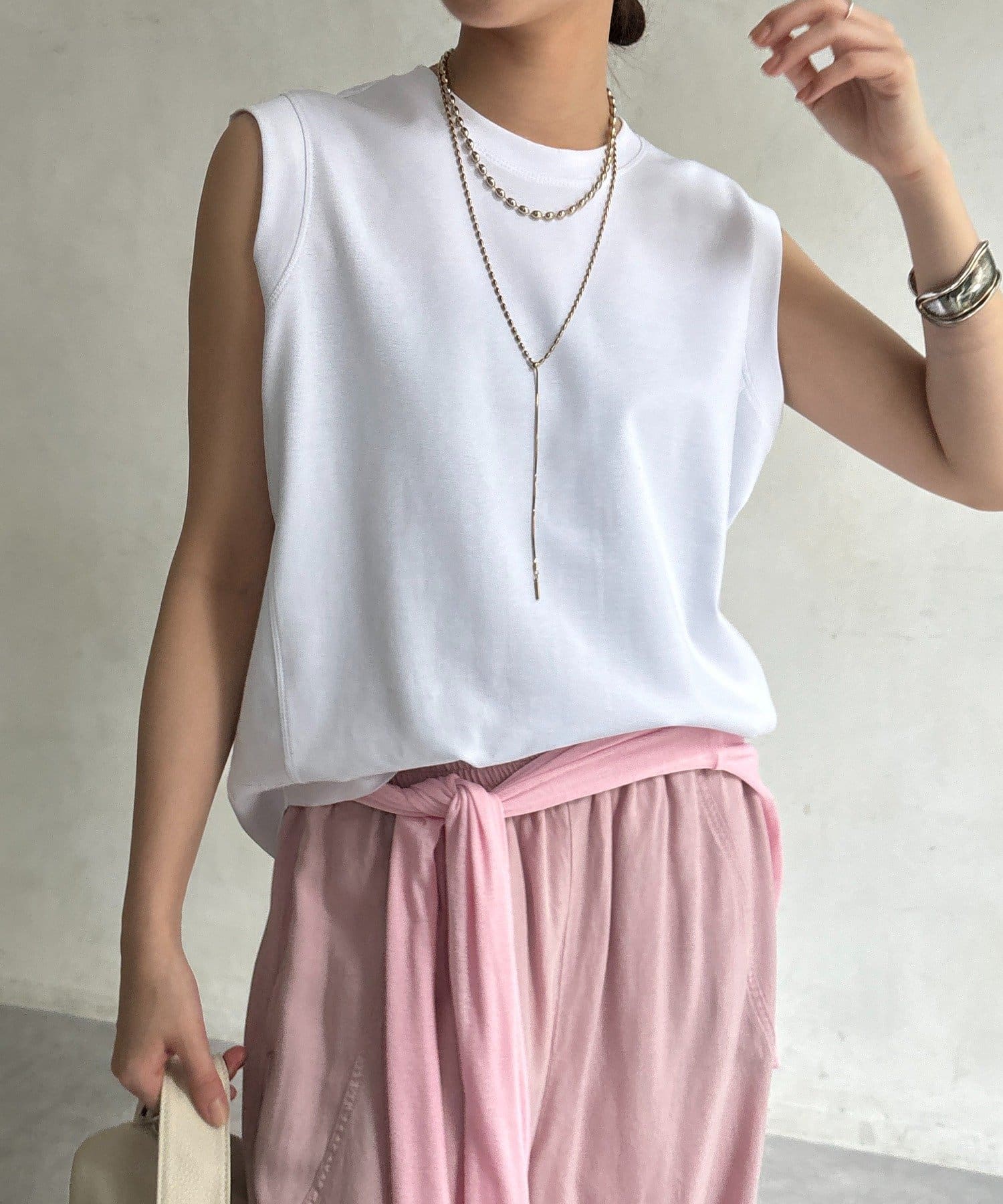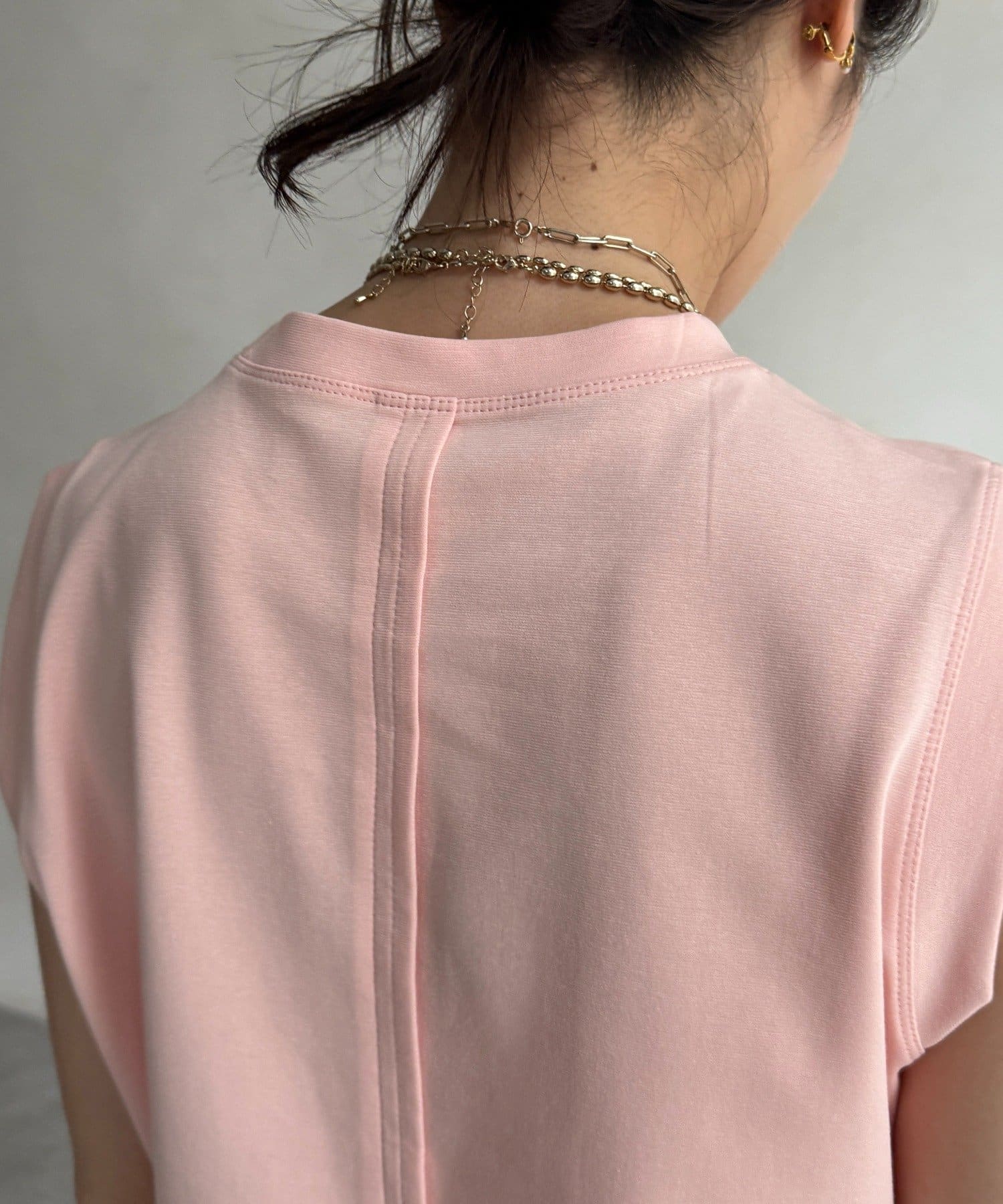 肩まわりは程よくカバーされる設計で、ノースリーブながらも安心感のある着用感。