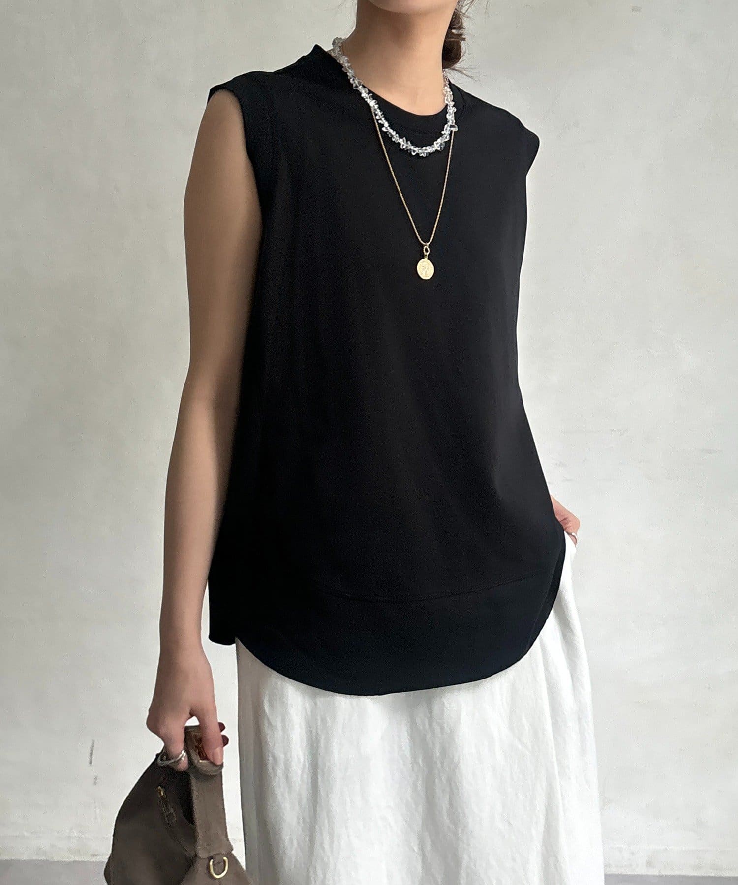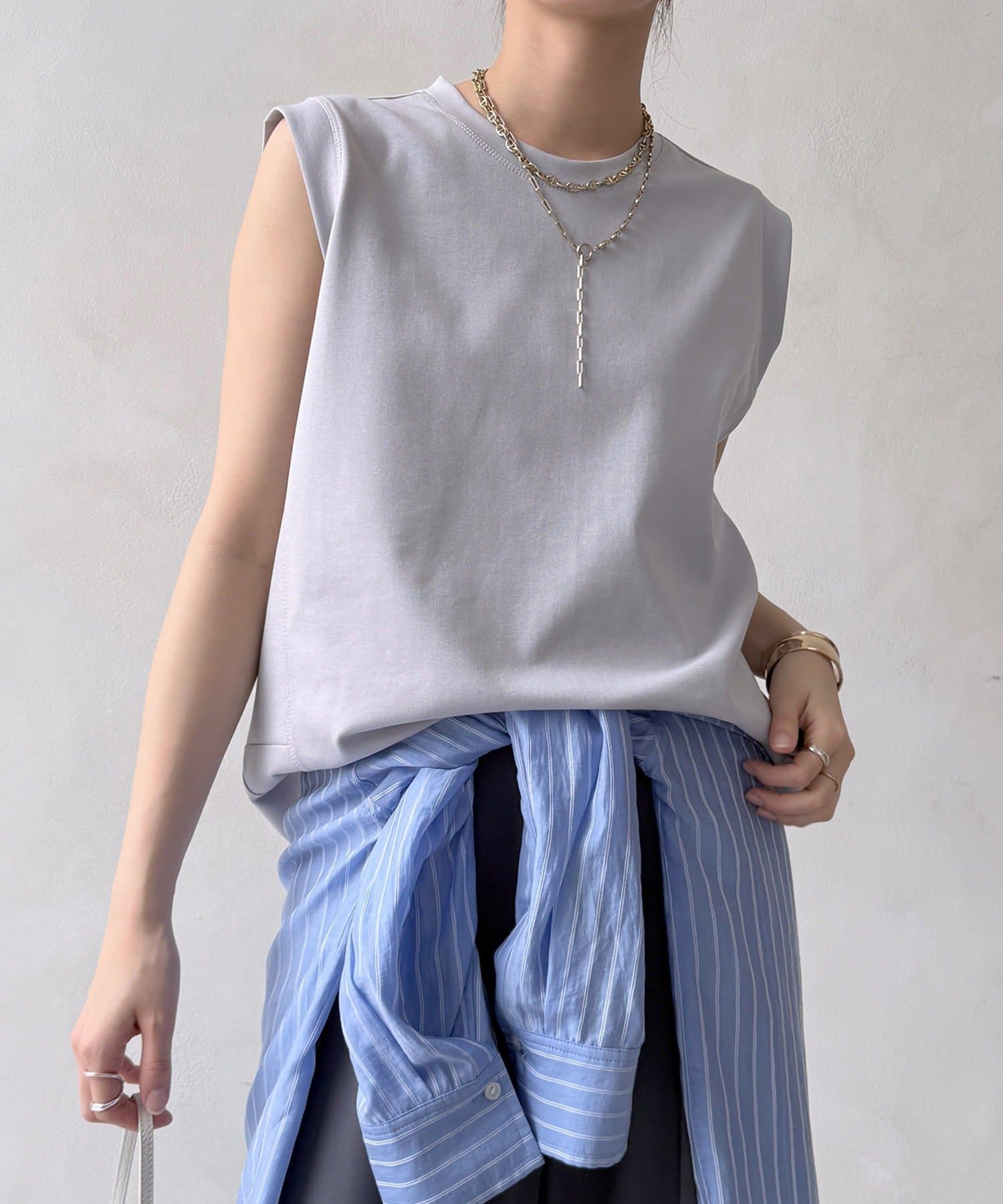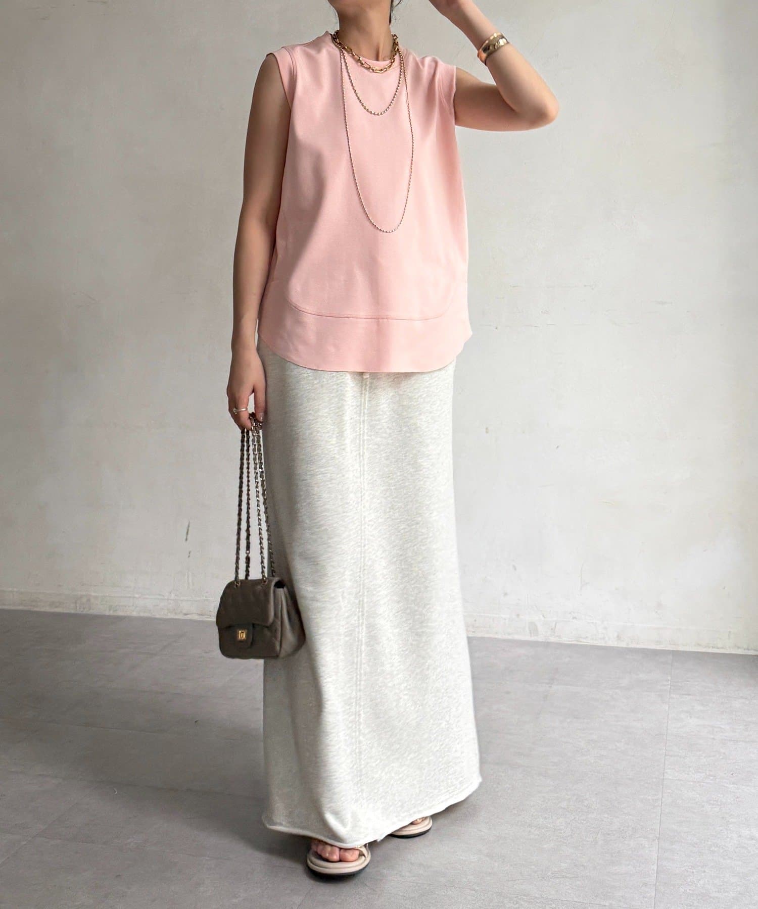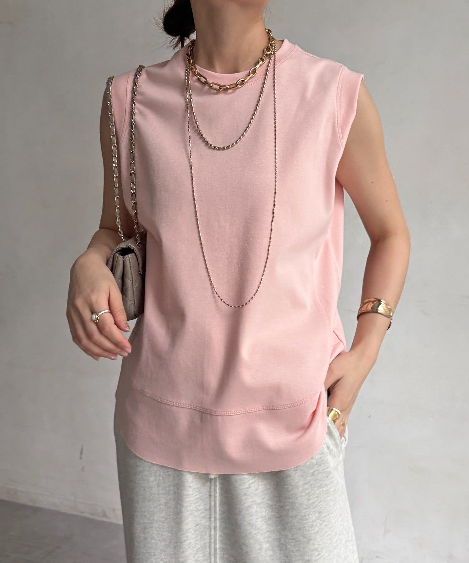 肩まわりは程よくカバーされる設計で、ノースリーブながらも安心感のある着用感。