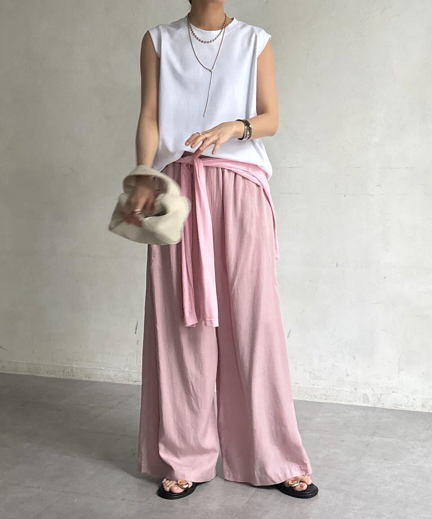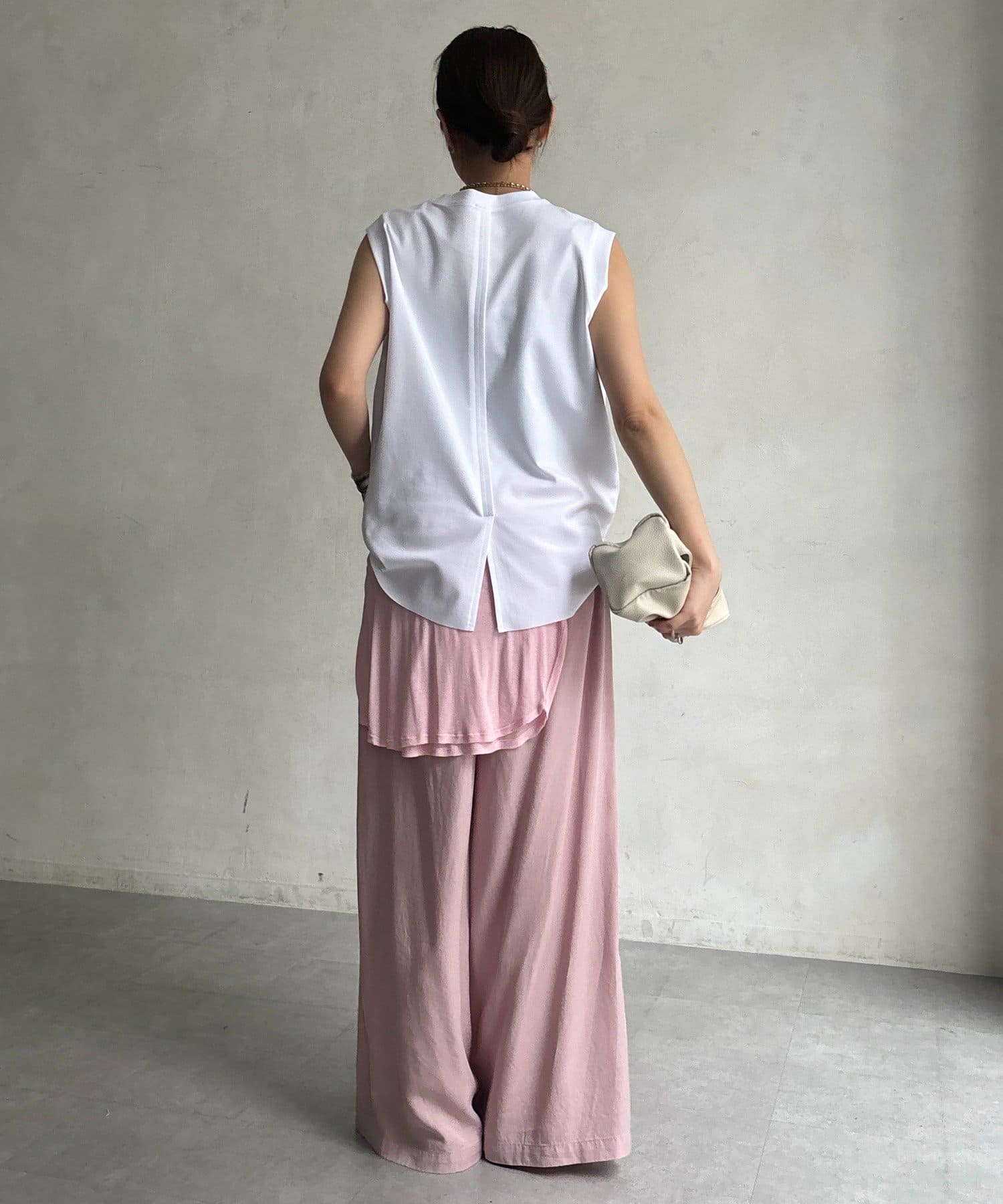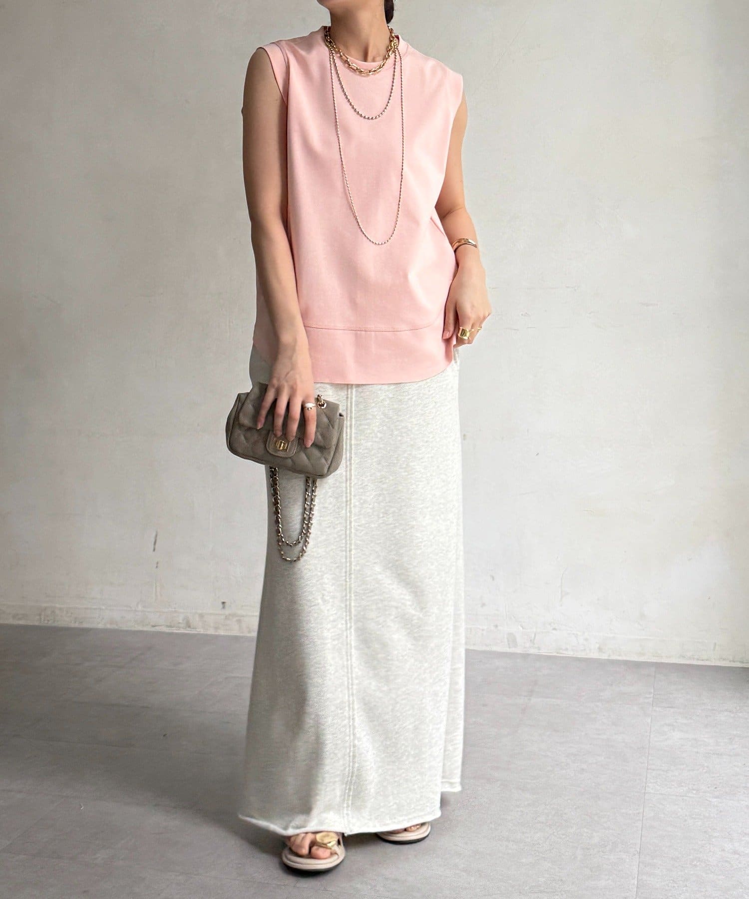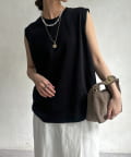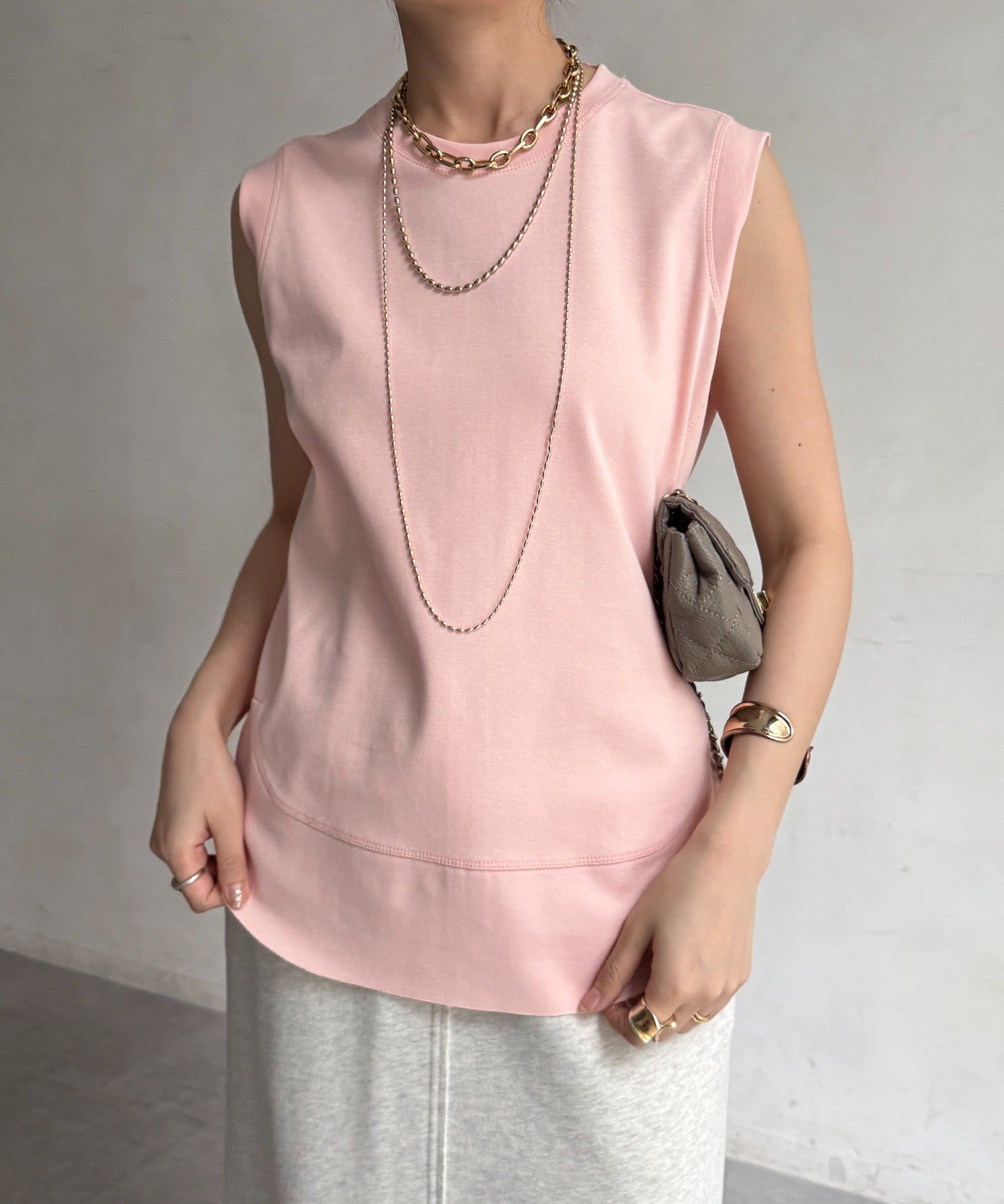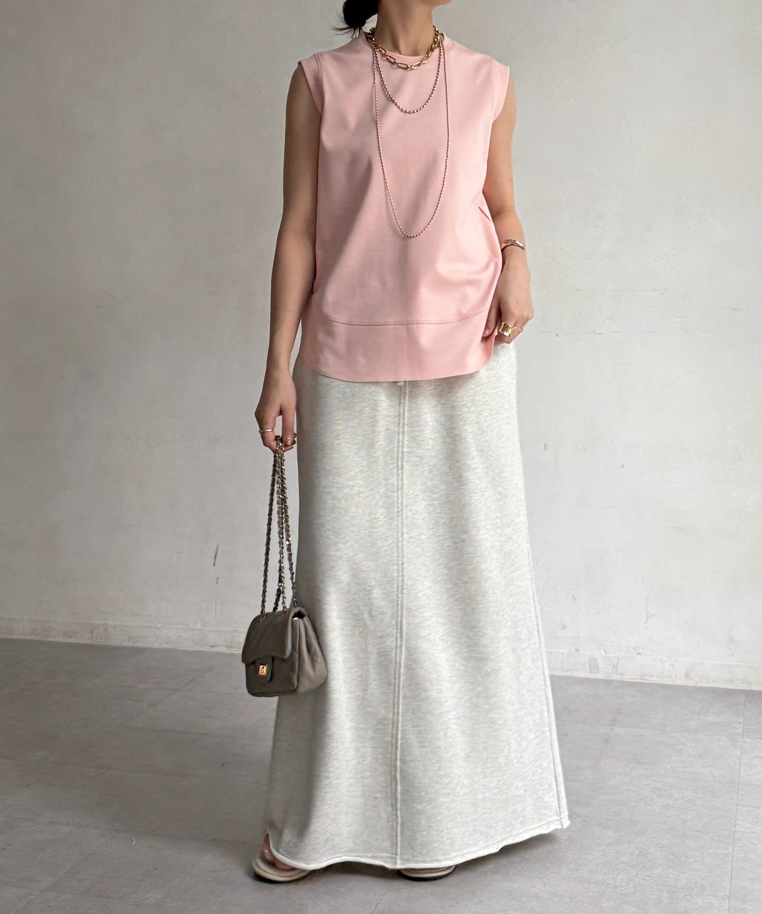 肩まわりは程よくカバーされる設計で、ノースリーブながらも安心感のある着用感。
