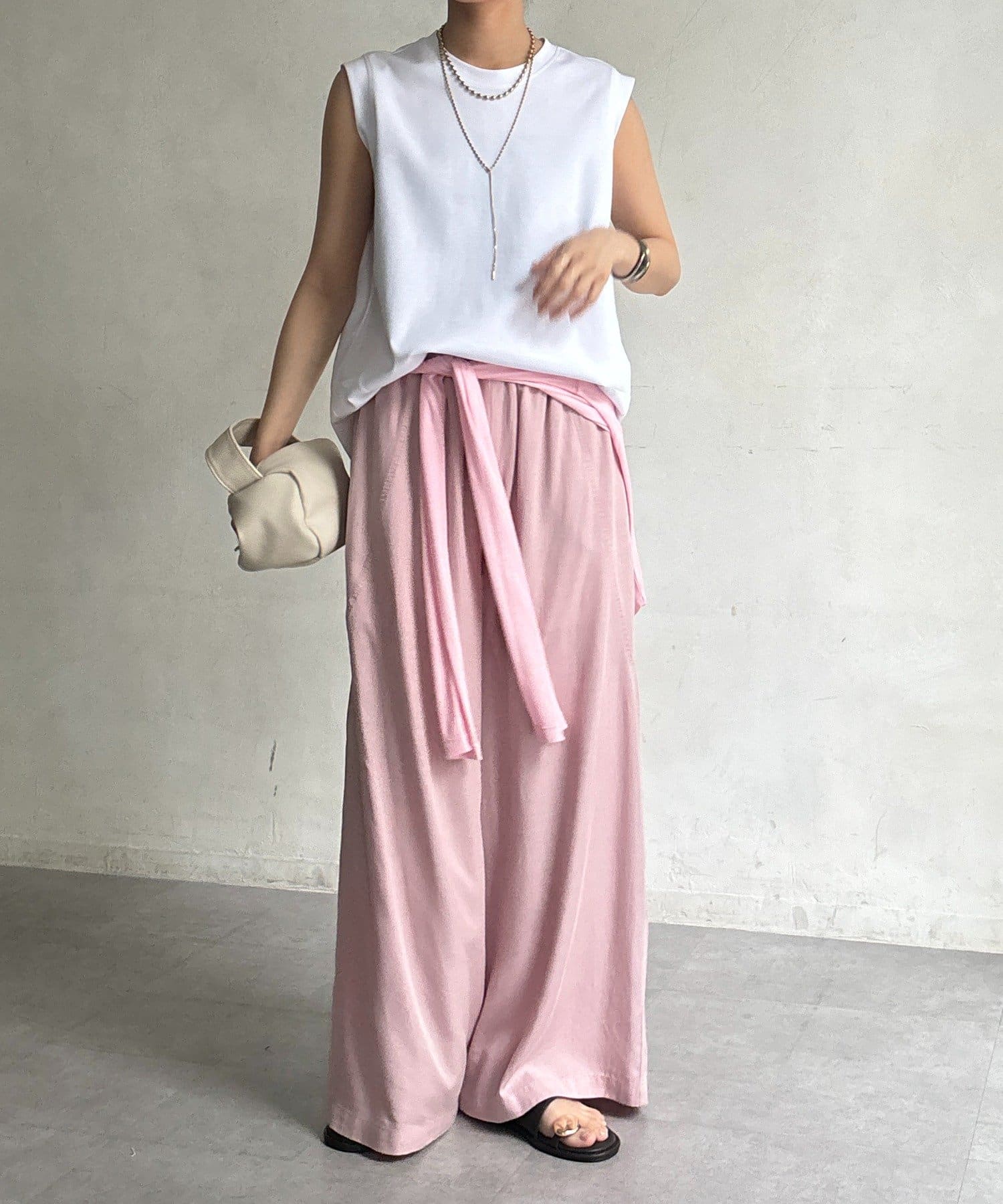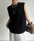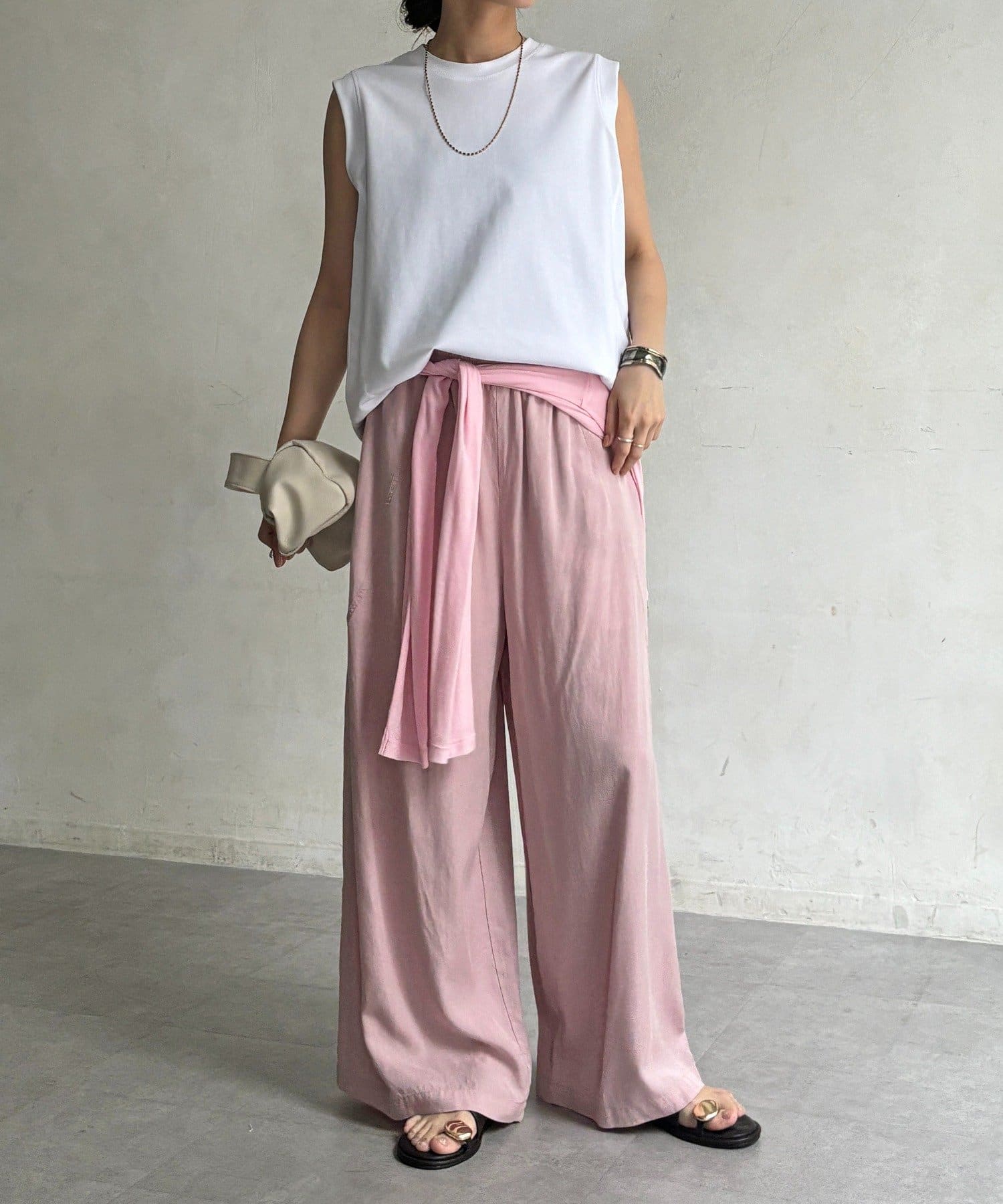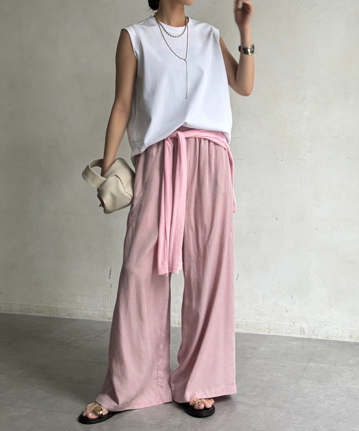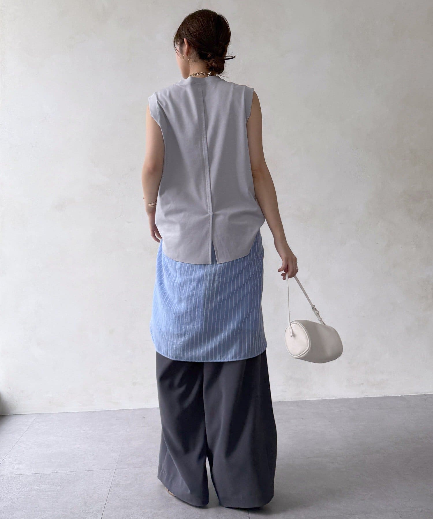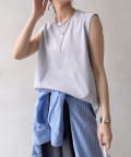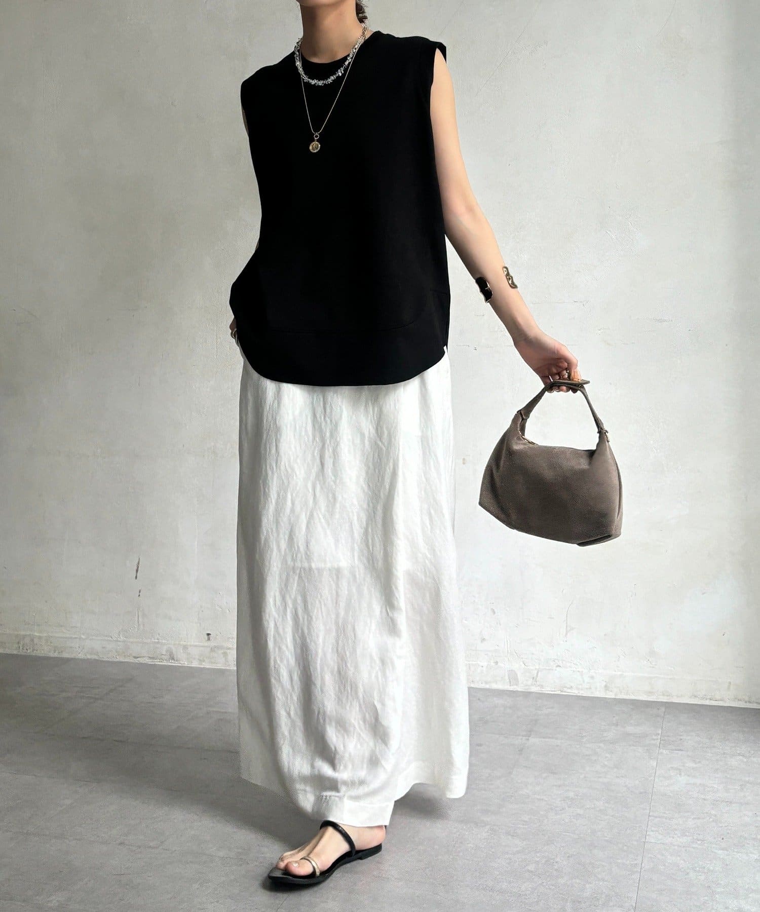肩まわりは程よくカバーされる設計で、ノースリーブながらも安心感のある着用感。