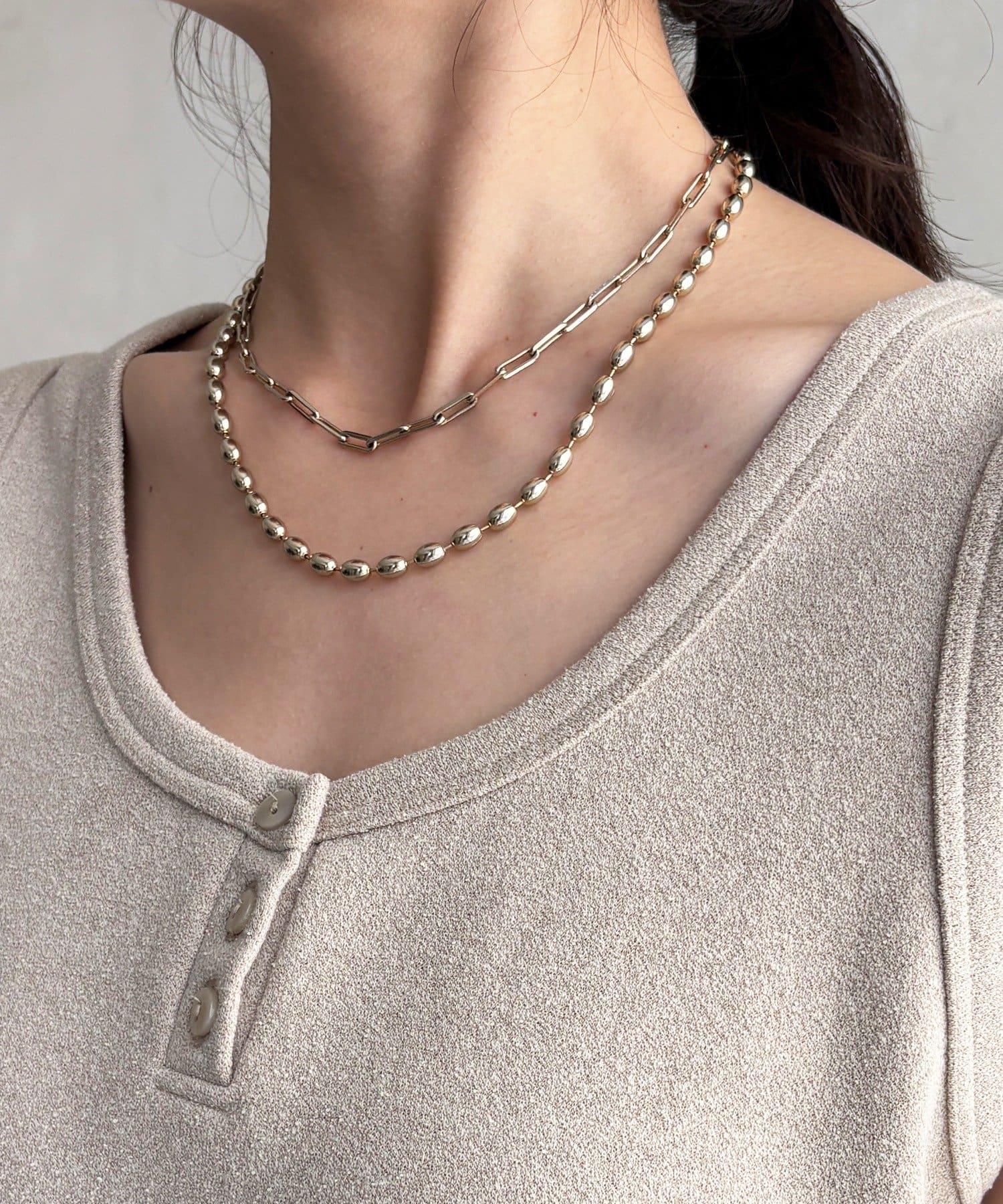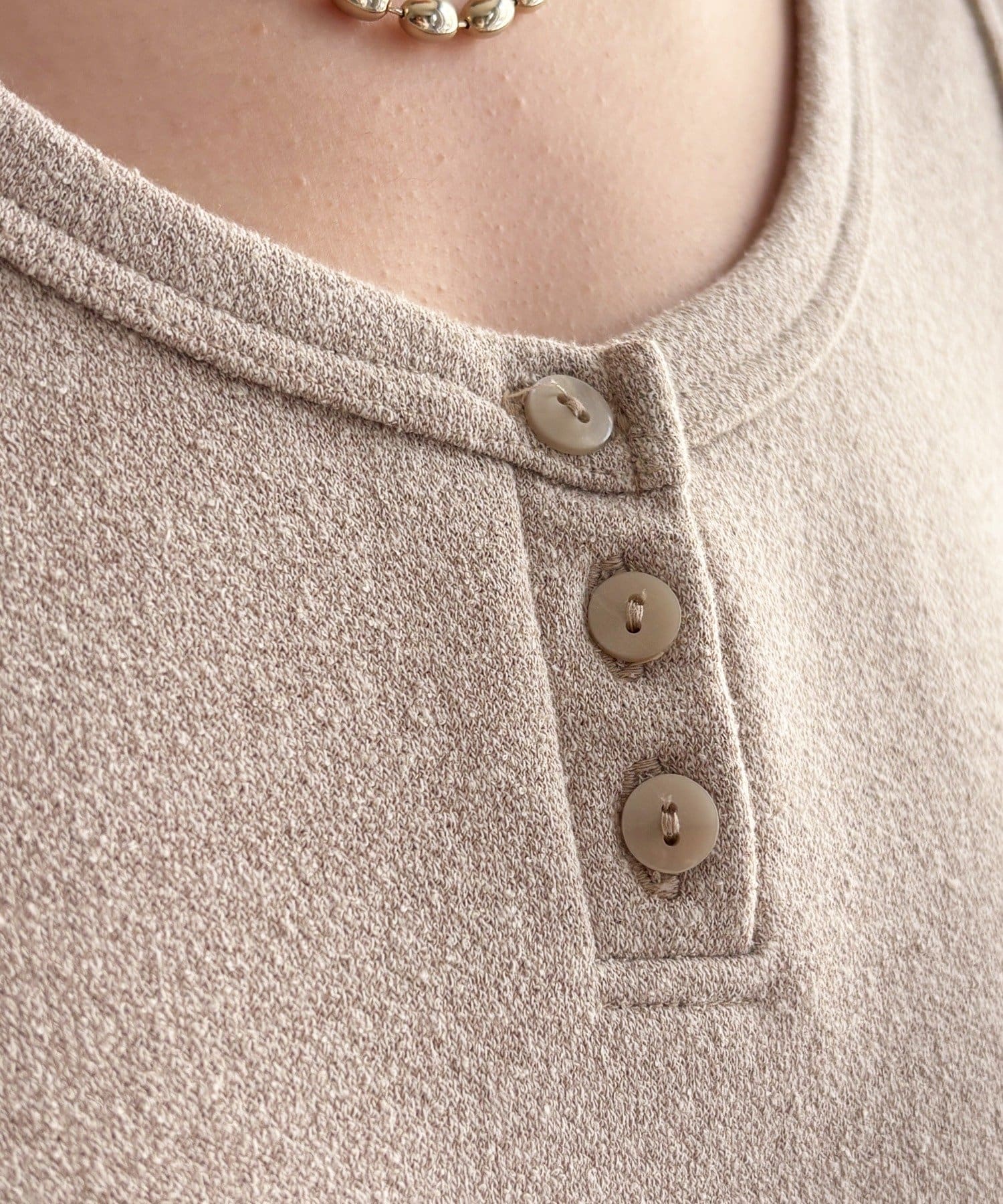 表面感のあるブークレー糸を使用し、ヘンリーネックデザインが首元をすっきり見せてくれ、カジュアルすぎず上品な印象に。