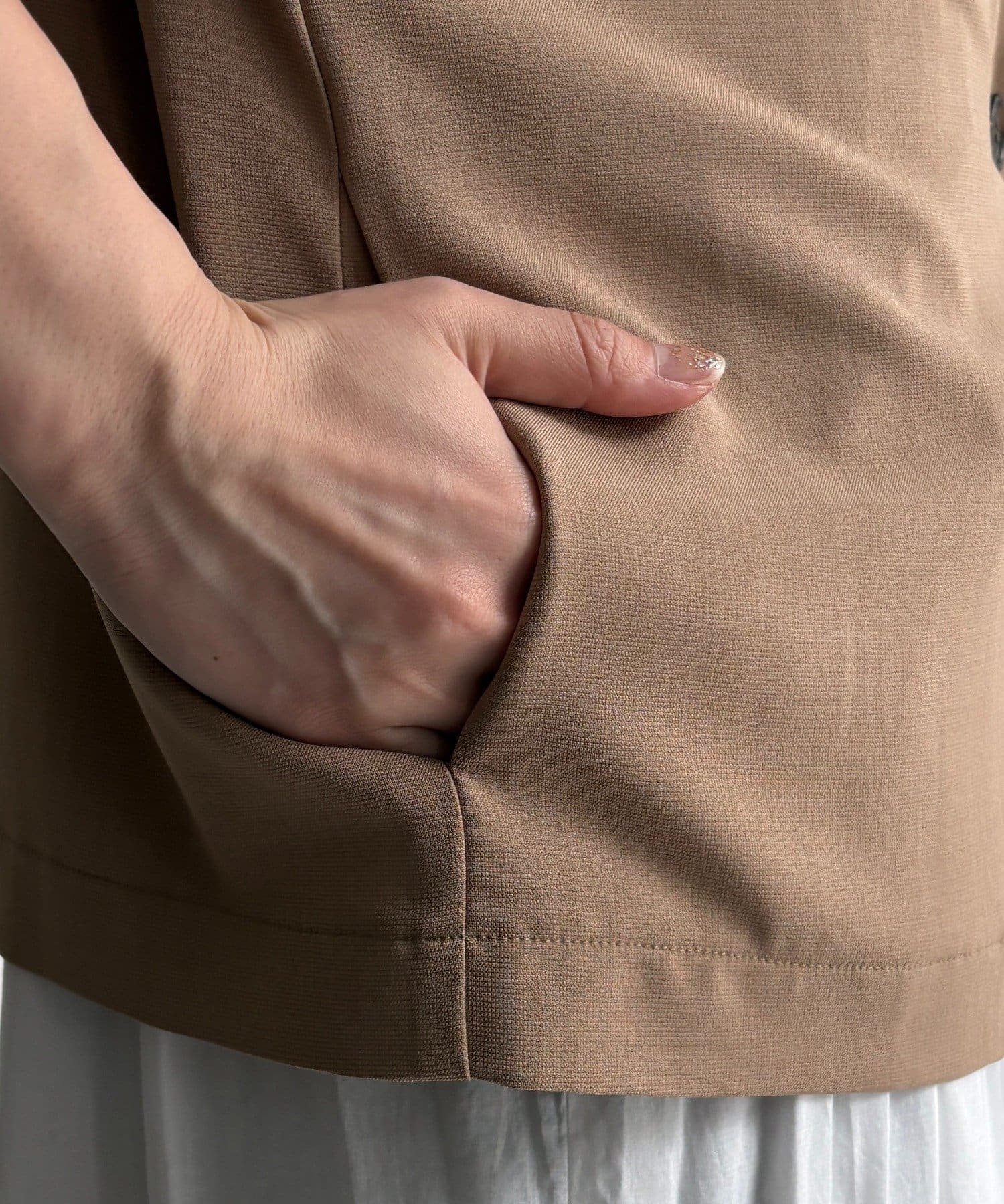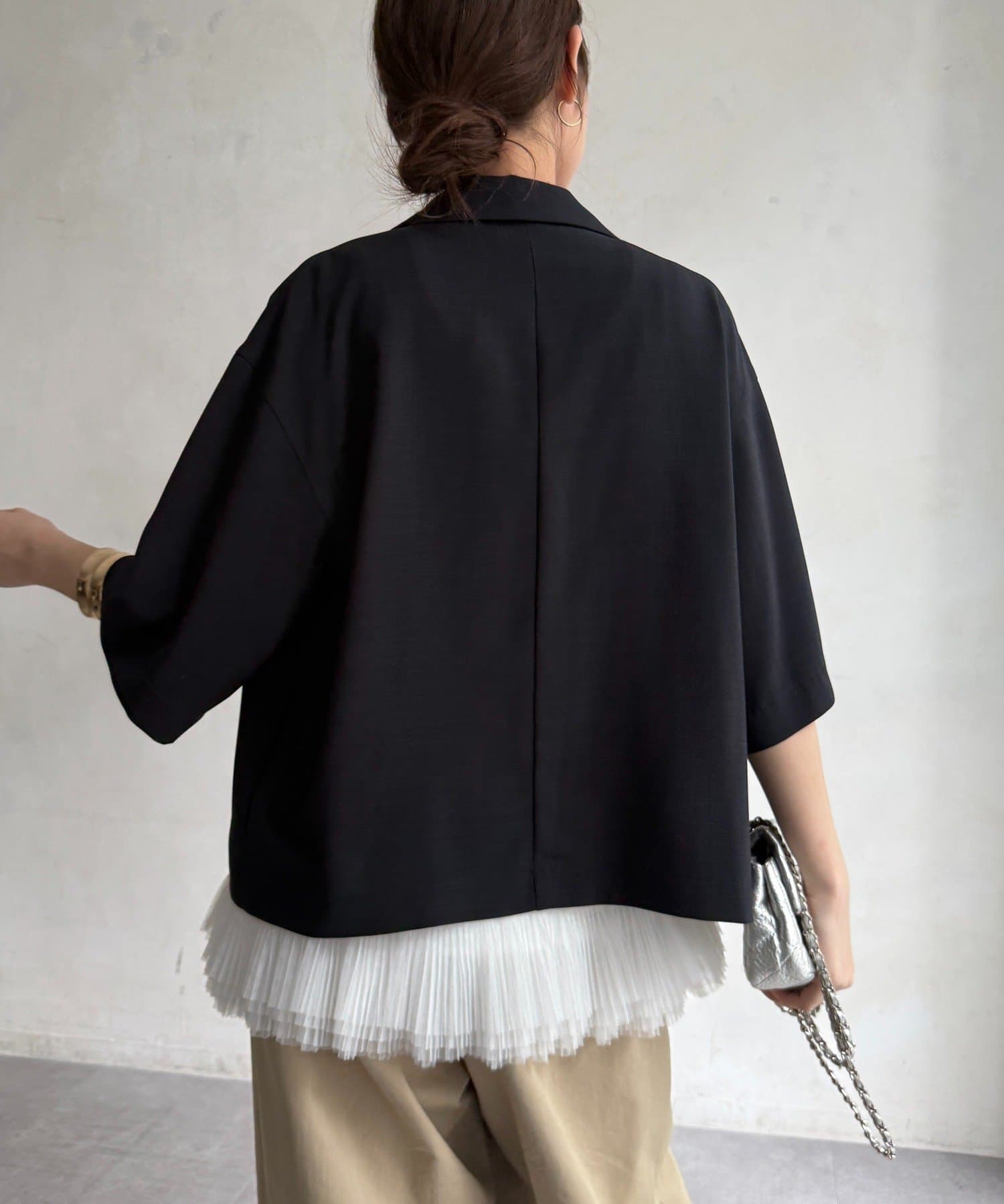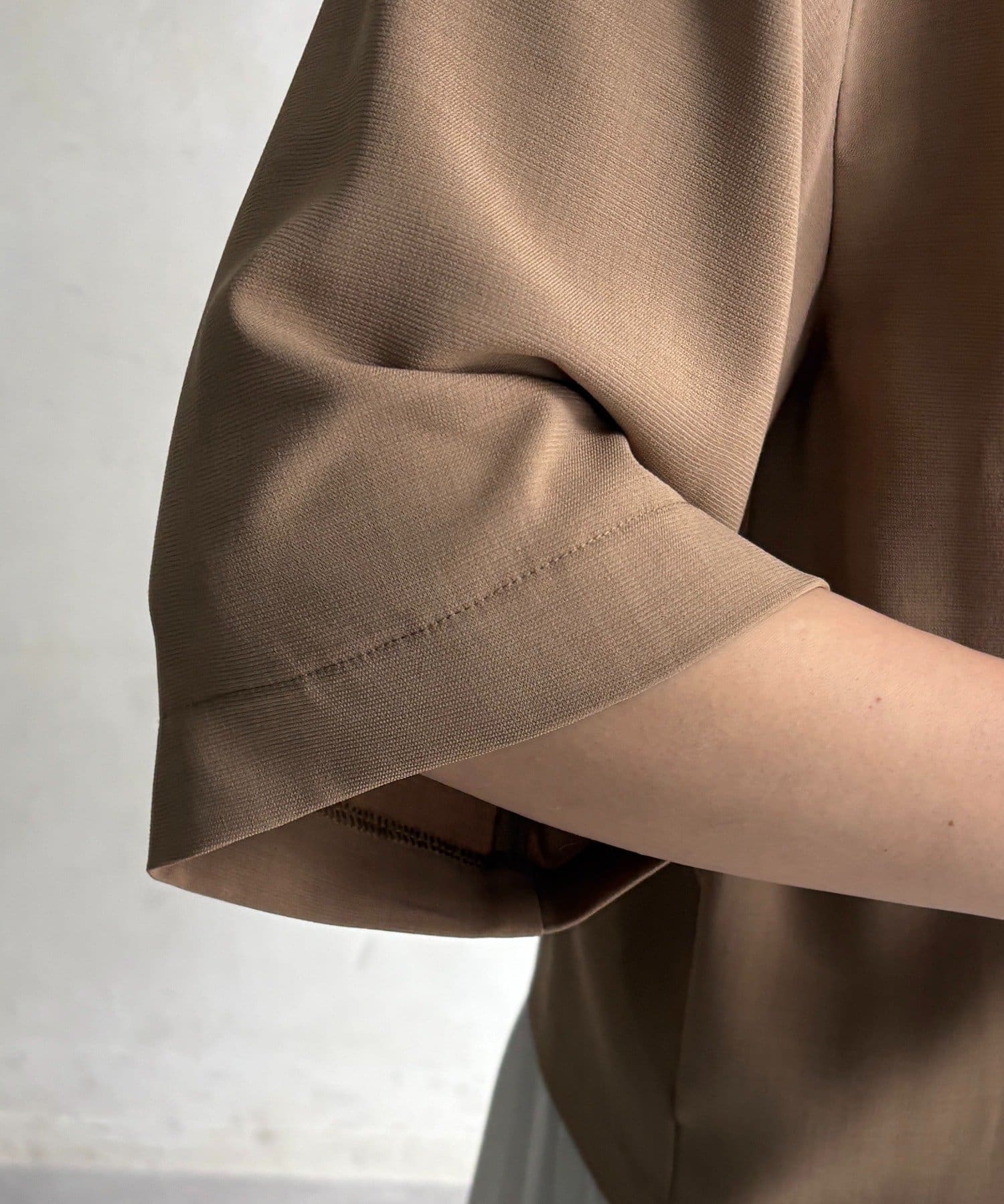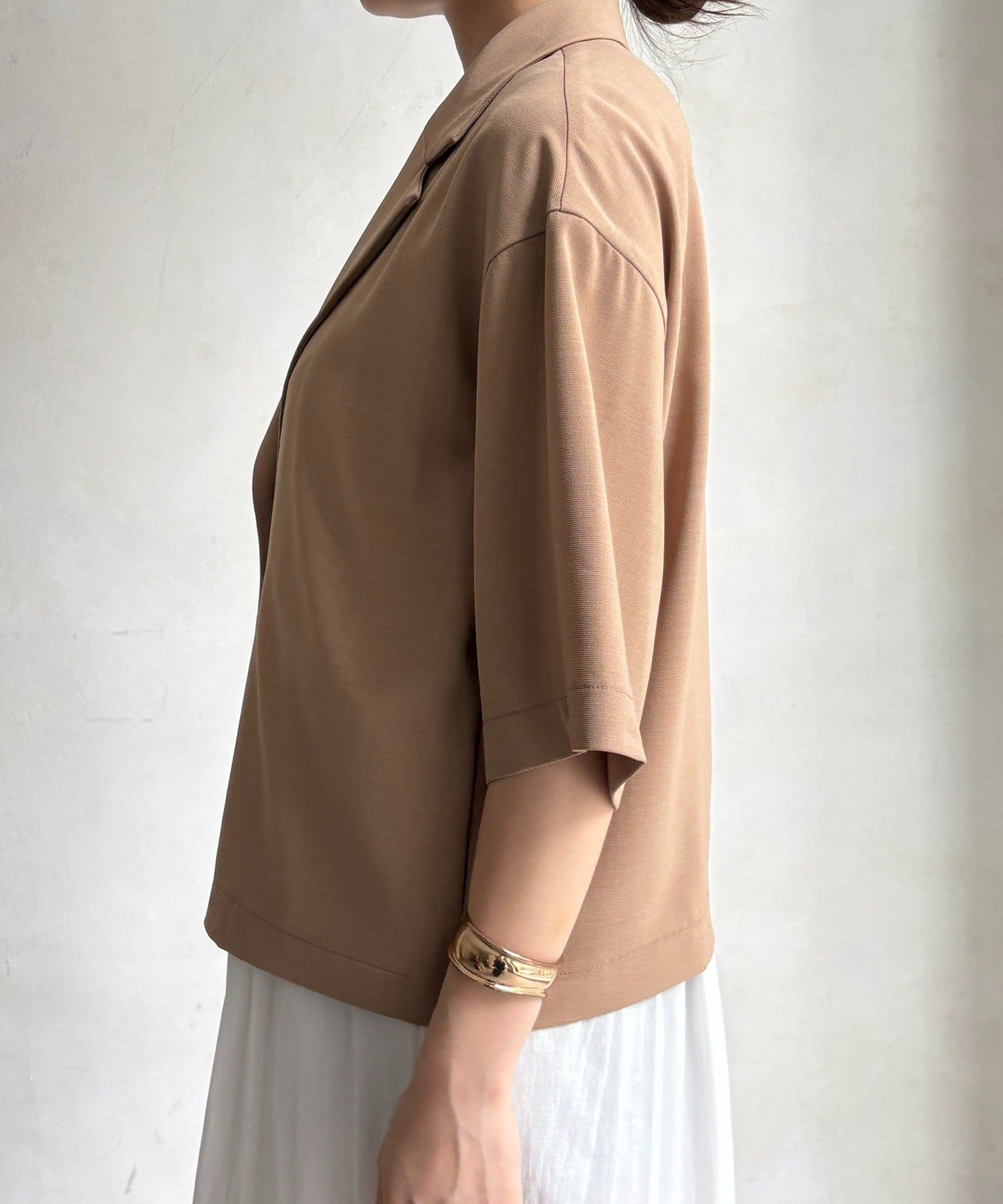 5分袖のデザインは、気になる腕まわりを自然にカバーしつつ、涼しげで抜け感のある印象に。
