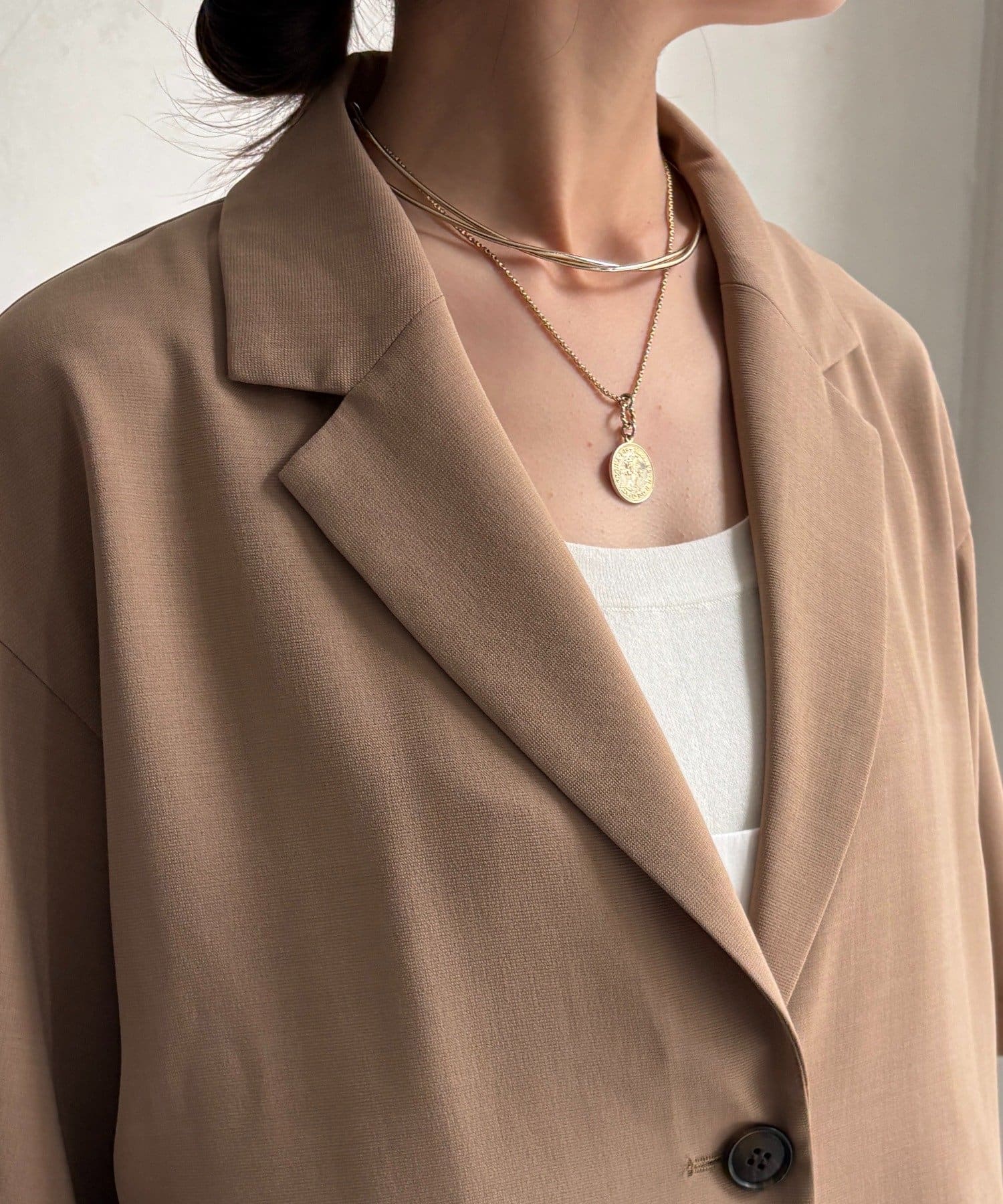 シンプルで洗練されたデザインに、程よい抜け感をプラスした一着で、デイリーからきれいめスタイルまで幅広く活躍します。