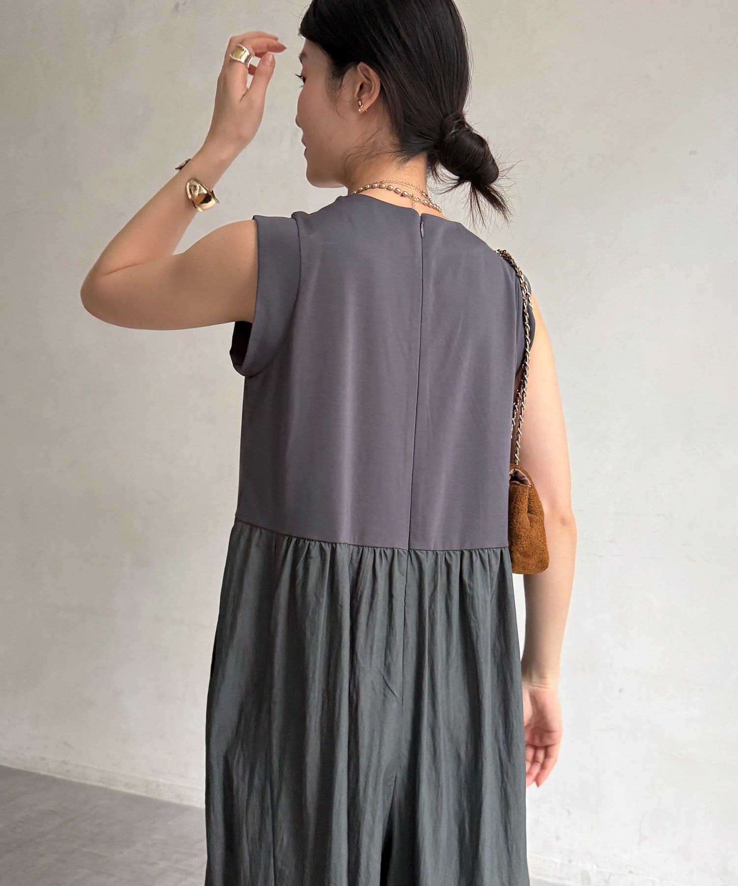 ワントーンでも素材のコントラストにより単調にならず、奥行きのある着こなしができますよ!