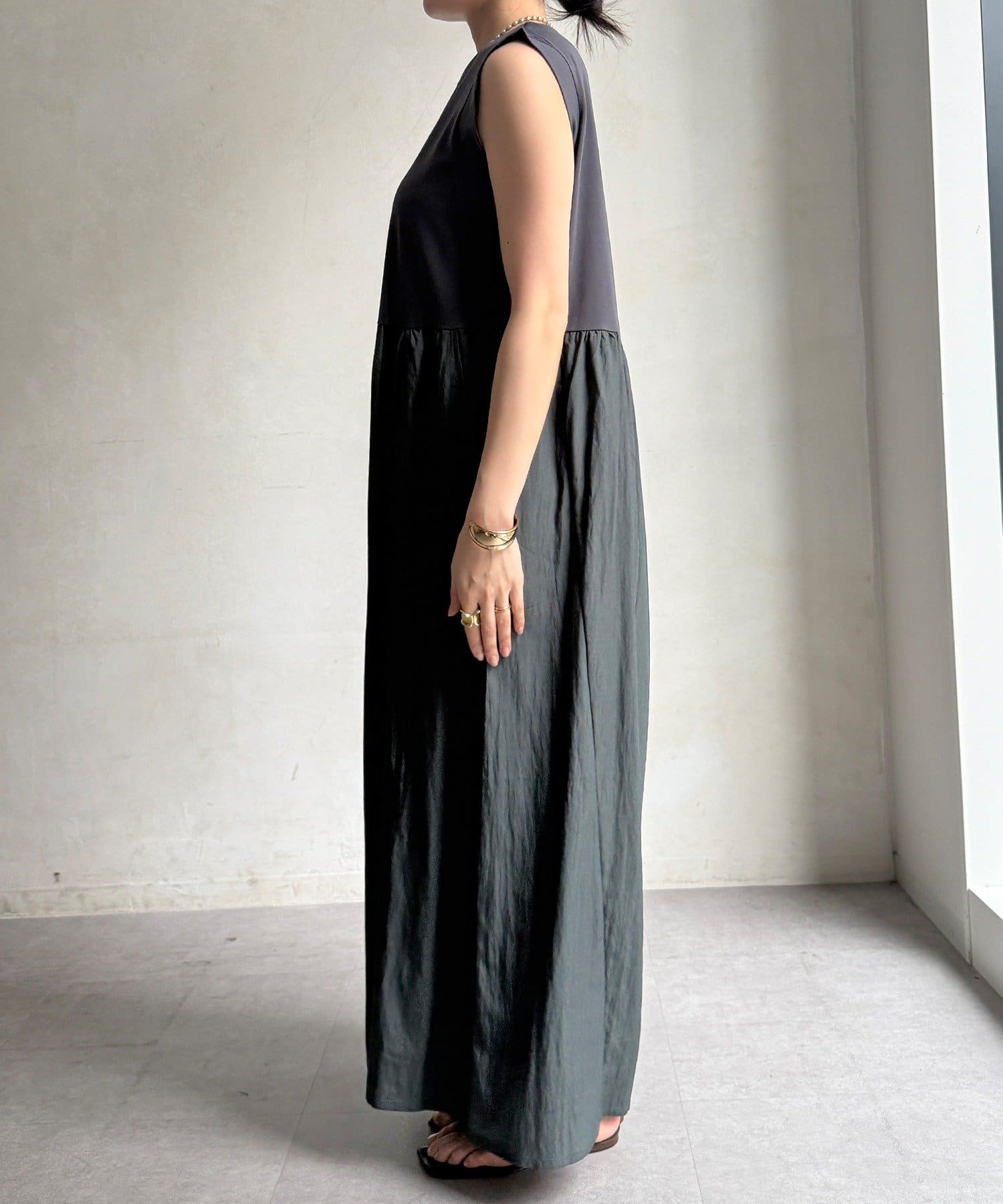 ウエストの高い位置で切替られているので、脚長効果が抜群です。
