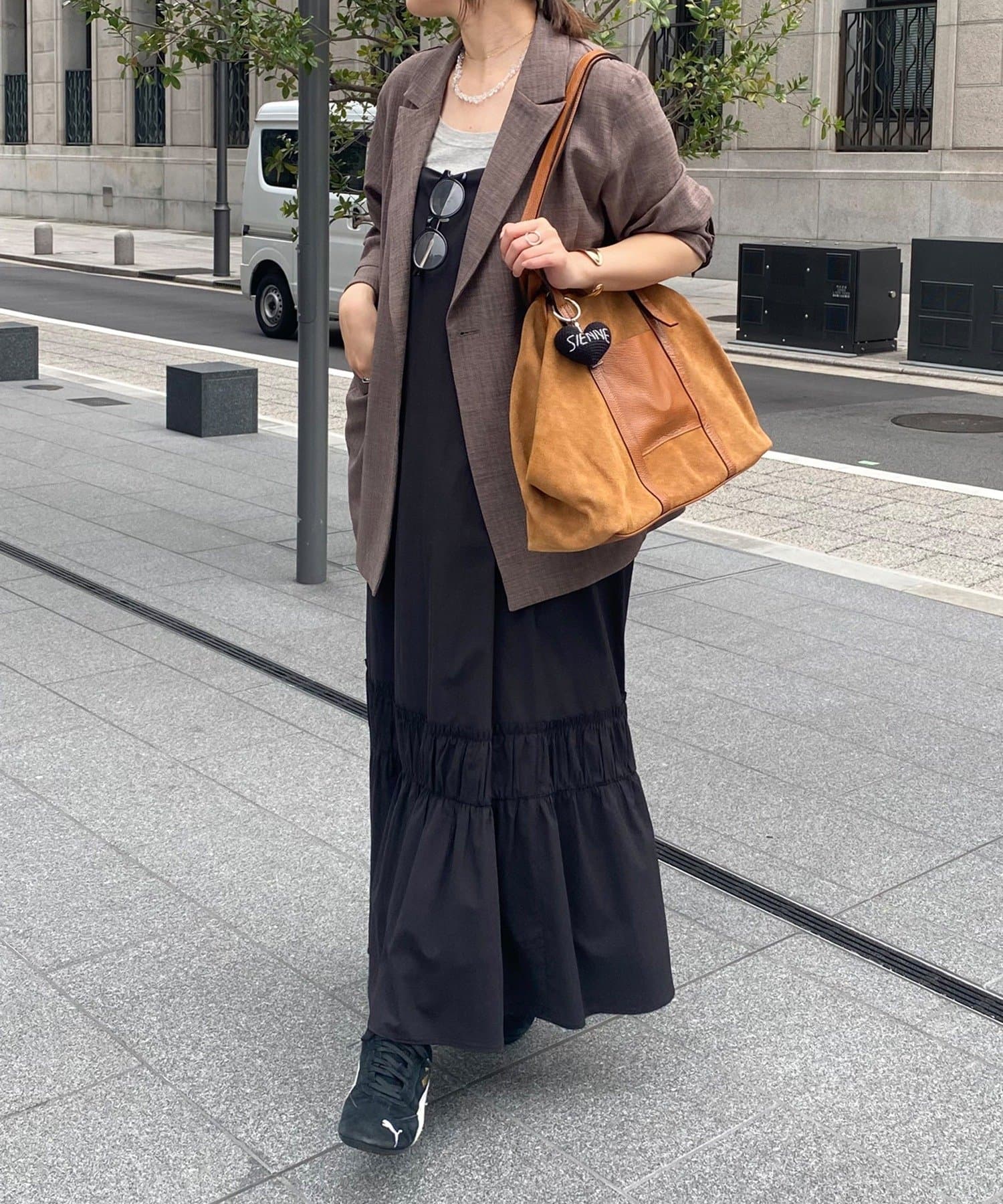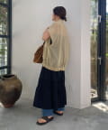 お腹やお尻のラインを拾わないたっぷりとした身幅と、広がらない落ち感がポイントです。
