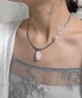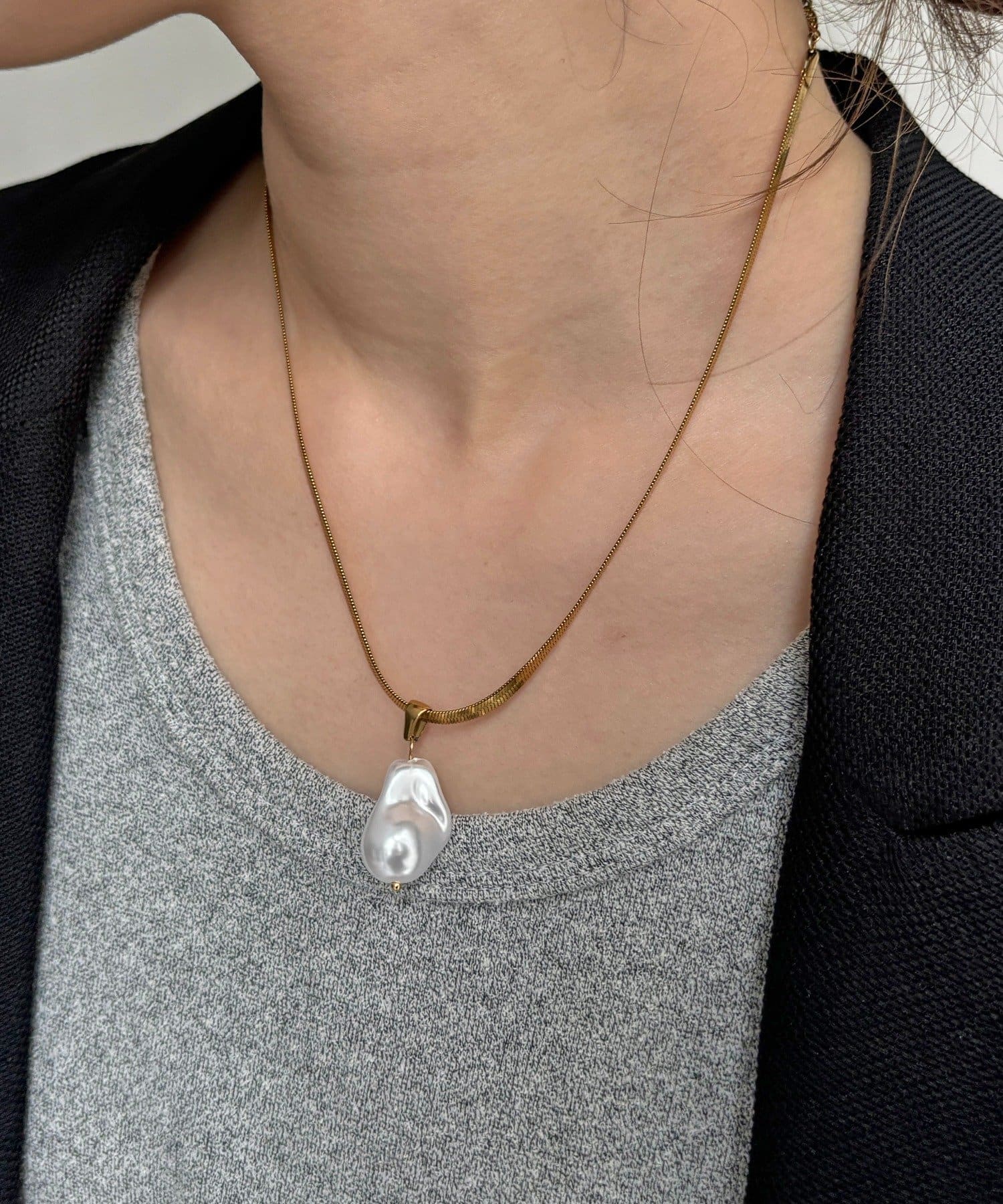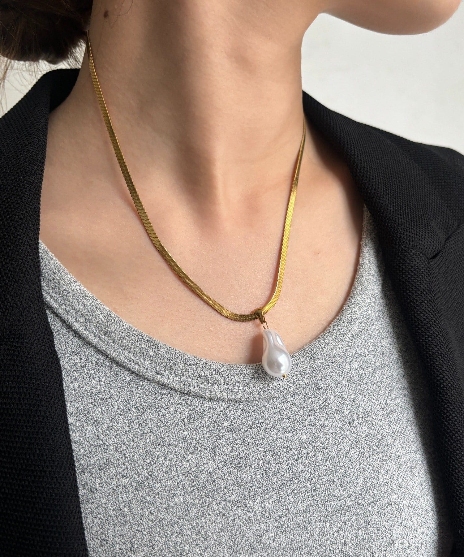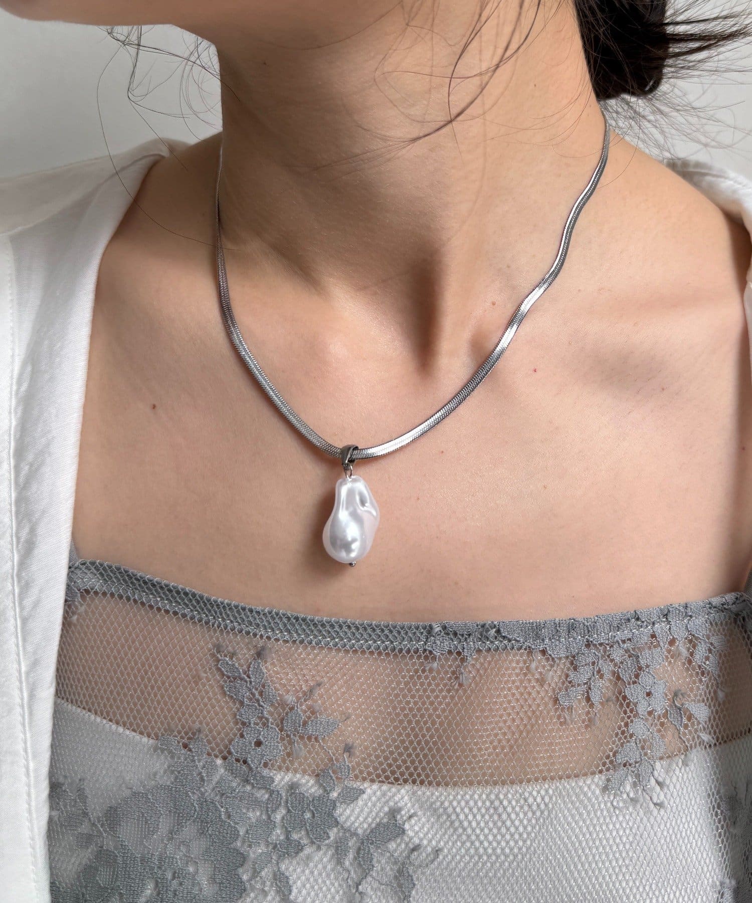 チェーン部分は、程よい光沢感のあるフラットな質感が特徴で、首元に沿うように美しくフィット。