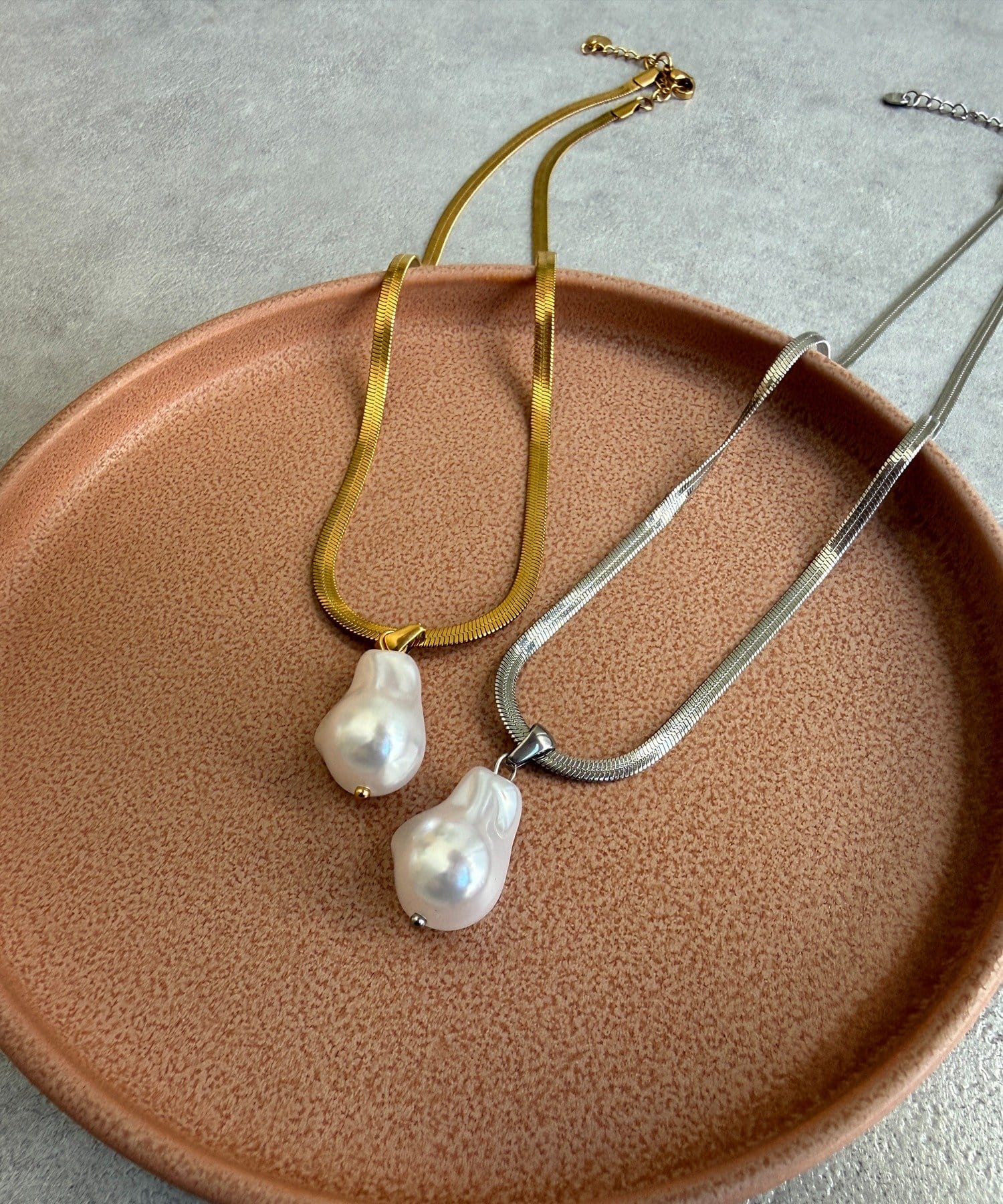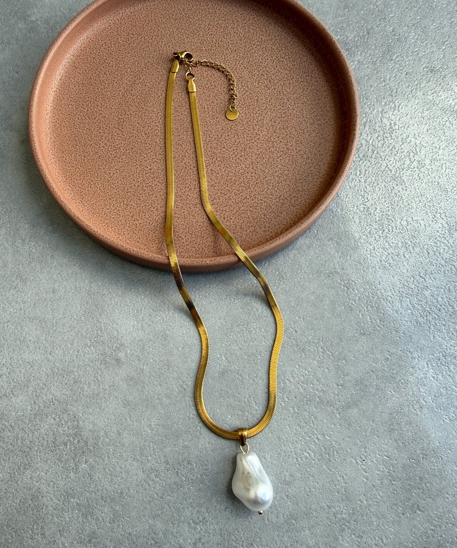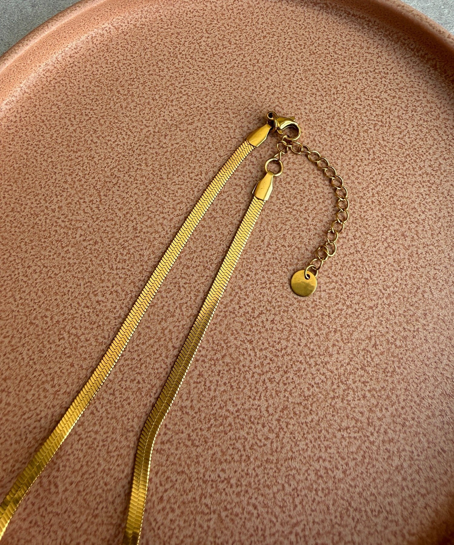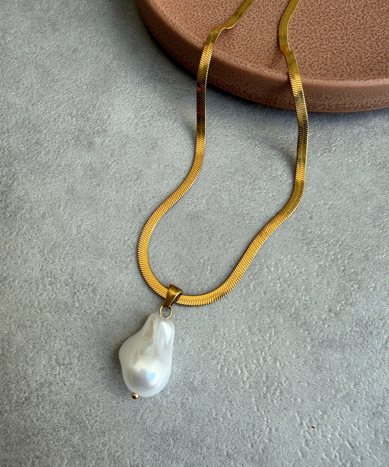 チェーン部分は、程よい光沢感のあるフラットな質感が特徴で、首元に沿うように美しくフィット。