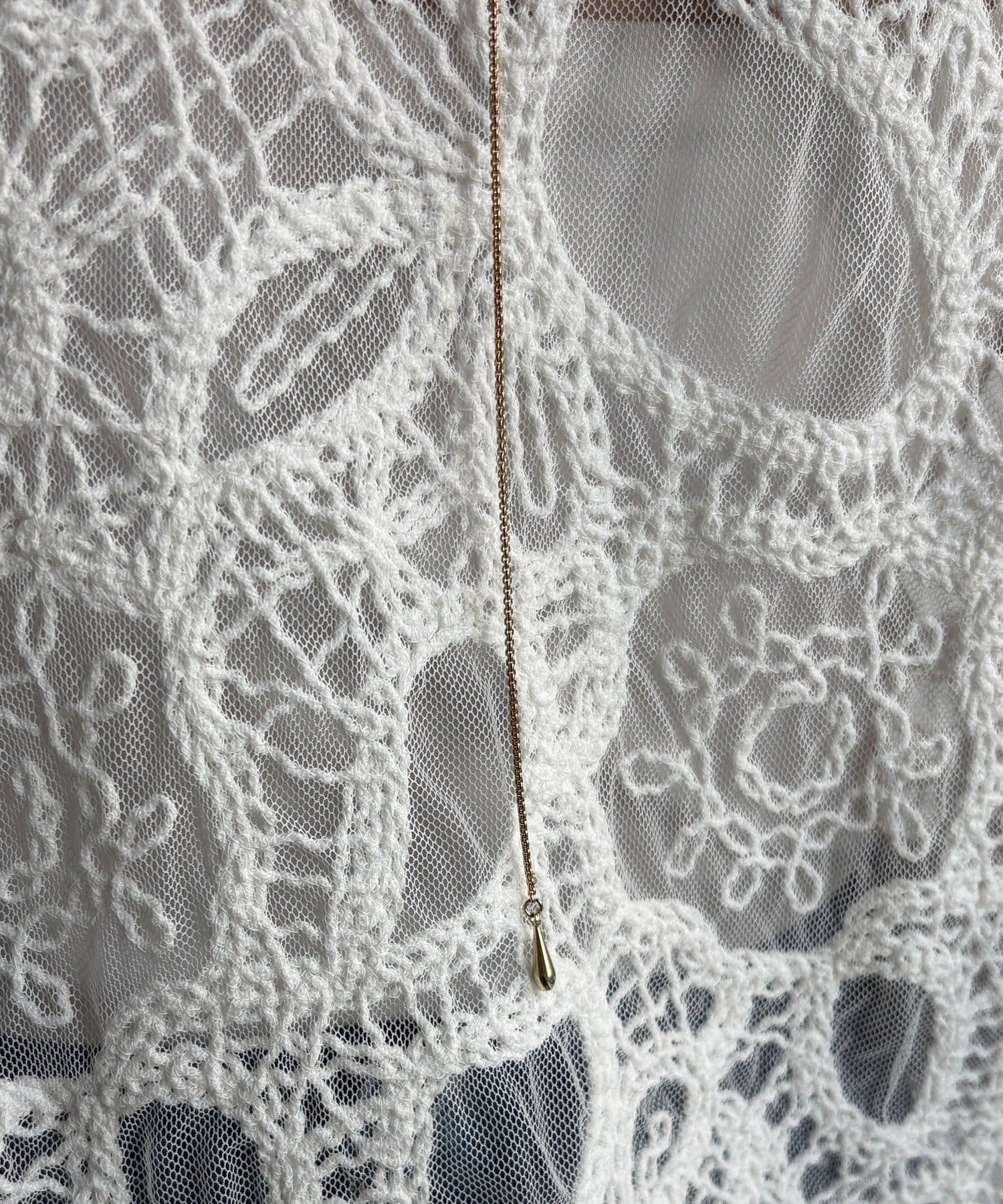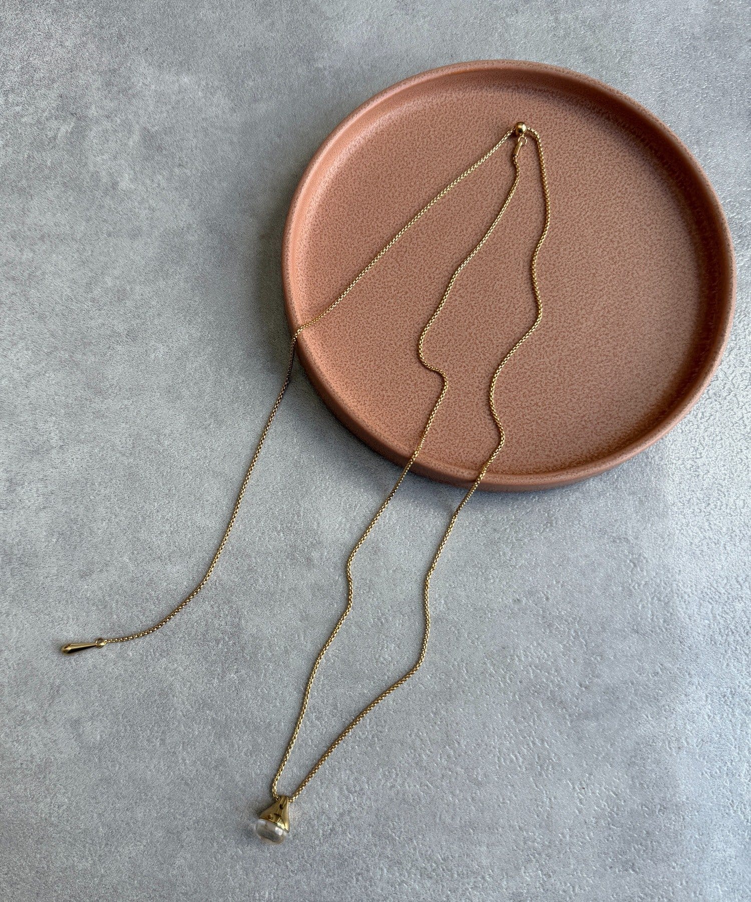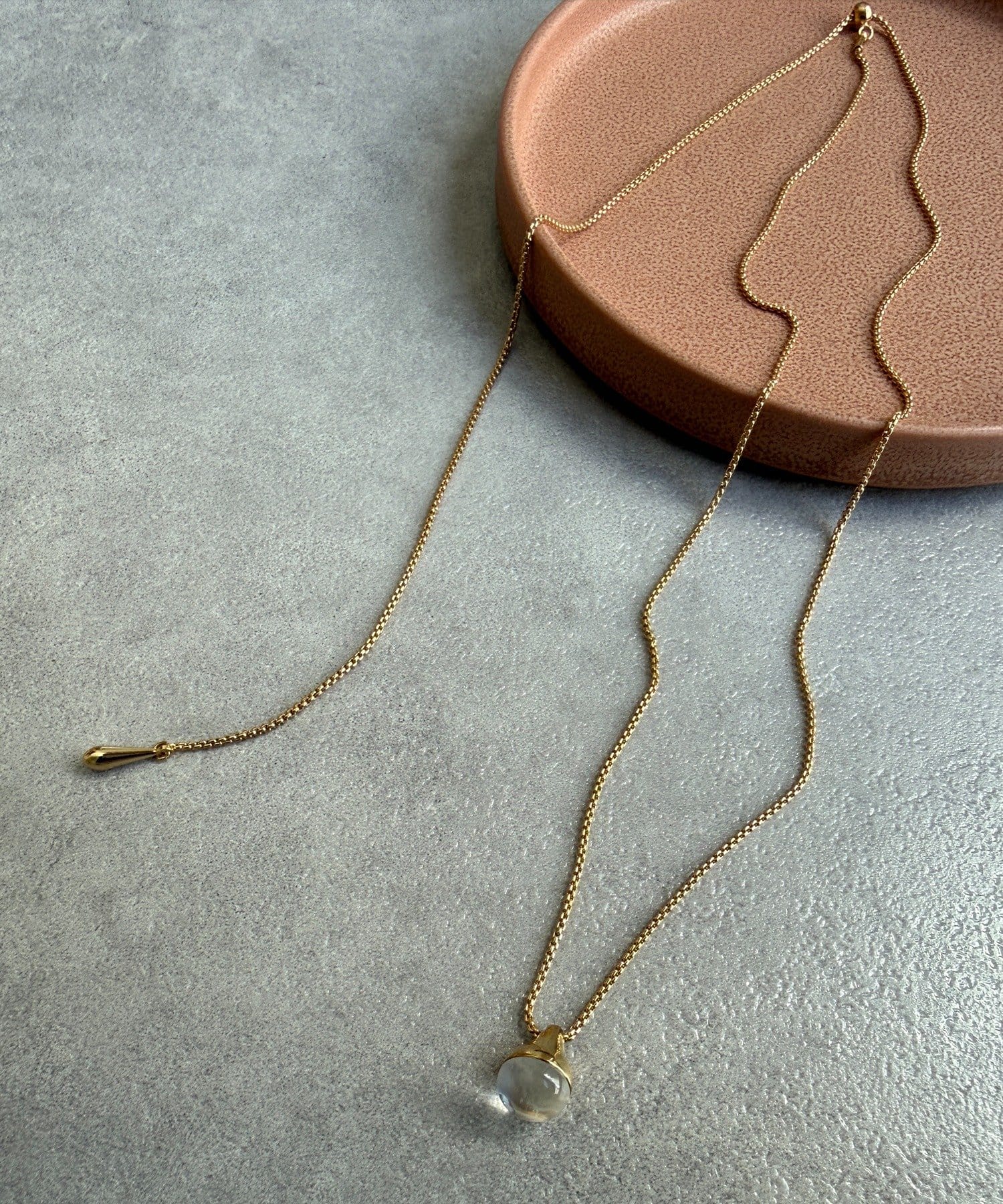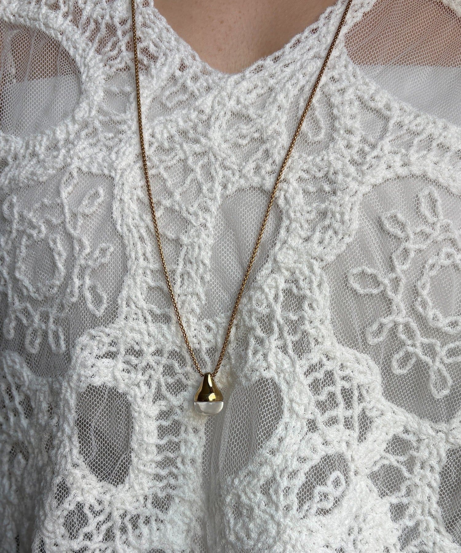 ころんとした柔らかなフォルムのしずくモチーフは、光を受けるたびに繊細に輝き、デコルテに自然な立体感をプラス。