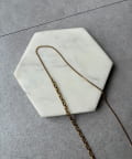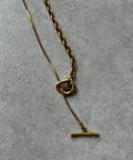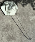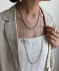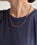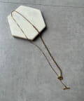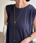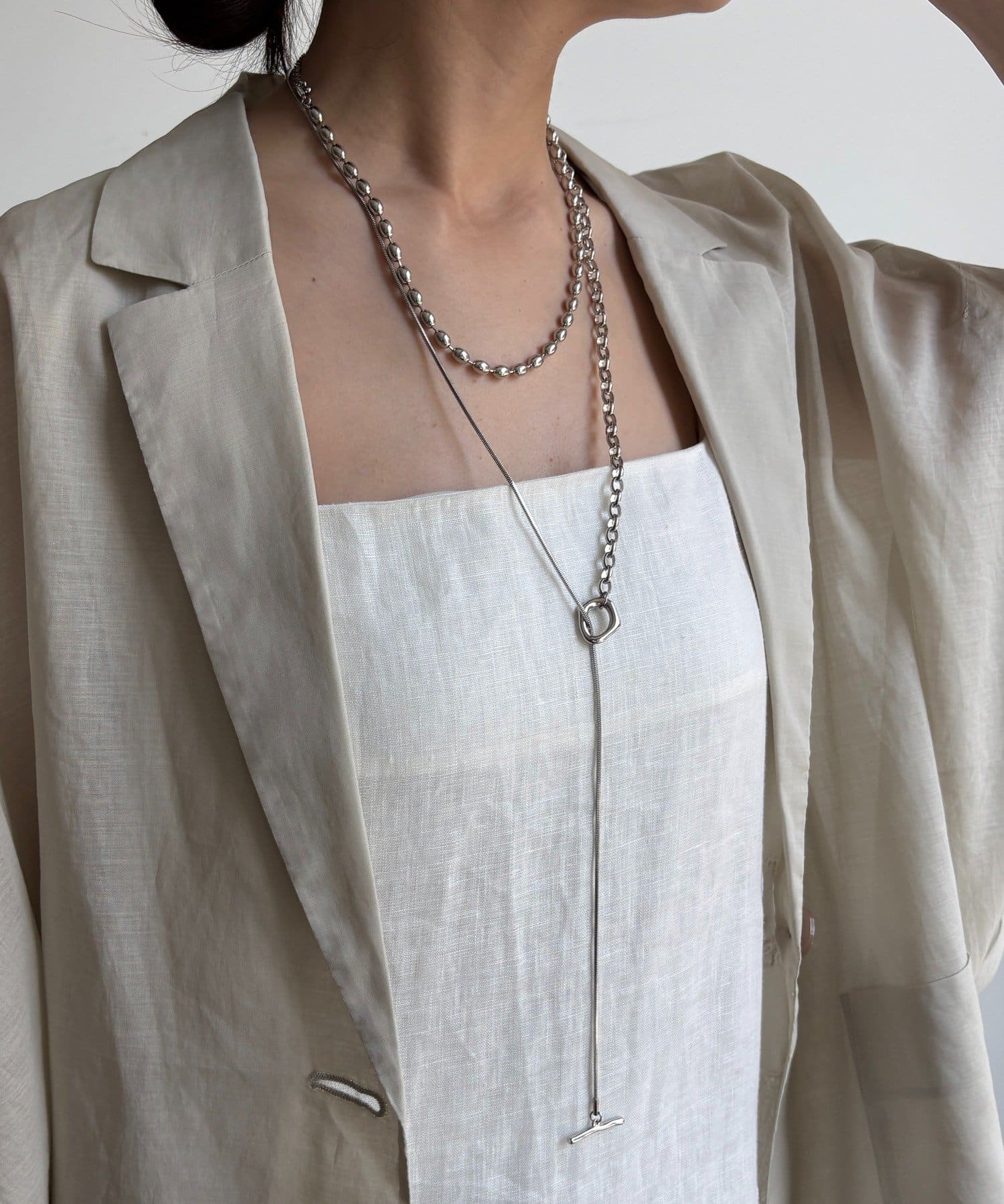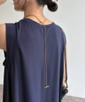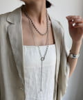 ネックラインに沿うチェーンと、縦に流れるロングチェーンの組み合わせが、立体感と奥行きを生み出します。