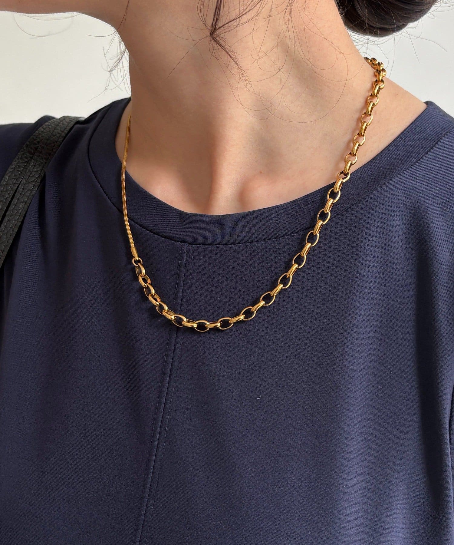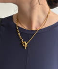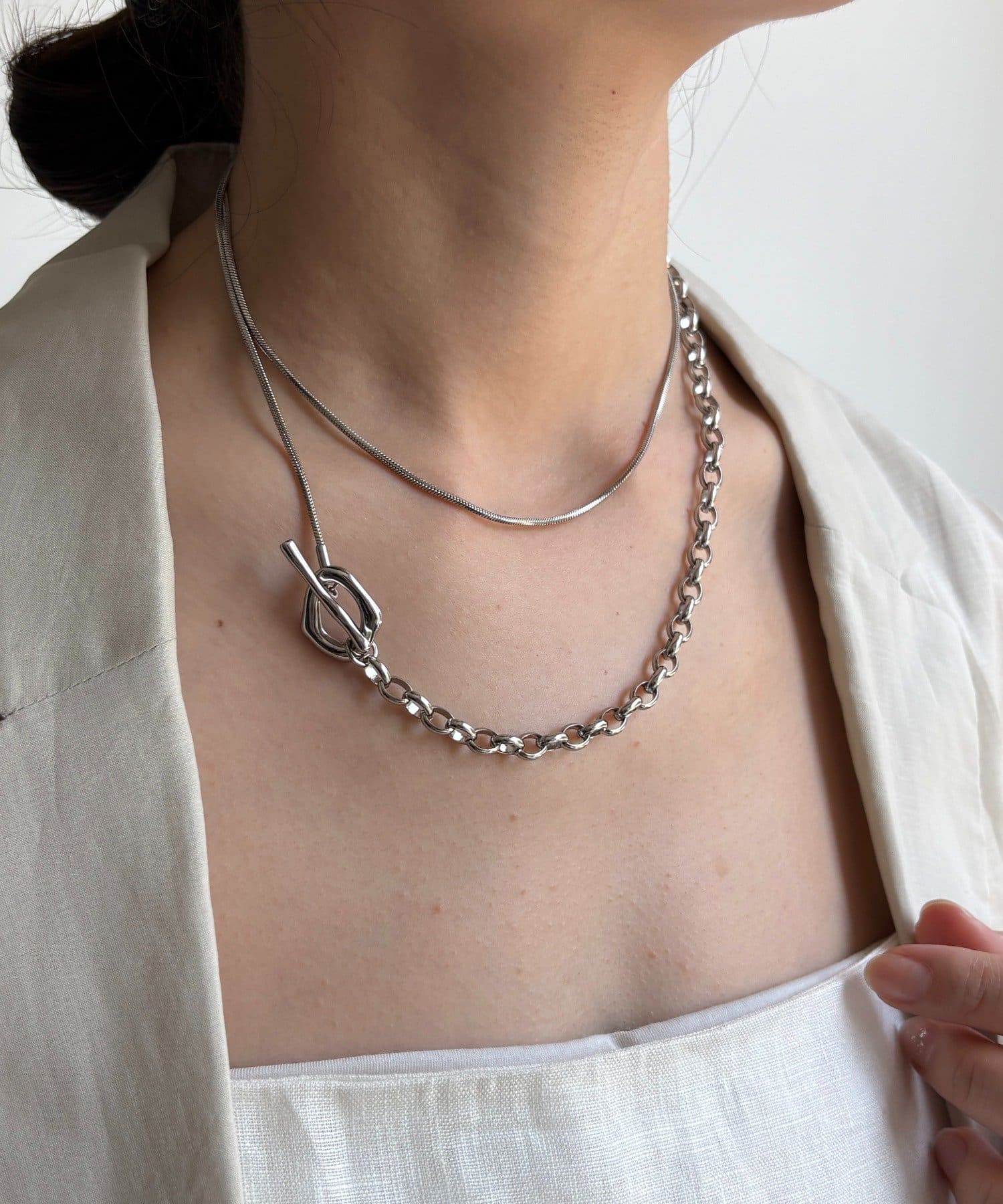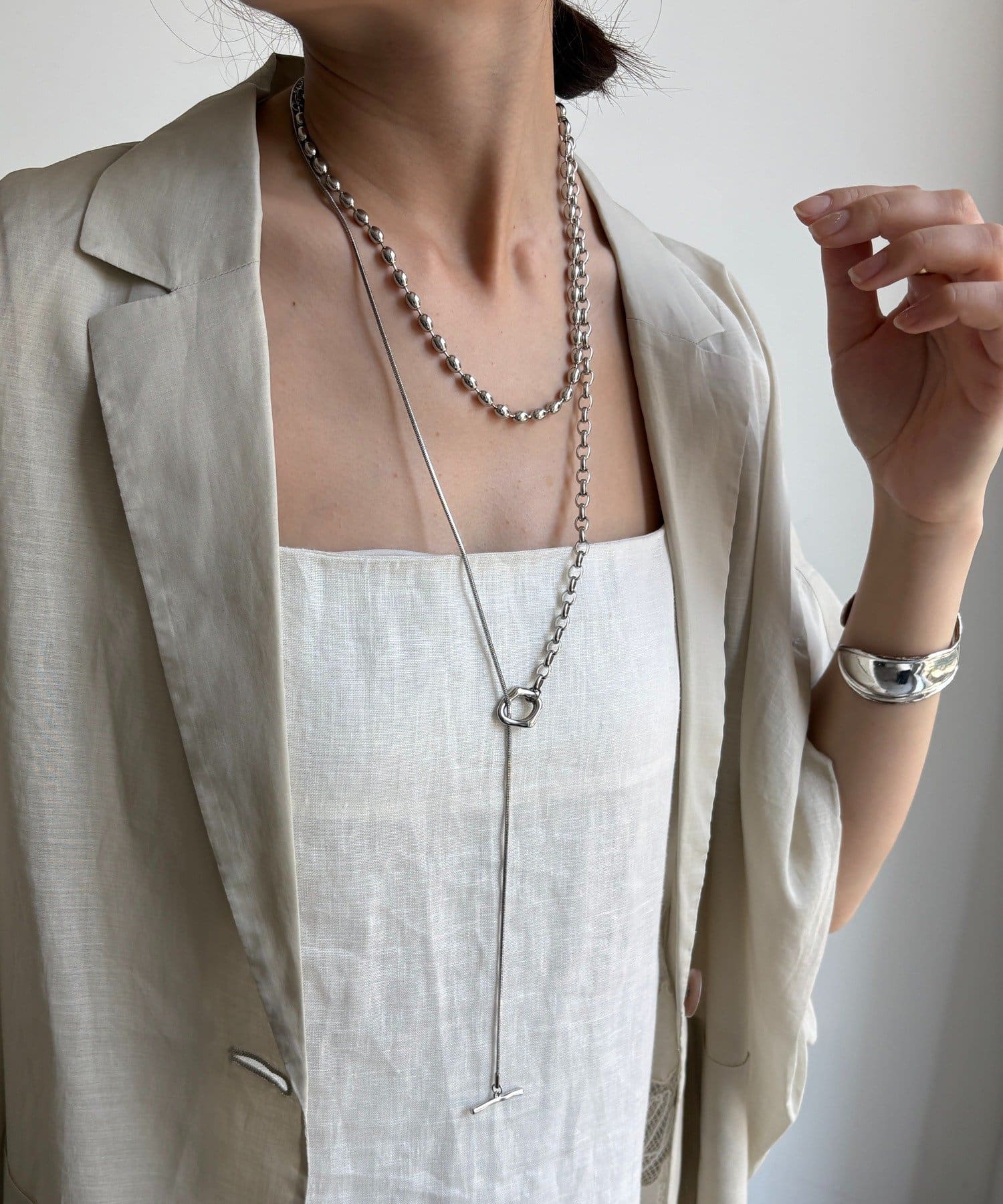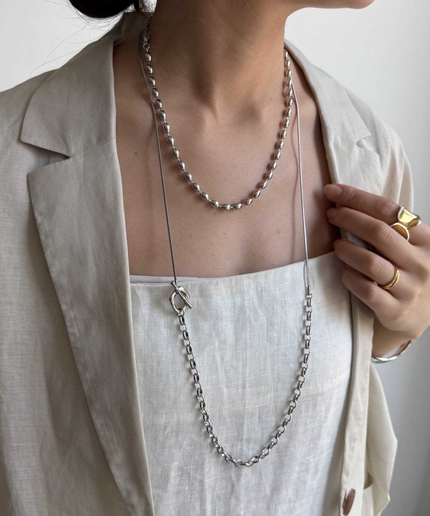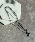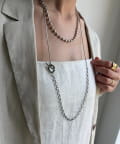 また、異なるチェーンの質感が絶妙なコントラストを生み出し、単調になりがちなアクセサリー使いに変化をプラスしてくれます。