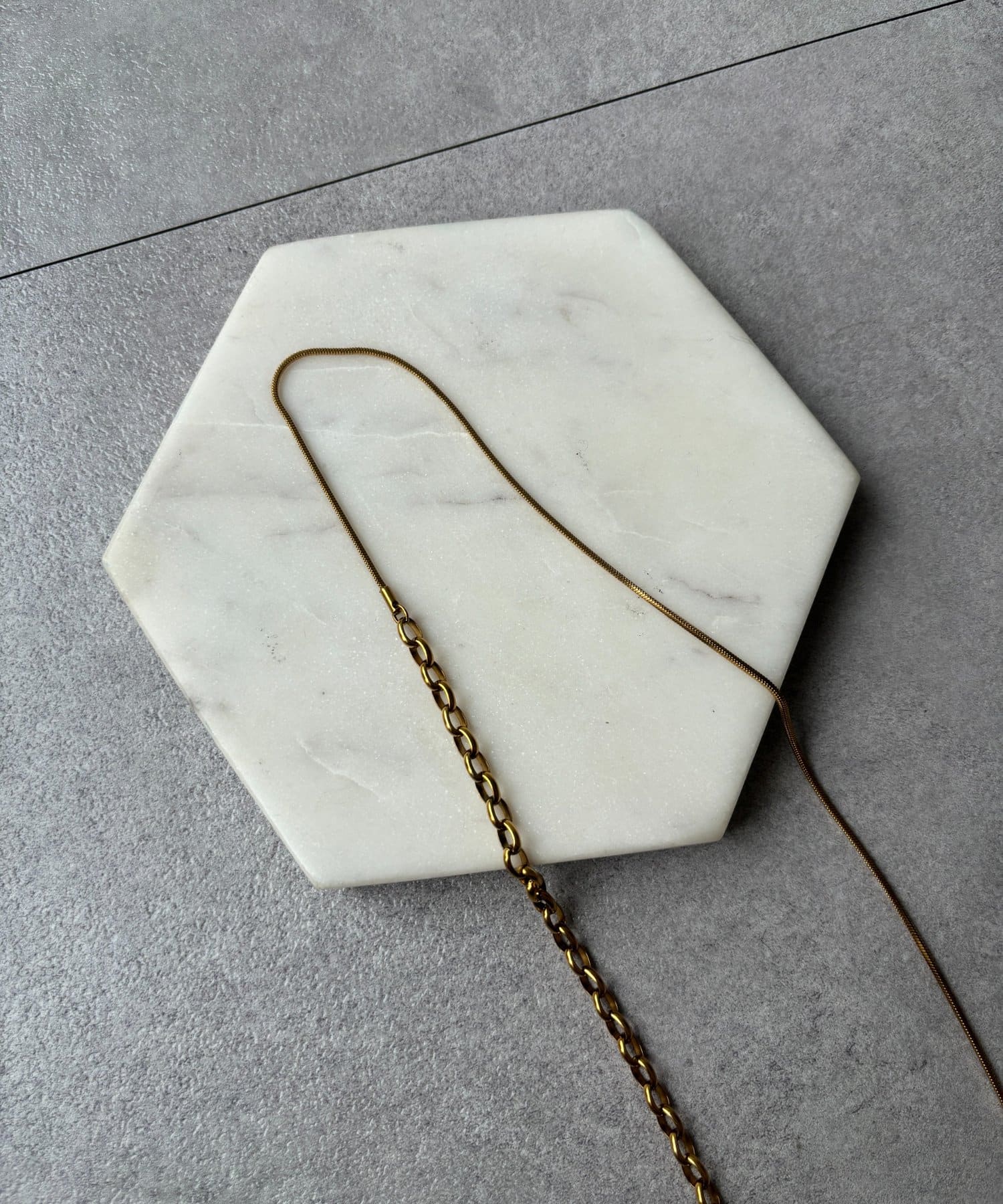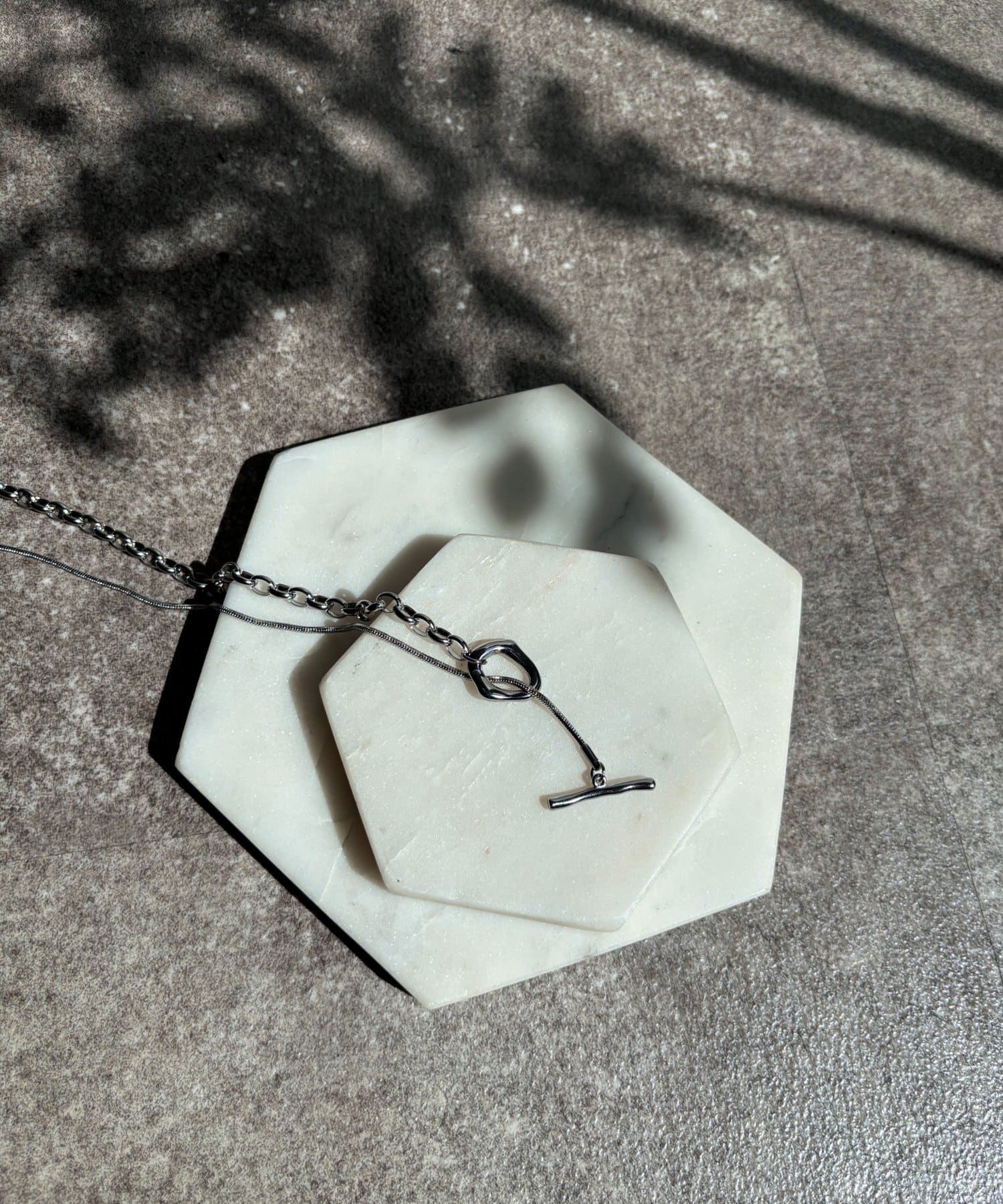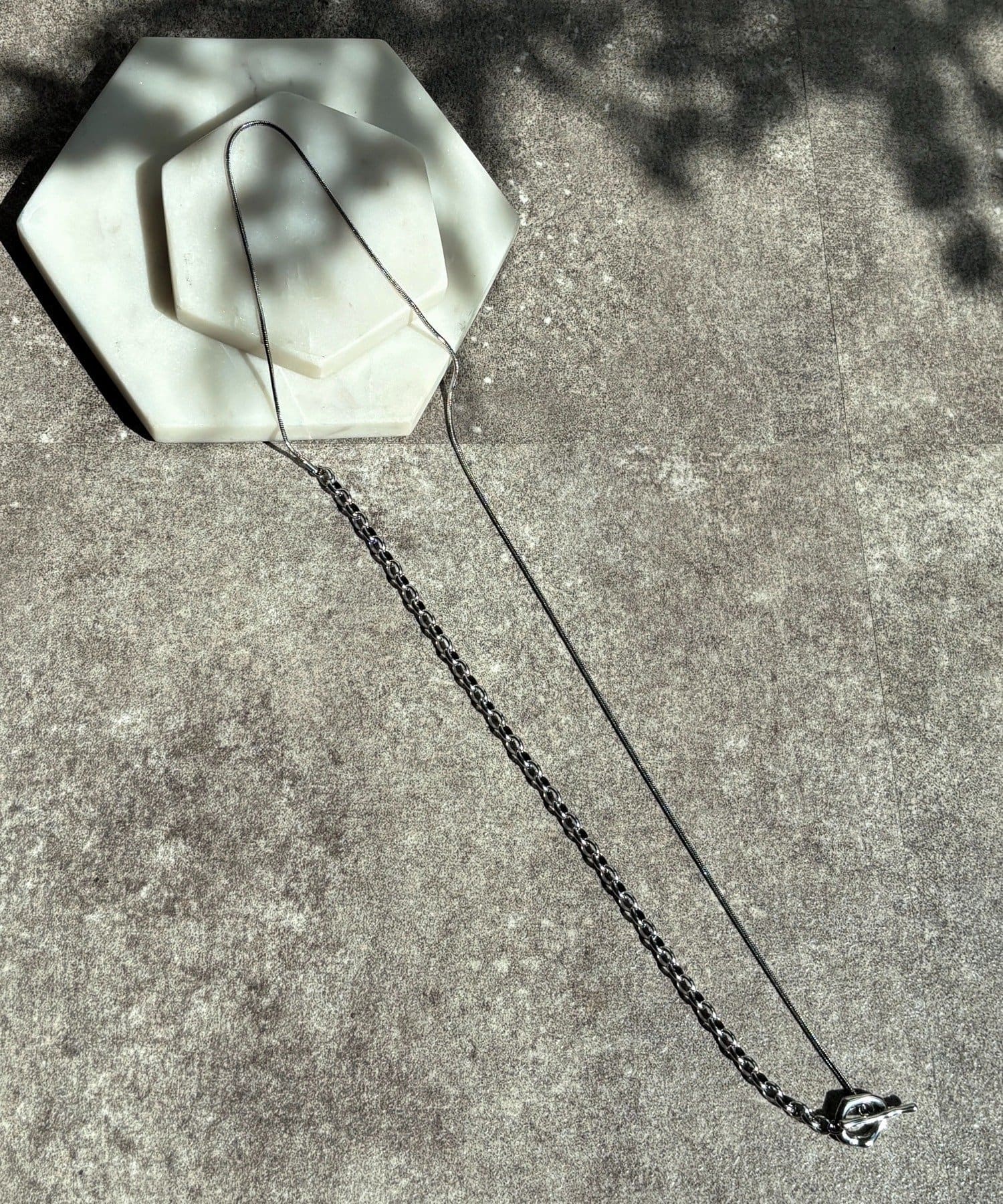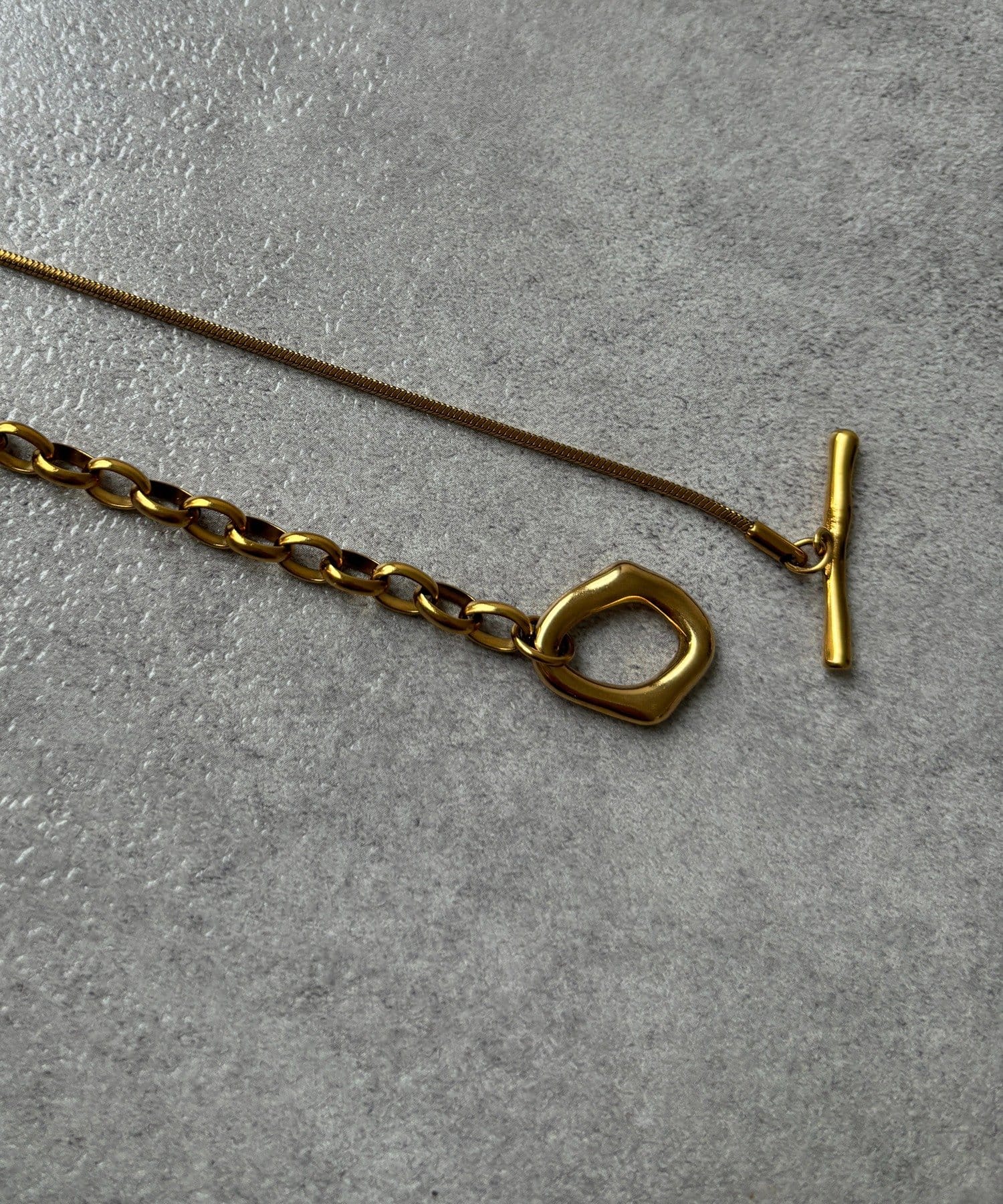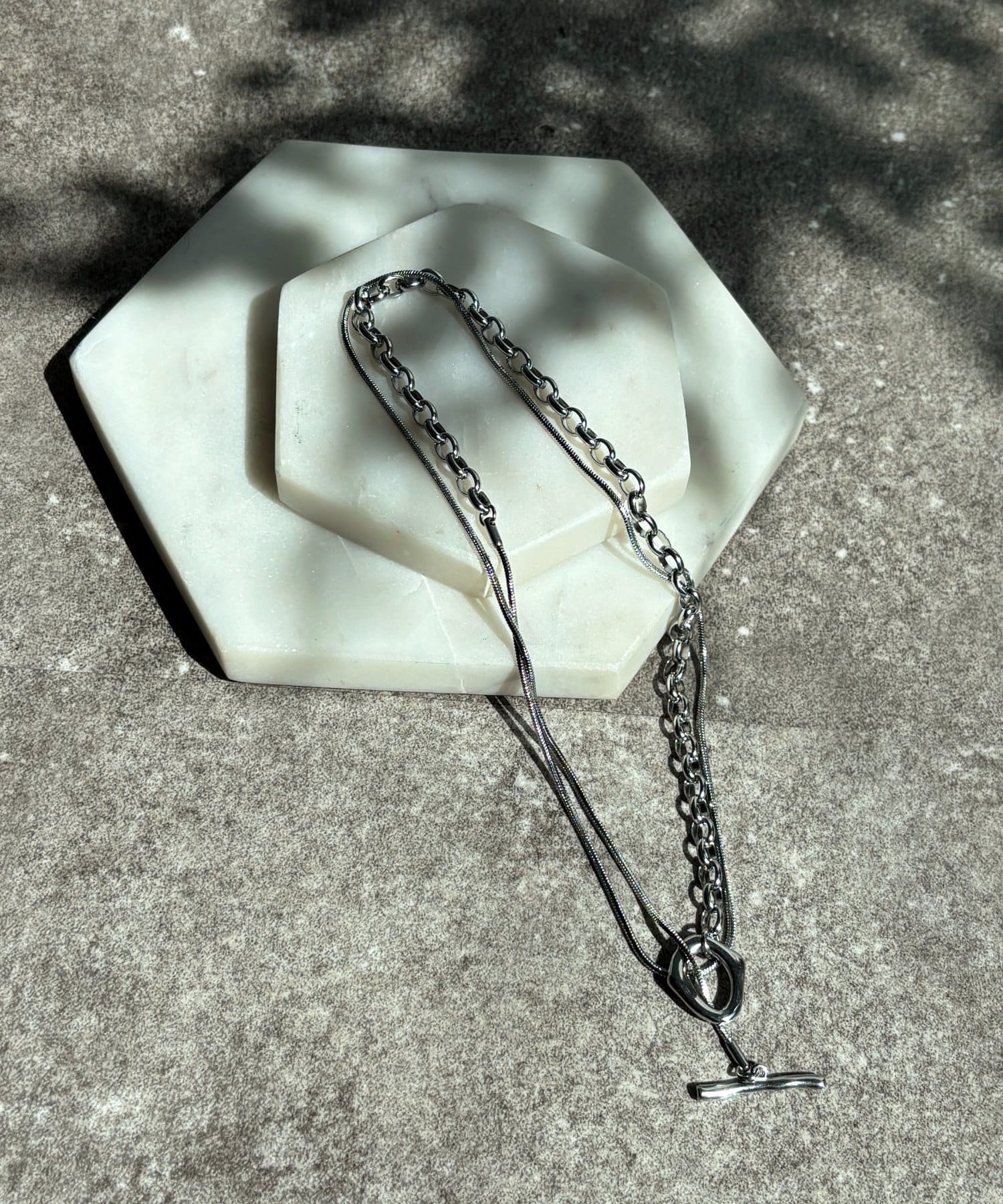 また、異なるチェーンの質感が絶妙なコントラストを生み出し、単調になりがちなアクセサリー使いに変化をプラスしてくれます。