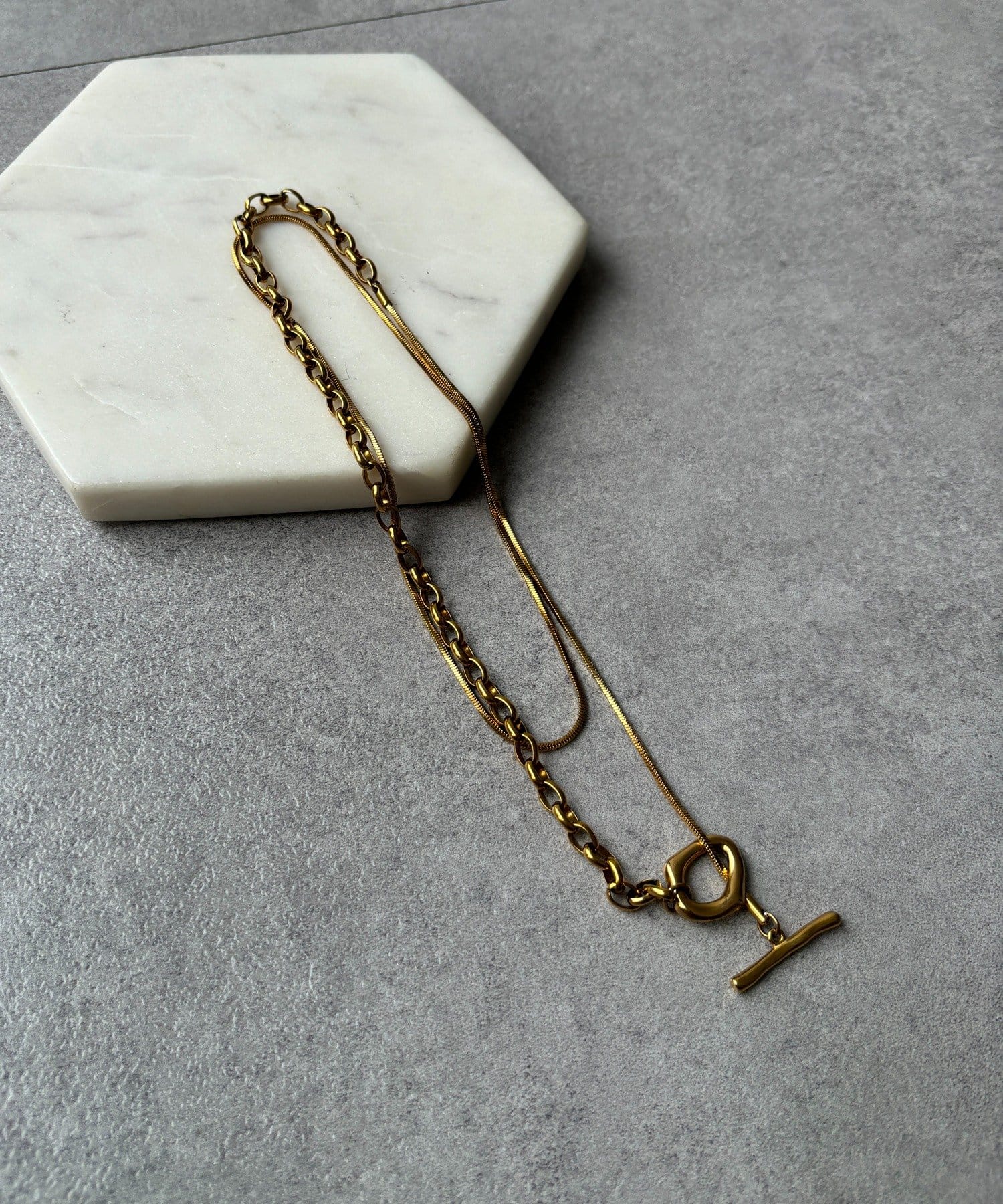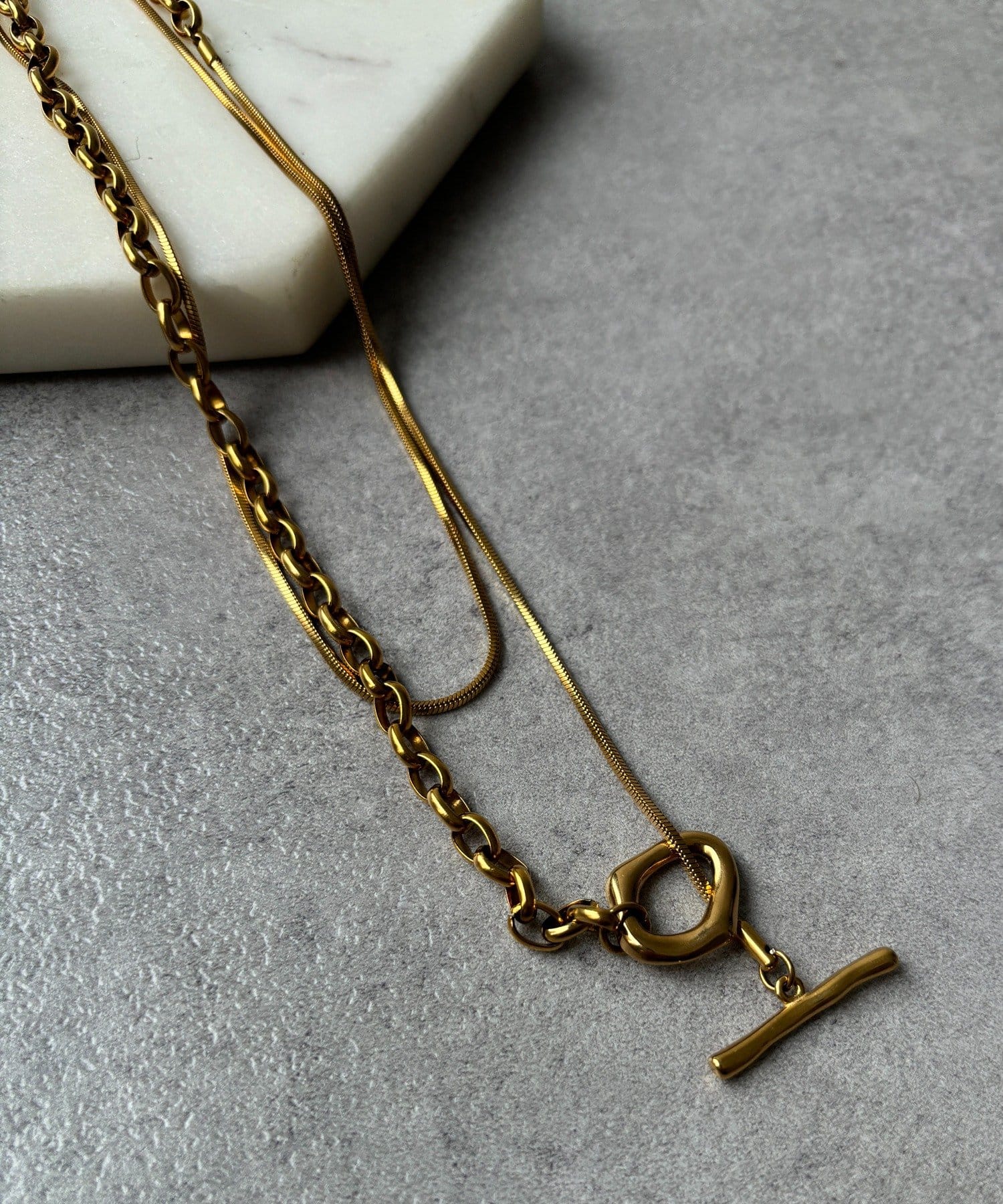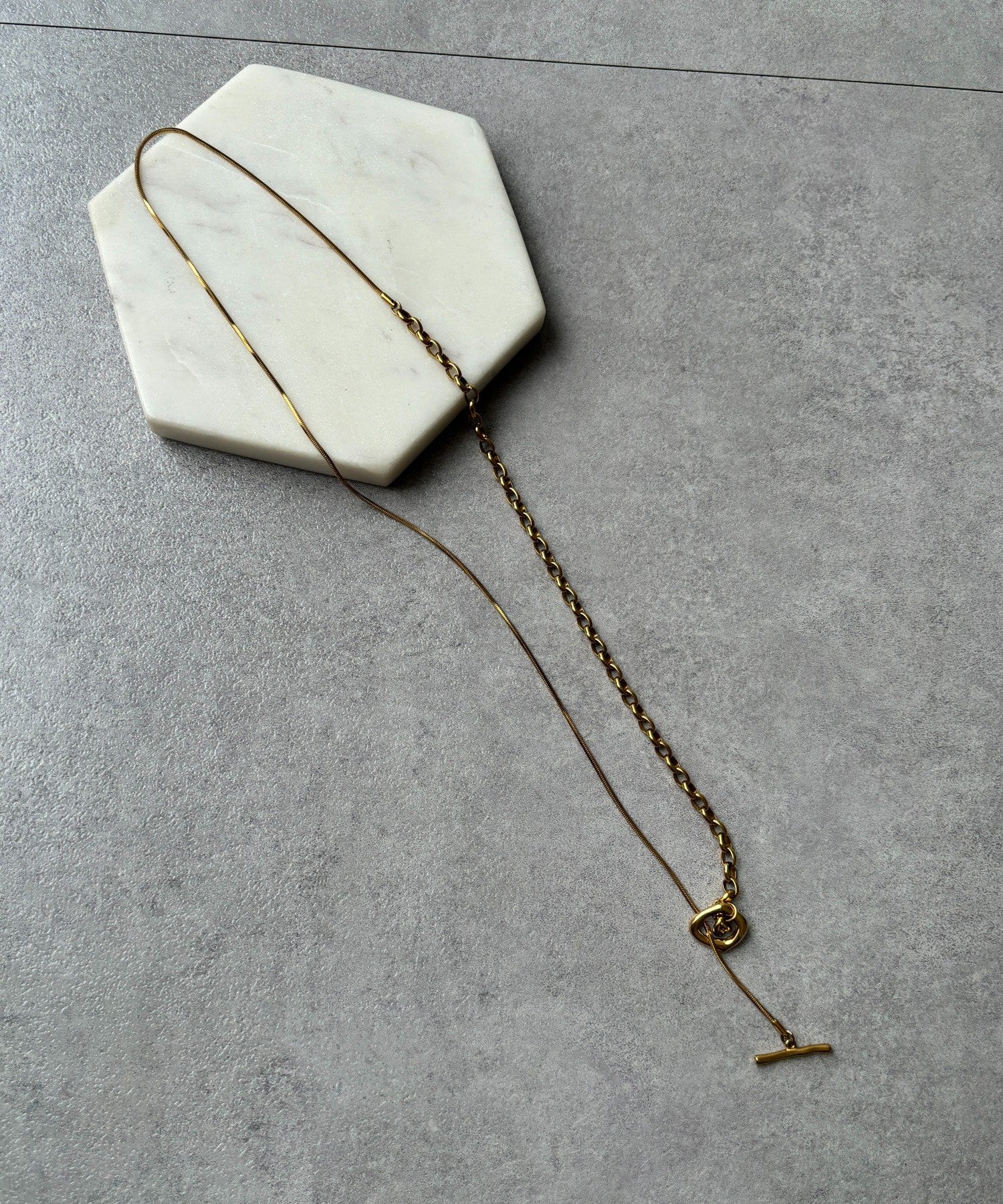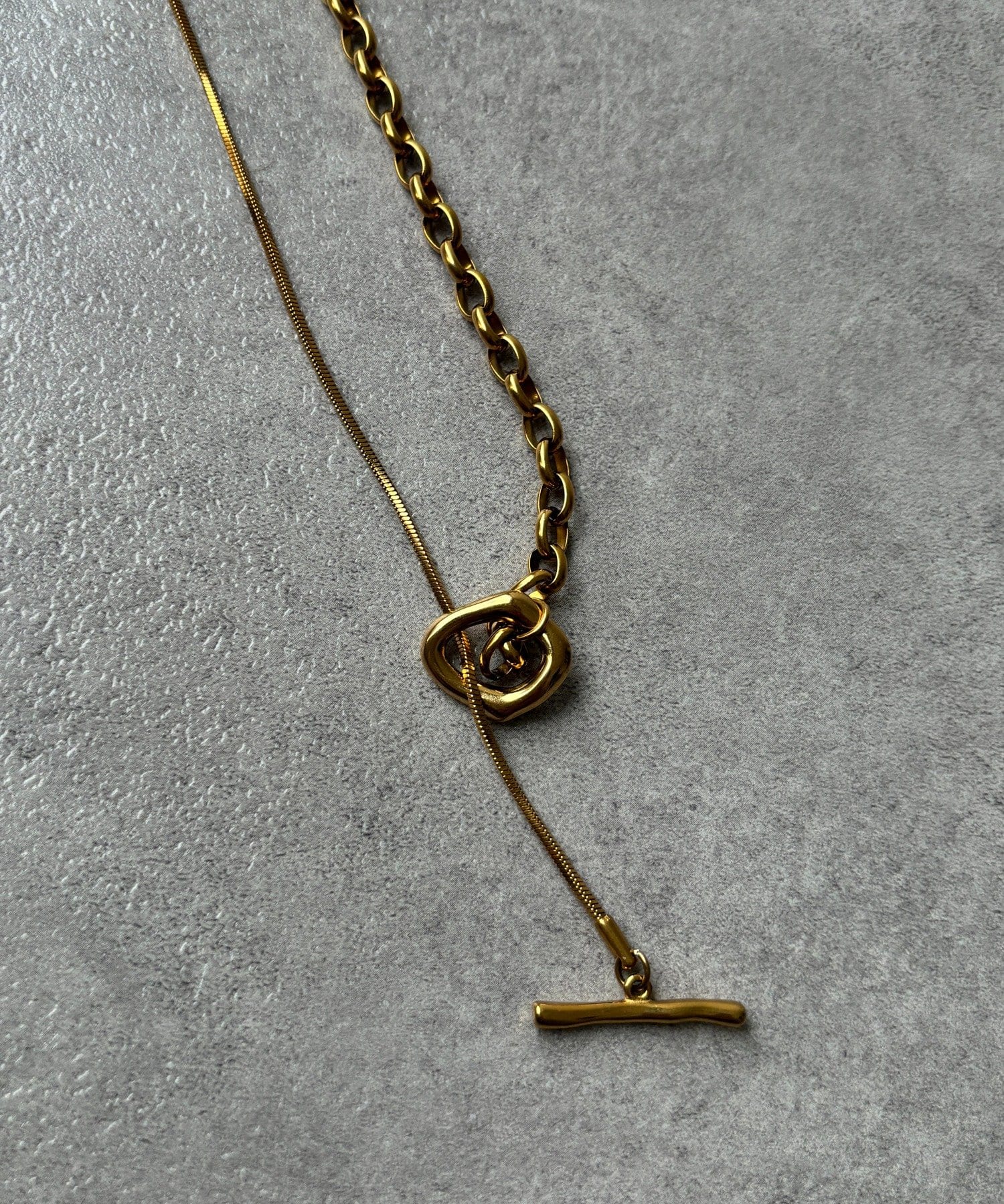 また、異なるチェーンの質感が絶妙なコントラストを生み出し、単調になりがちなアクセサリー使いに変化をプラスしてくれます。