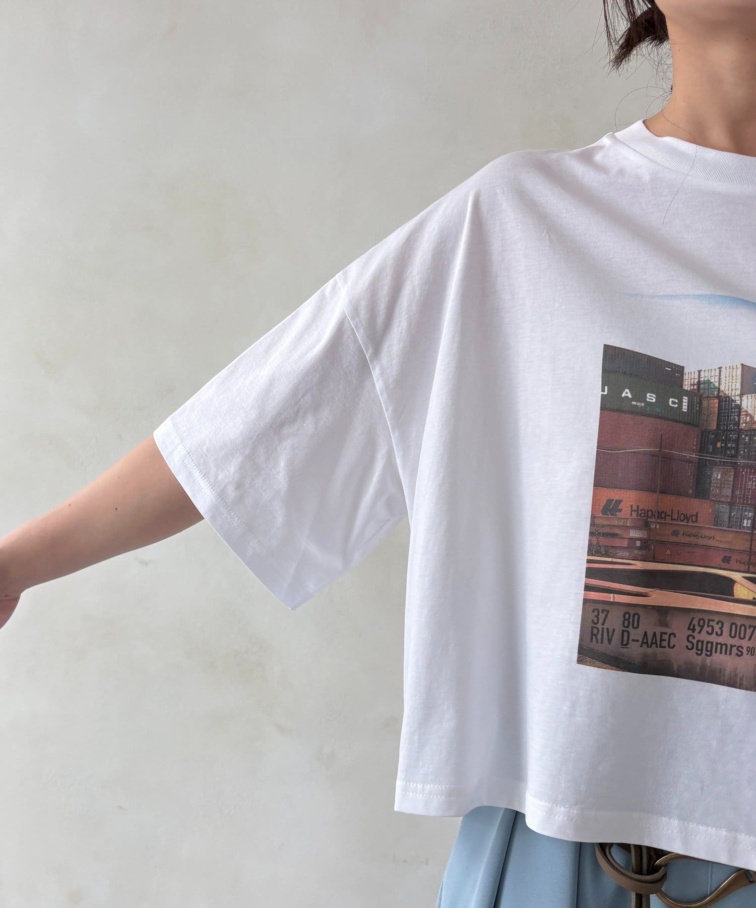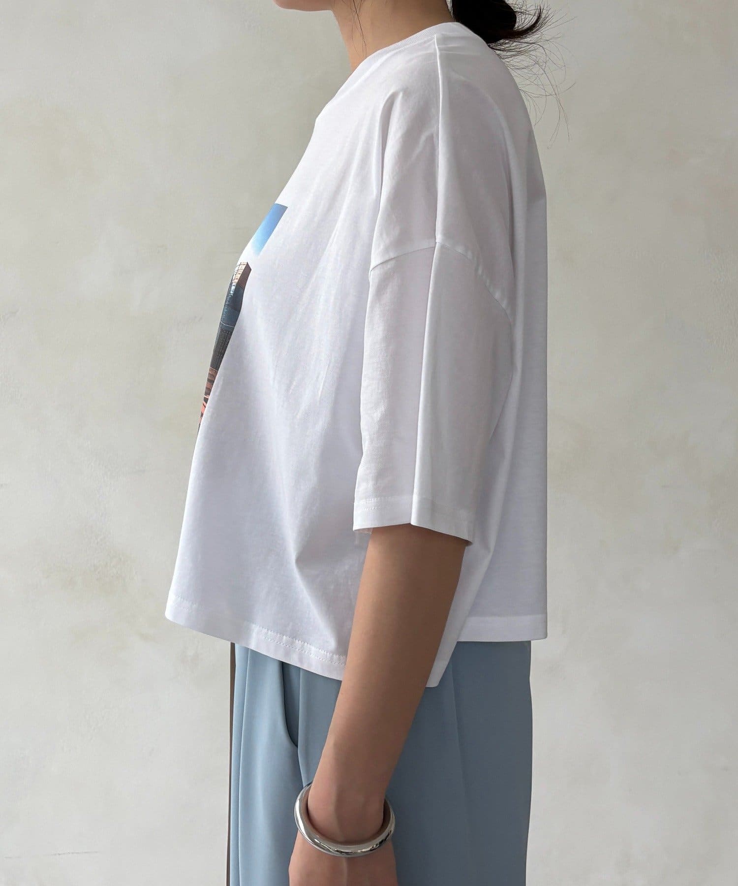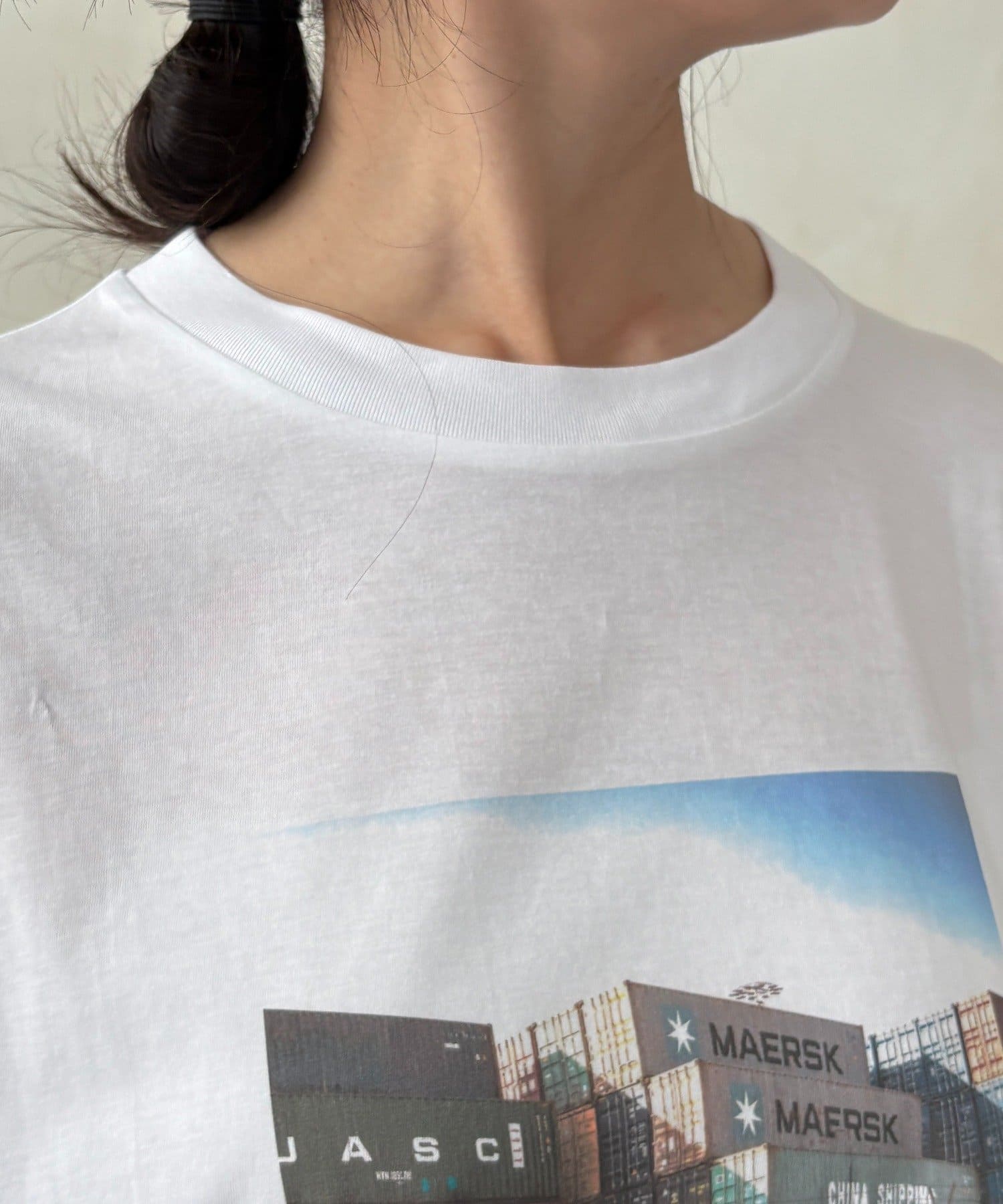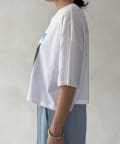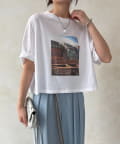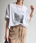 フロントに大胆に配置されたフォトグラフィックが印象的で、コーディネートに自然なアクセントを加えてくれる一枚です。