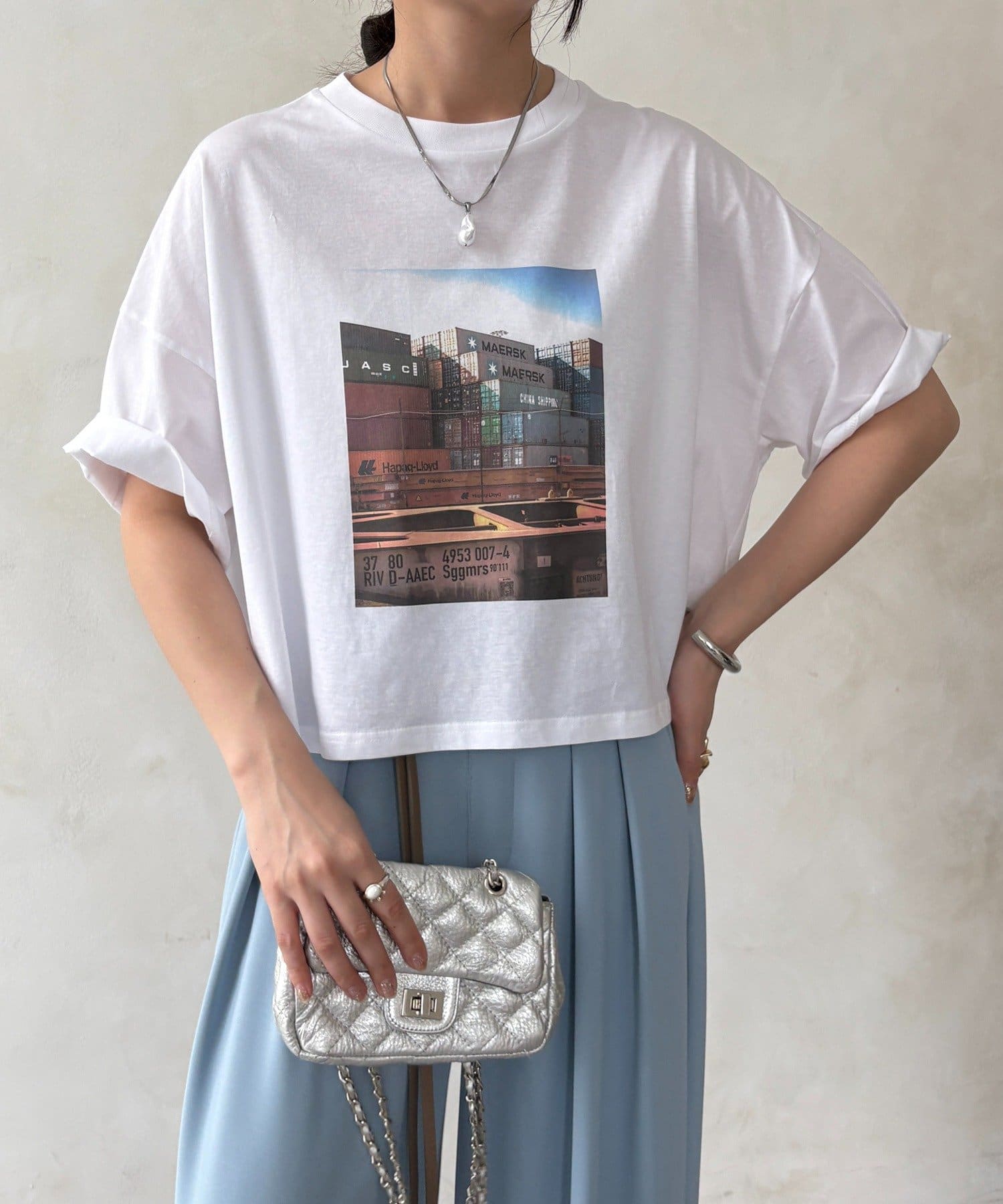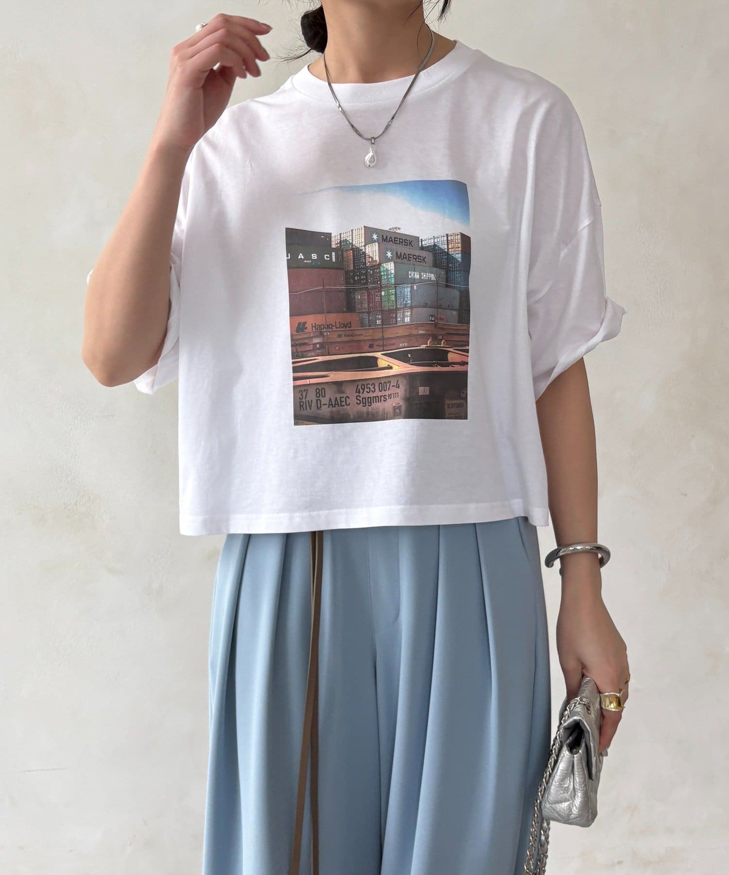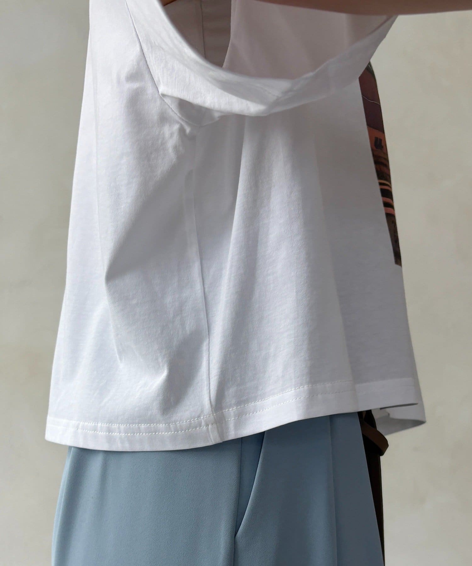 フロントに大胆に配置されたフォトグラフィックが印象的で、コーディネートに自然なアクセントを加えてくれる一枚です。