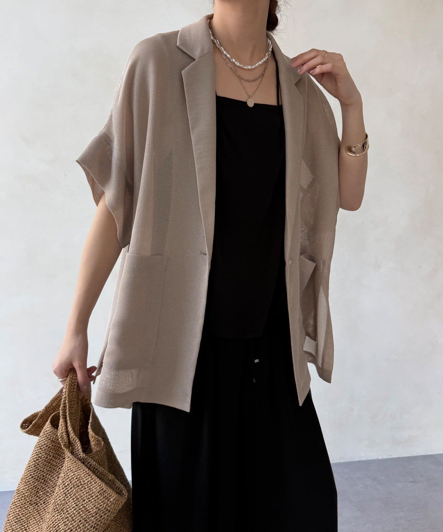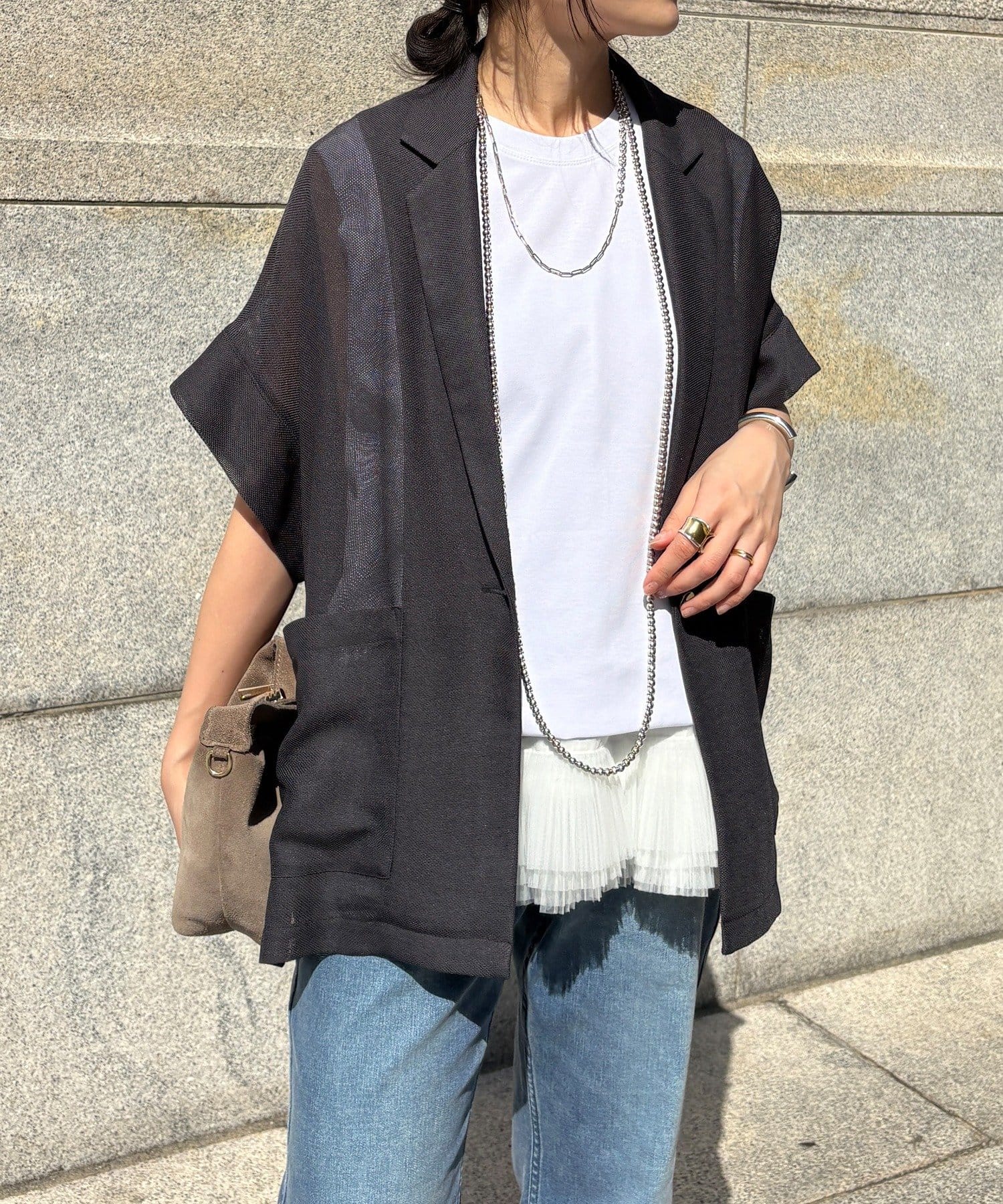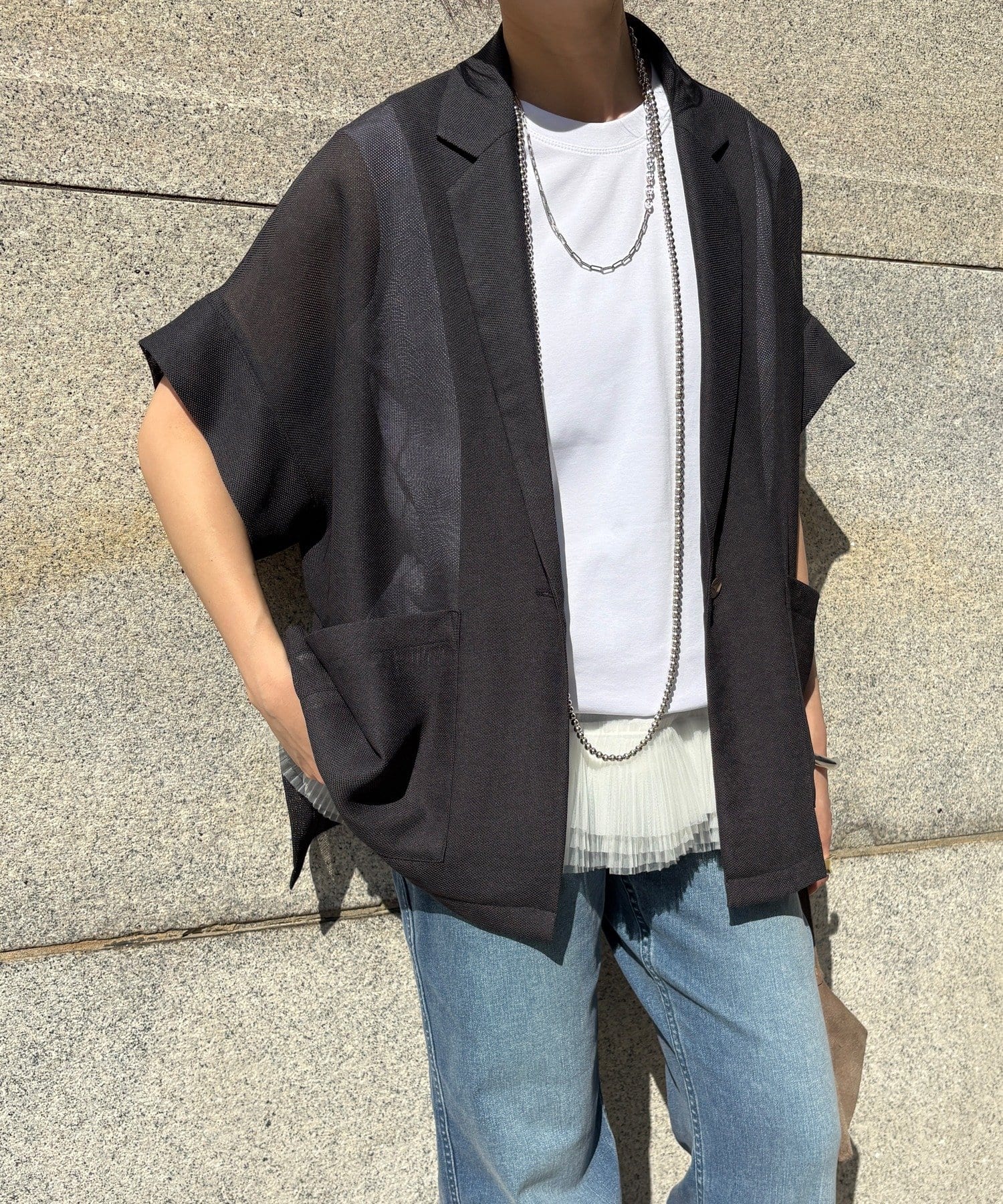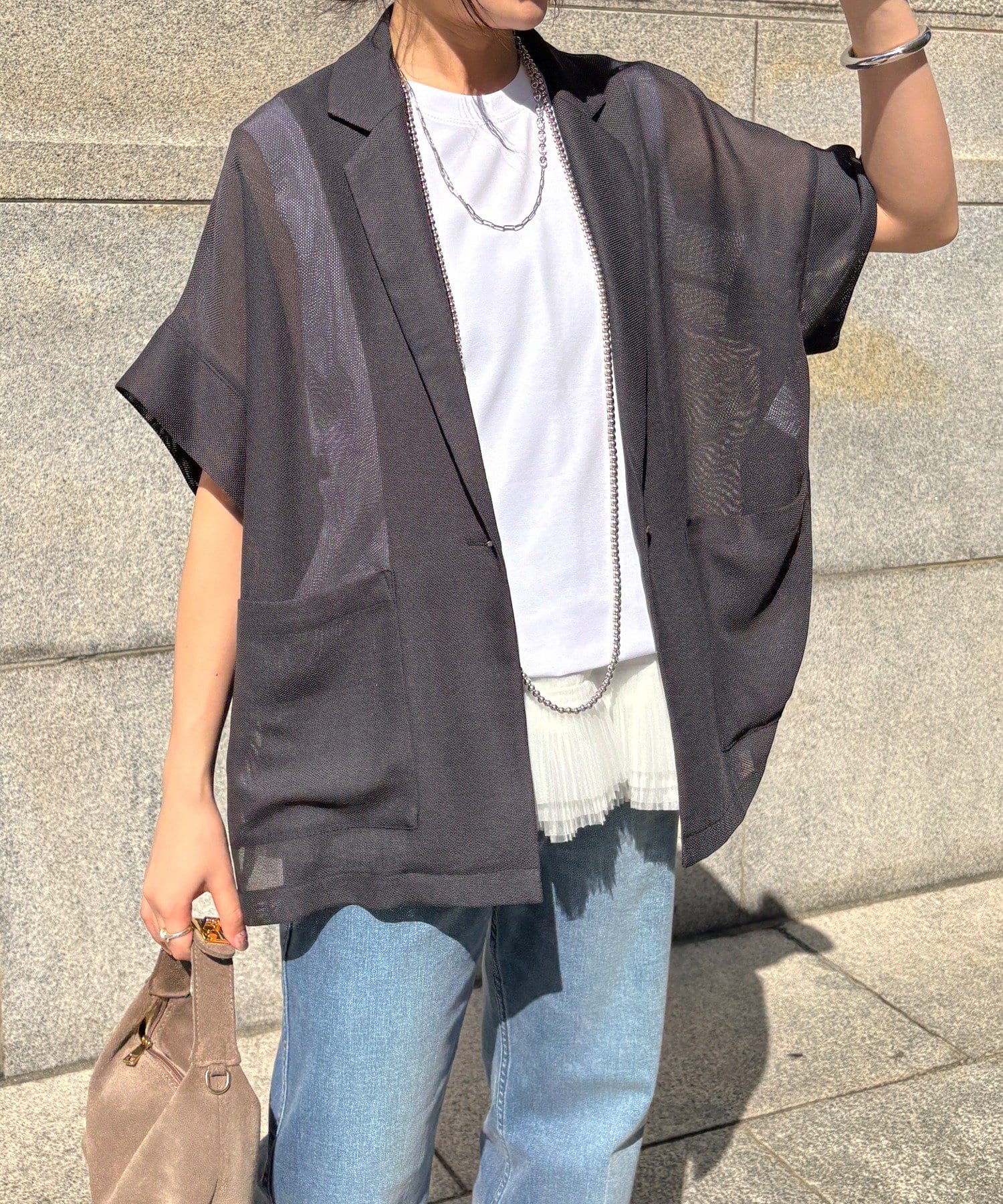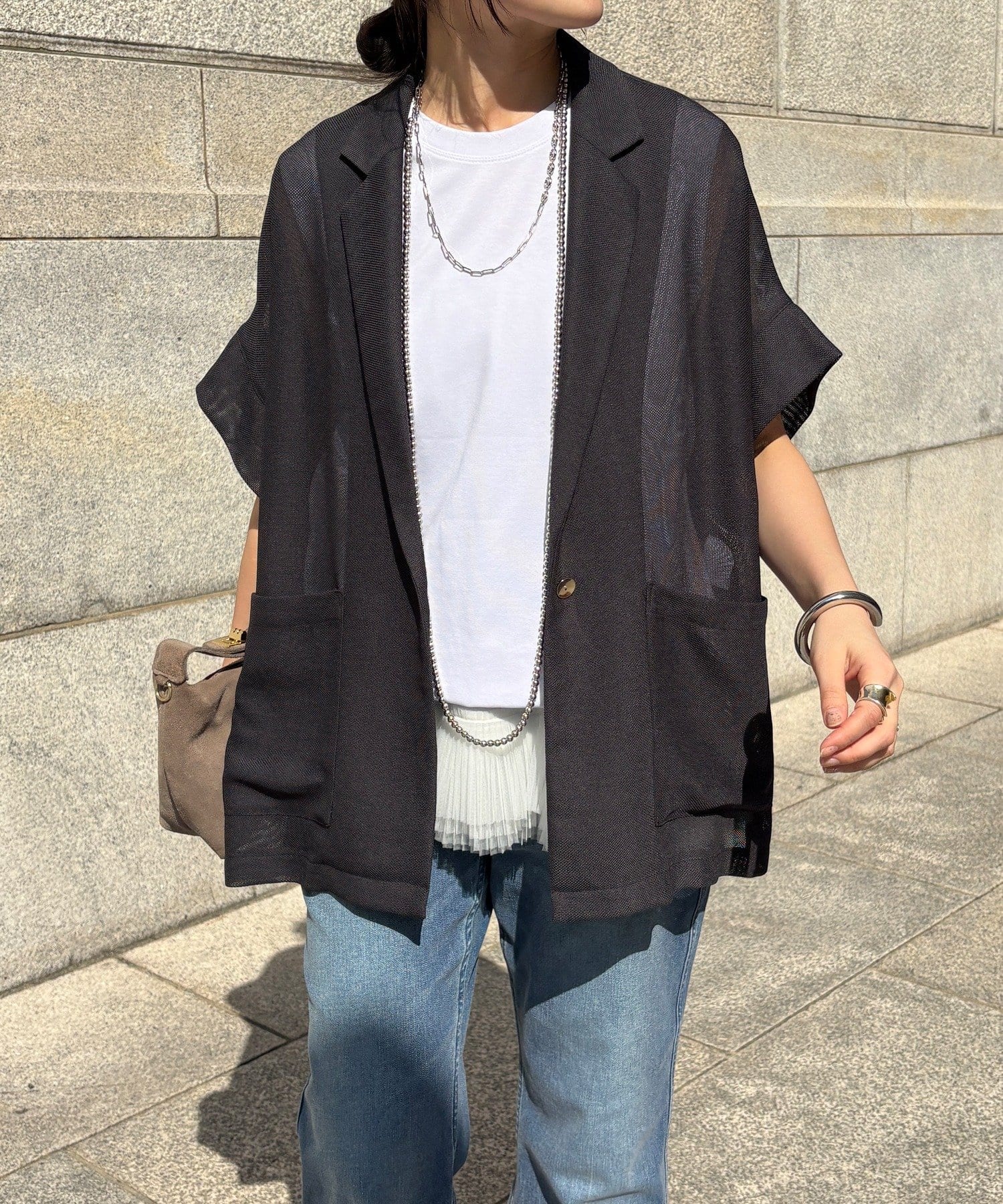大人の抜け感を演出するメッシュジャケット。