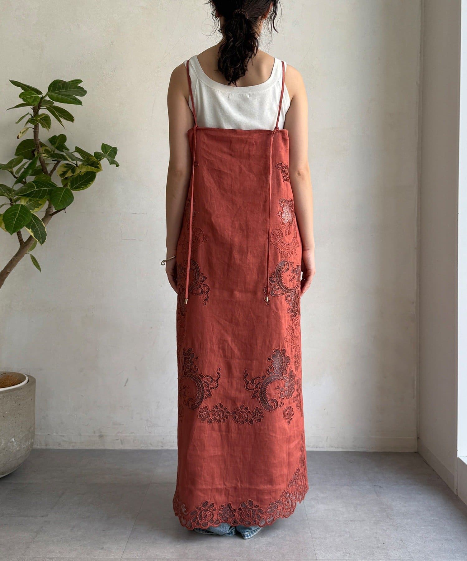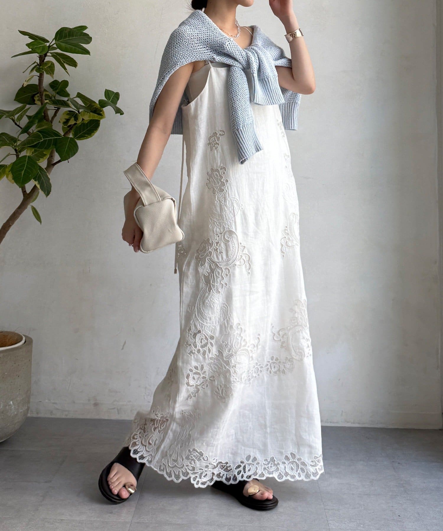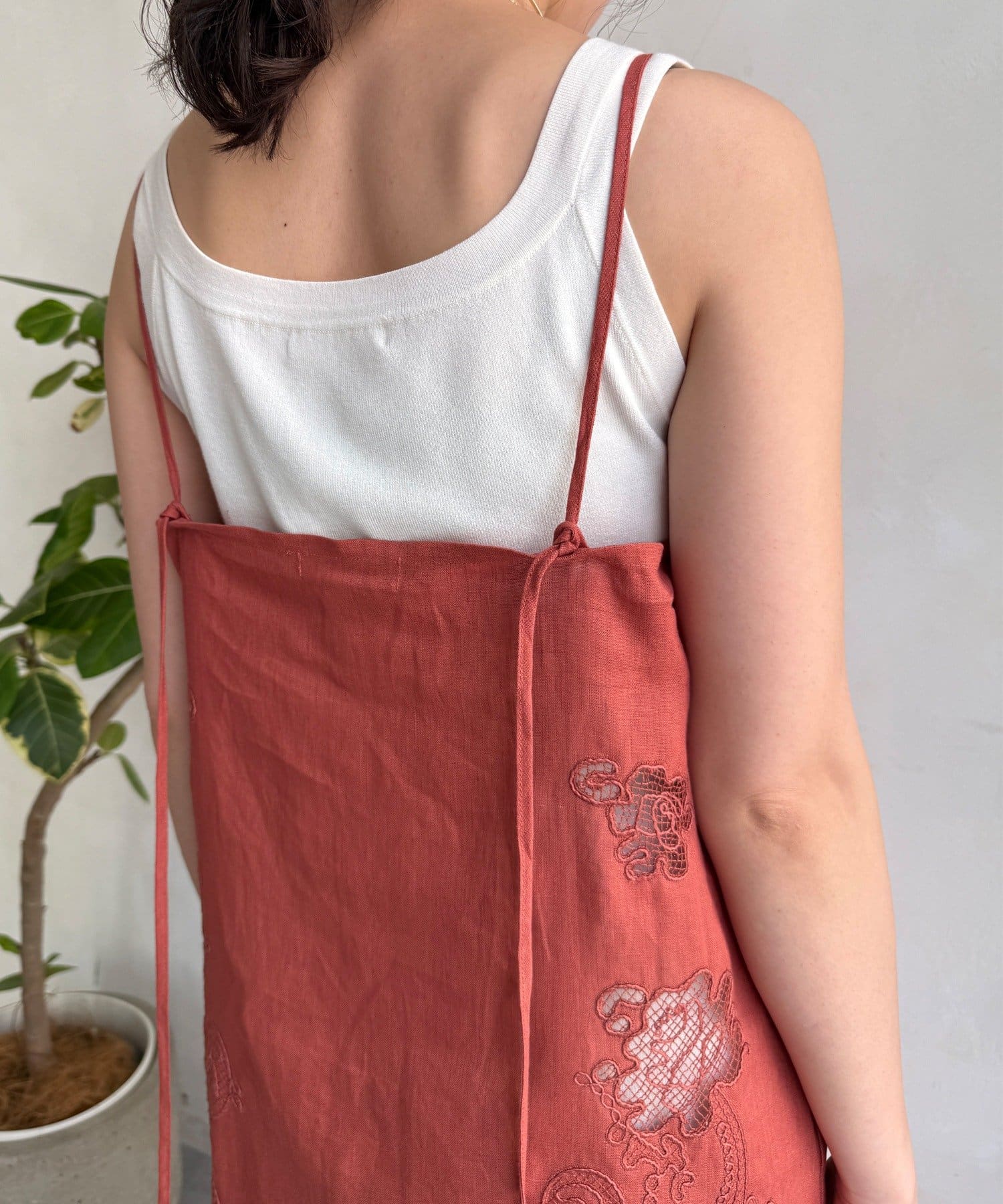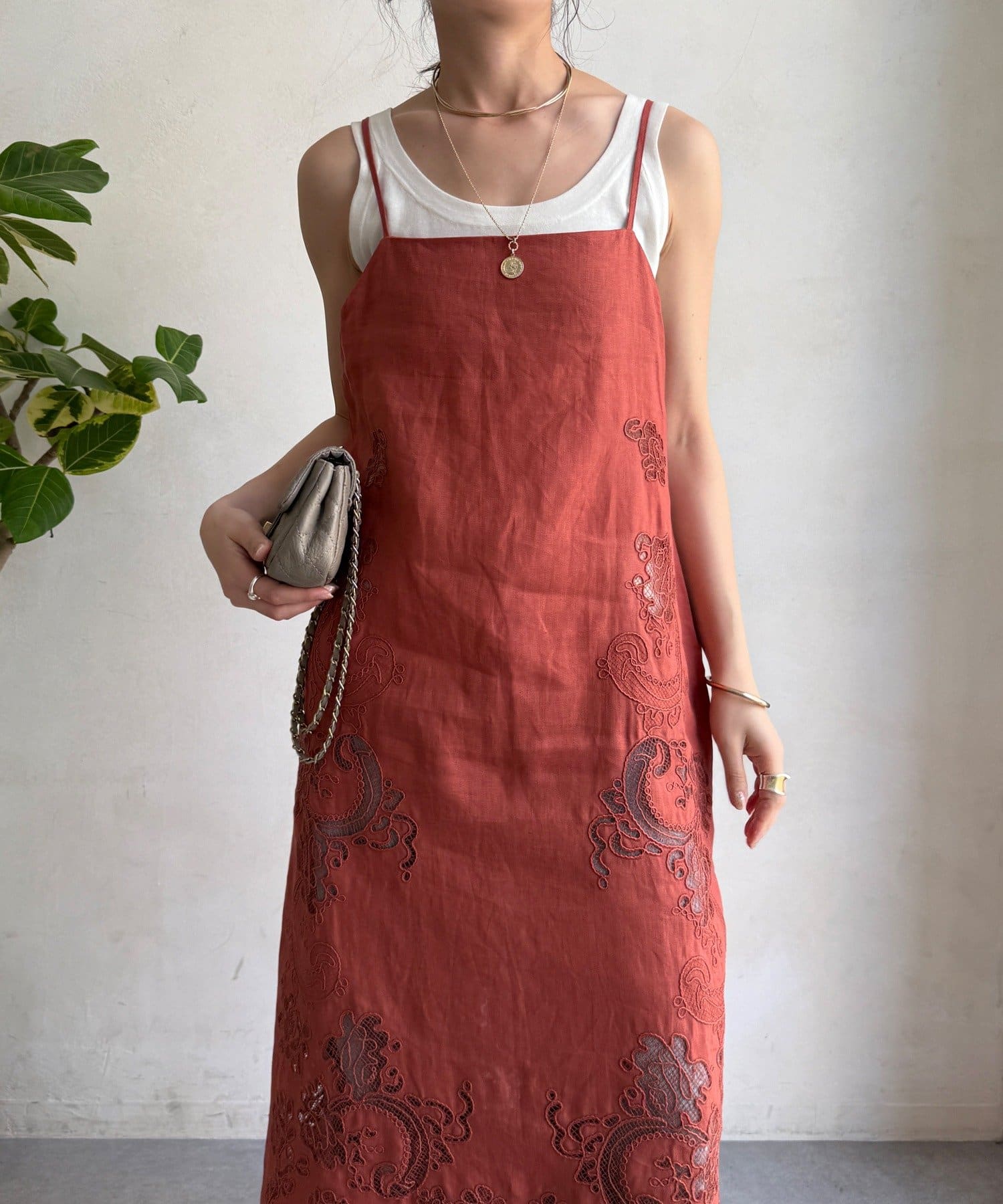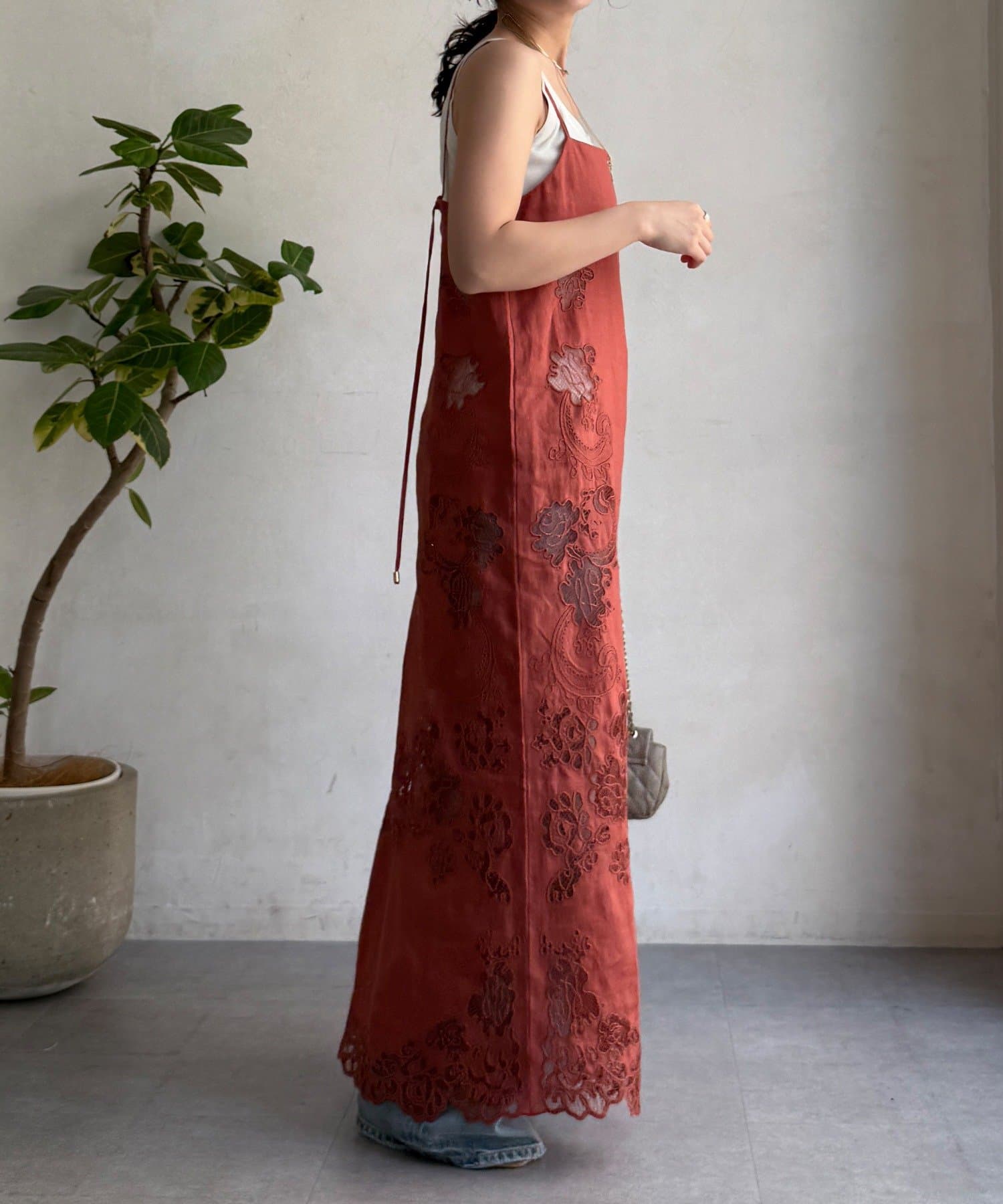 サイドの刺繍レースが際立つ、上品なキャミワンピース。