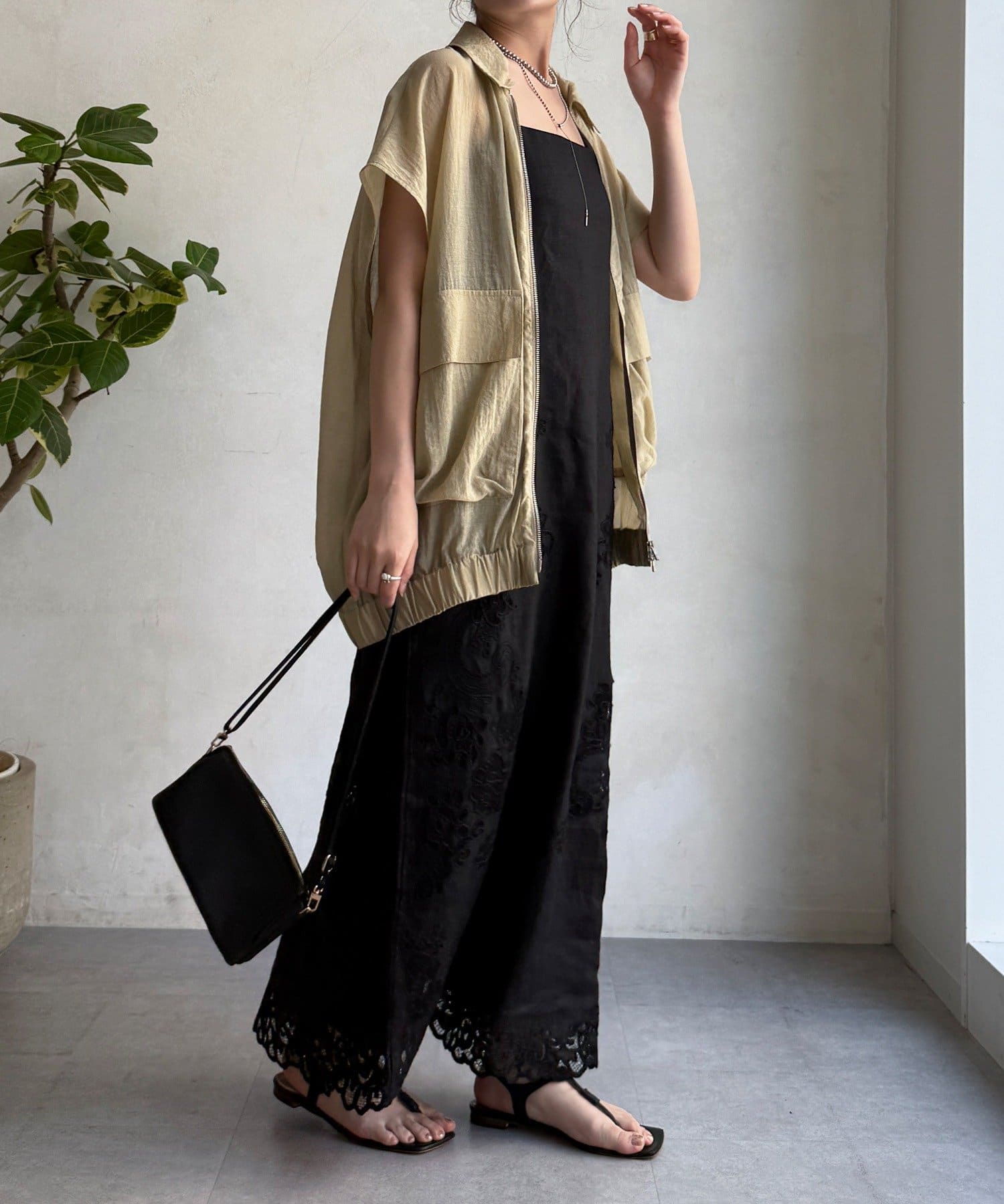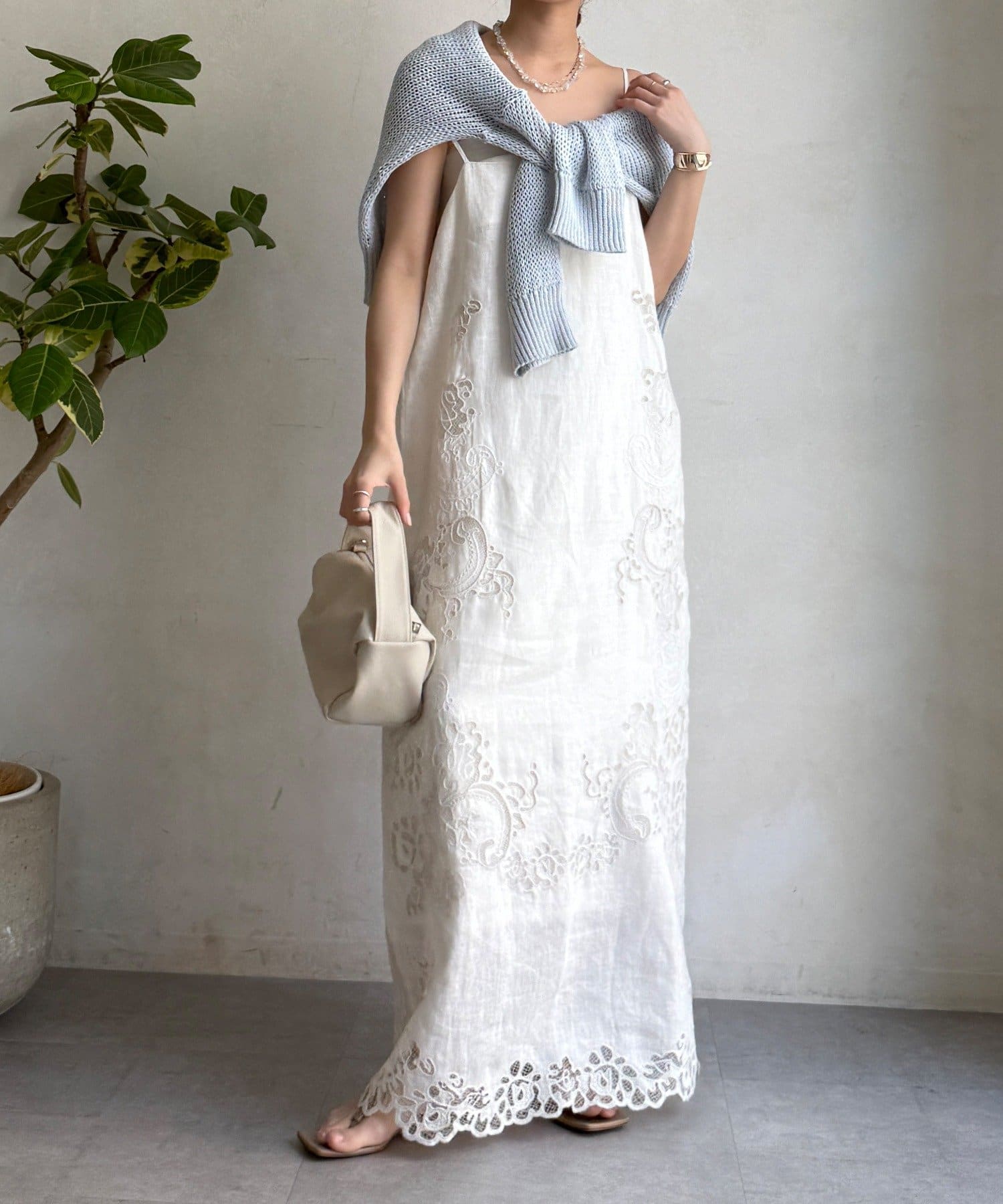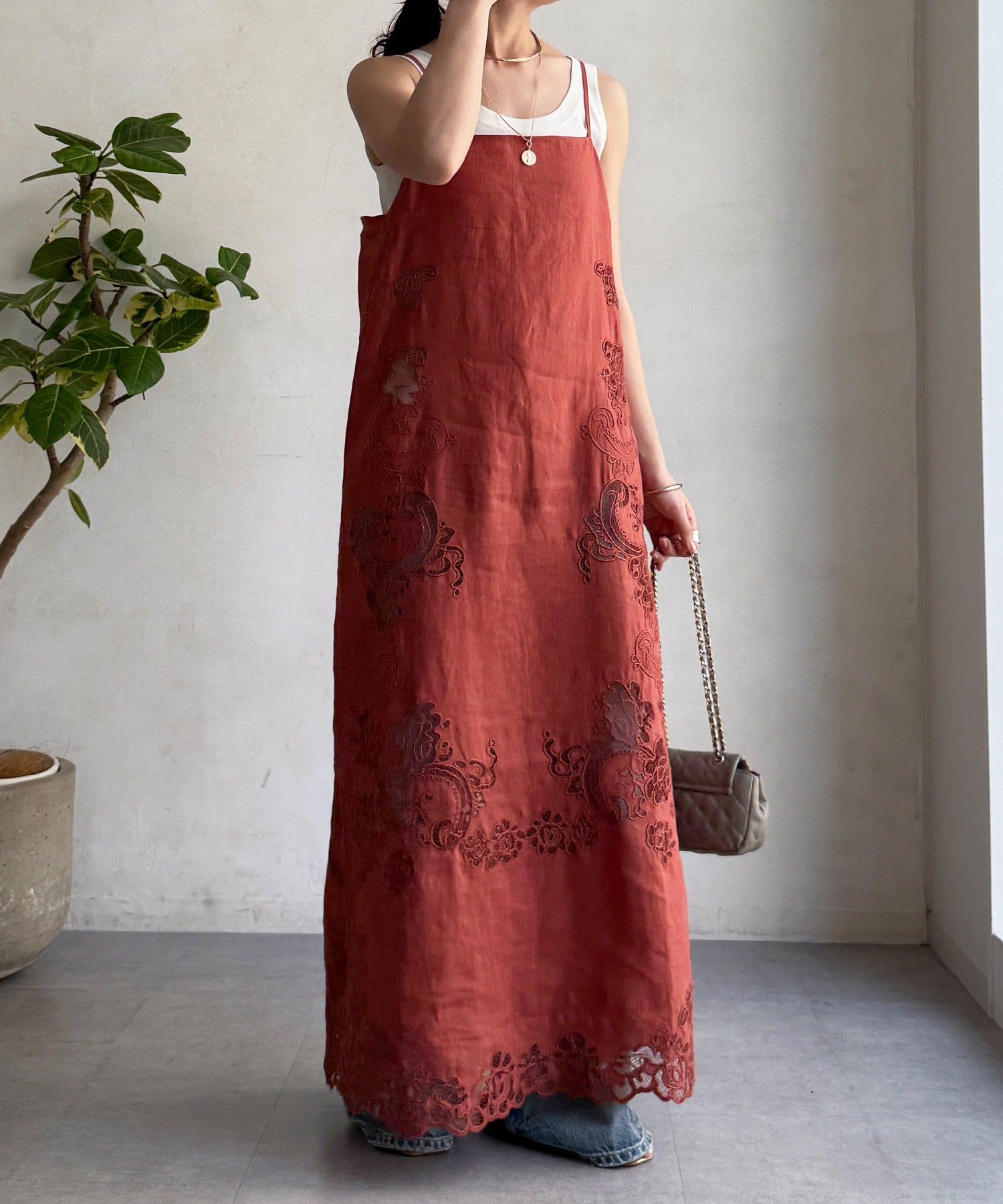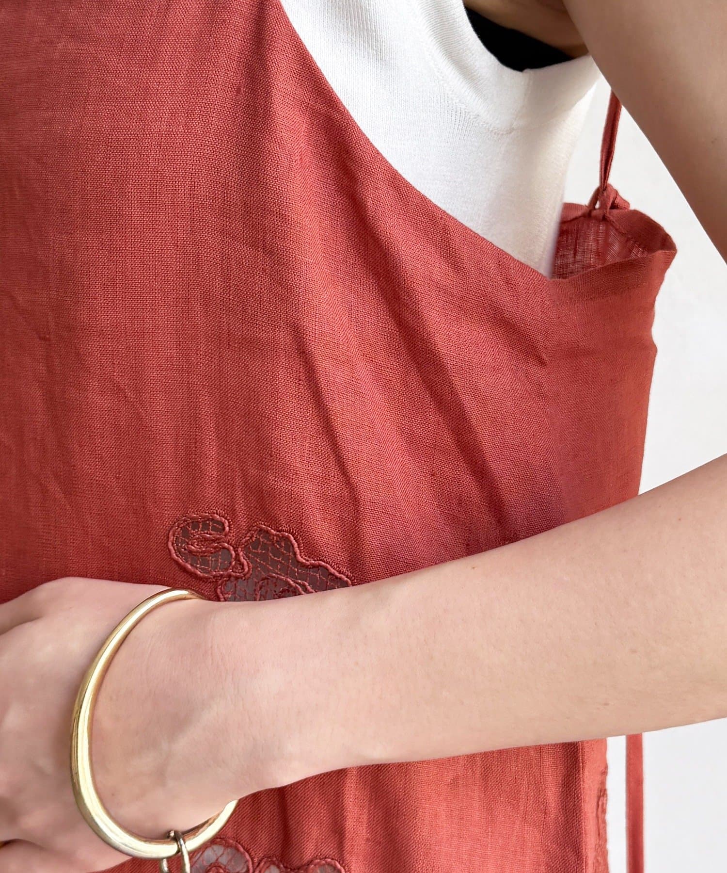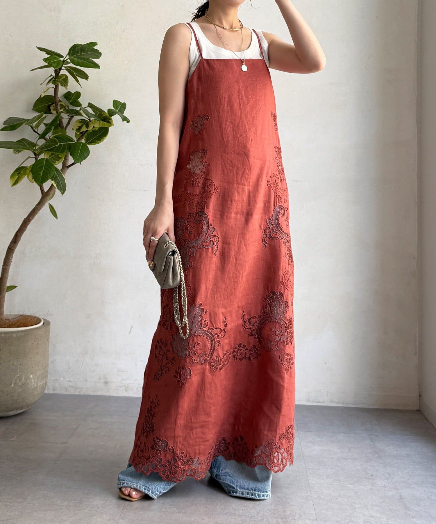 サイドの刺繍レースが際立つ、上品なキャミワンピース。