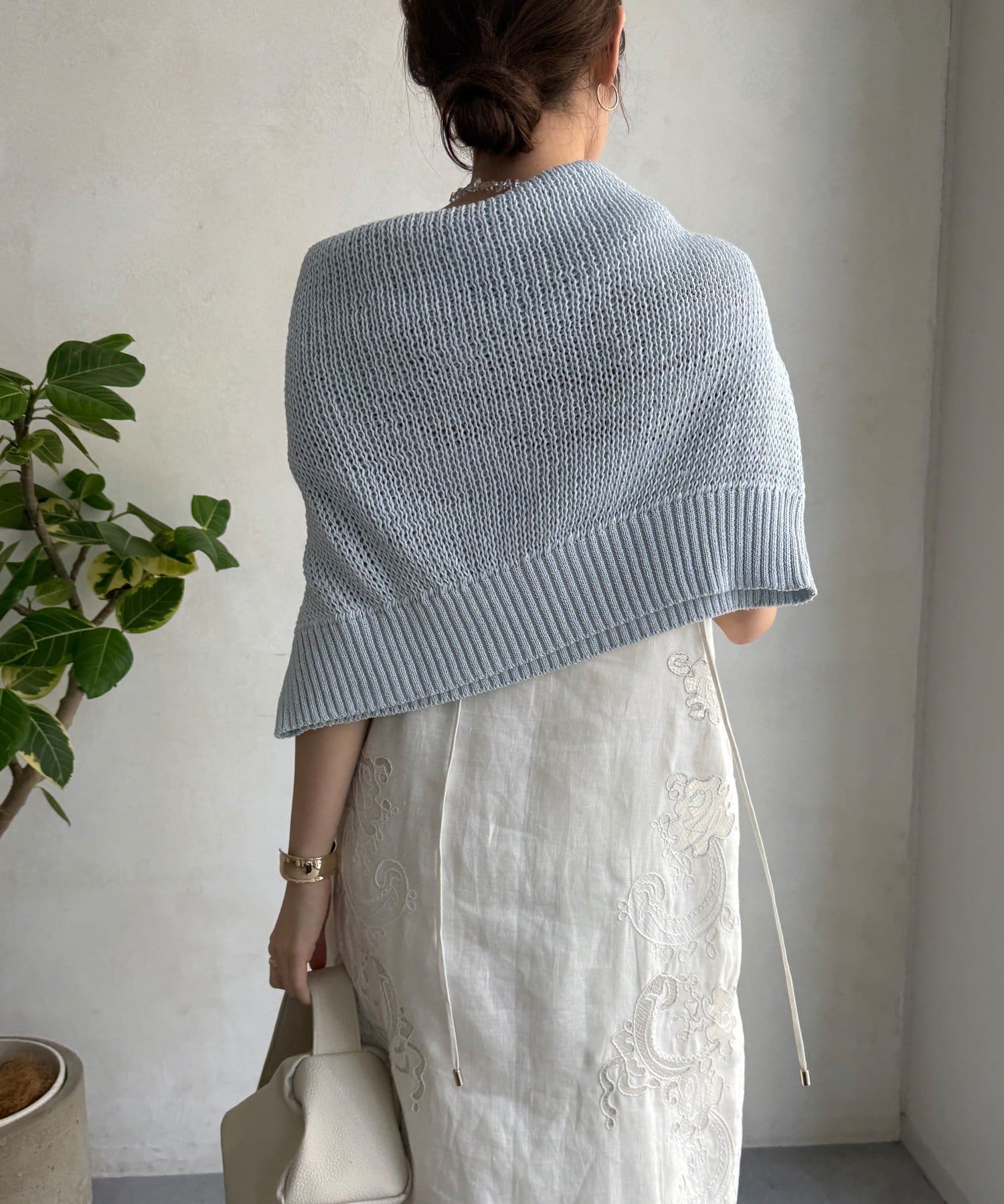 広がりを抑えたストンと落ちるIラインのシルエットにより、甘くなりすぎず大人な印象に。