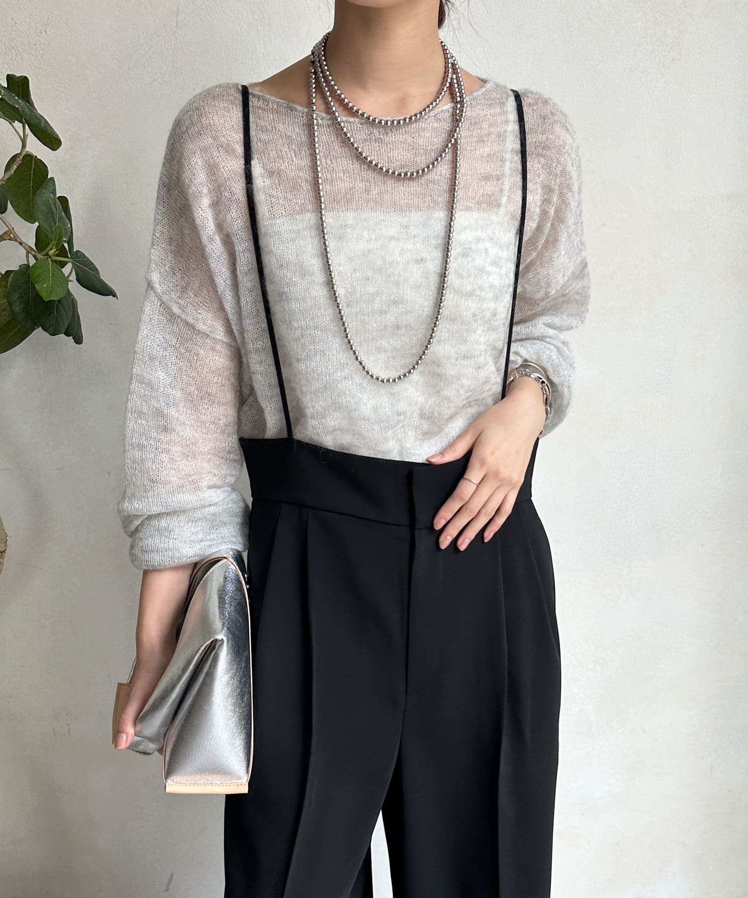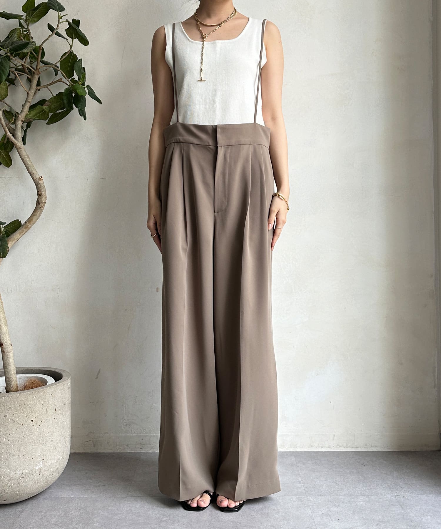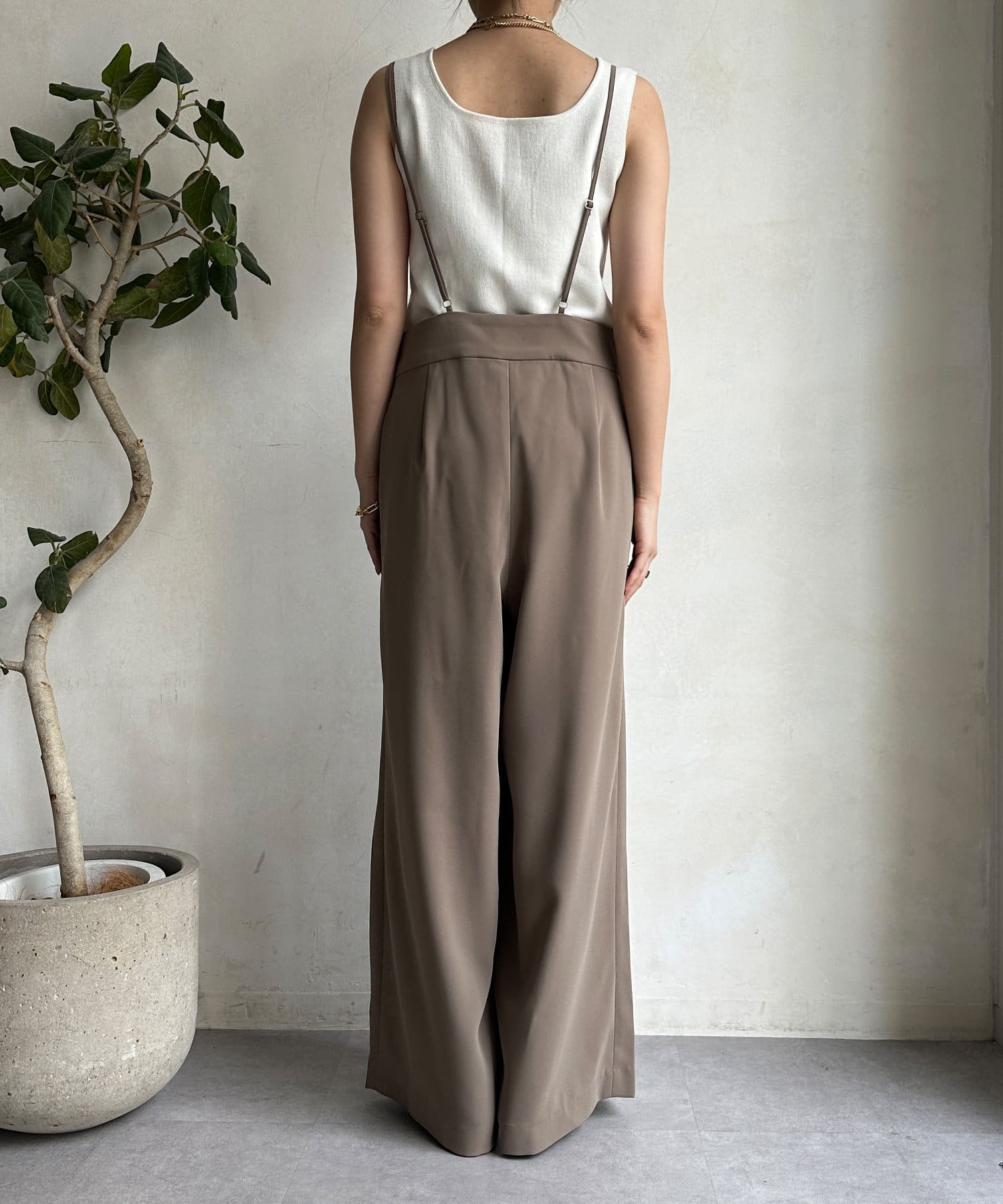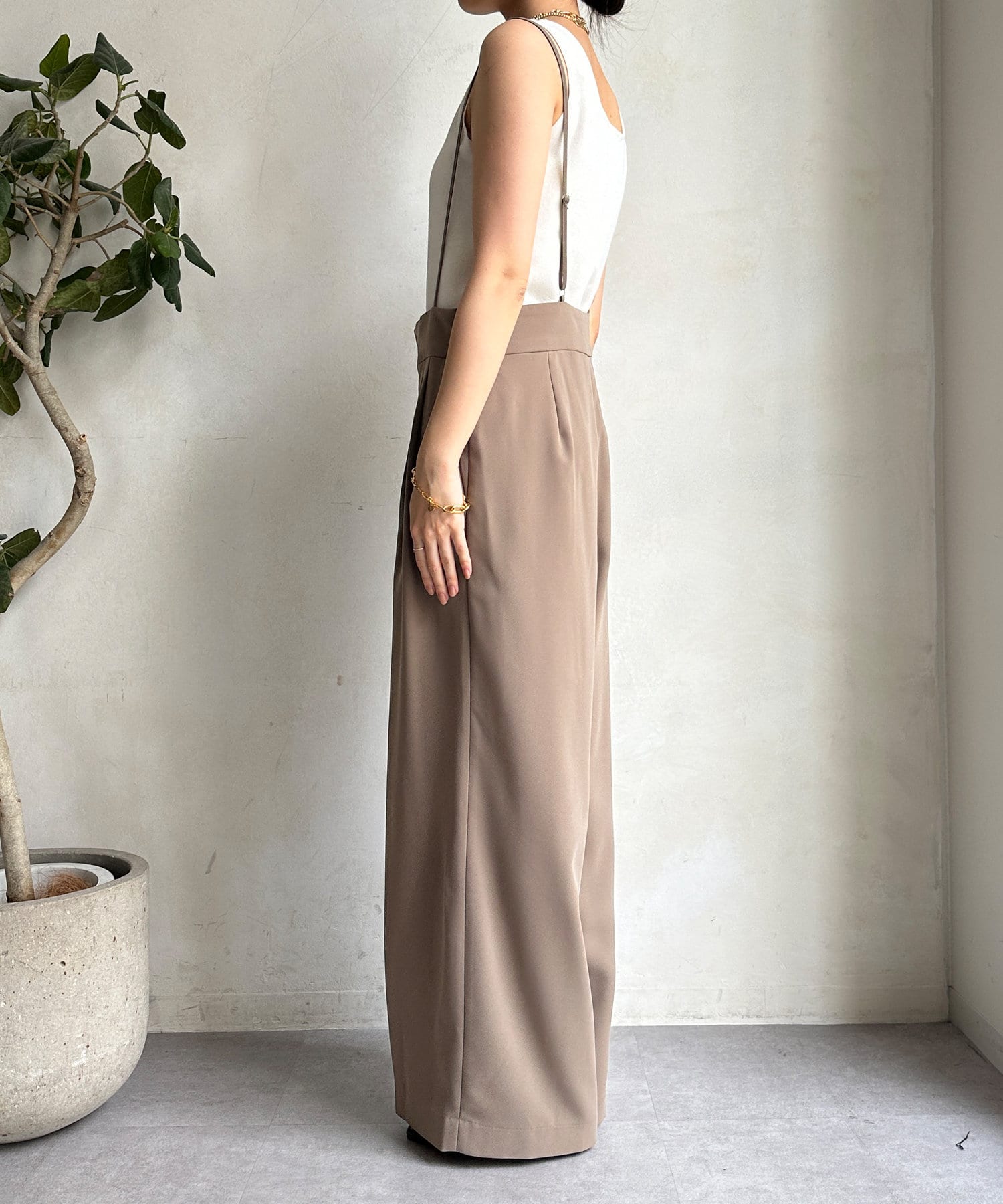 カジュアルすぎず、大人に決まるサスペンダーパンツ。