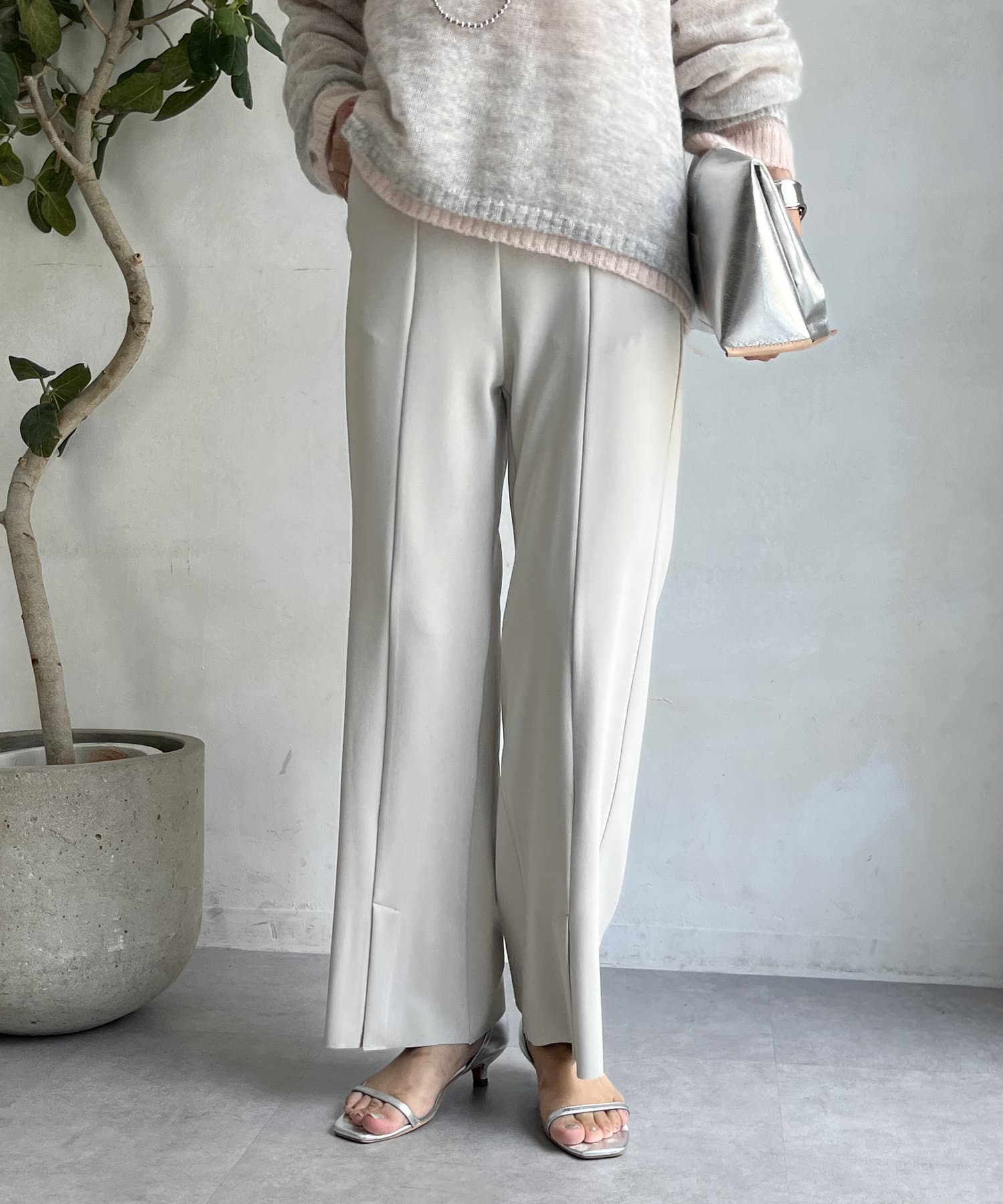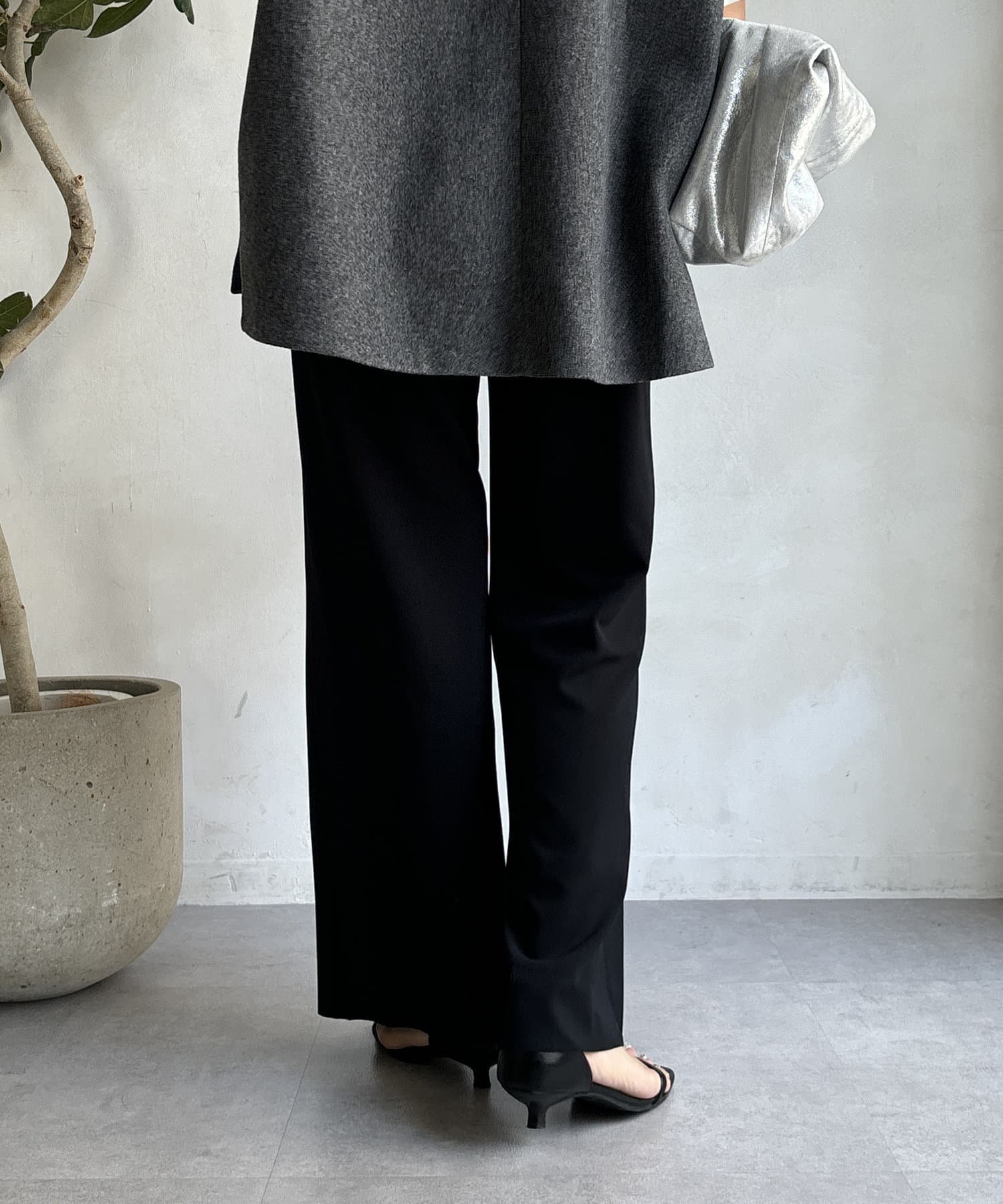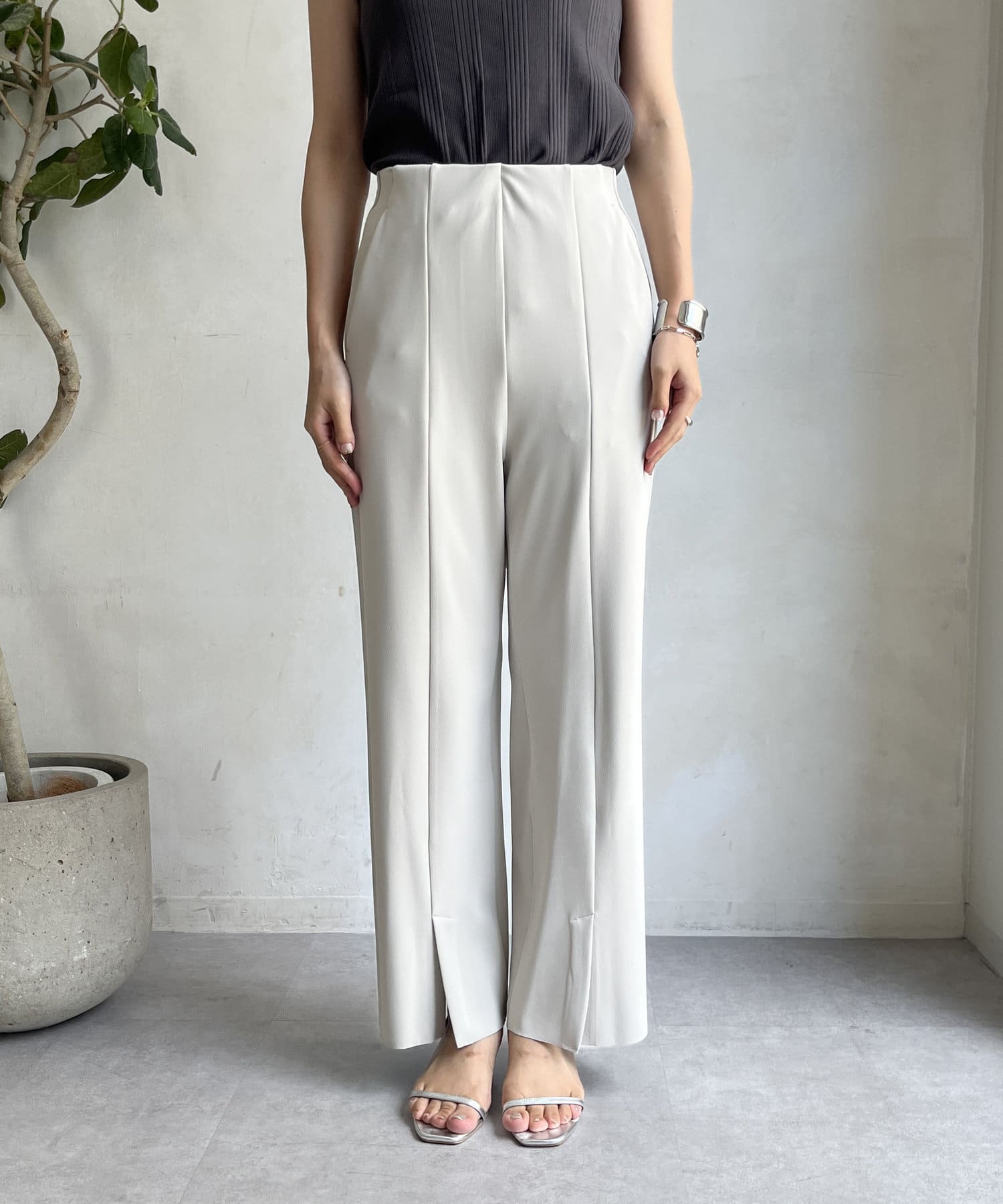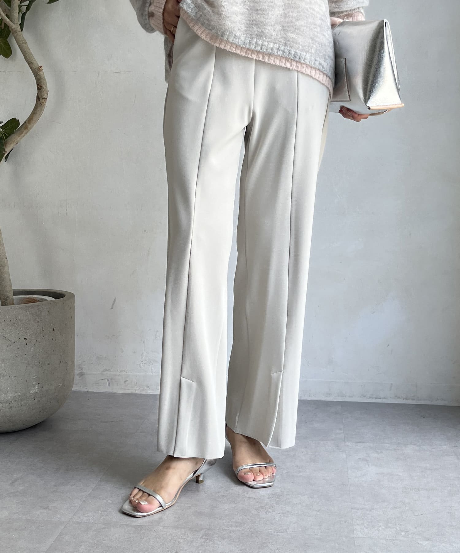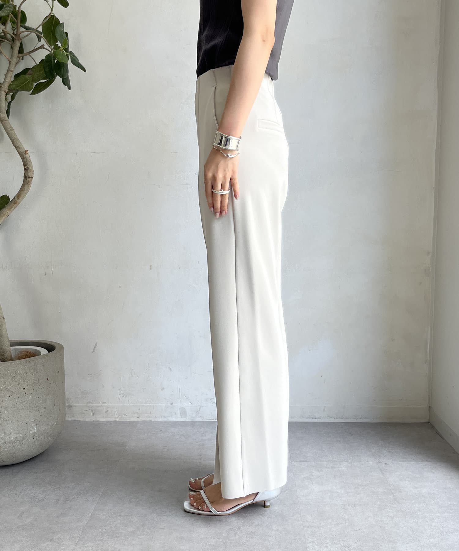 すっきりとしたノータックの美脚見えストレートパンツ。