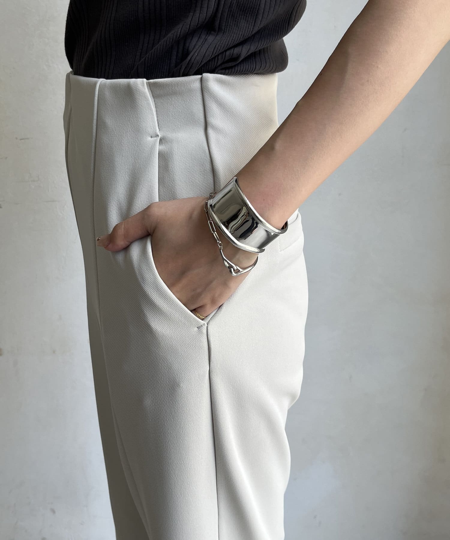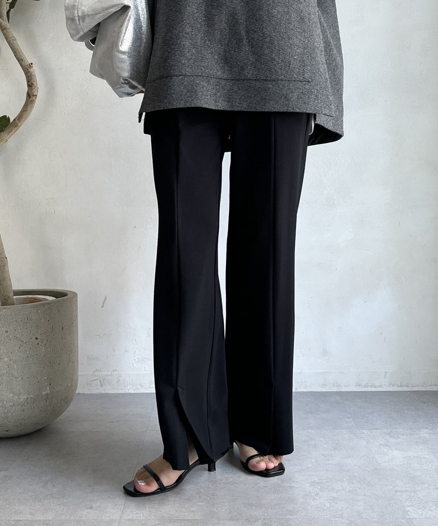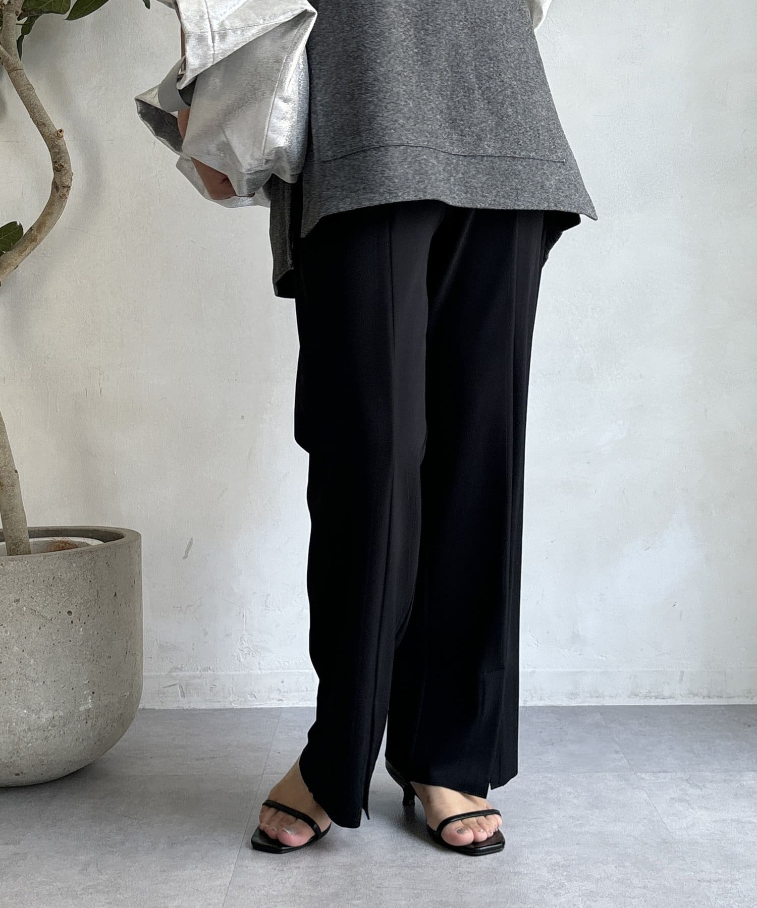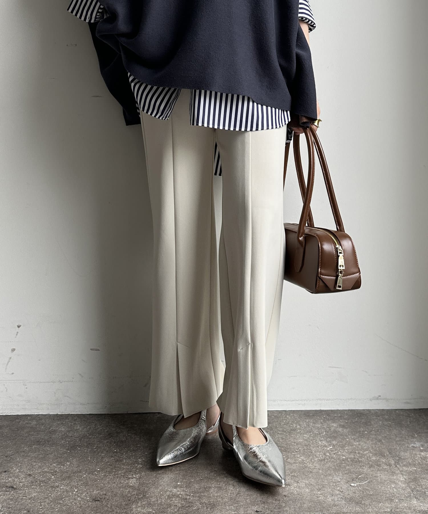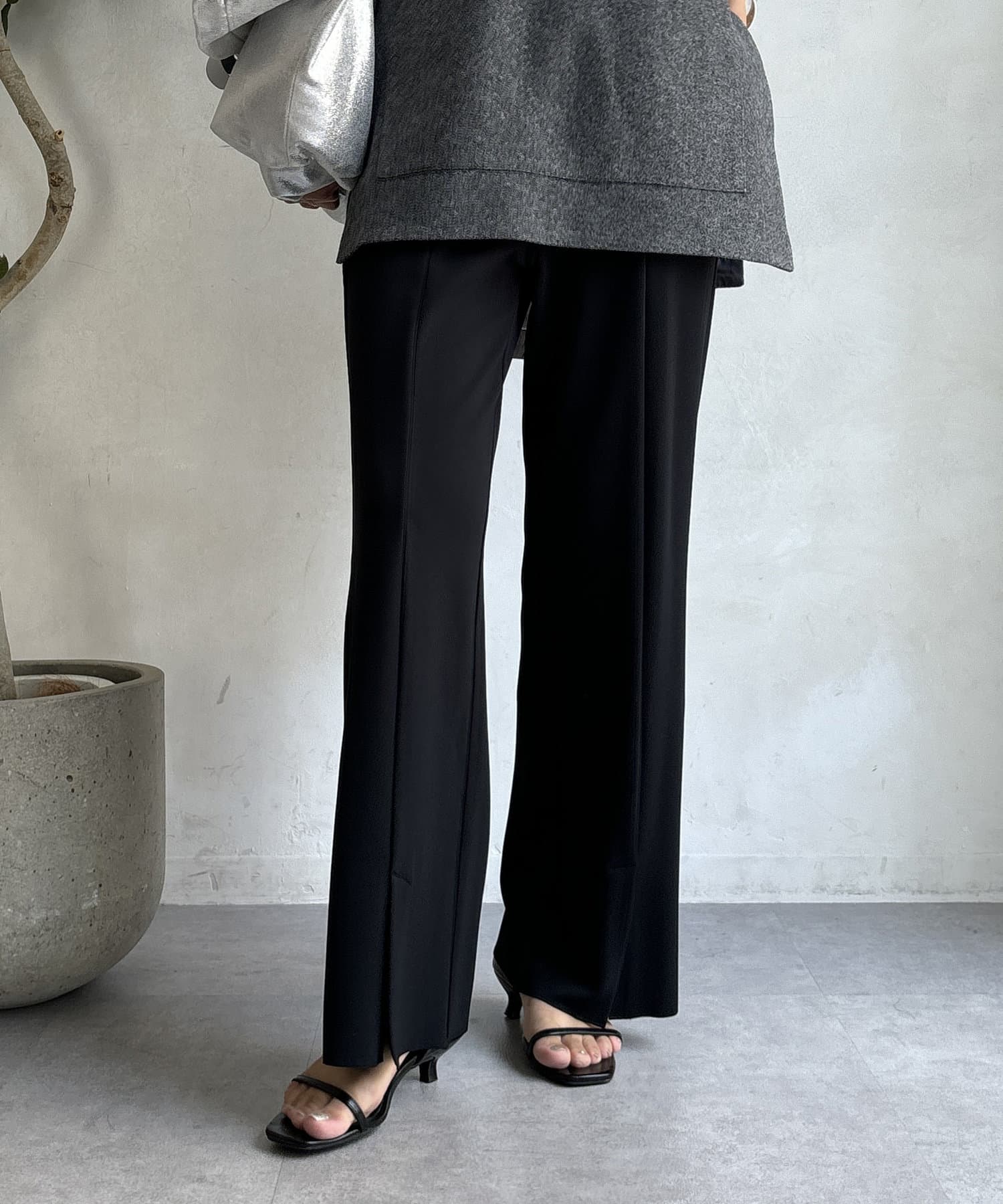 すっきりとしたノータックの美脚見えストレートパンツ。