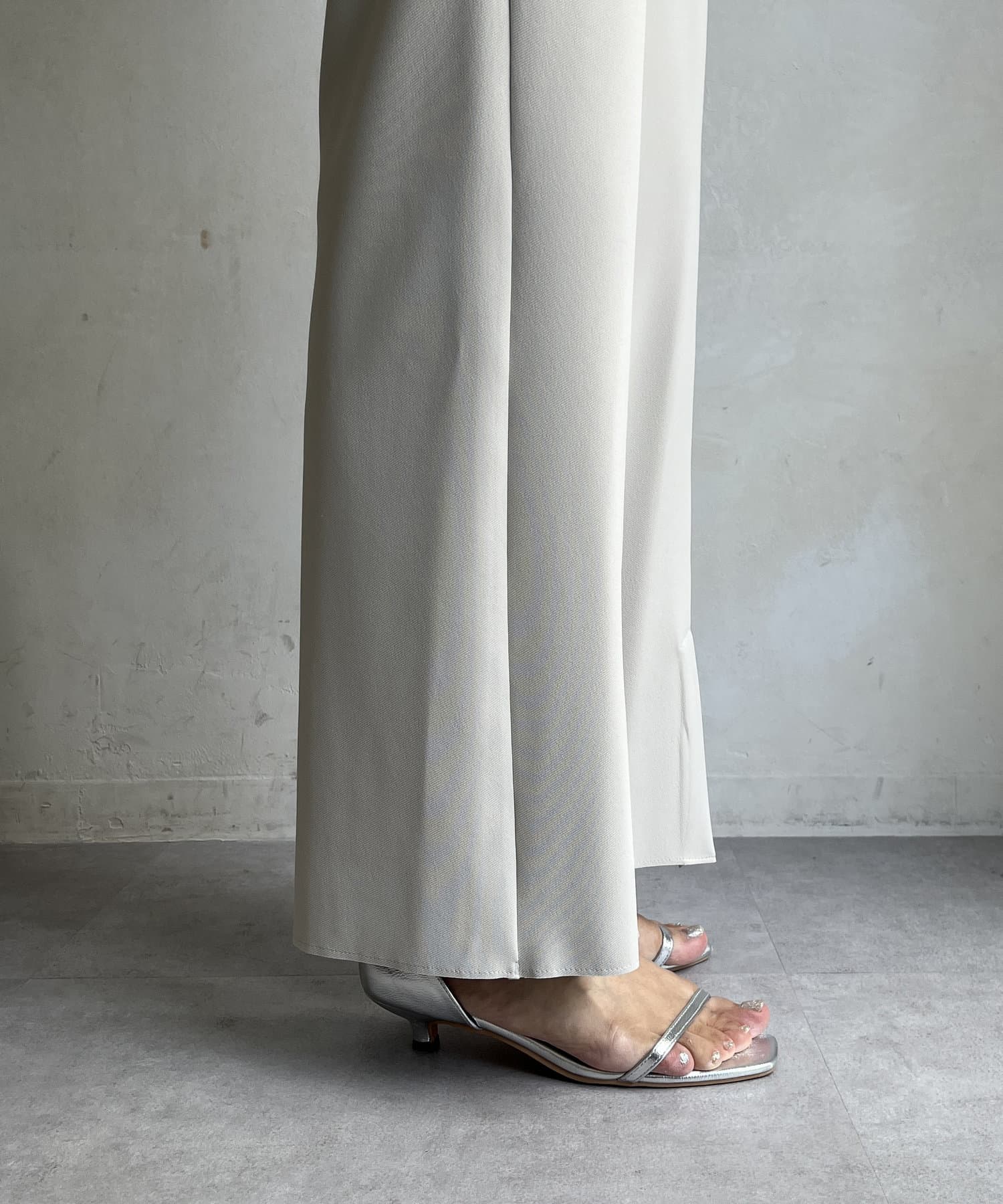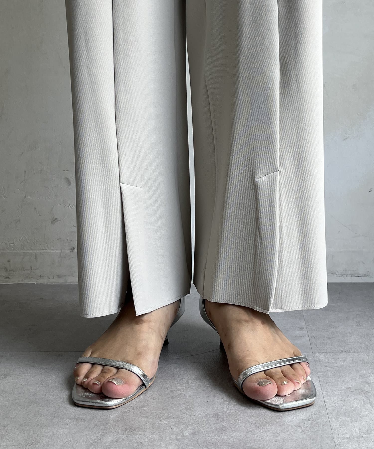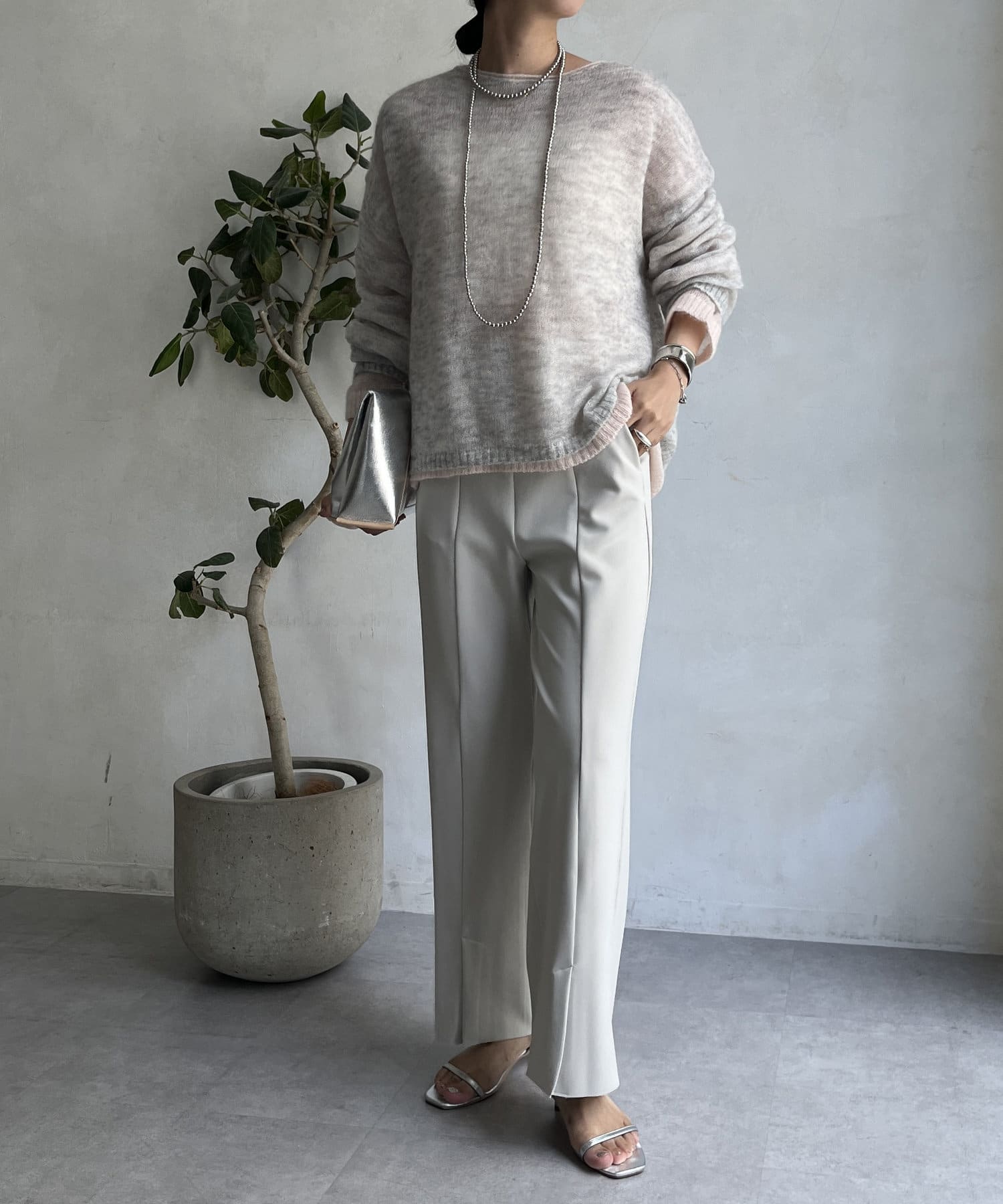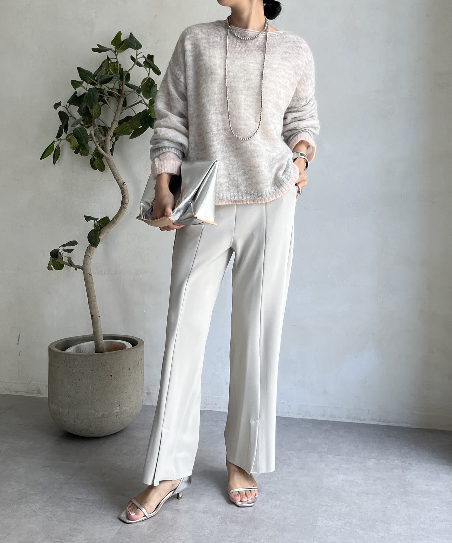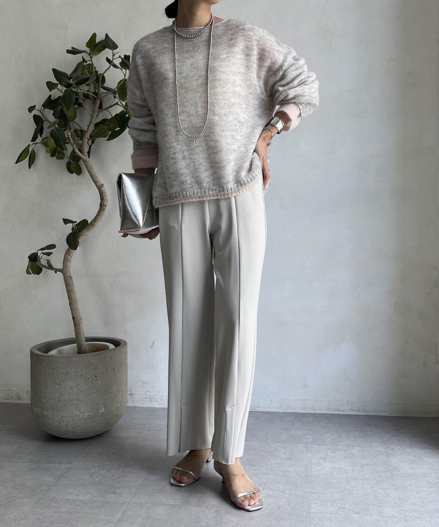 すっきりとしたノータックの美脚見えストレートパンツ。