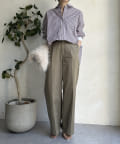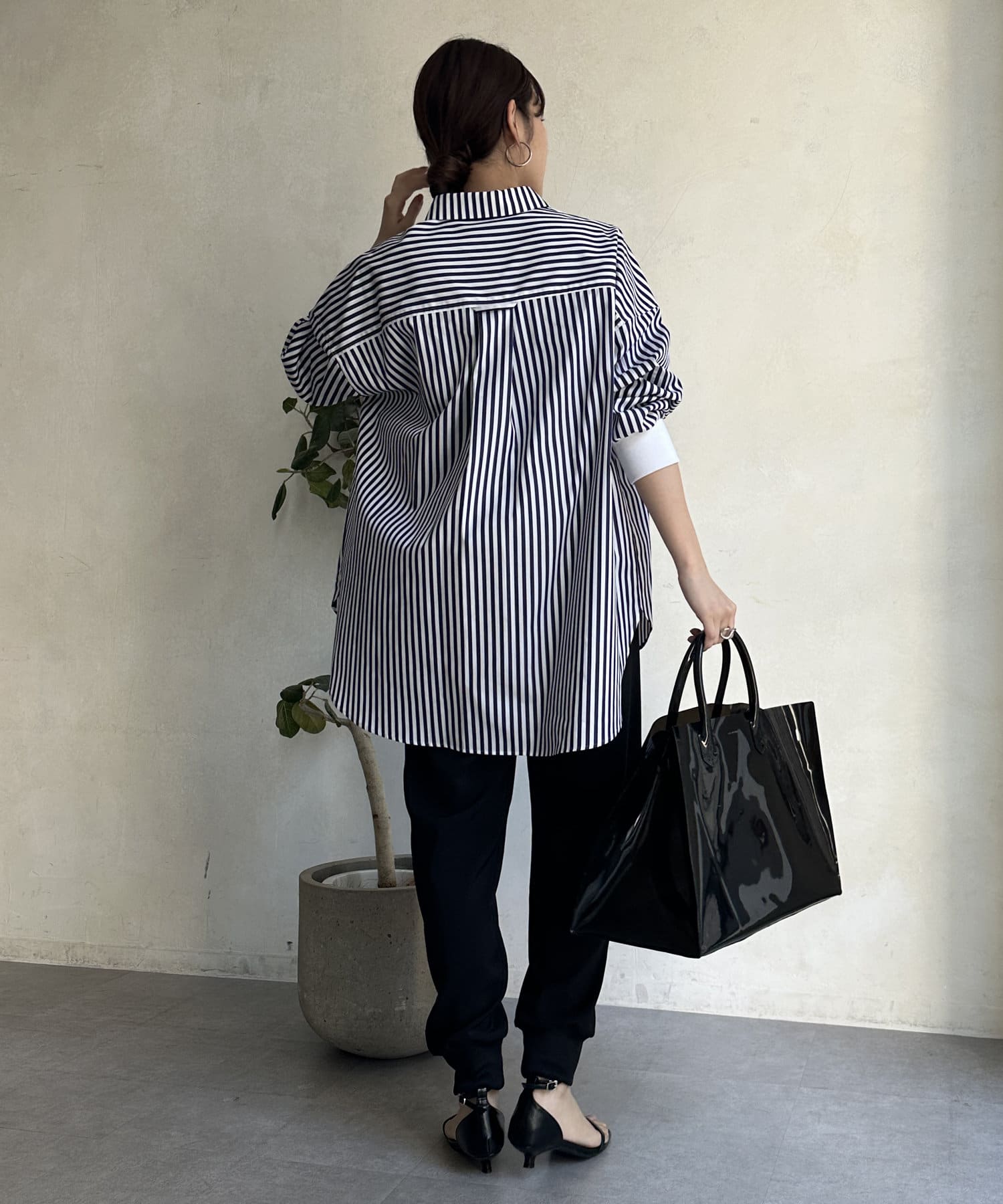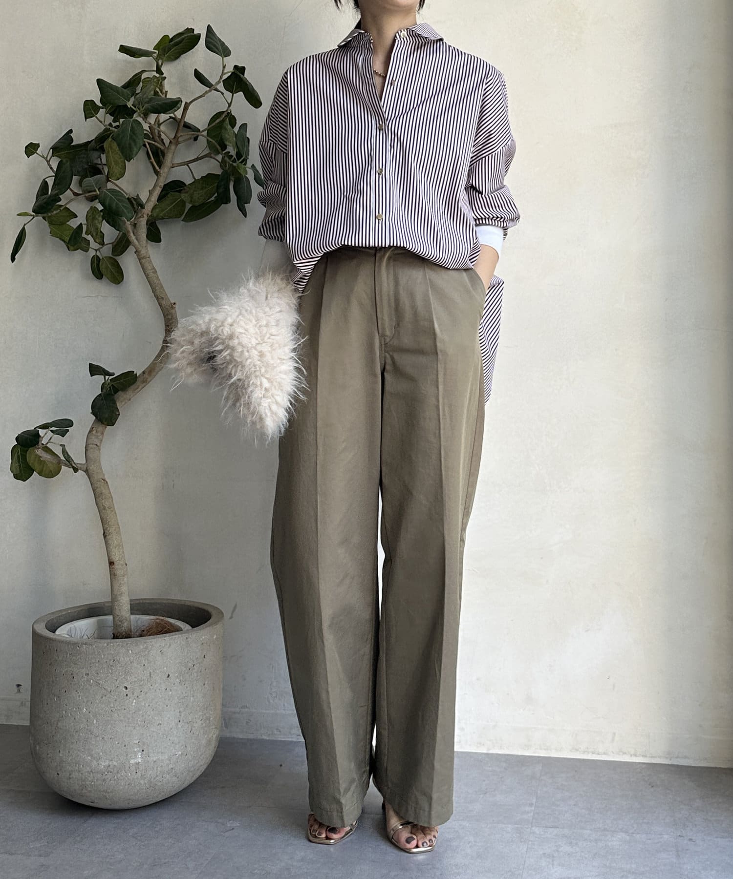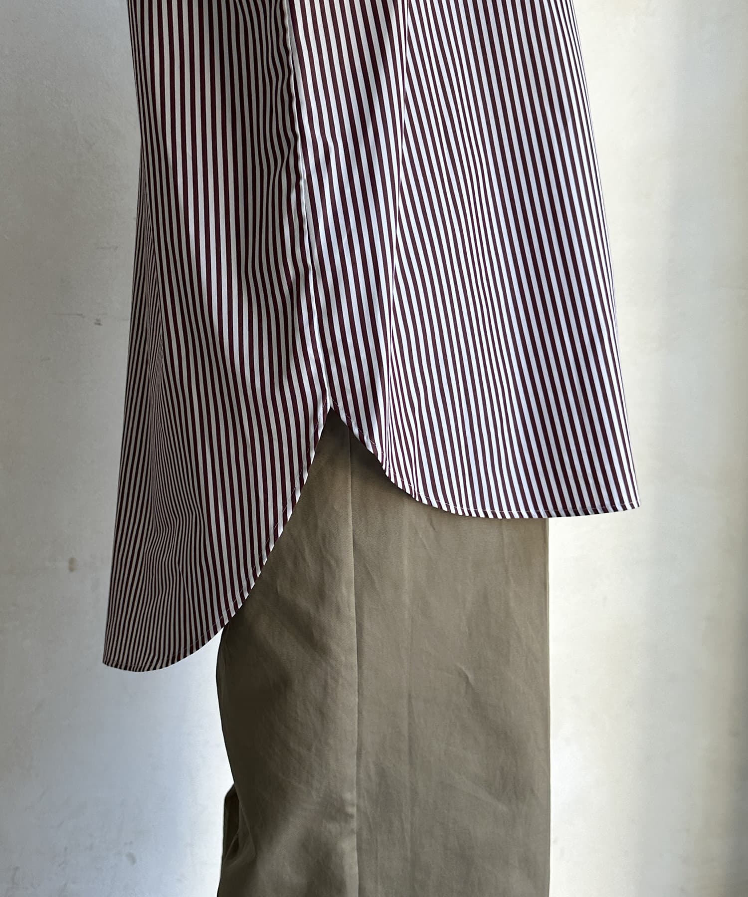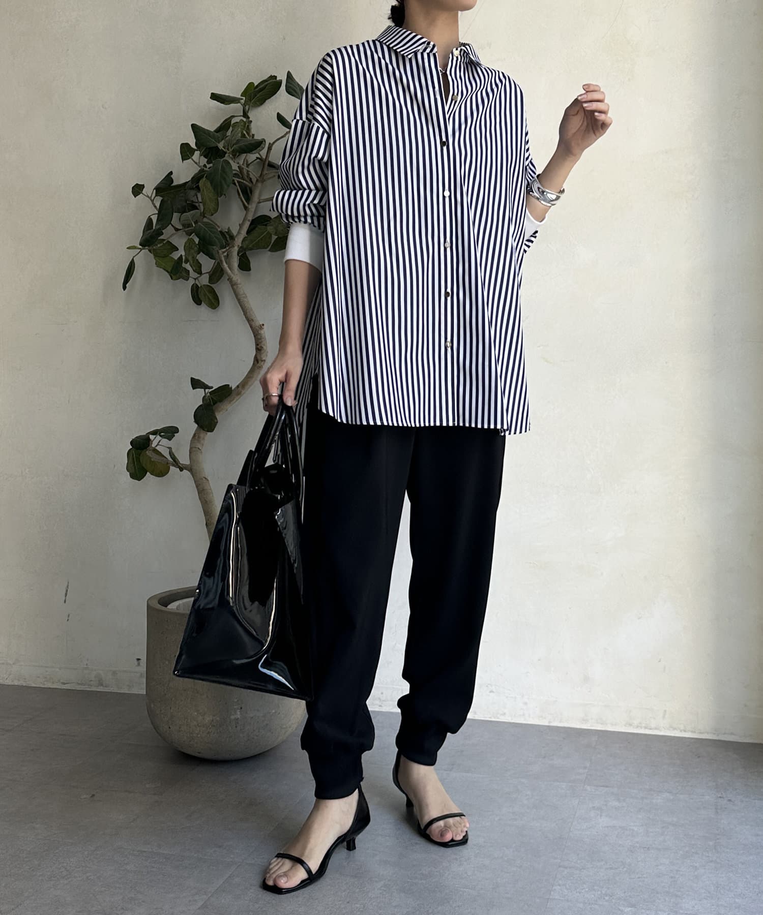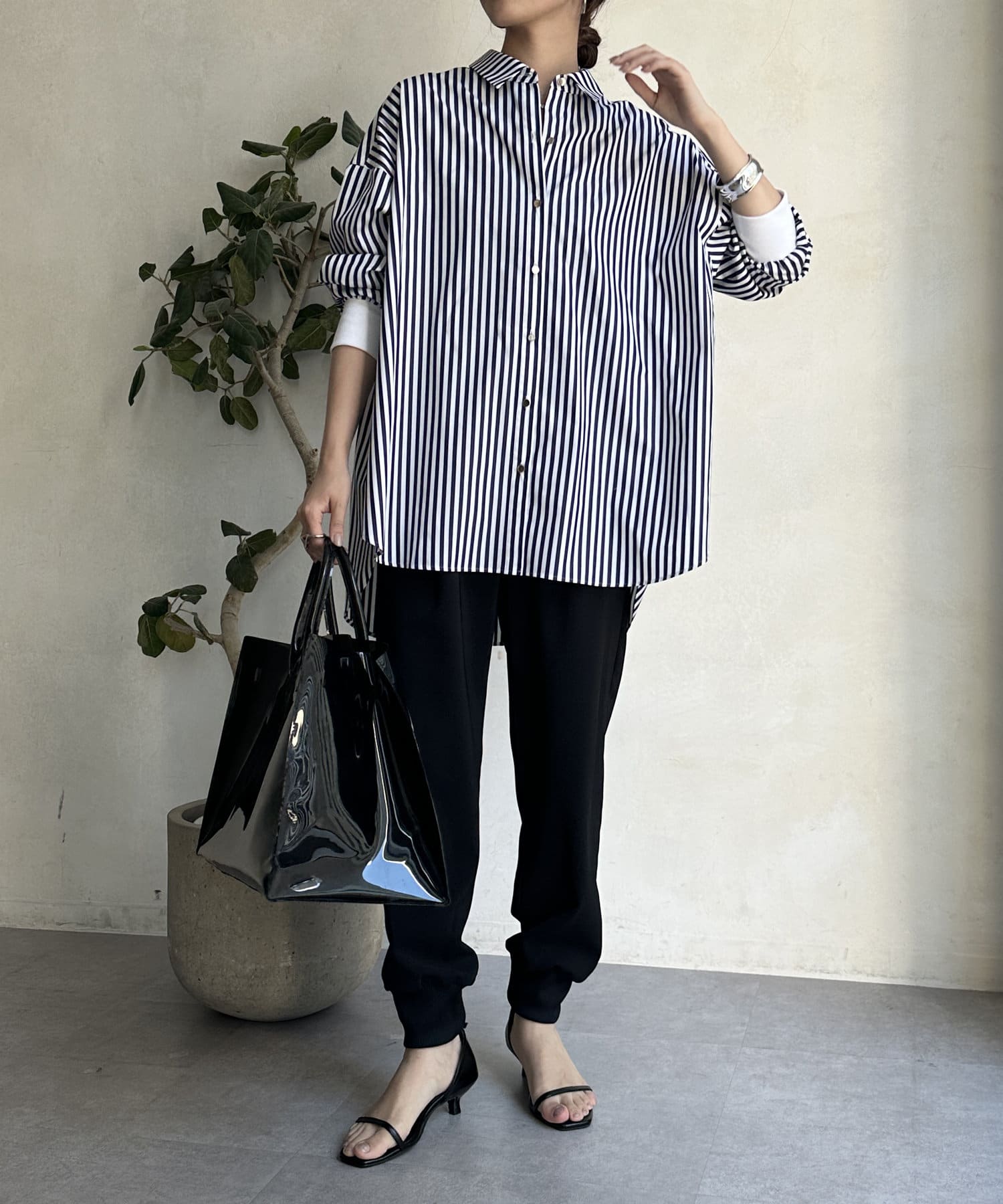 ややハリのある素材感で体のラインを拾いにくくなっており、長めの着丈なので気になる腰やヒップ周りも体型カバーしてくれます。