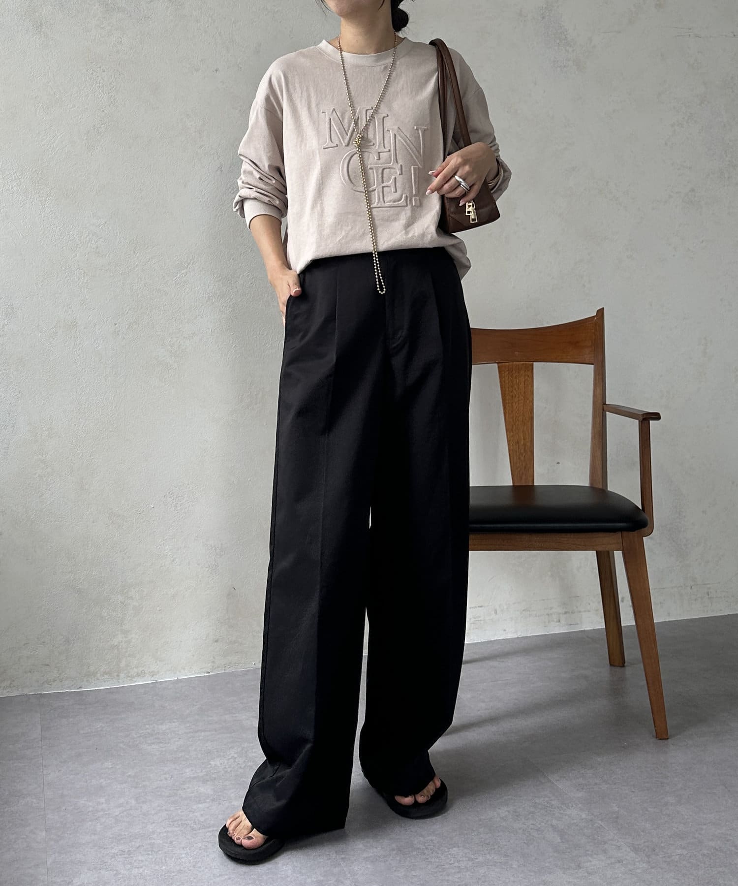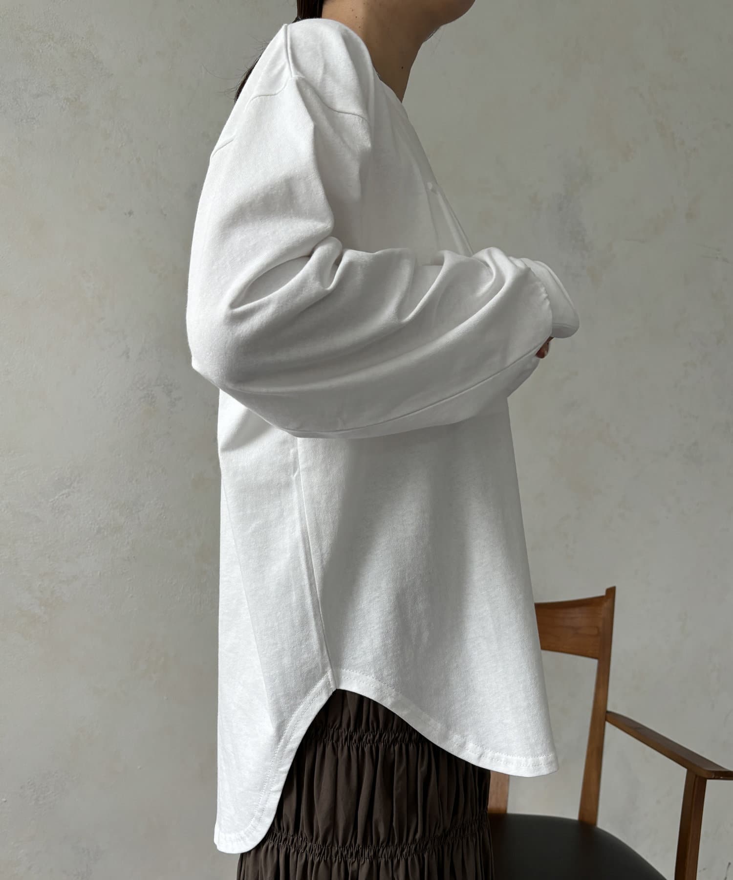 インでもアウトでも使えるシンプルなデザインは、いろんなボトムスコーデと相性抜群ですよ!