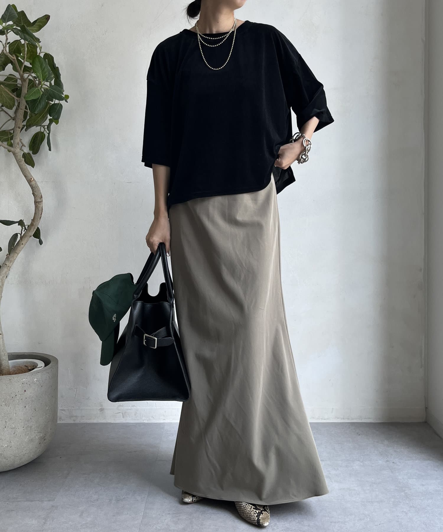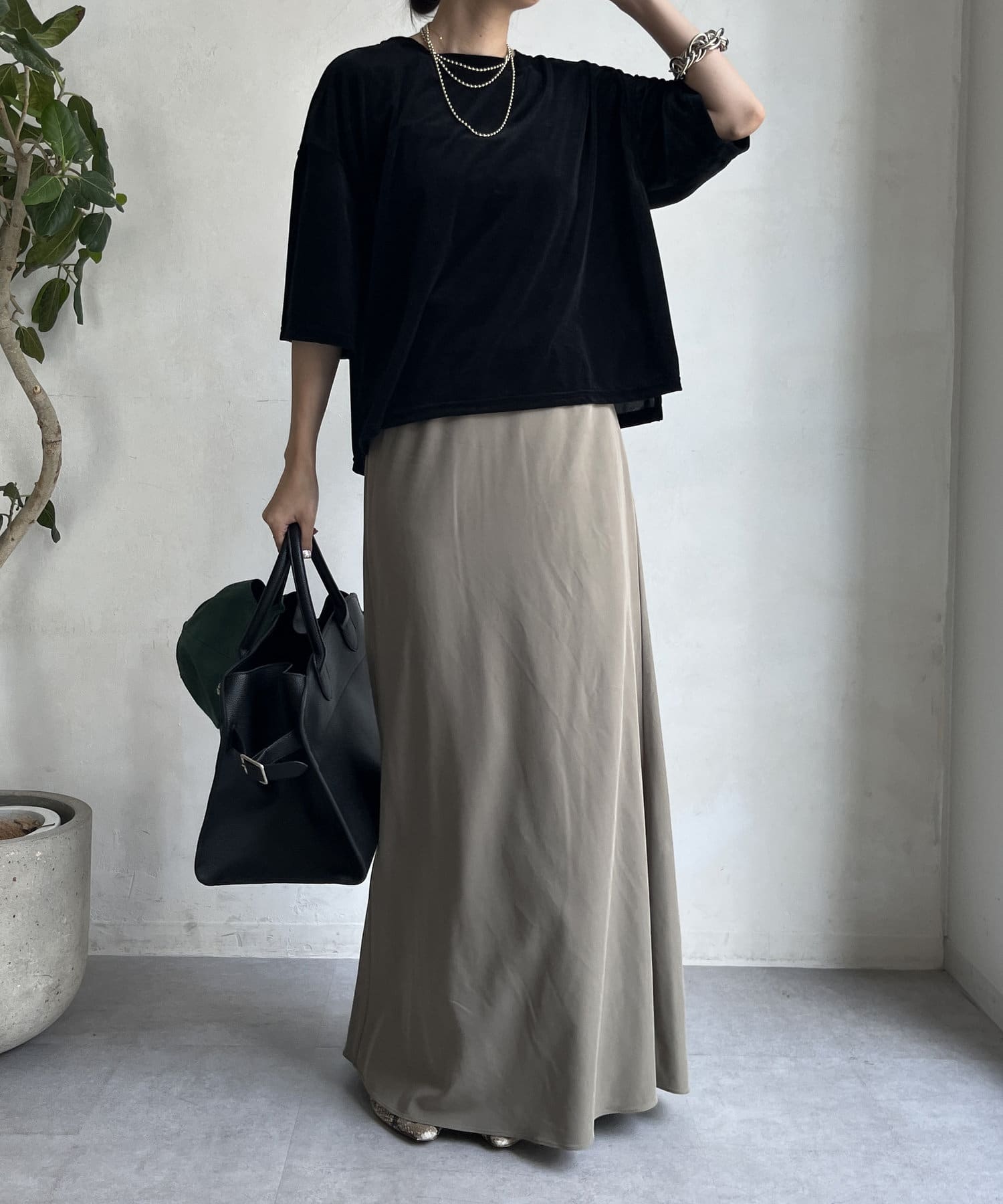 微光沢のベロア素材が上品な印象で、コーディネートアップデートしてくれます。