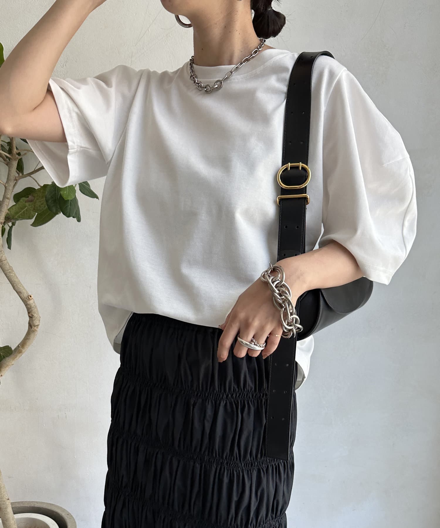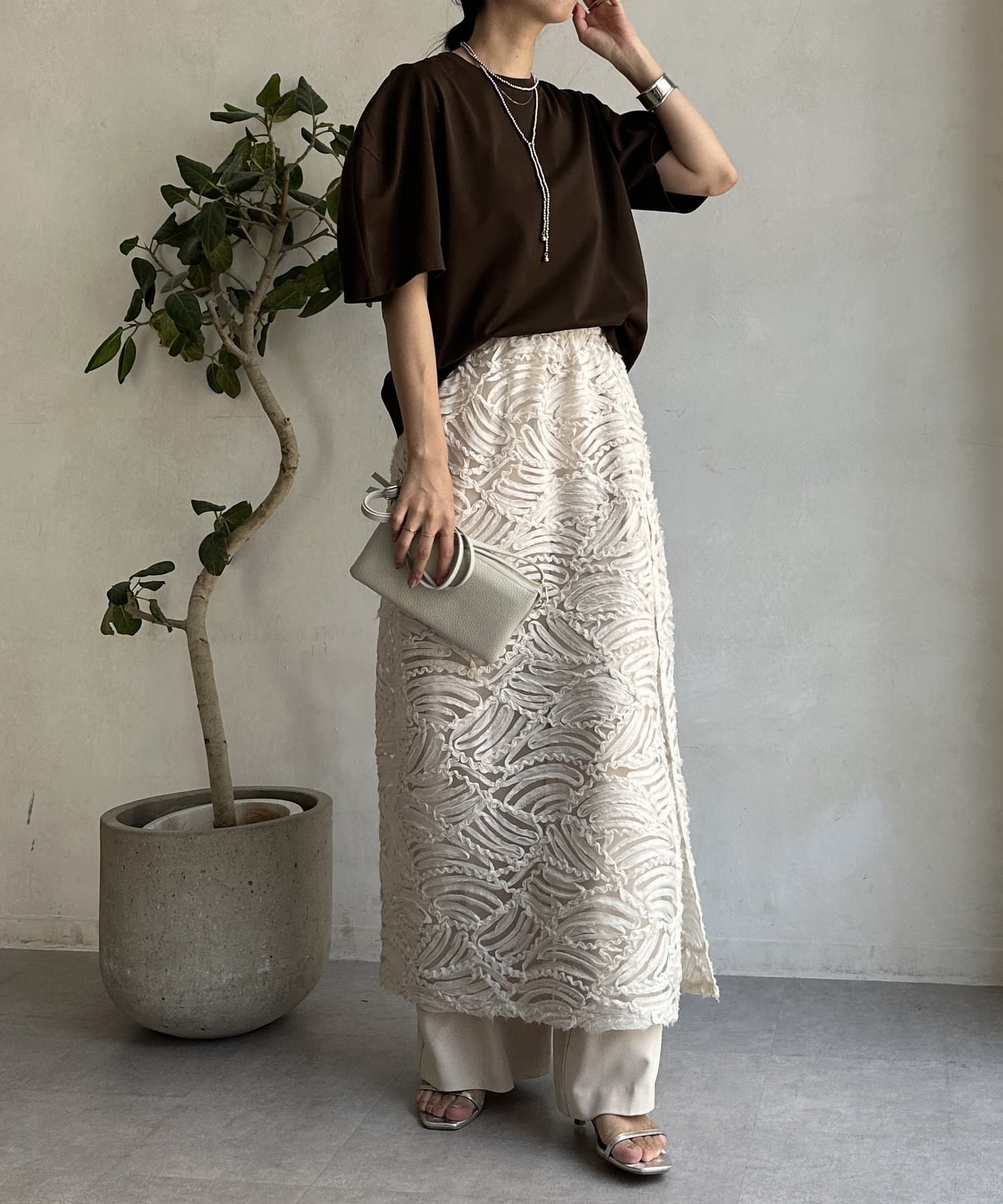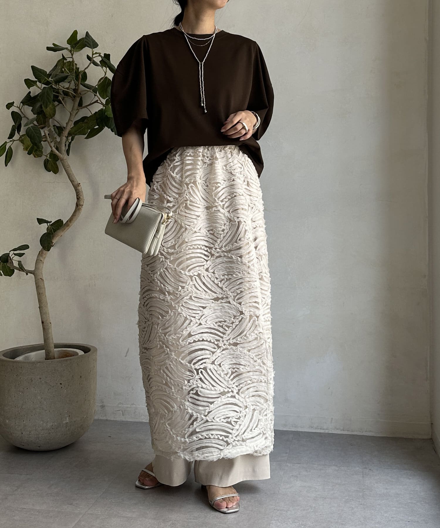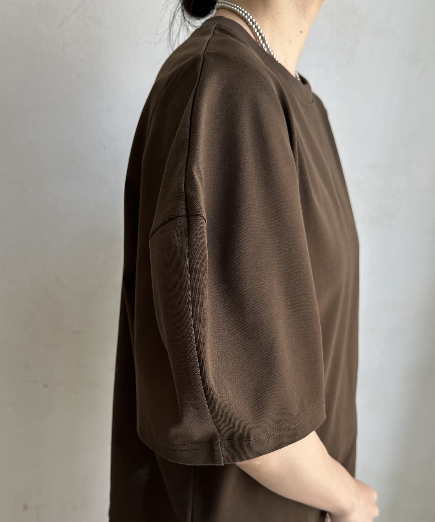 立体的なスリーブデザインに。肘にかかる長めの袖丈で二の腕をしっかりカバーしてくれます。