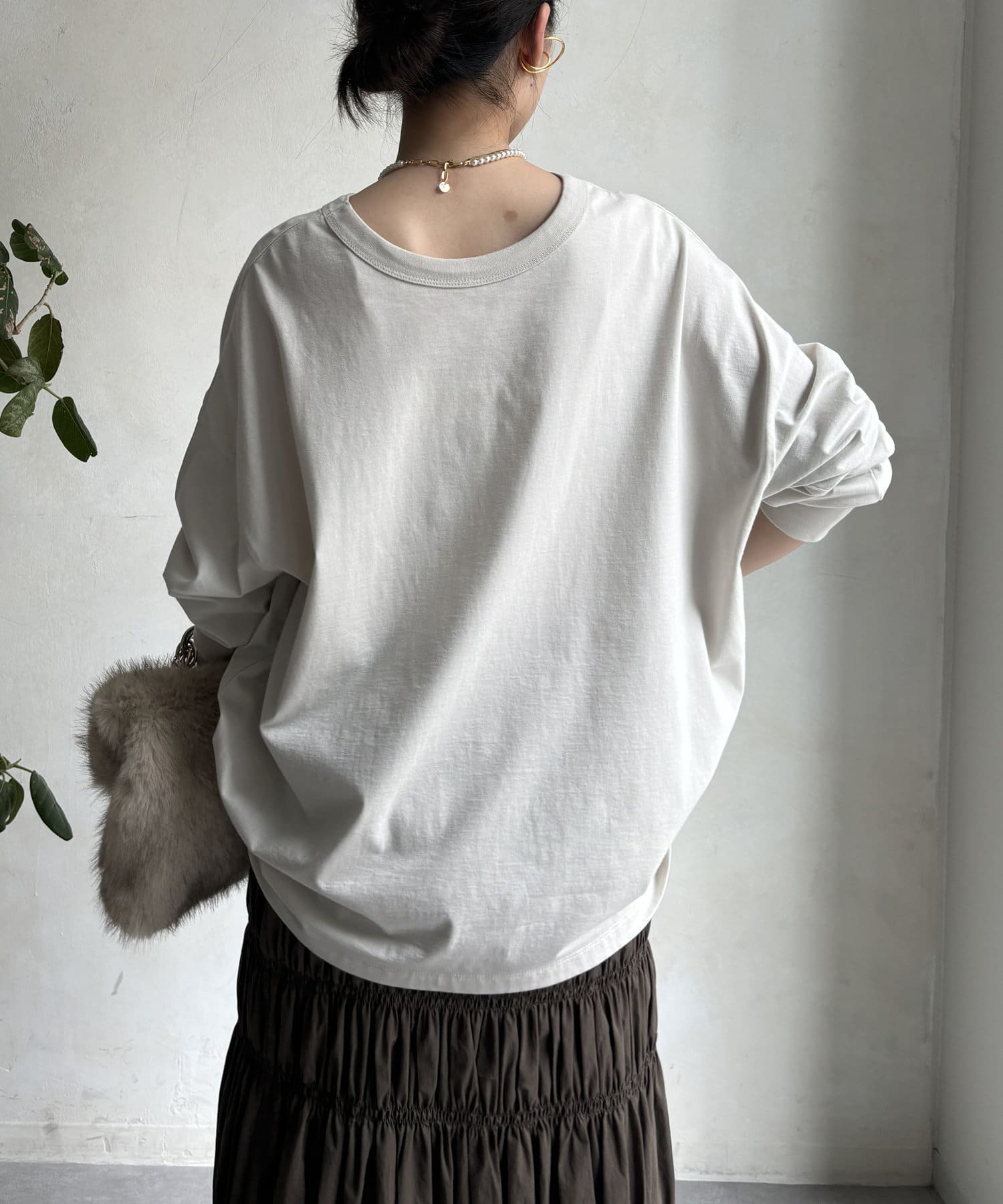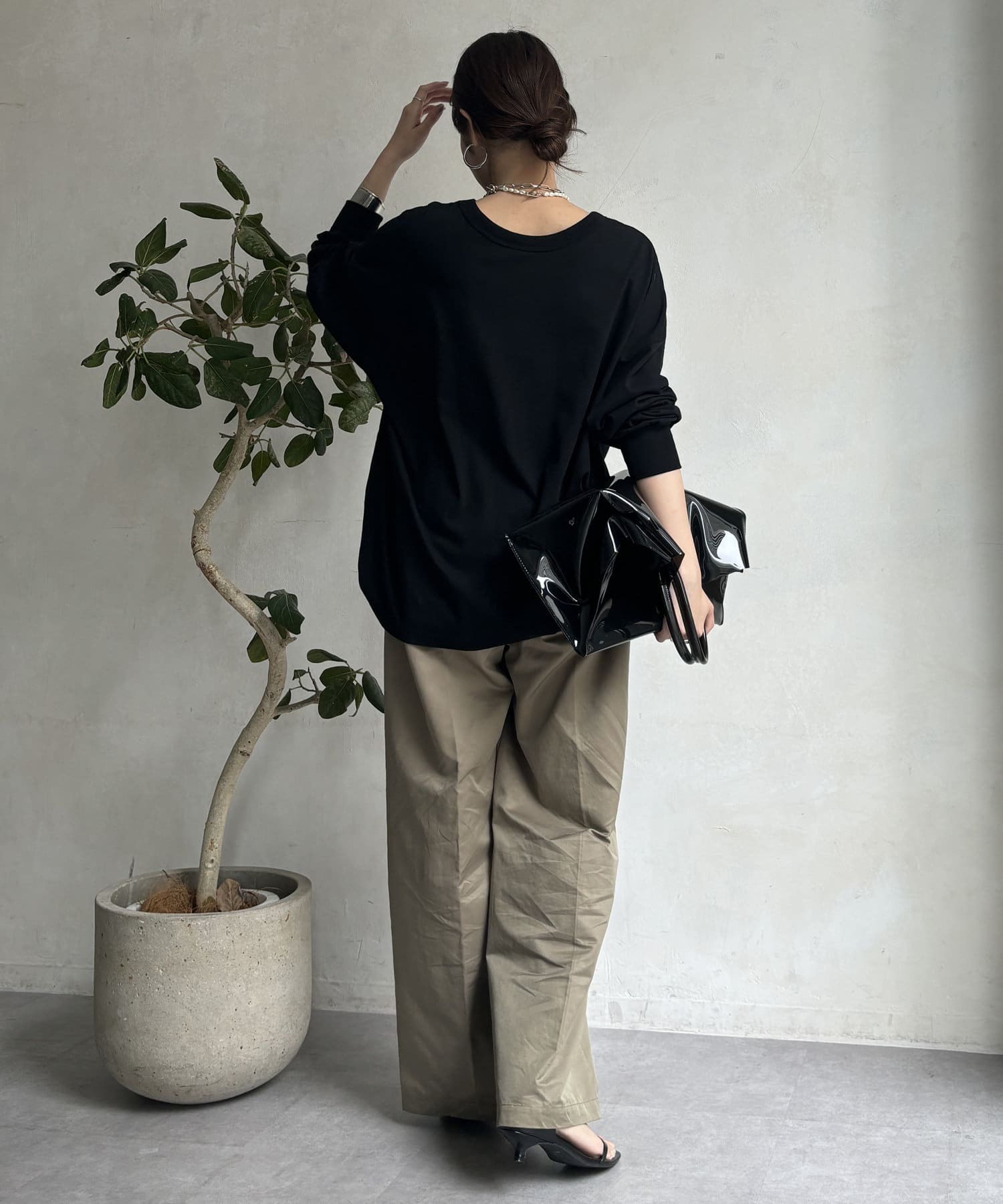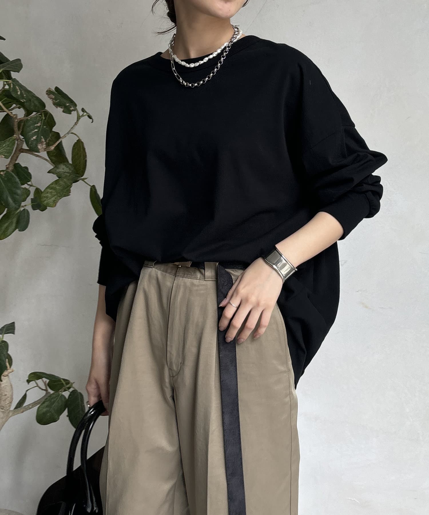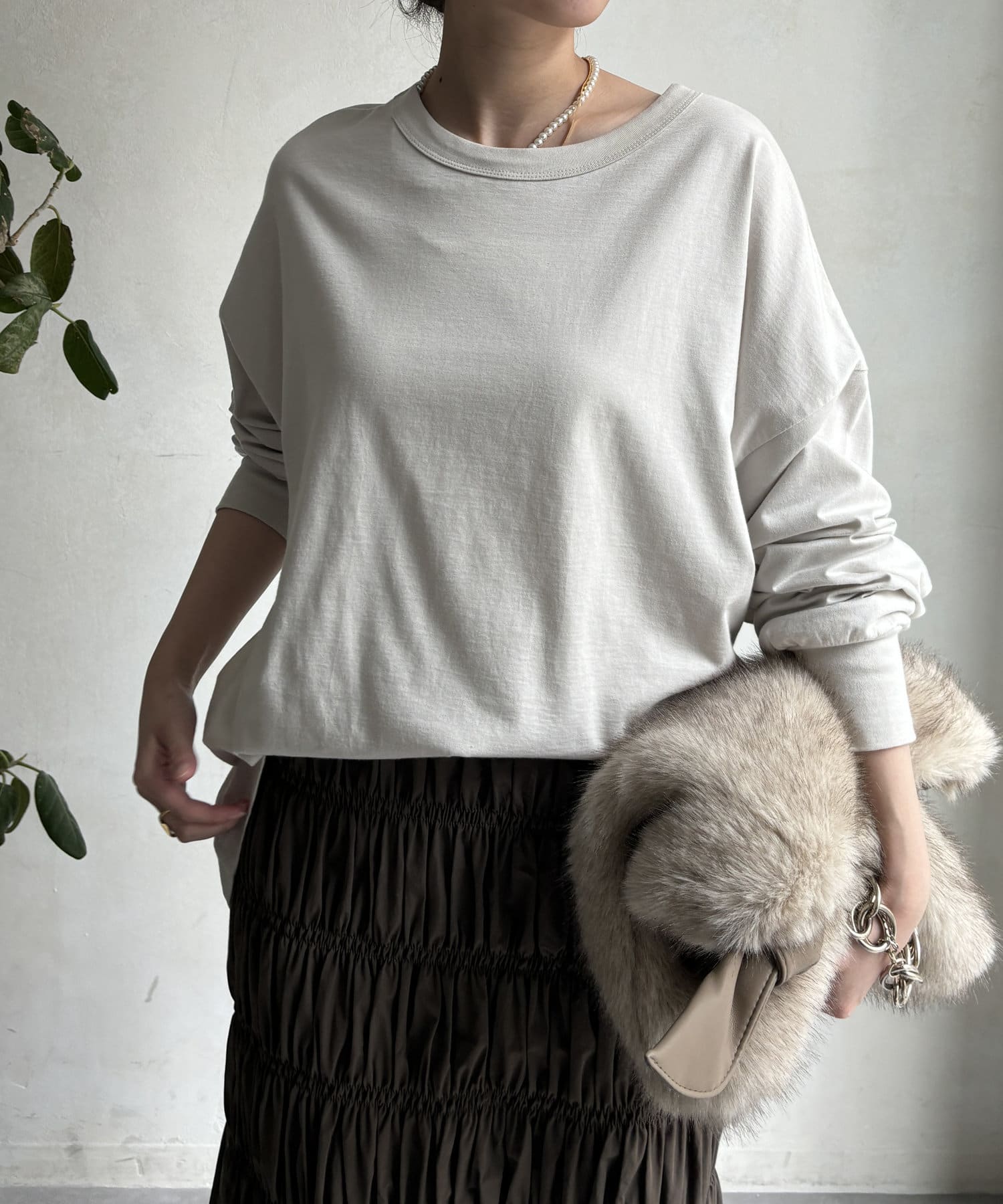 お袖は長めになっているので、たくし上げたときにボリュームを出しやすくこなれた印象になっております。
