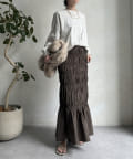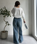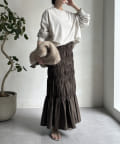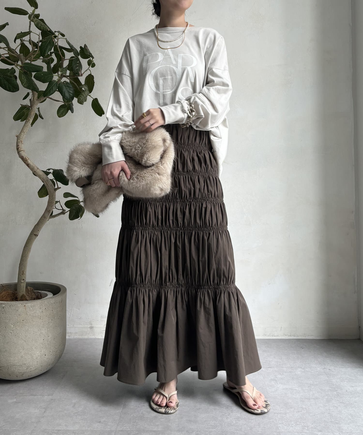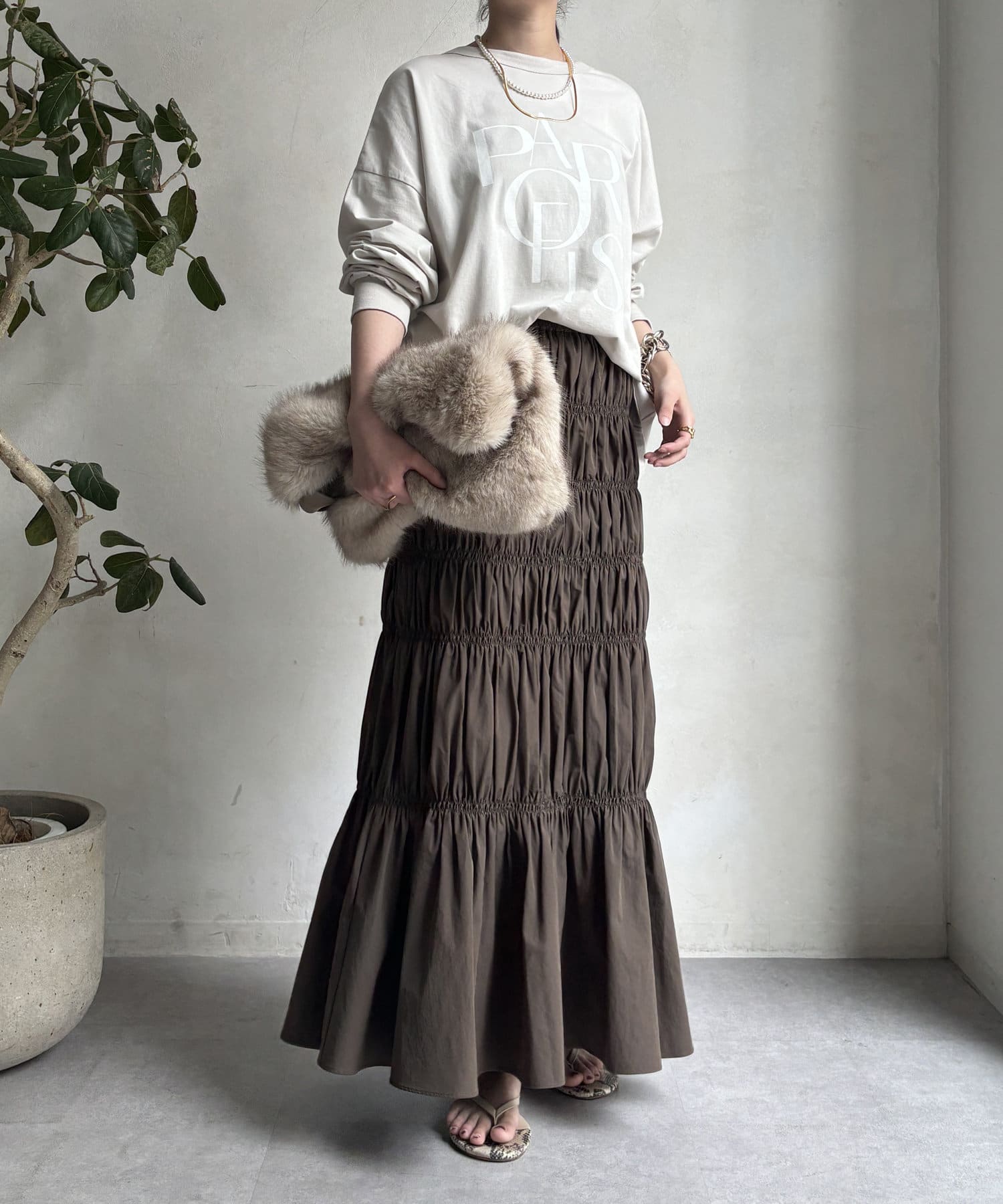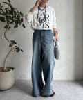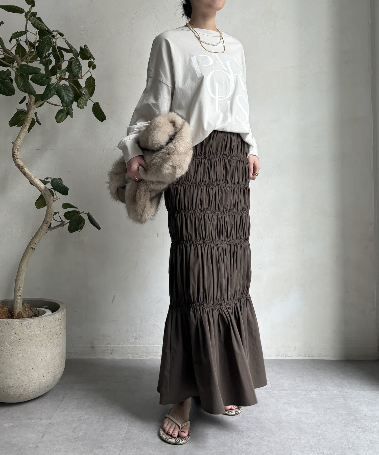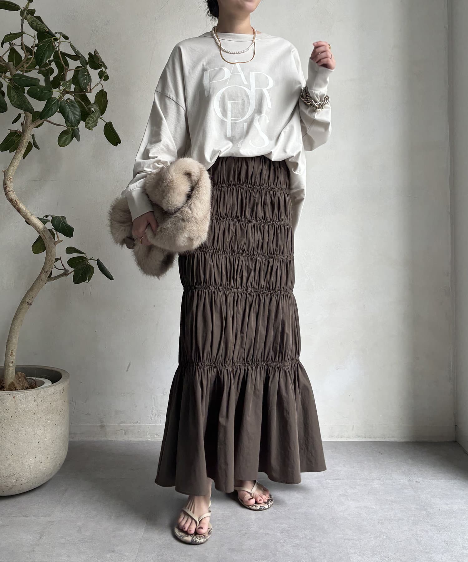お袖は長めになっているので、たくし上げたときにボリュームを出しやすくこなれた印象になっております。