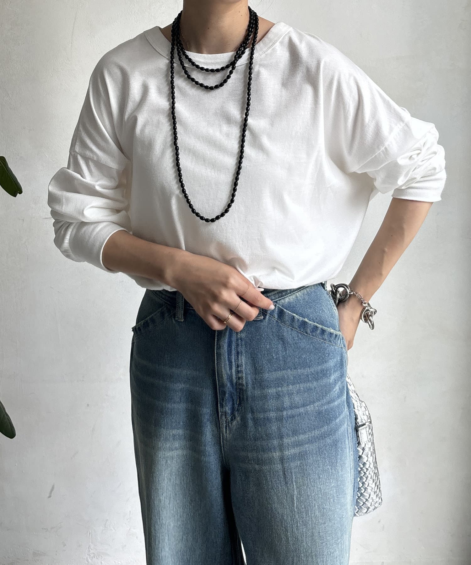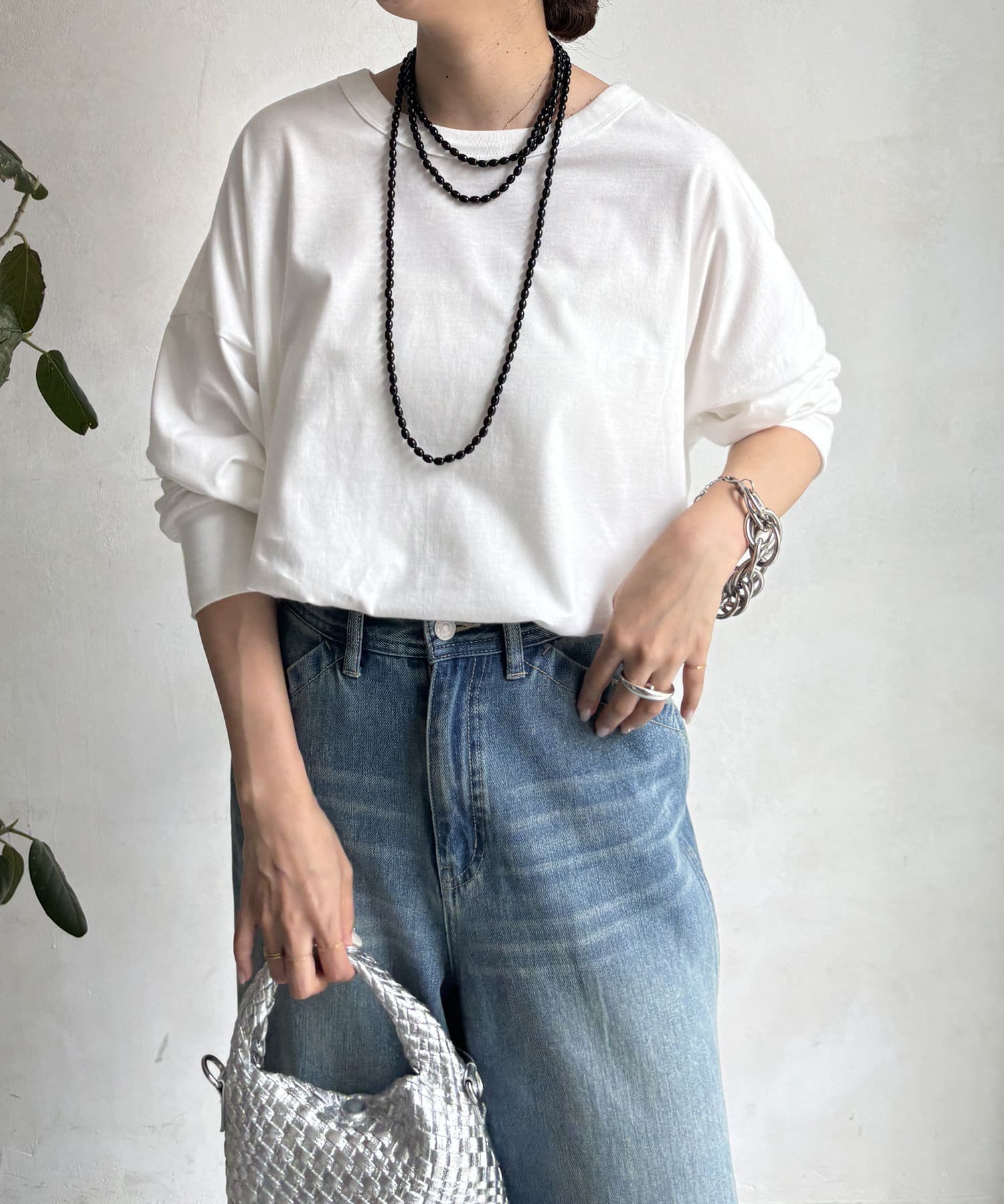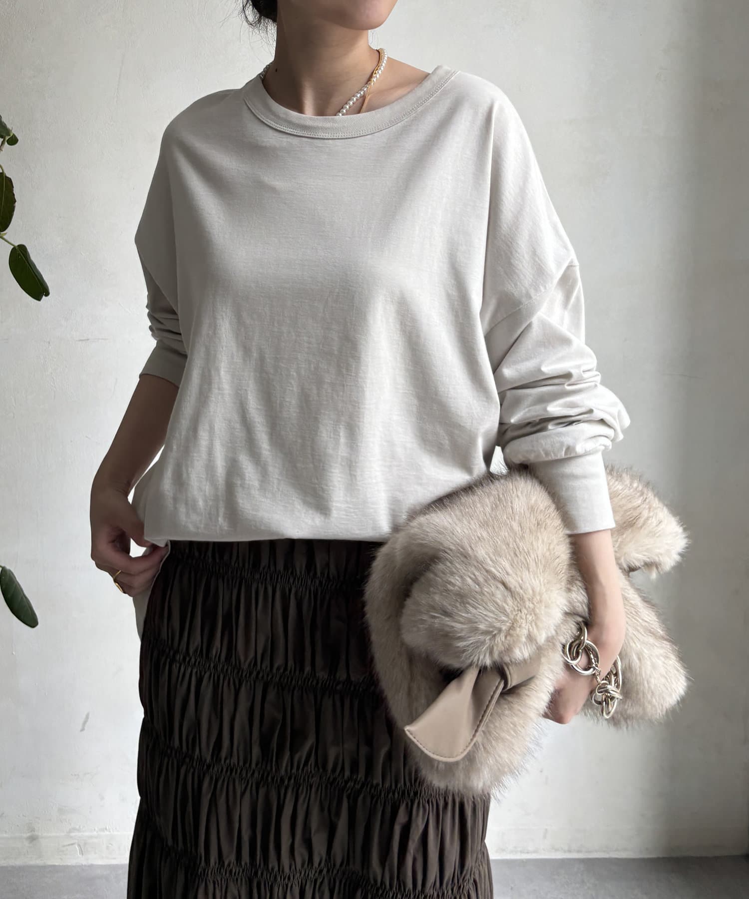 襟ぐりは詰まり過ぎず程よいあきで抜け感を、