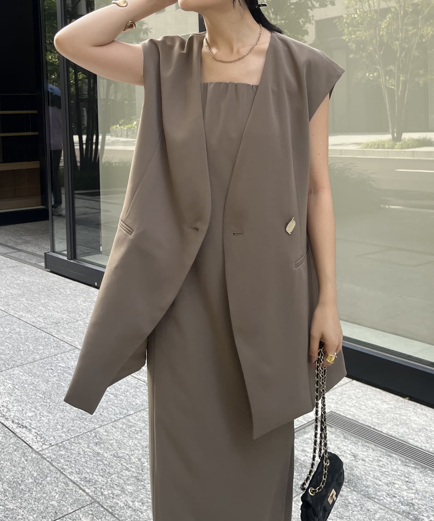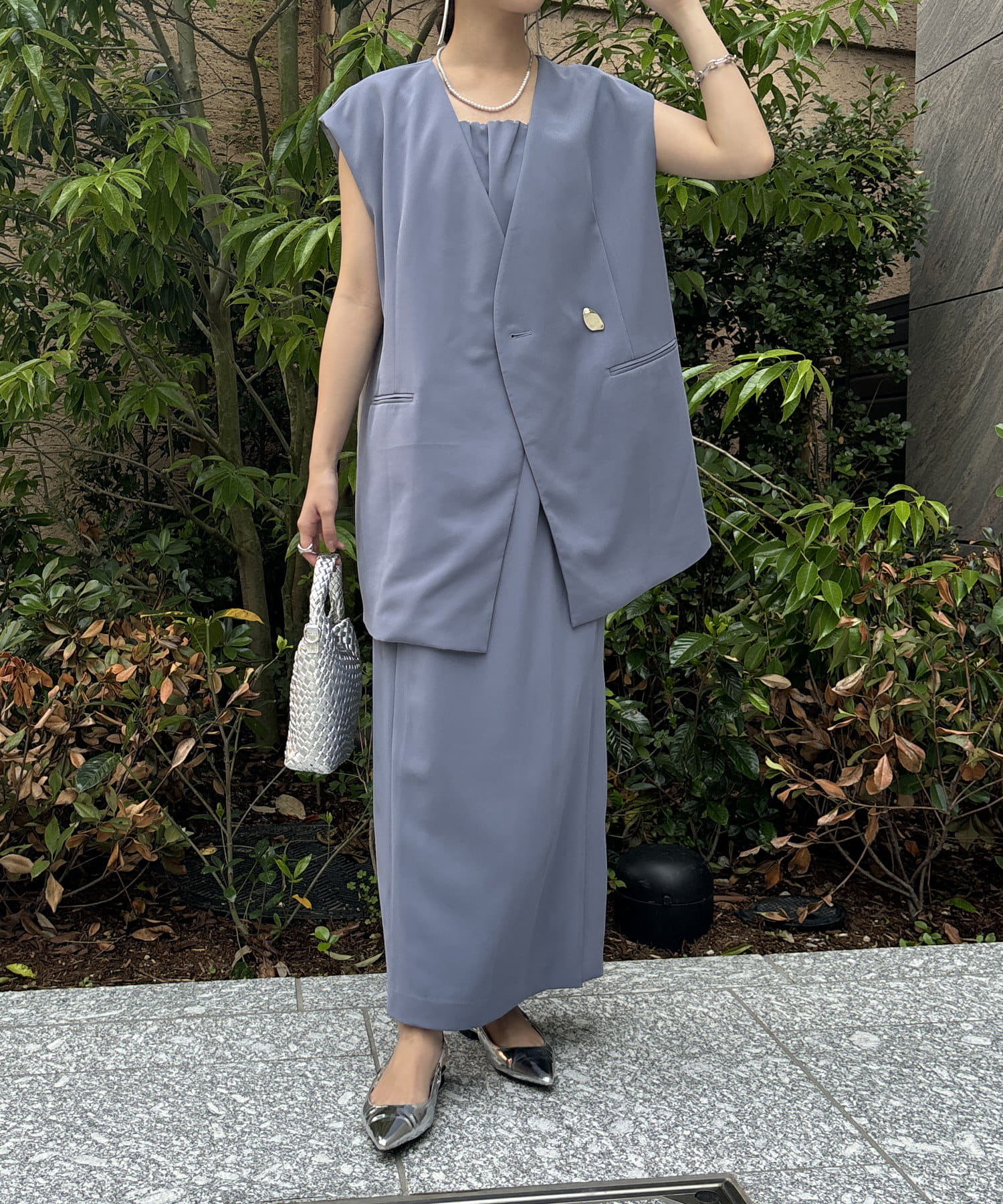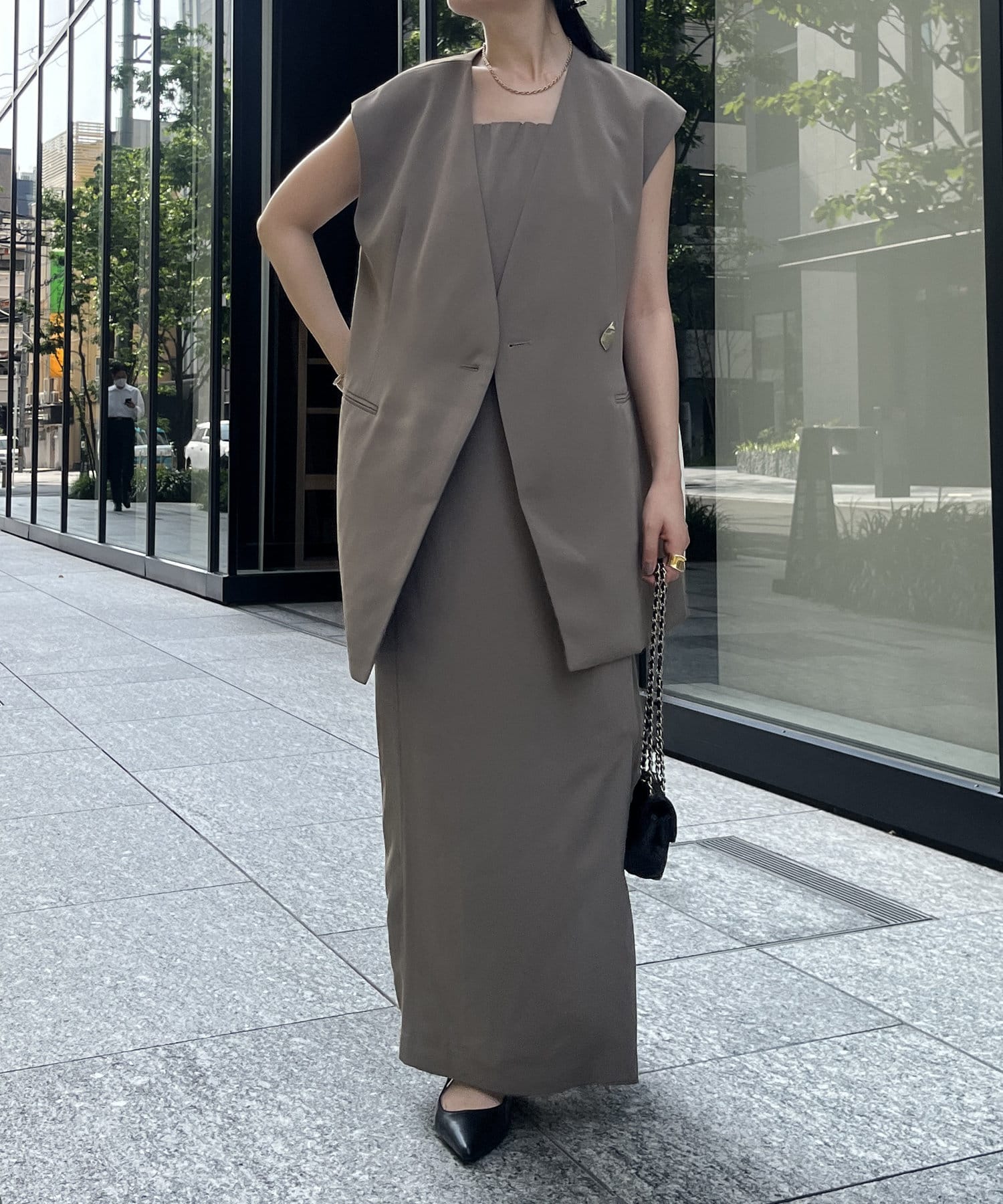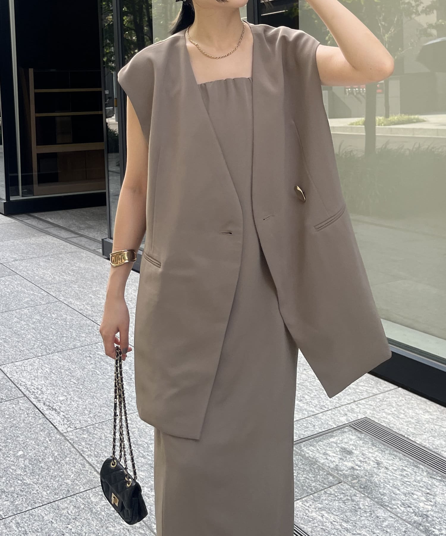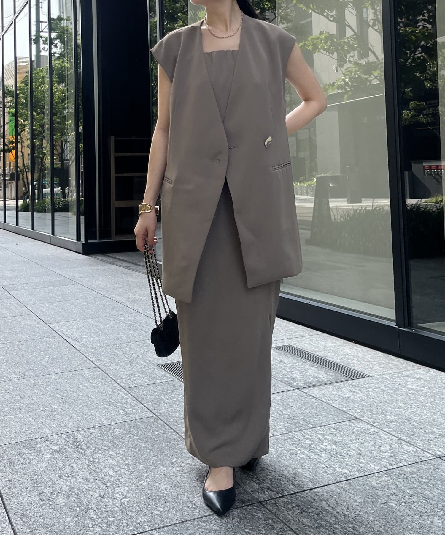 落ち感のある素材で仕立てた、ジレとワンピースのセットアイテム
