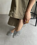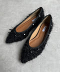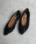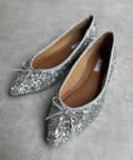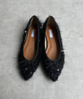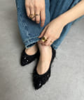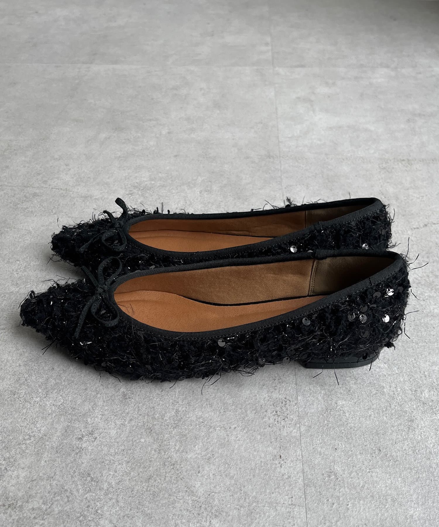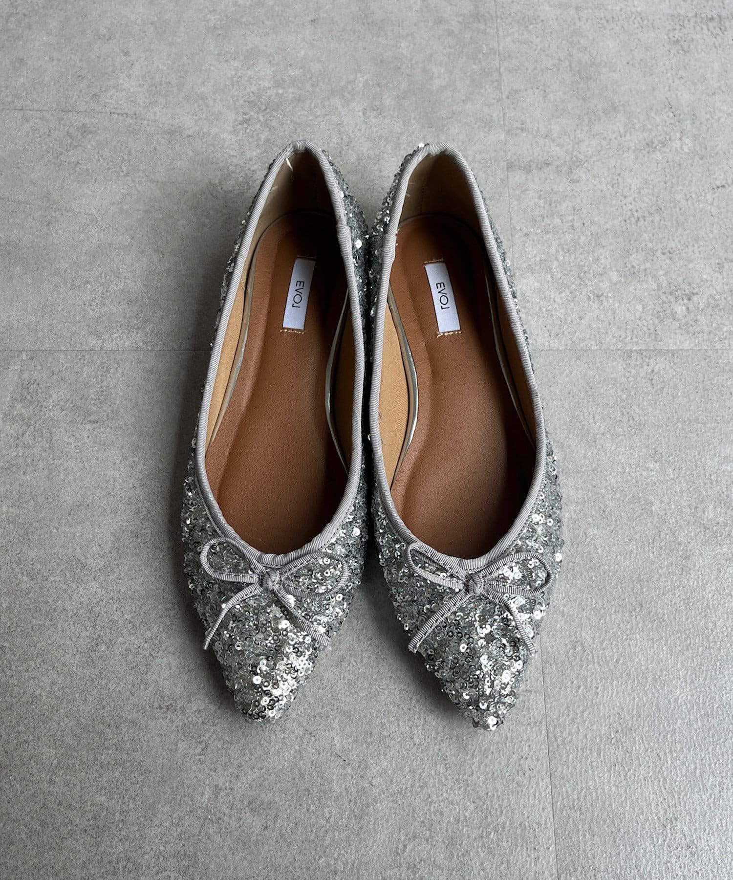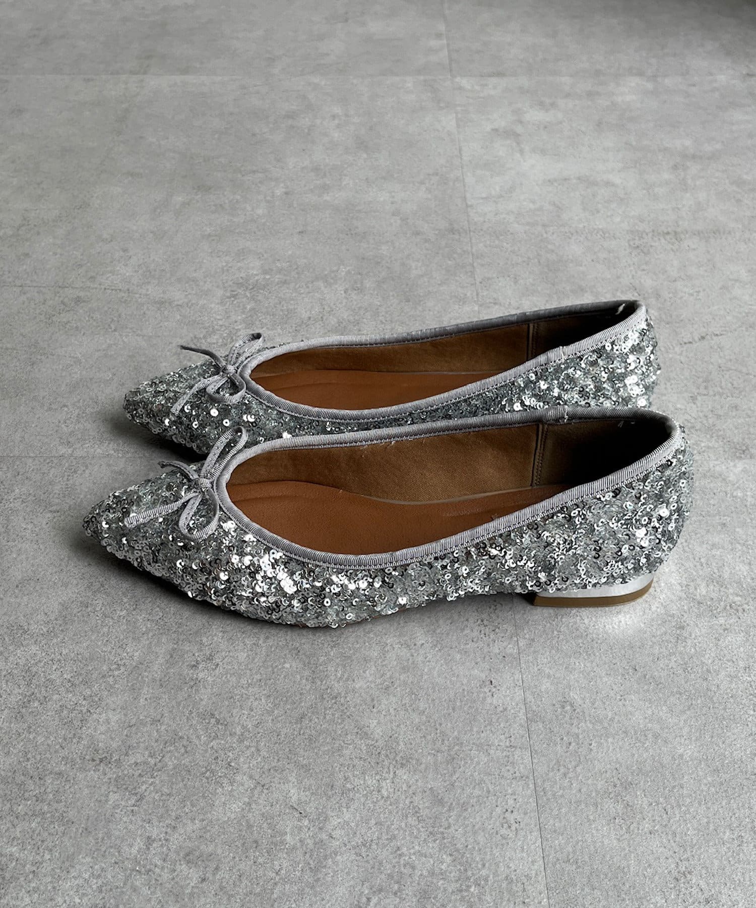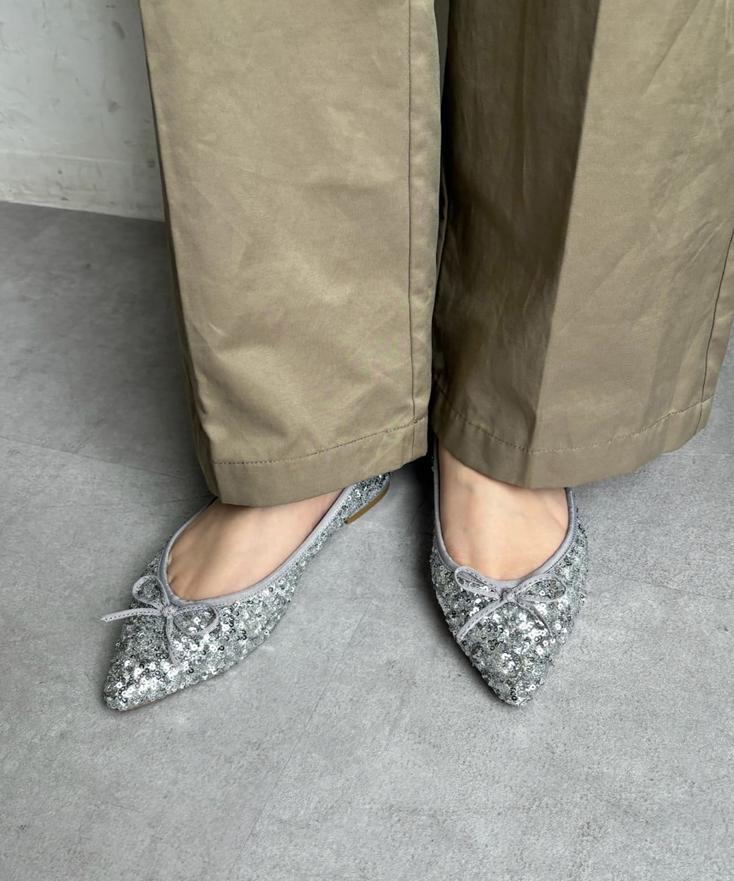 コーディネートのポイントになるスパンコールバレエシューズ。