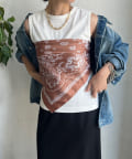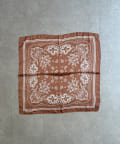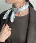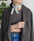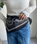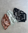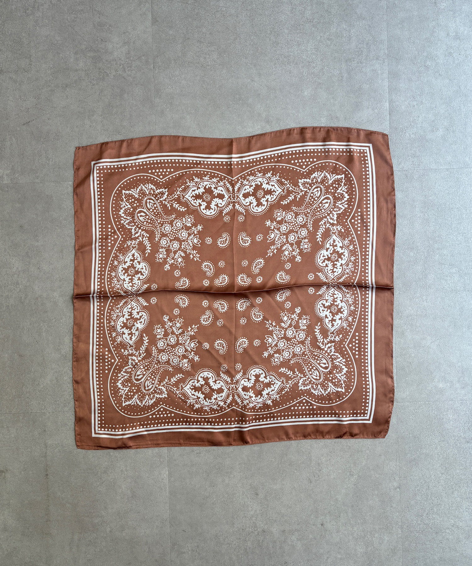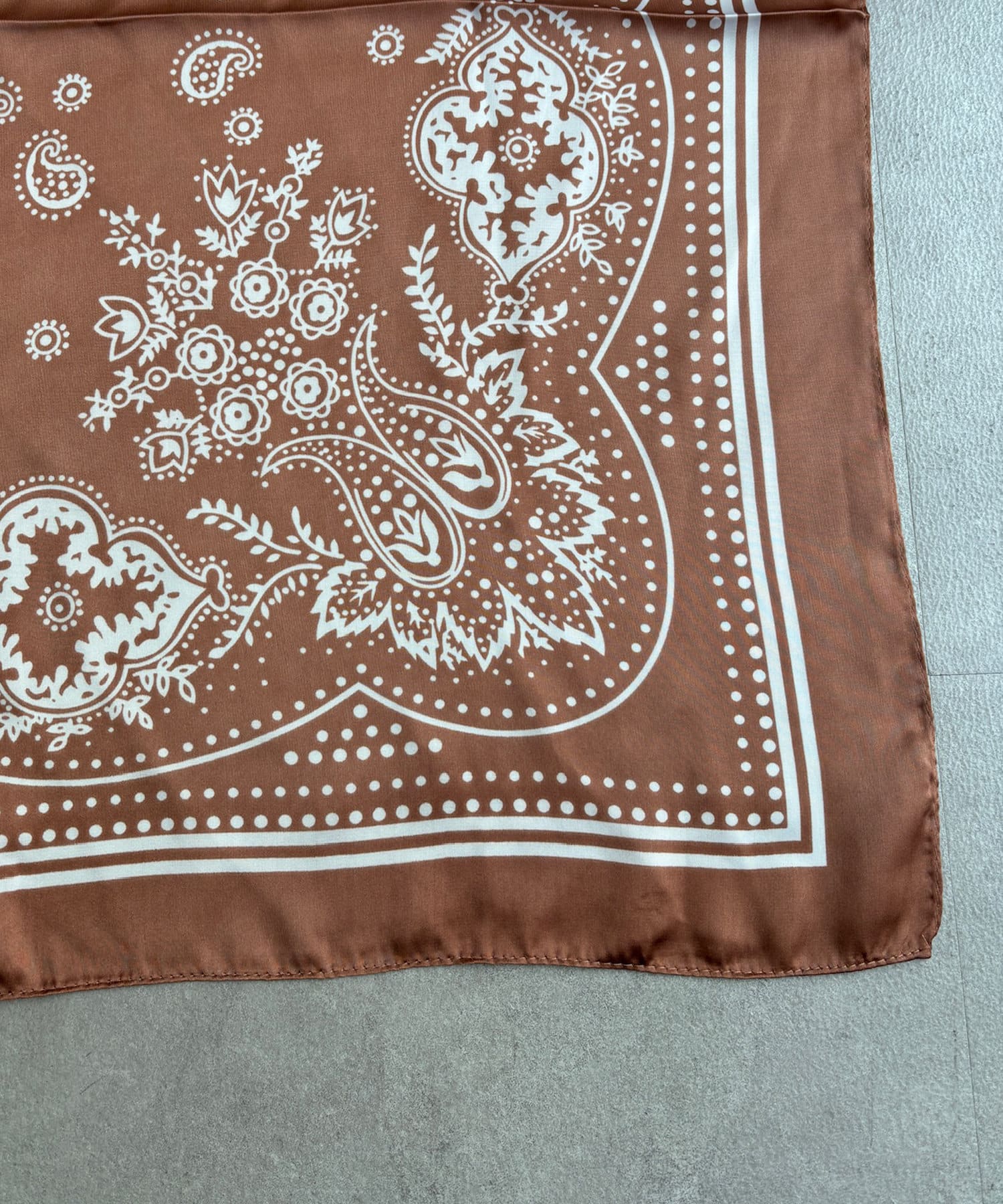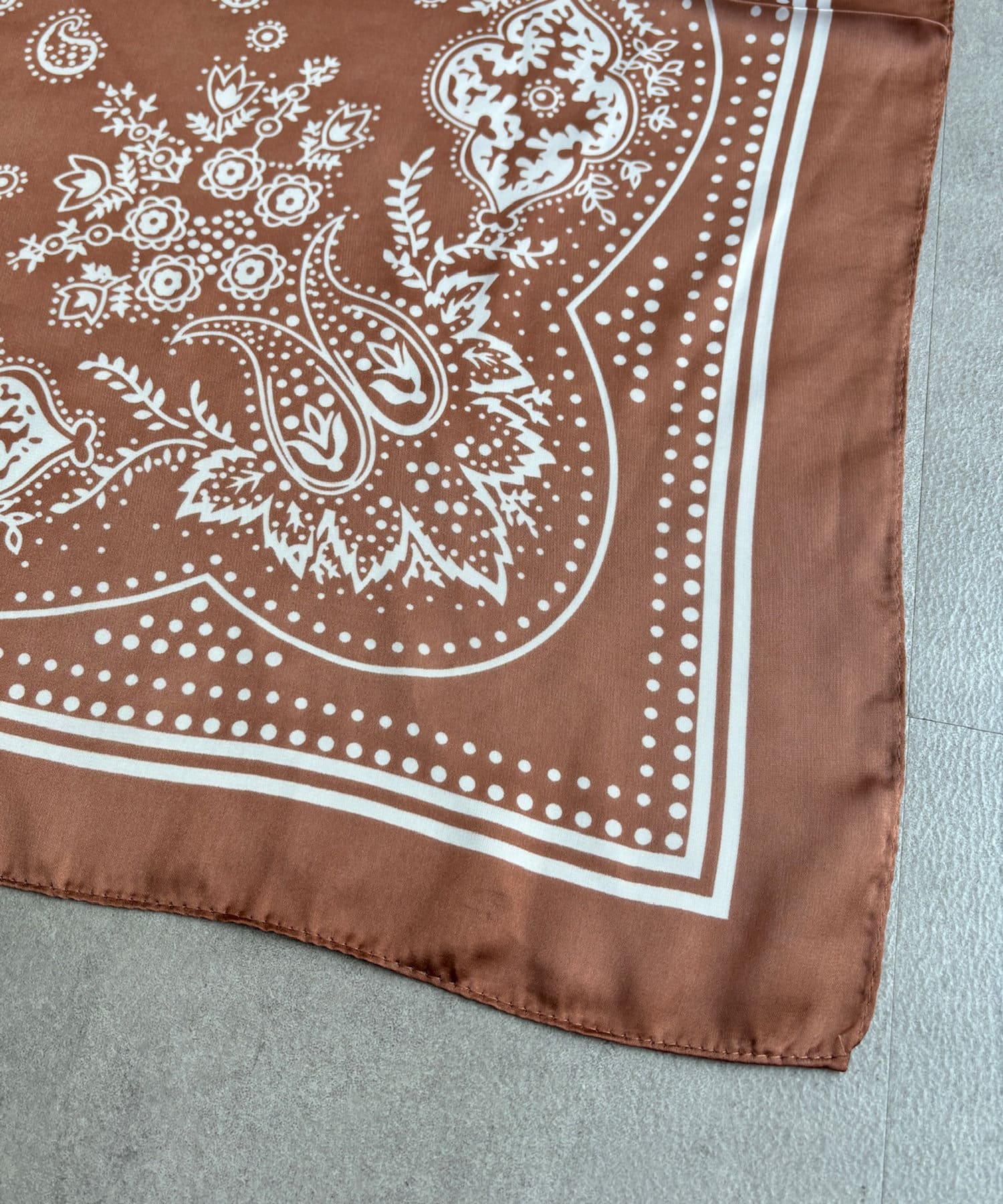 バンダナ柄でカジュアルながらも、光沢感が上品な印象のスカーフ。
