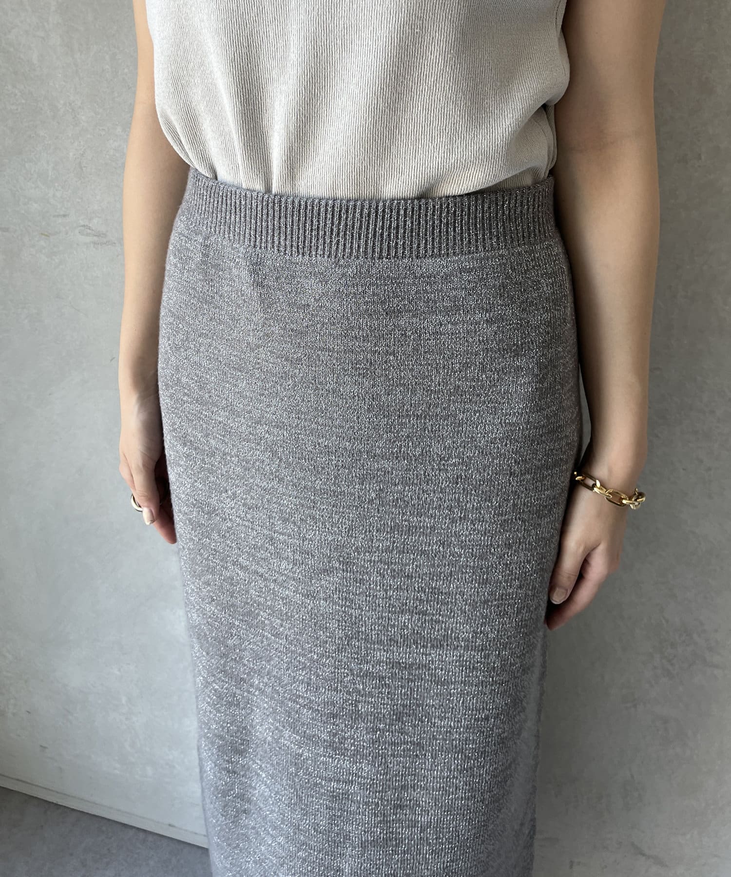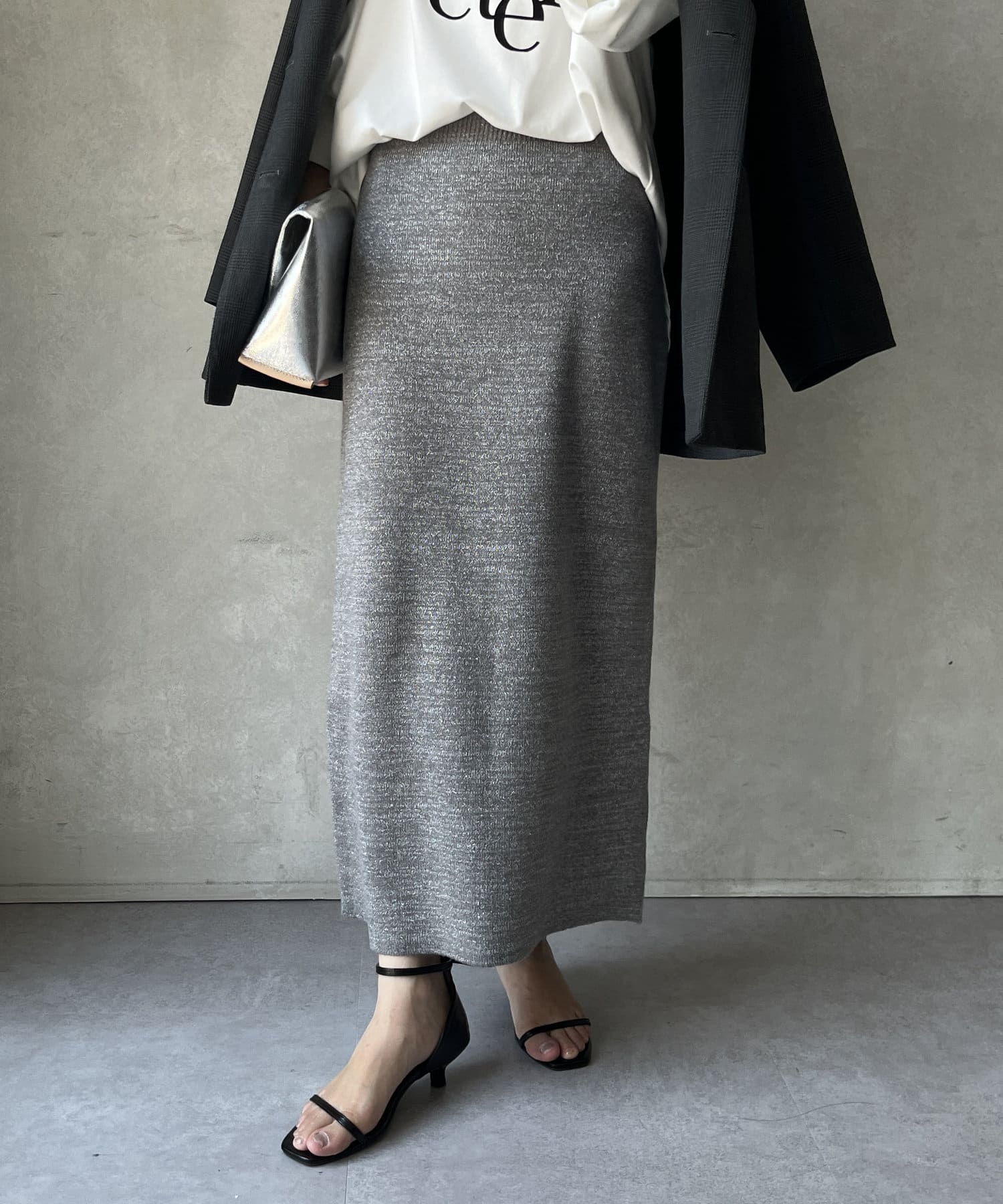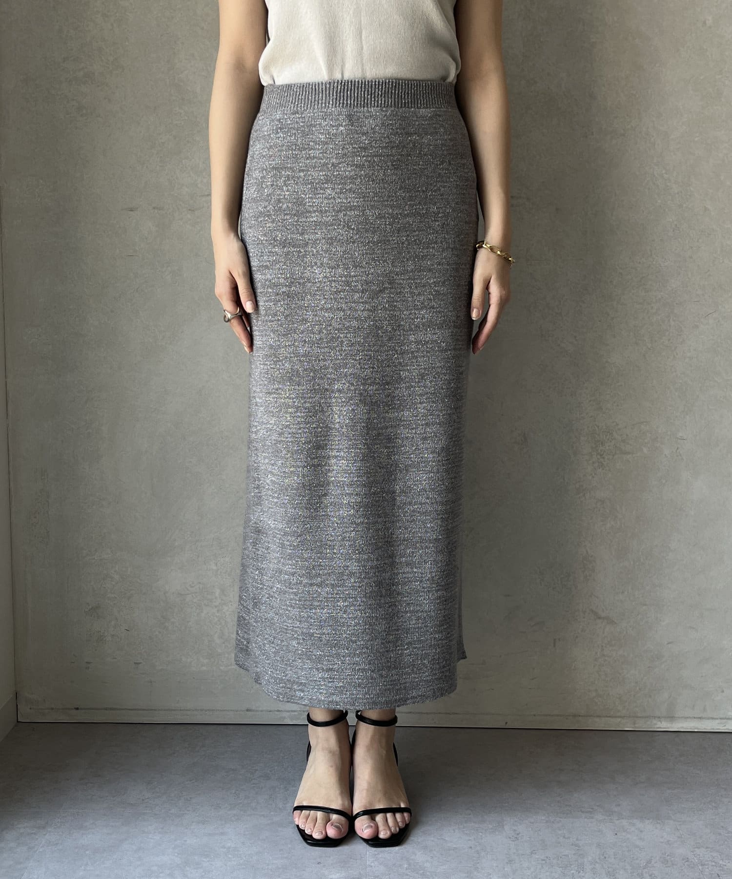 トレンドライクなラメの素材を使用した、Iラインのニットスカート。