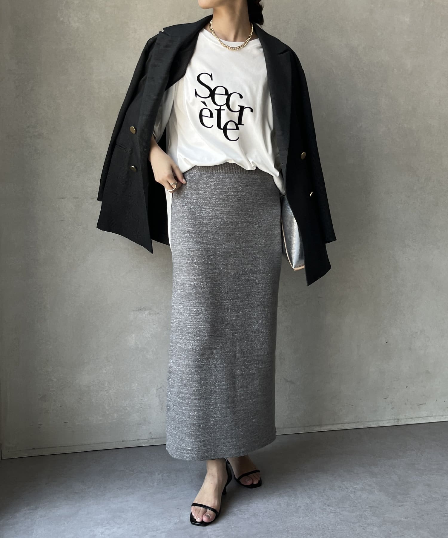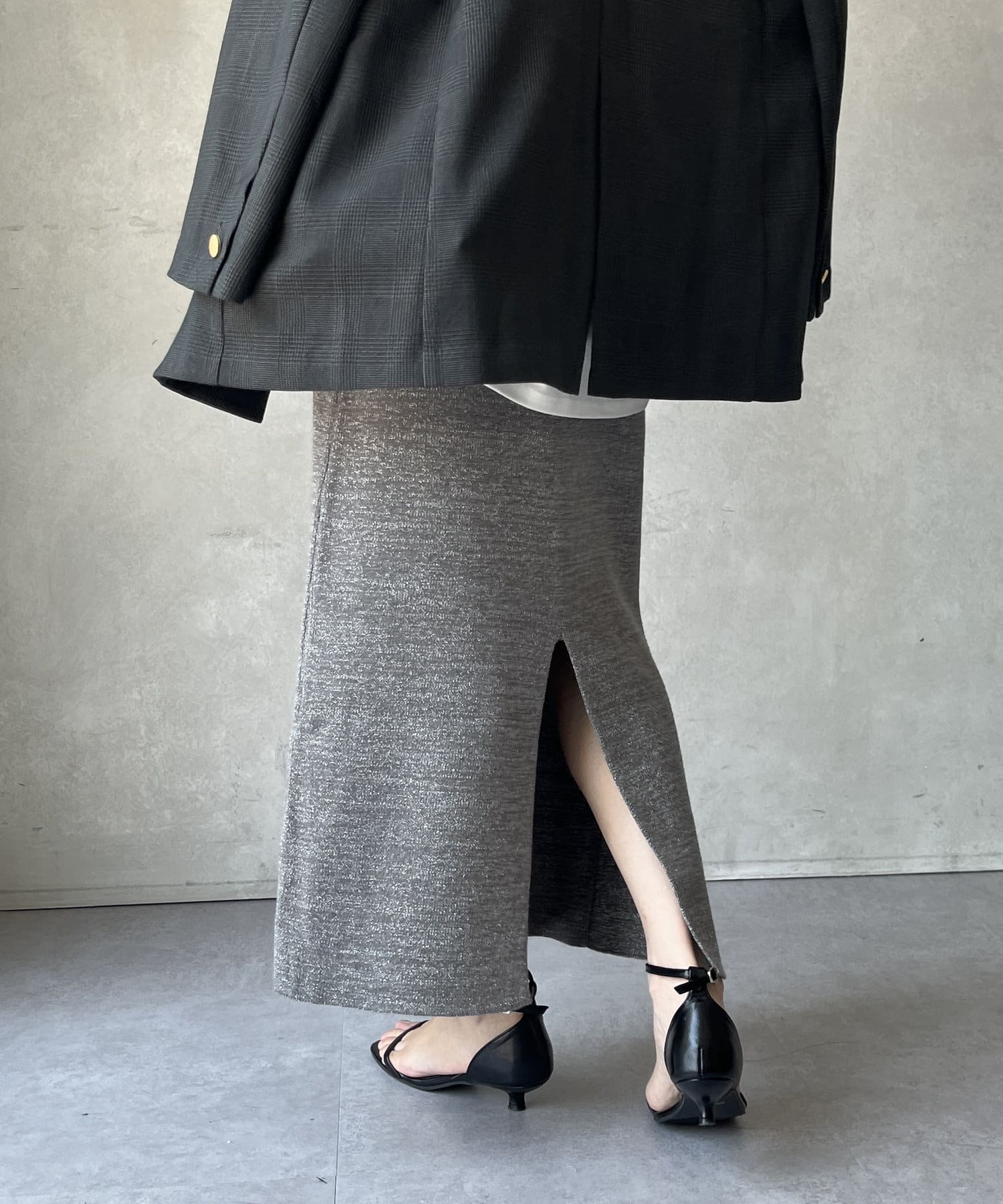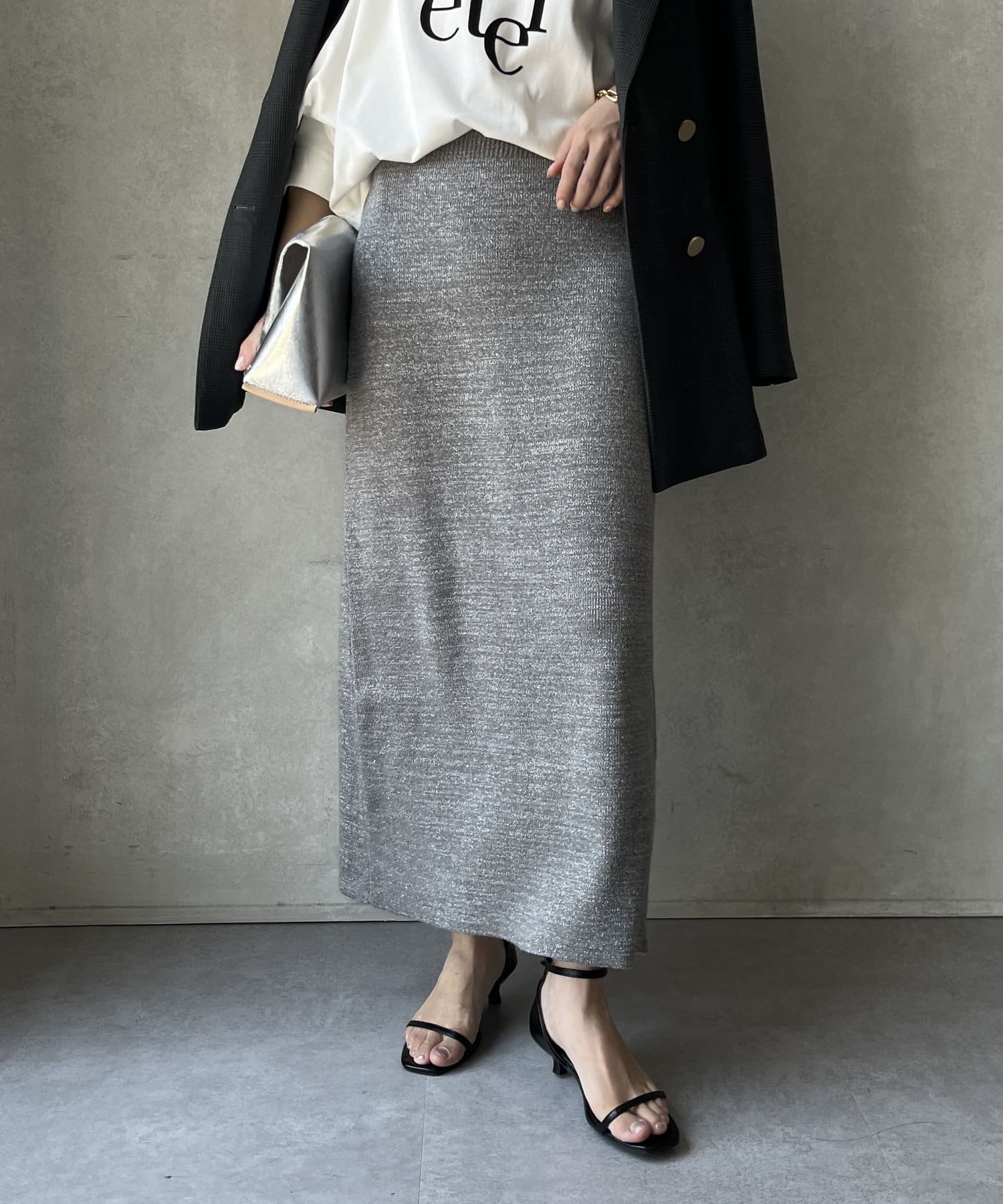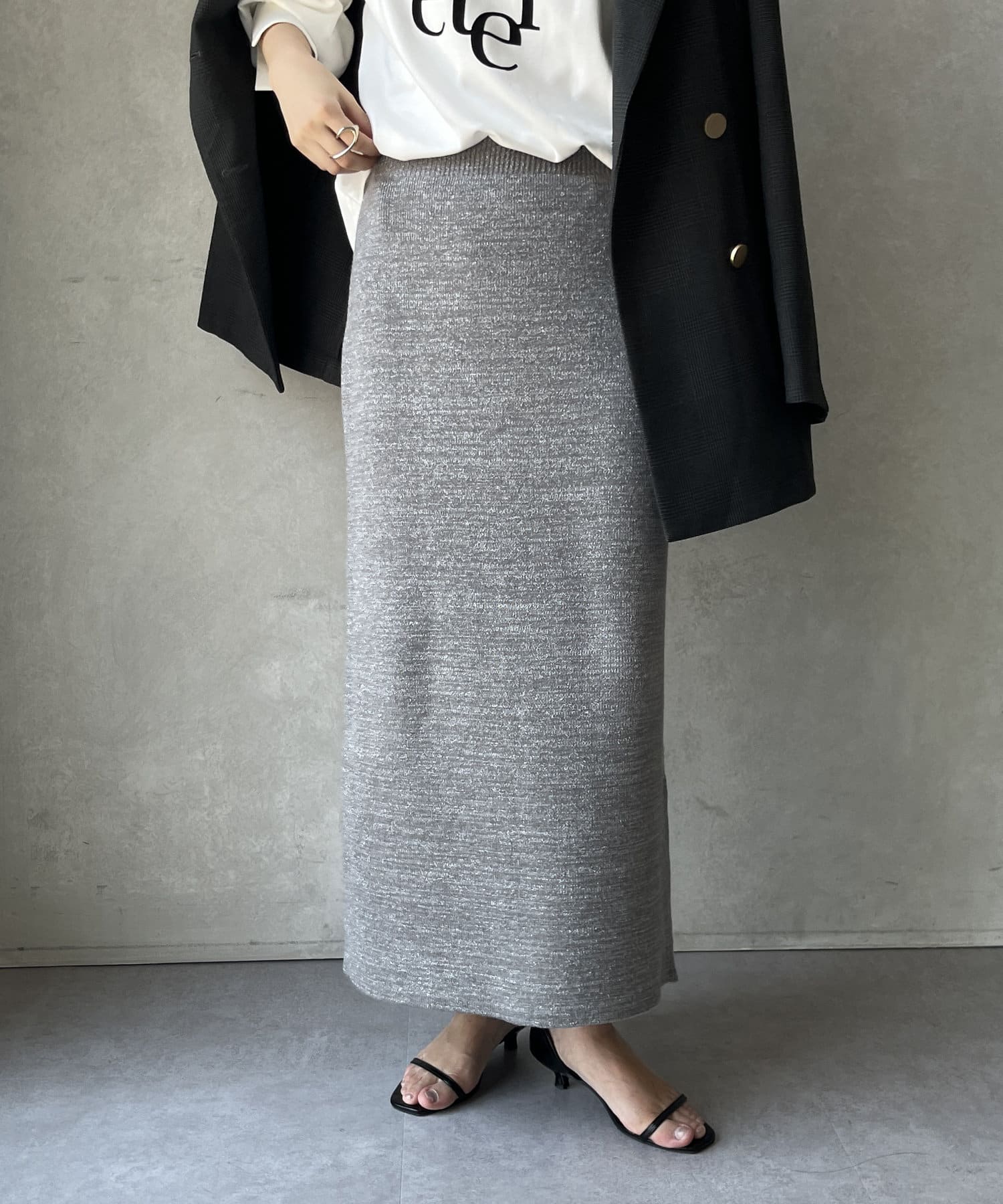 トレンドライクなラメの素材を使用した、Iラインのニットスカート。