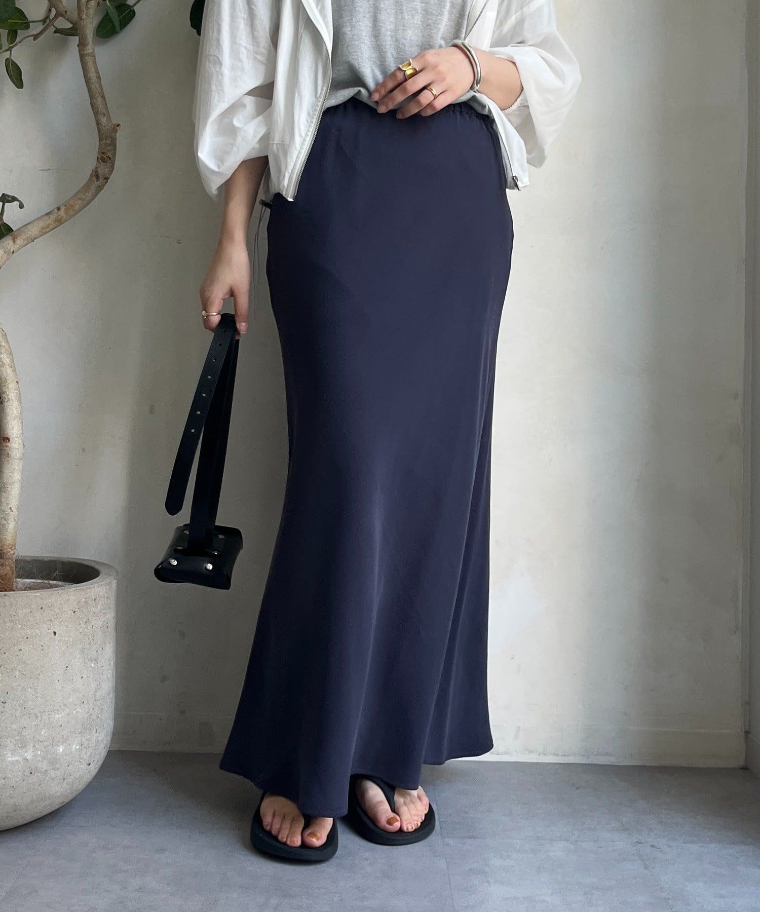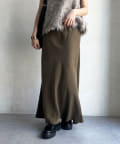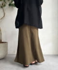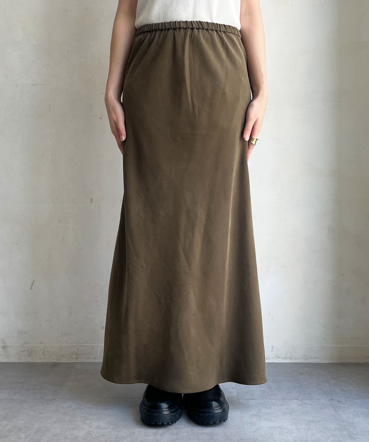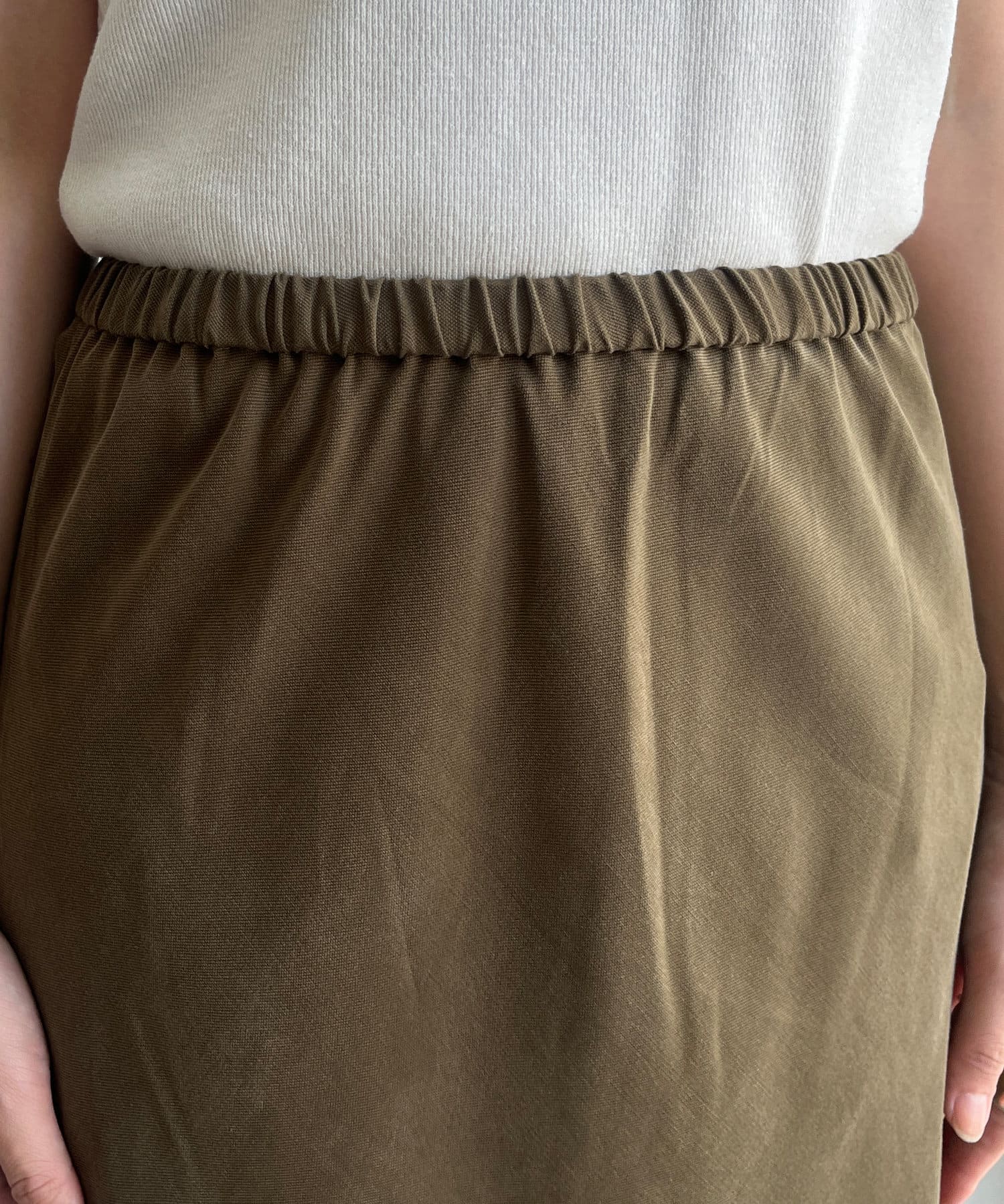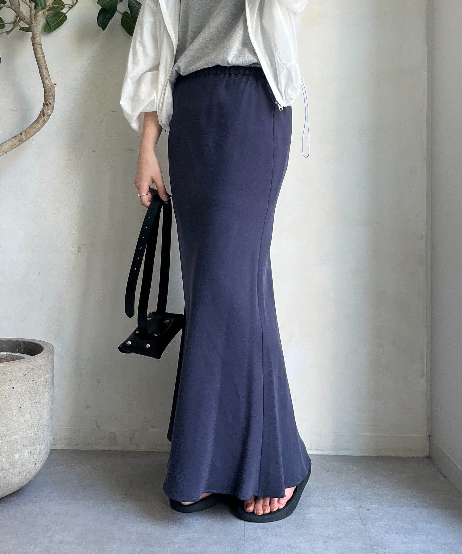裾に向かって緩やかに広がるマーメイドシルエットできれいめな印象を与えつつも、ウエストはゴム仕様になっているため、履き心地はリラクシーです。
