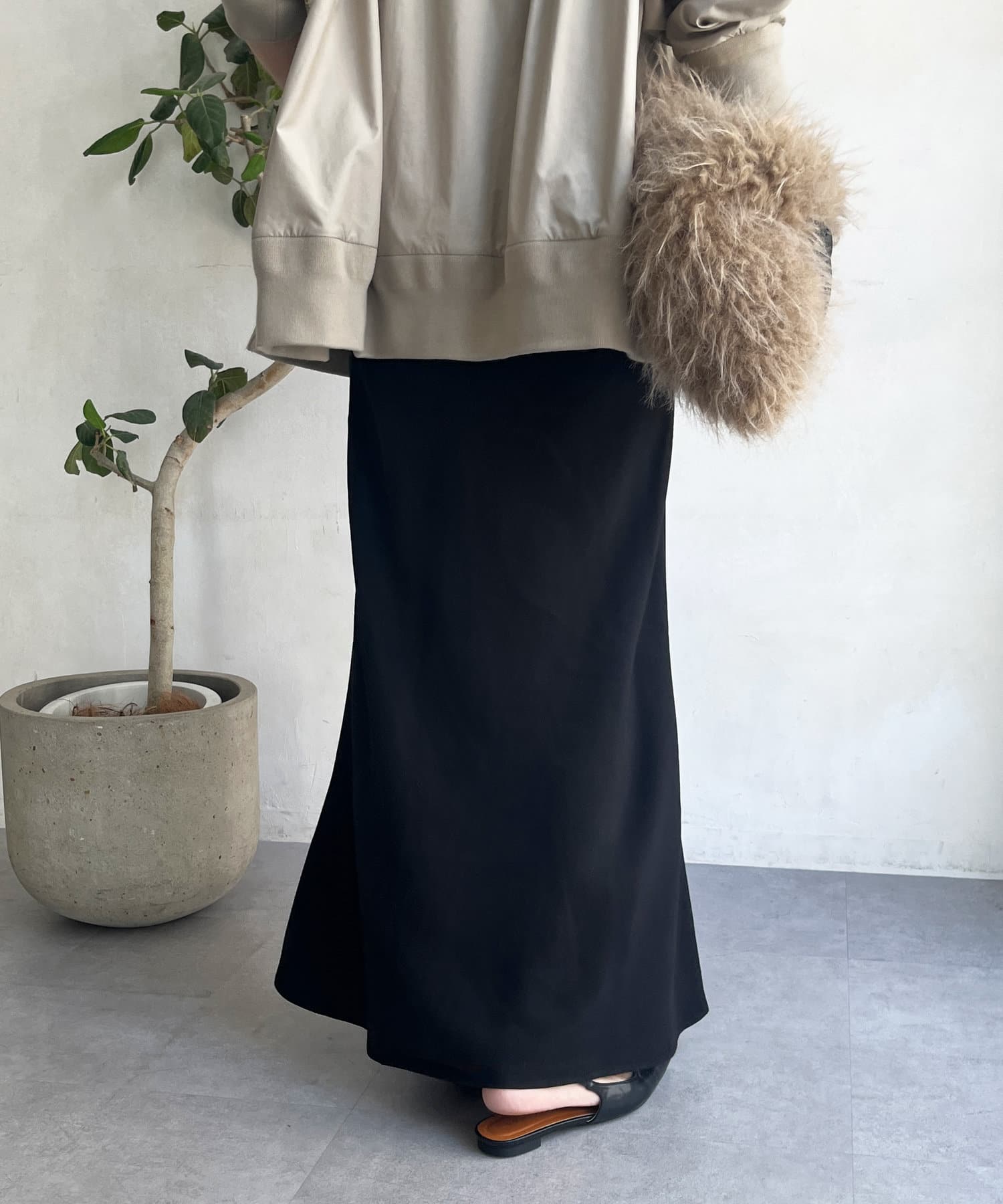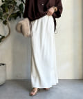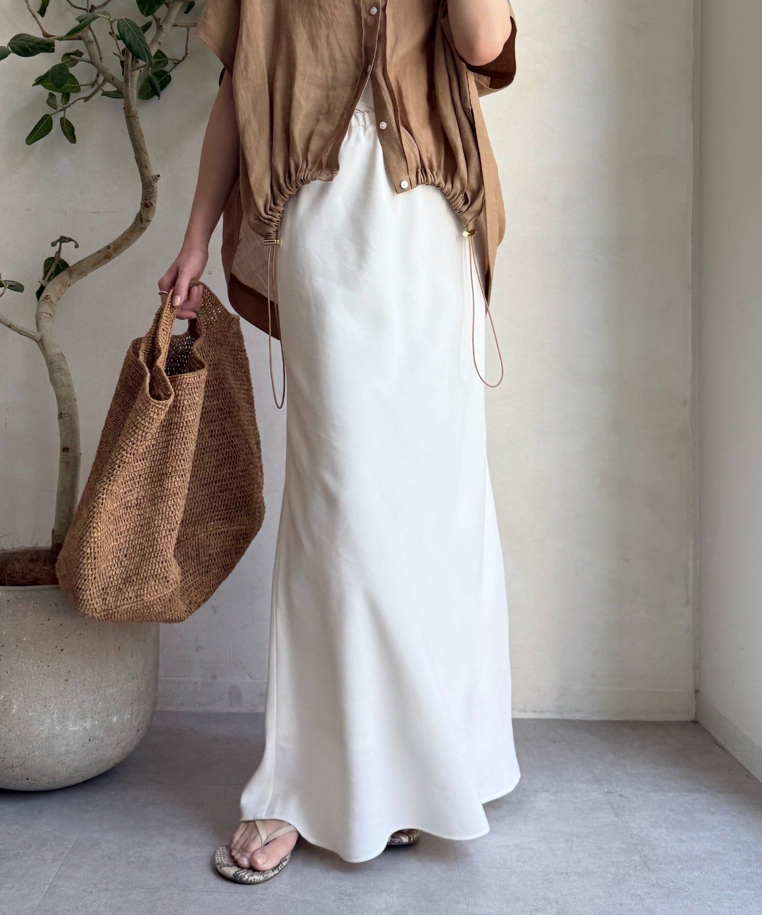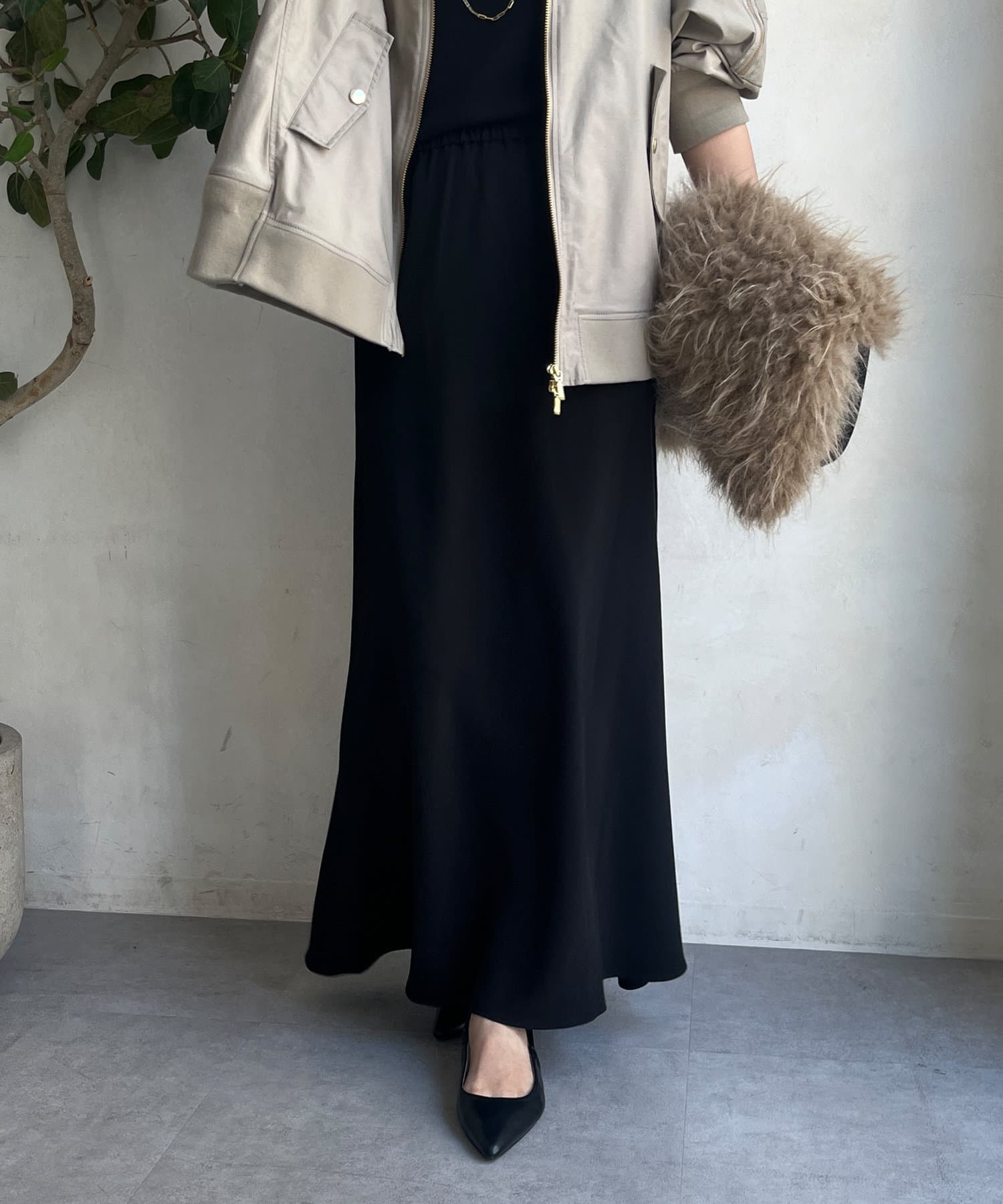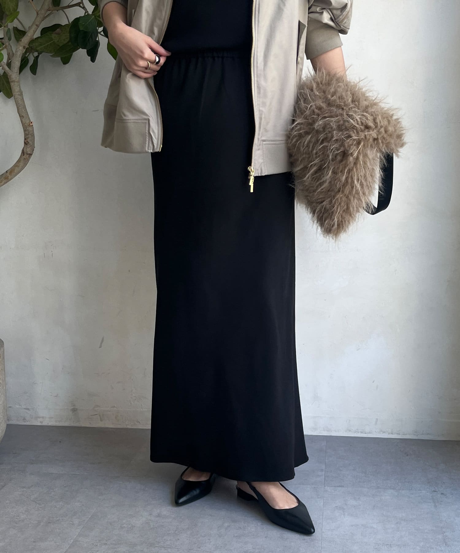 裾に向かって緩やかに広がるマーメイドシルエットできれいめな印象を与えつつも、ウエストはゴム仕様になっているため、履き心地はリラクシーです。
