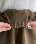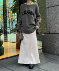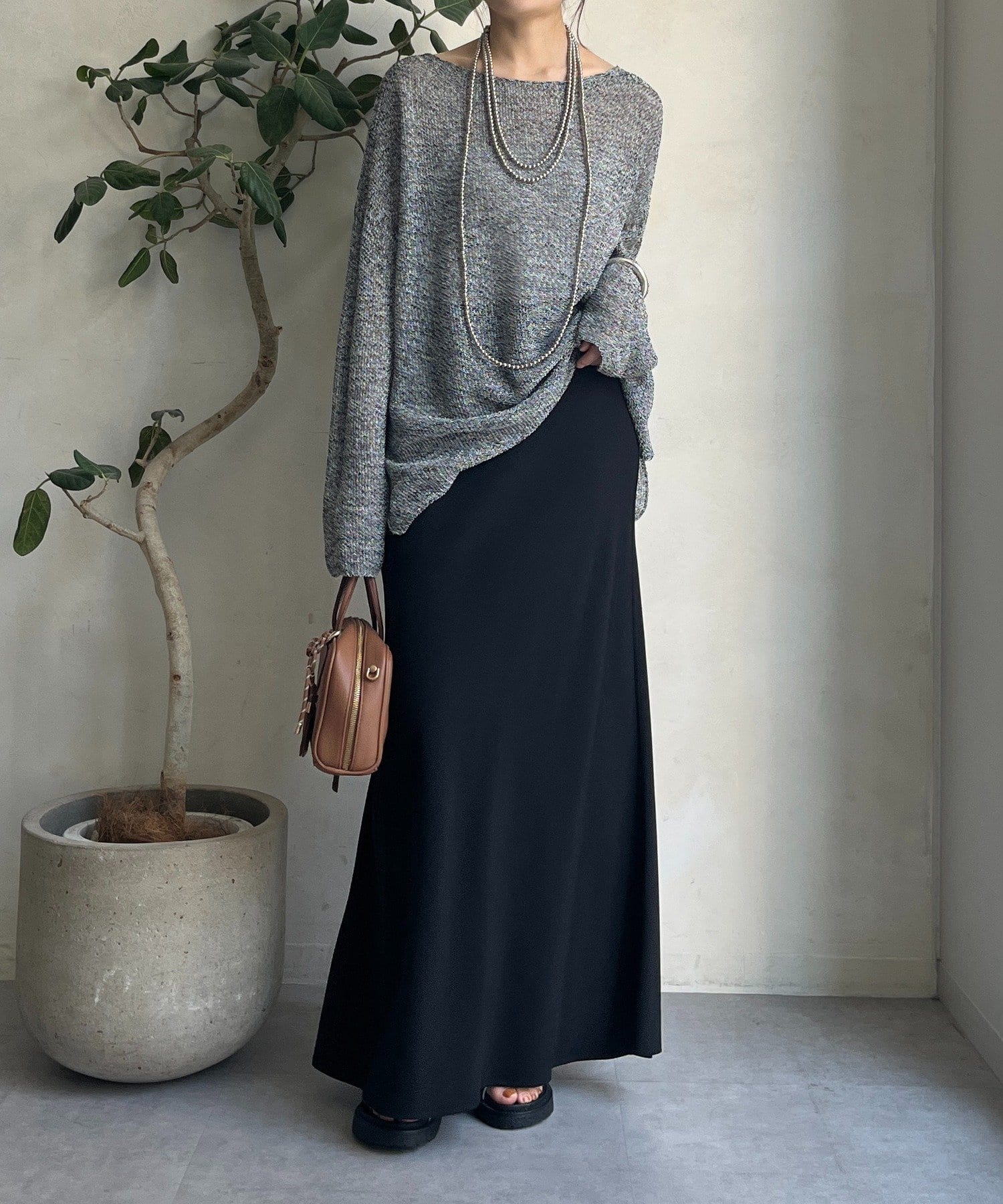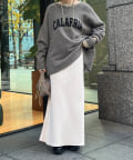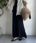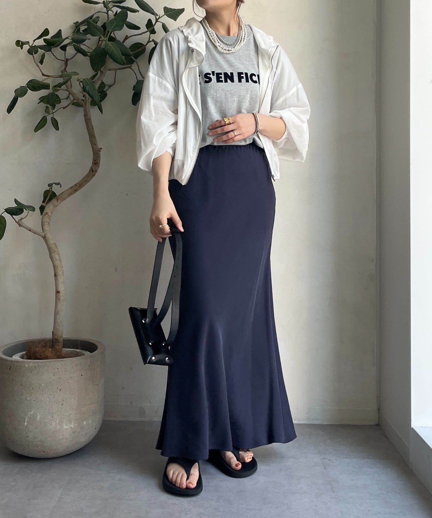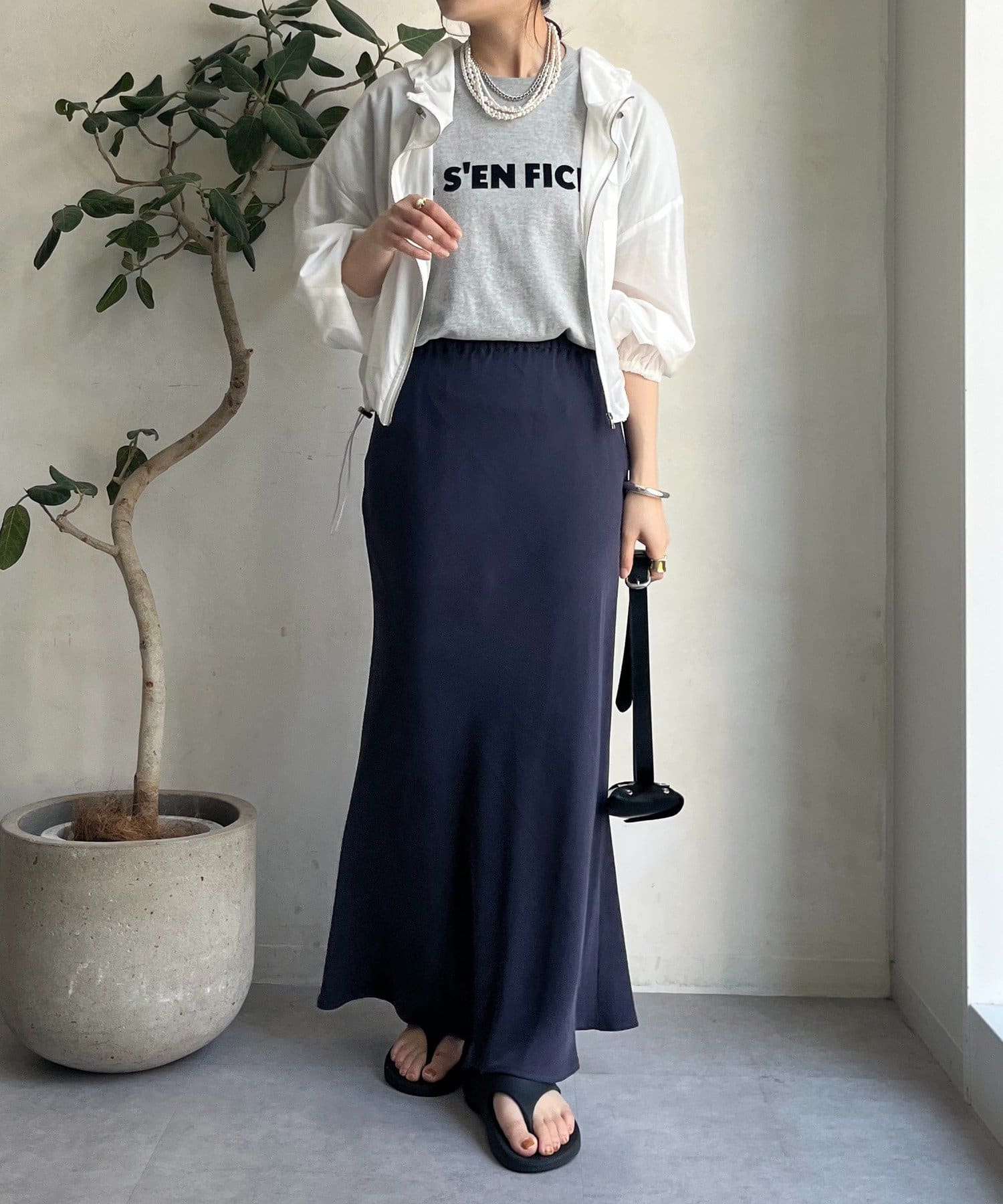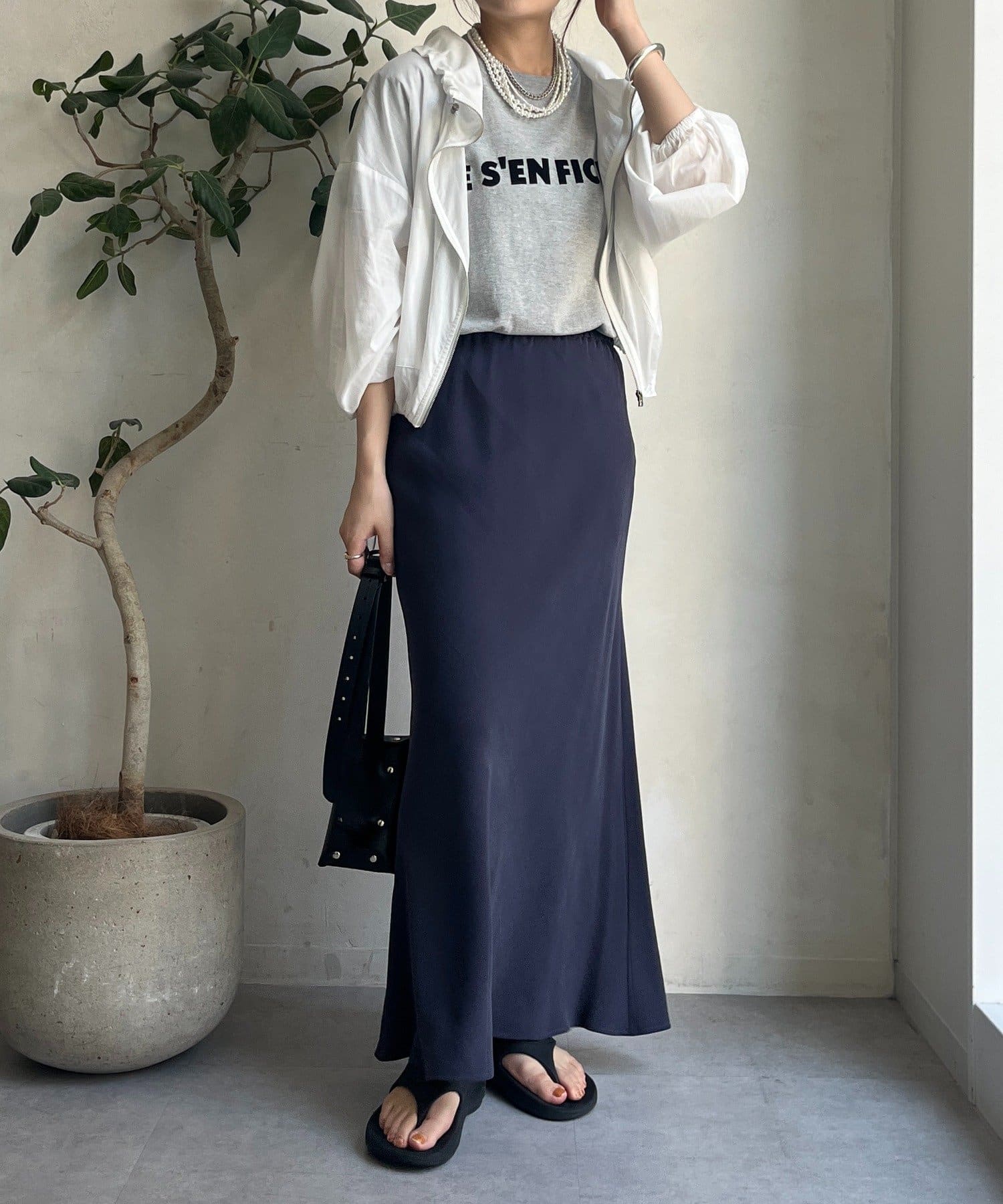 裾に向かって緩やかに広がるマーメイドシルエットできれいめな印象を与えつつも、ウエストはゴム仕様になっているため、履き心地はリラクシーです。