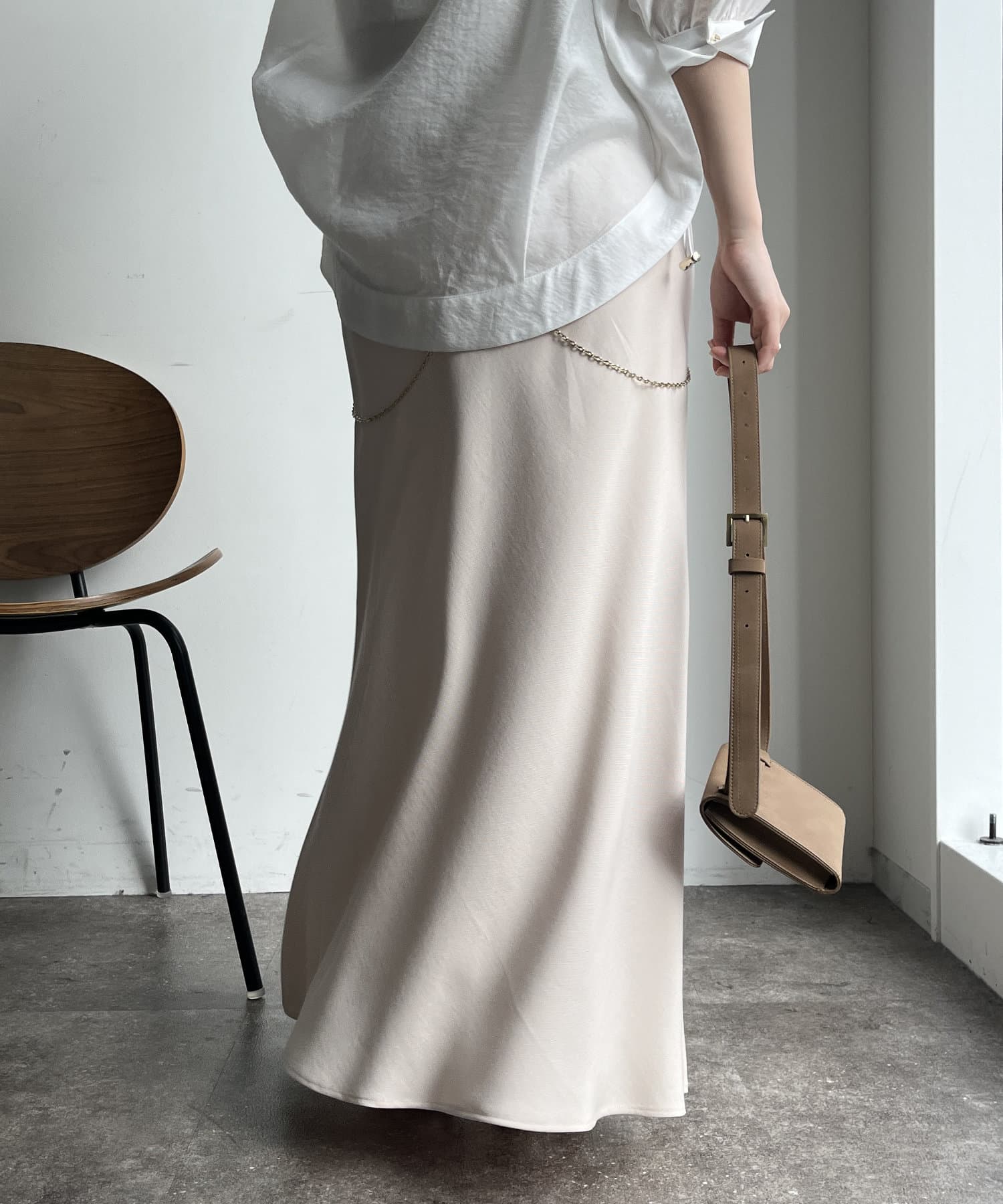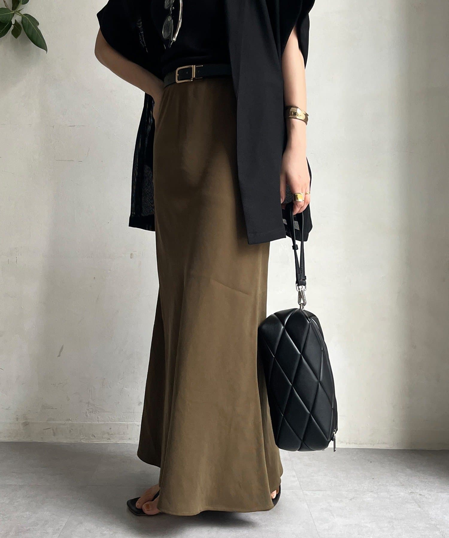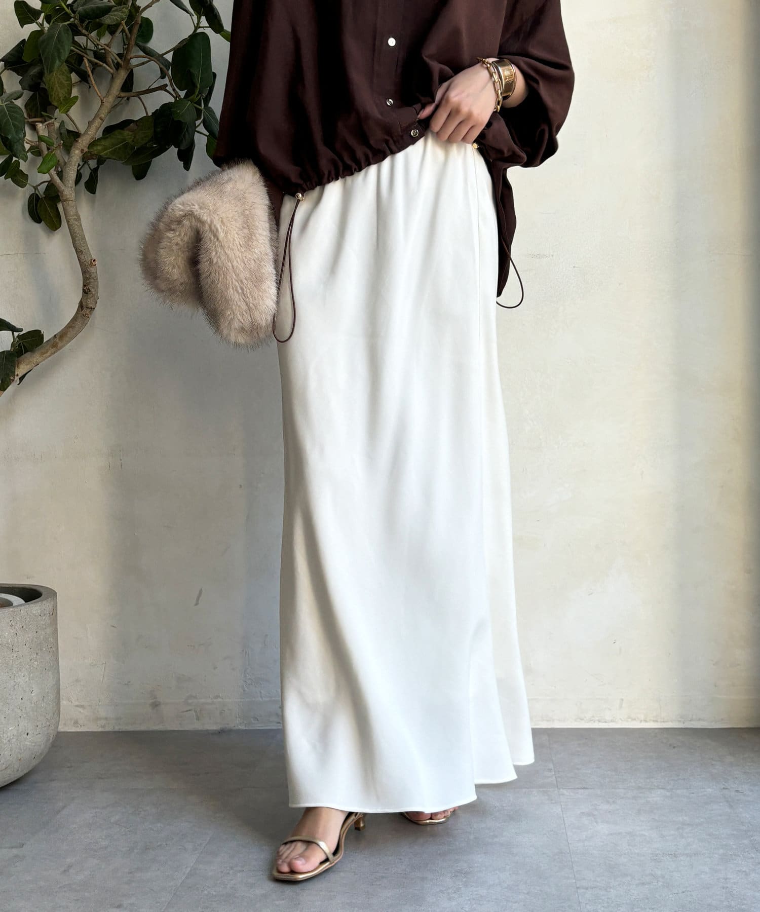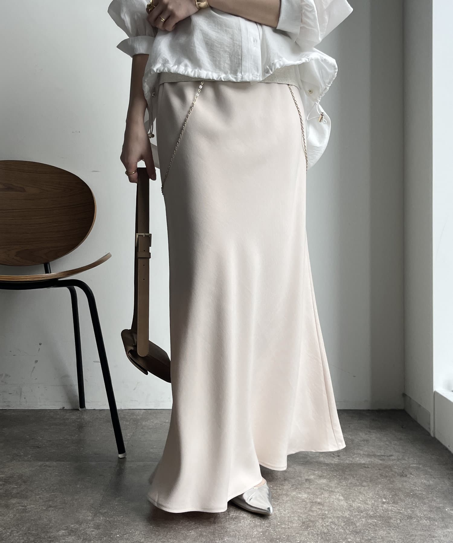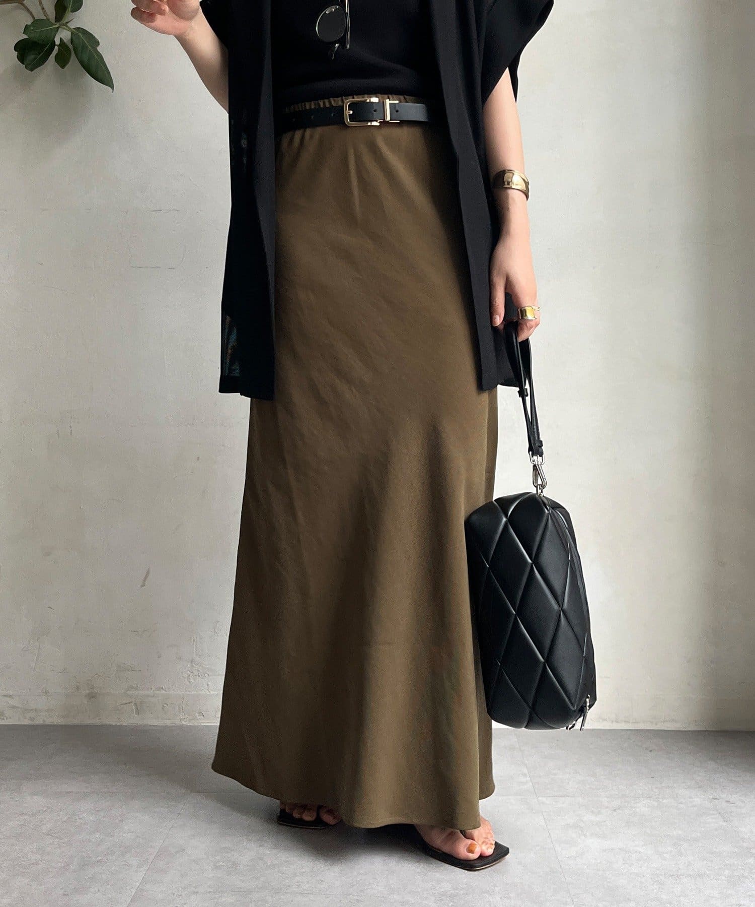 すっきりとしたきれいなシルエットがレディライクな印象を与えてくれるサテンスカート。